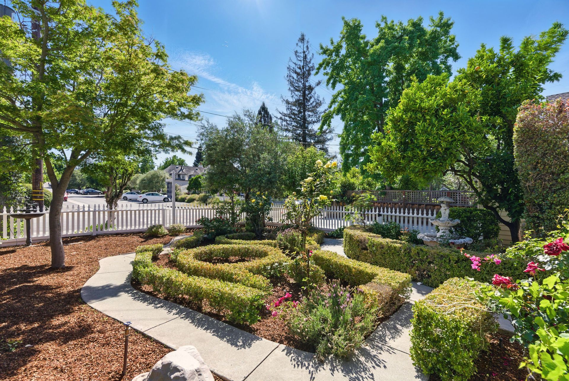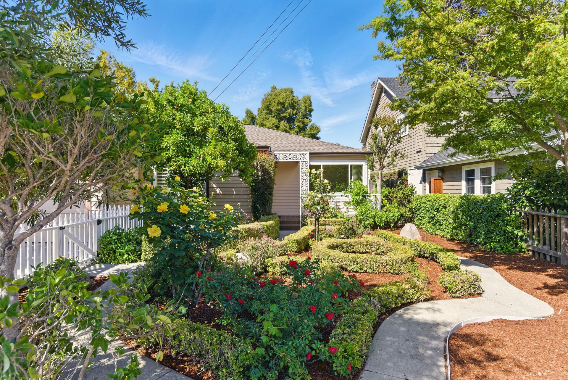 Welcome to 1260 Cloud Avenue, a picture-perfect residence located in the coveted University Heights neighborhood of prestigious West Menlo Park. Set on a flat, beautifully proportioned 7,000-square-foot lot, this three-bedroom, two-bath home offers 1,670 square feet of thoughtfully laid-out living space filled with natural light, charm, and comfort. Tucked behind a white picket fence and surrounded by lush, mature landscaping, the home immediately captivates with its vibrant red and yellow roses, sculpted hedges, and tranquil garden setting. Inside, the excellent floor plan includes a formal living room and formal dining room at the front of the home, along with a well-appointed kitchen and sunny eat-in breakfast nook. The private bedroom wing features three spacious bedrooms and two full bathrooms, providing a quiet retreat with effortless access to the outdoors. The deep, sprawling backyard is a rare gem—perfectly flat with ideal tree placement, ample sunshine, and mature trees lining the fence for enhanced privacy and serenity. Whether entertaining or unwinding, the outdoor space is both functional and beautifully landscaped. Ideally situated just minutes from Stanford University, top Silicon Valley employers, and downtown shops and restaurants, this home also belongs to a highly acclaimed, top-rated school district. Cloud Avenue is known for its peaceful, tree-lined streets, offering a quiet and private setting with unbeatable proximity to the best of Menlo Park and beyond. Don’t miss this exceptional opportunity to own a truly special home in one of West Menlo Park’s most desirable neighborhoods!