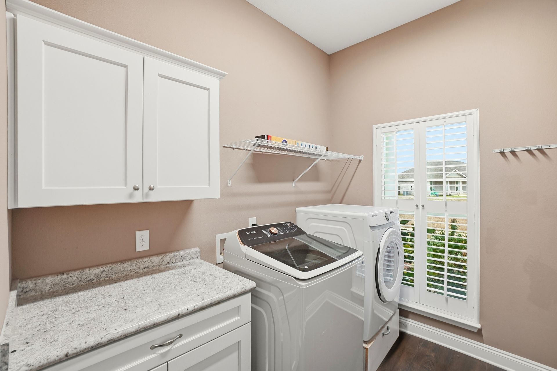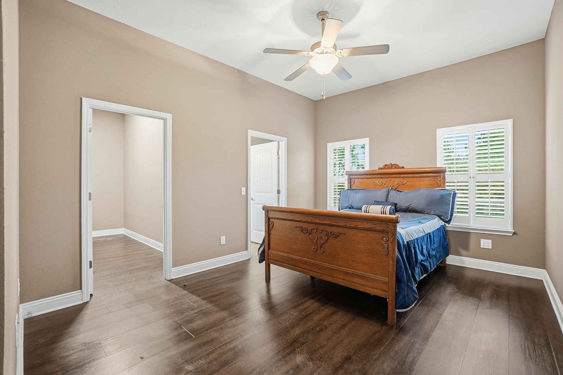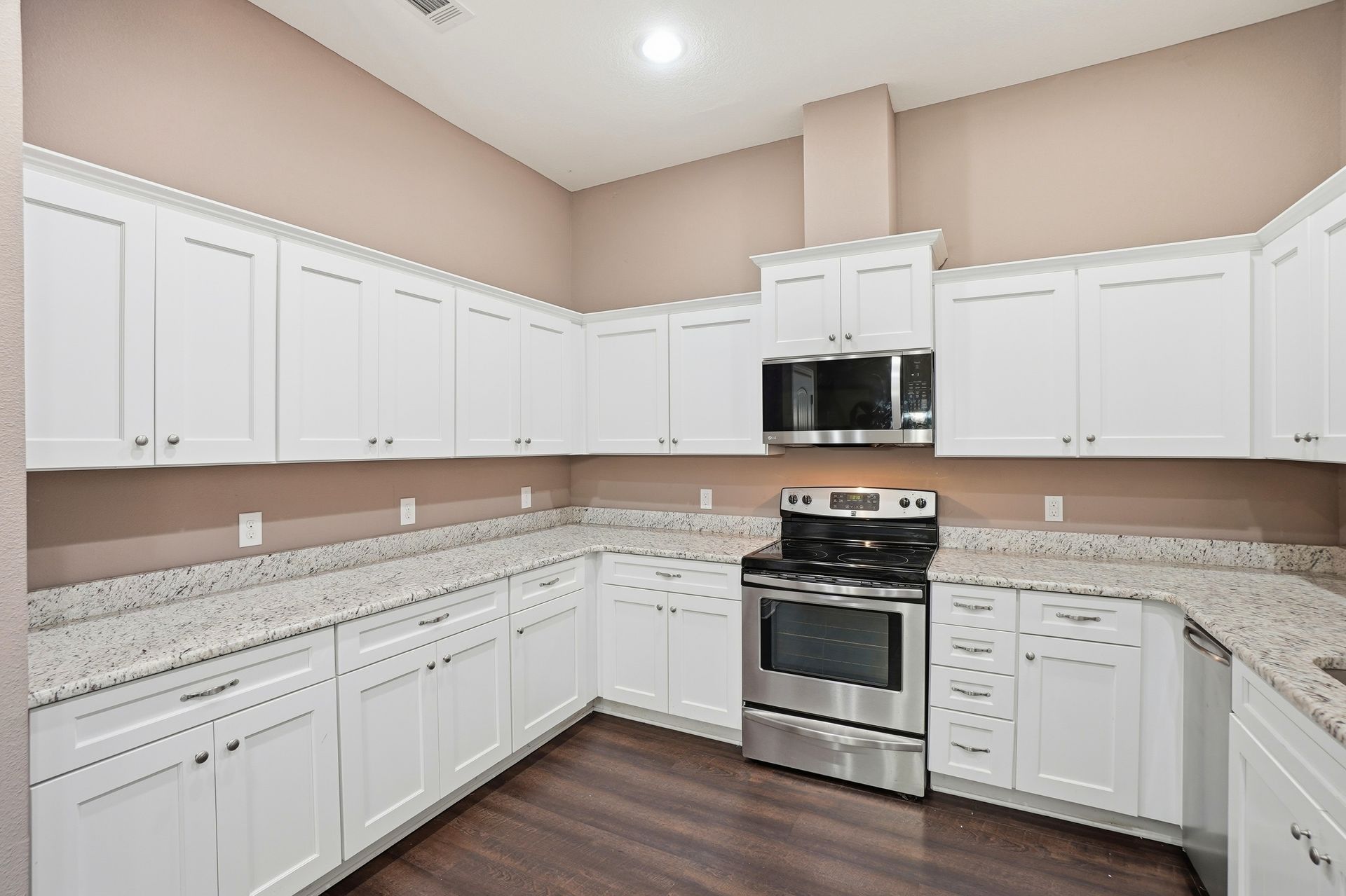 The living area features luxury vinyl plank (LVP) flooring throughout. The primary bedroom includes a walk-in closet, double vanity, separate shower, and a garden tub. For added convenience, the home has a dedicated laundry room with cabinetry.