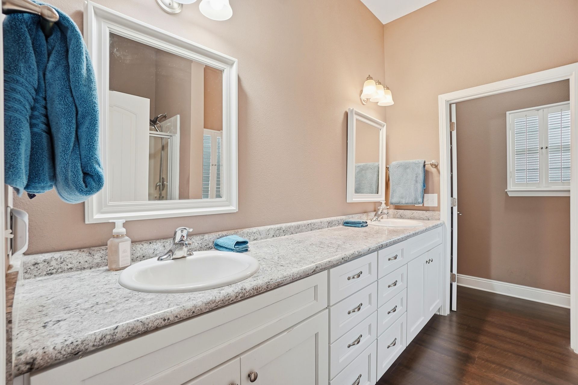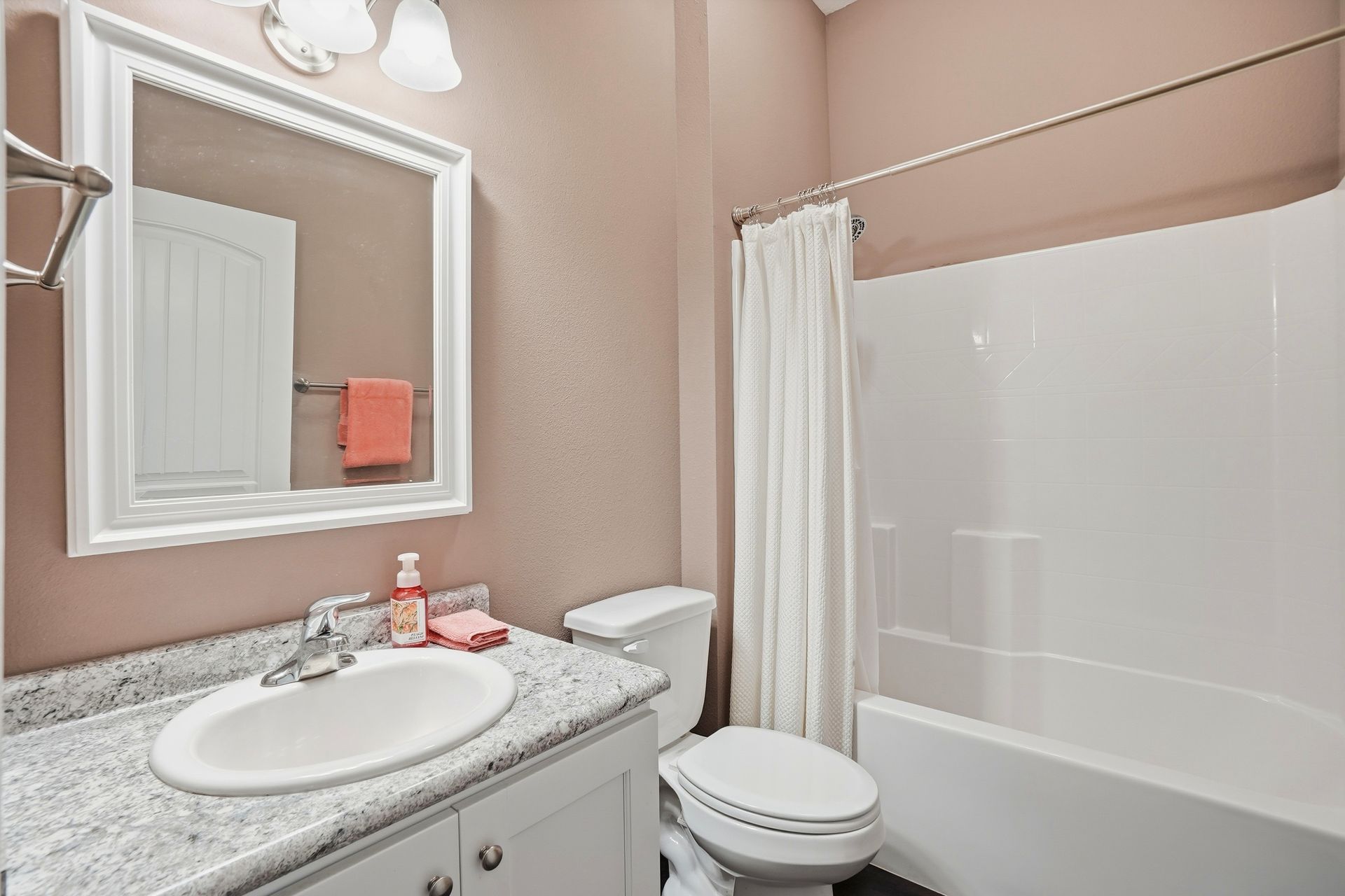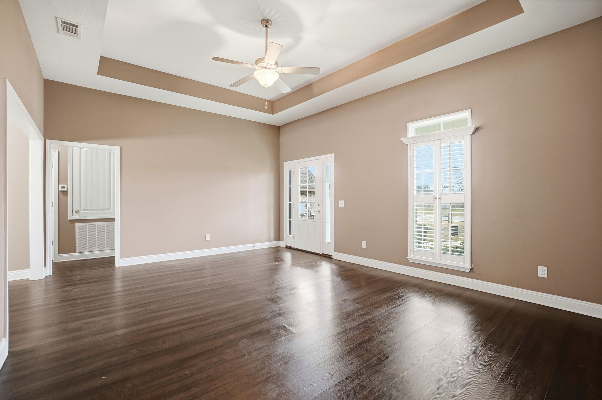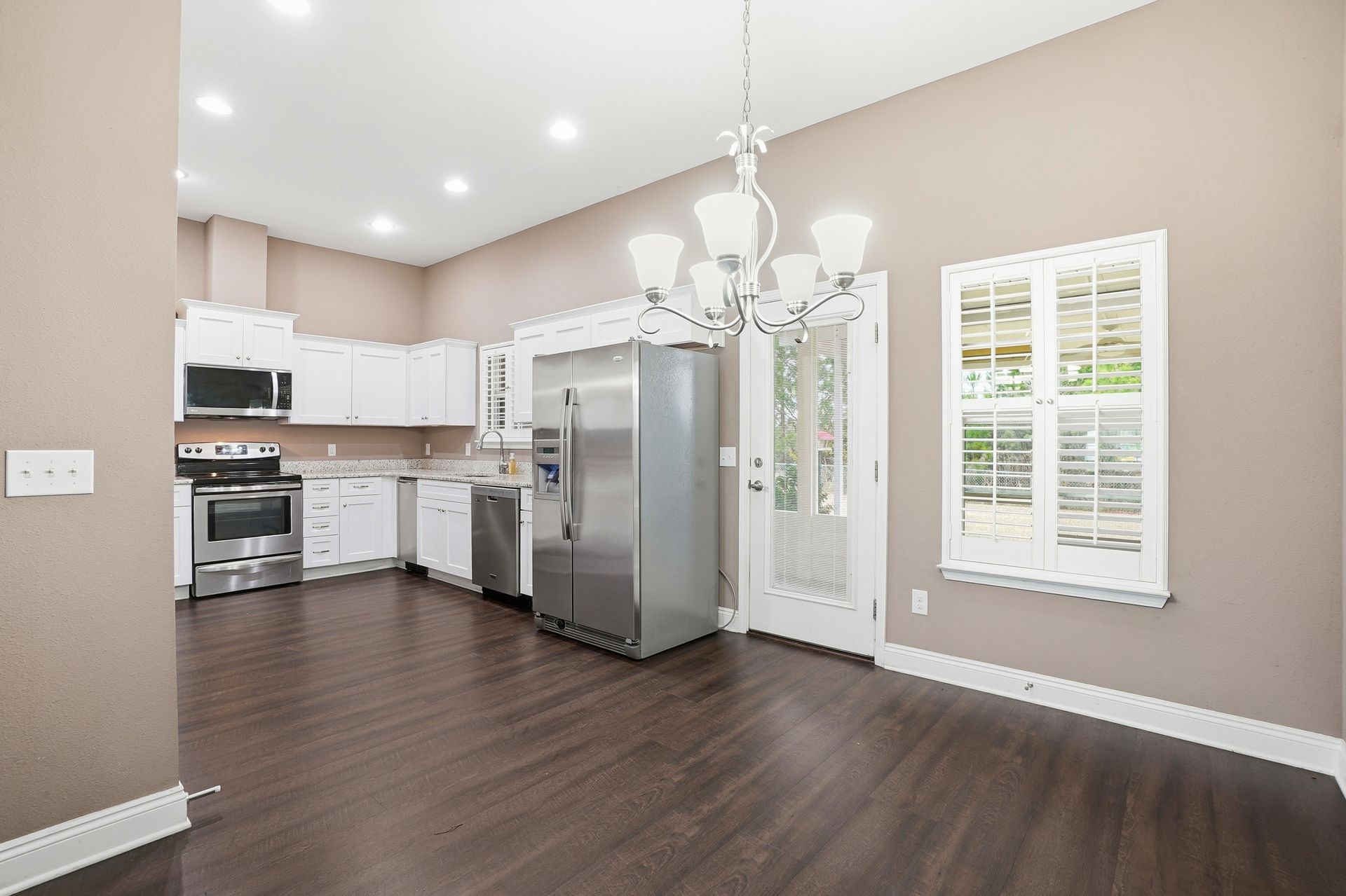 The living area features luxury vinyl plank (LVP) flooring throughout. The primary bedroom includes a walk-in closet, double vanity, separate shower, and a garden tub. For added convenience, the home has a dedicated laundry room with cabinetry.