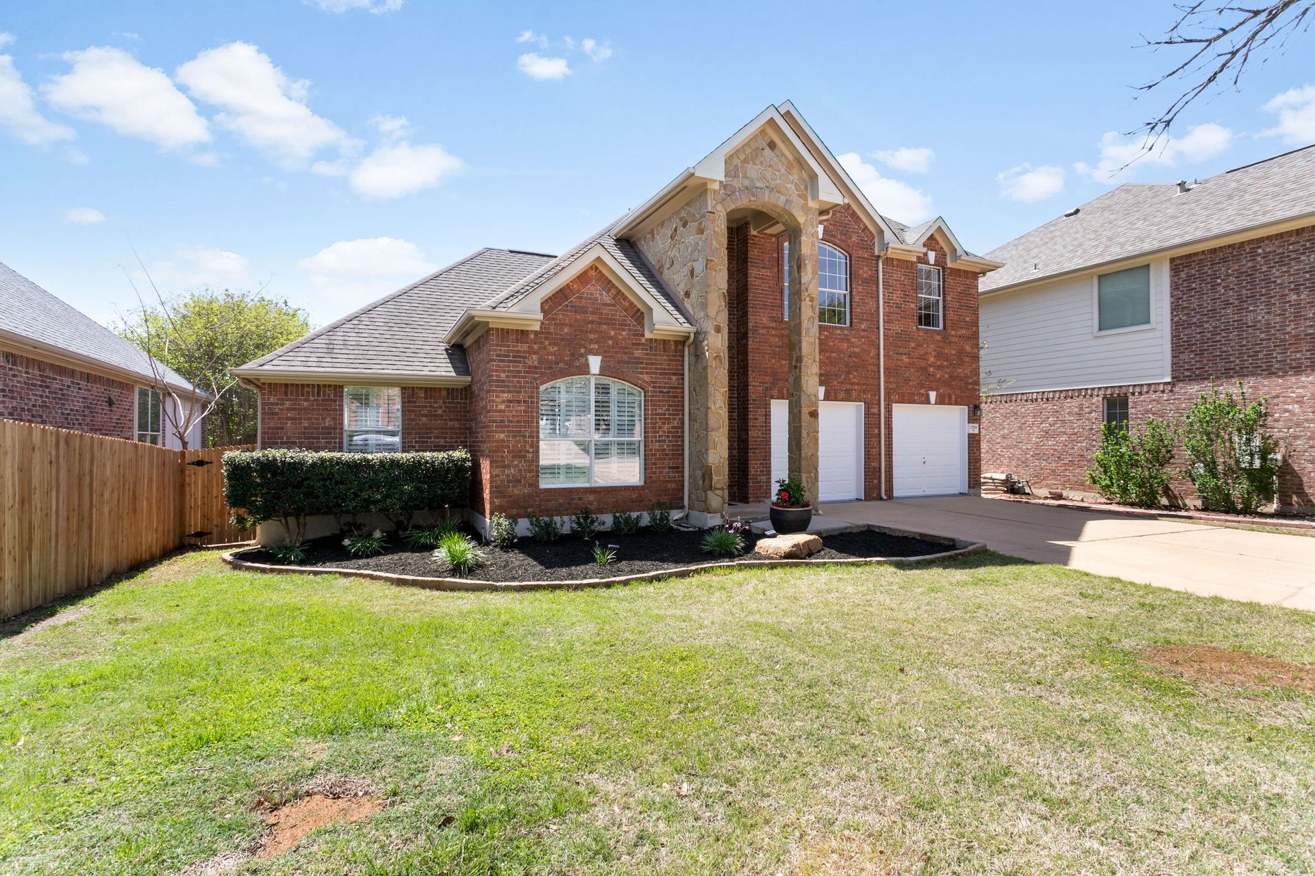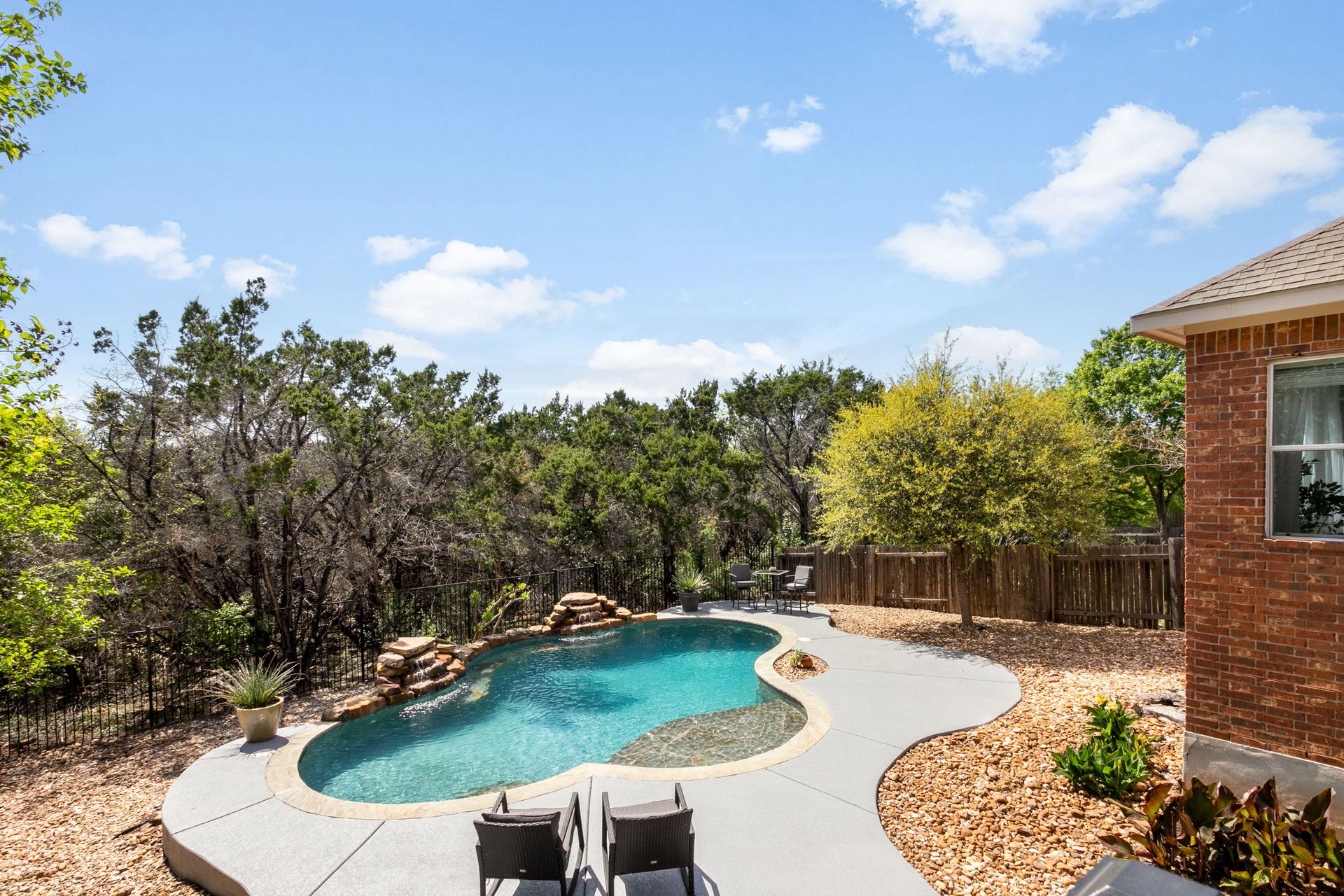 Set on a spacious lot backing to a private greenbelt, this beautiful home offers exceptional privacy and a backyard designed for year-round enjoyment. The resort-style pool with two waterfalls creates a peaceful retreat and the perfect escape from the Texas summer heat. Surrounded by mature trees and natural views, the outdoor living space is ideal for relaxing and entertaining.