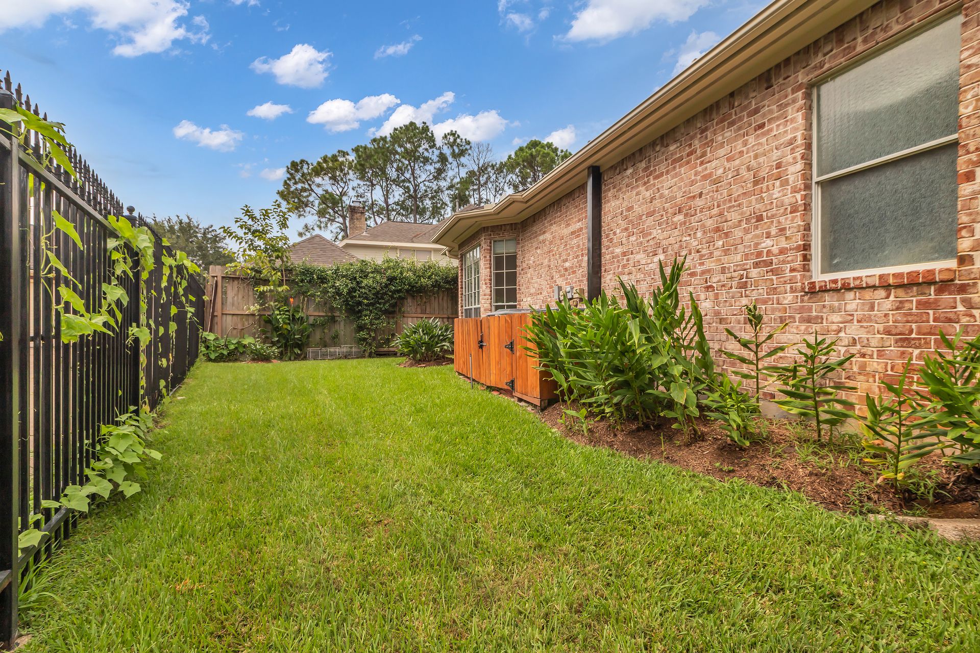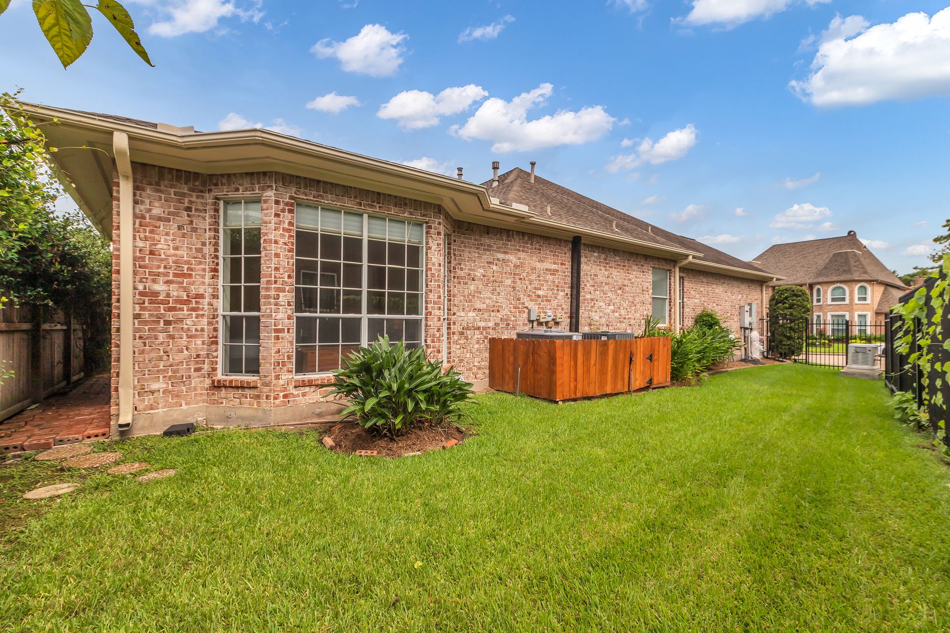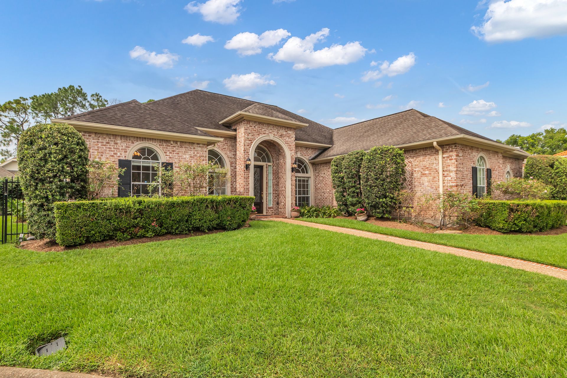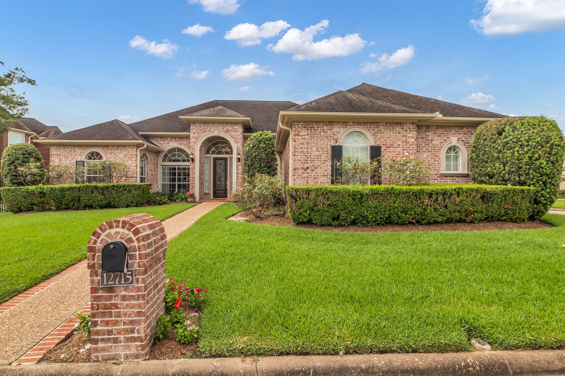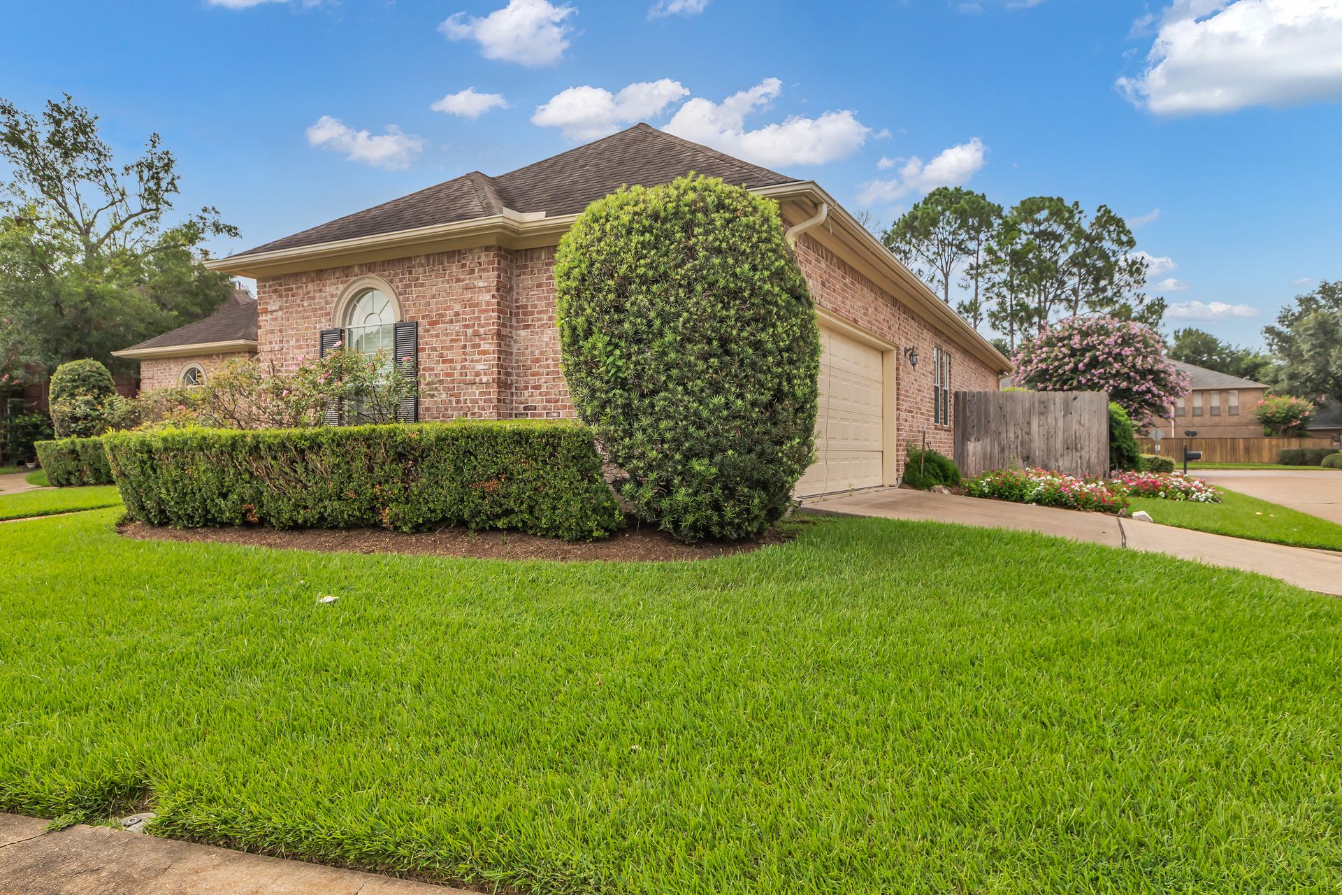 Experience refined one-story living in this custom-built all-brick home with stone cladding, ideally positioned on a corner cul-de-sac lot for both space and privacy. This three-bed, three-bath home features a flexible layout with a den and private study, perfect for work or relaxation. The open-concept design is accentuated by soaring ceilings, creating a light and airy ambiance in the entry, living, and dining areas. The guest suite to the left of the entry, with its en-suite bath, offers comfort and seclusion. The hall leading from the dining area provides privacy for the third bedroom, full bath, and den area. The expansive primary suite is a true retreat, boasting dual walk-in closets with custom-built-ins, a luxurious Jacuzzi tub, a separate shower, and a spacious vanity area. The double-car garage features three large closets and built-ins. Enjoy year-round relaxation on the covered back porch. A side yard includes a generator. This home is just a short distance from the Terry Hershey Trails.