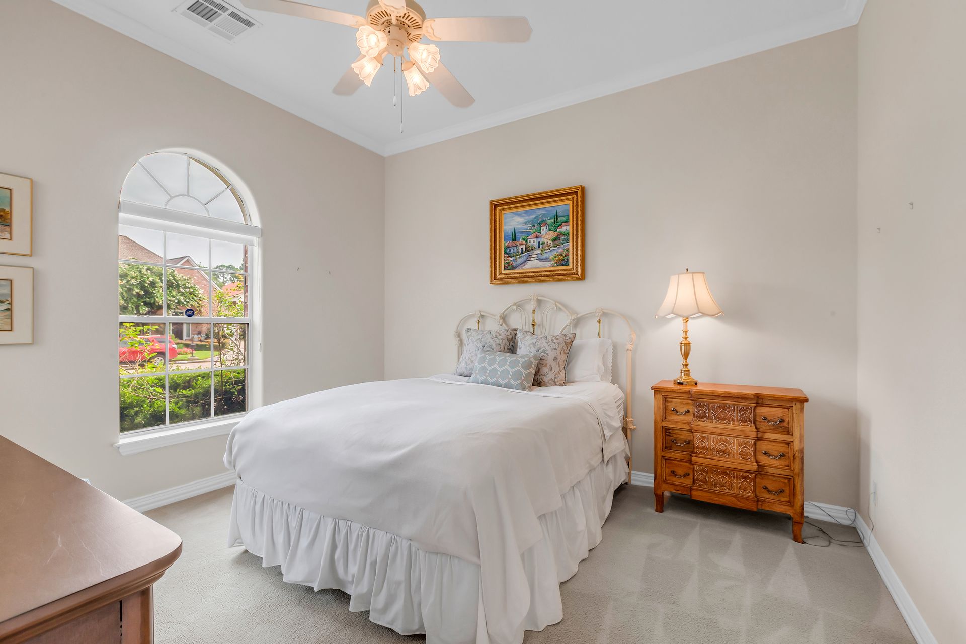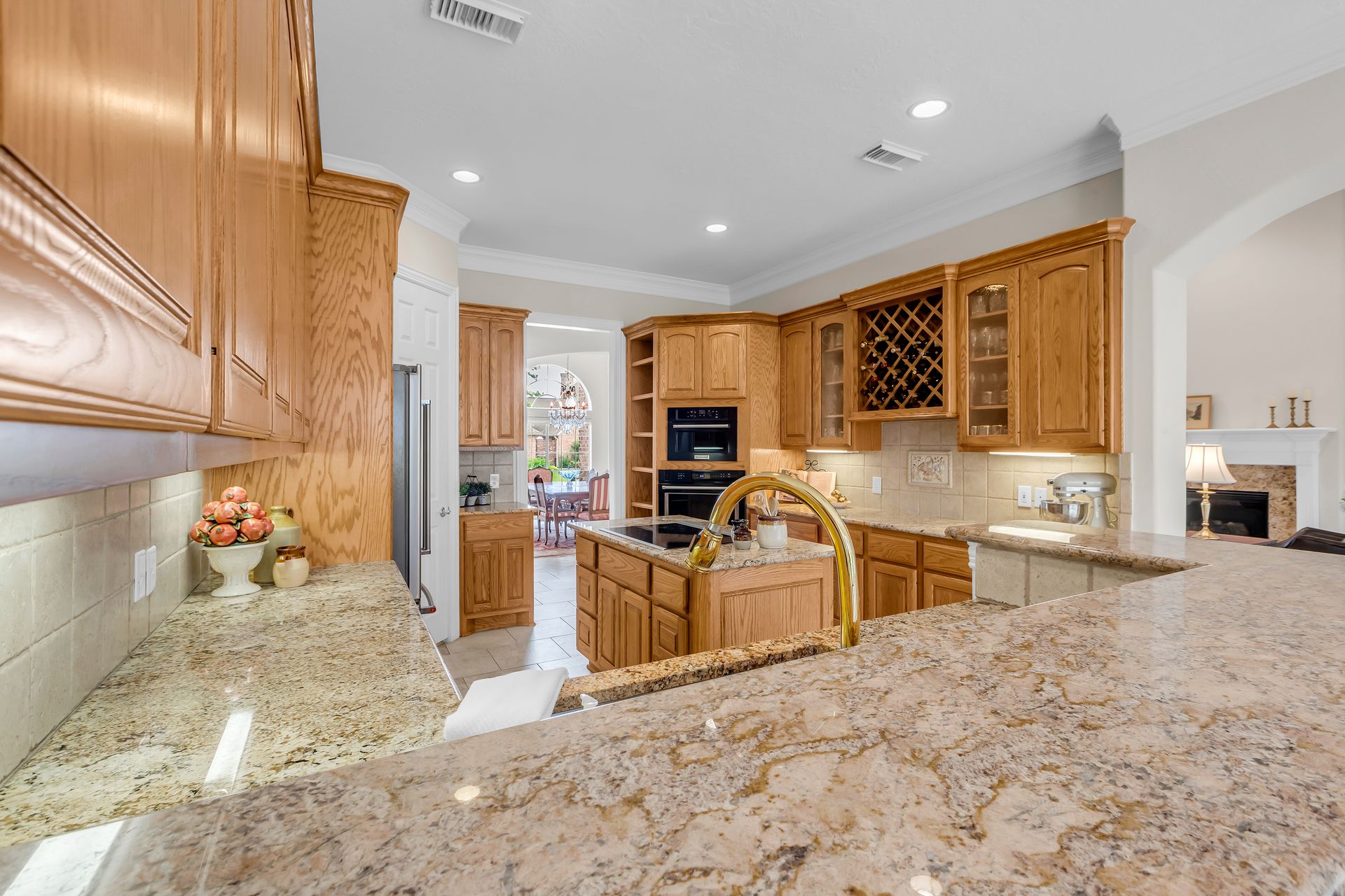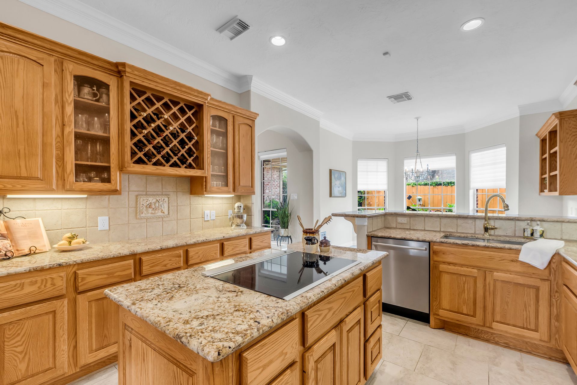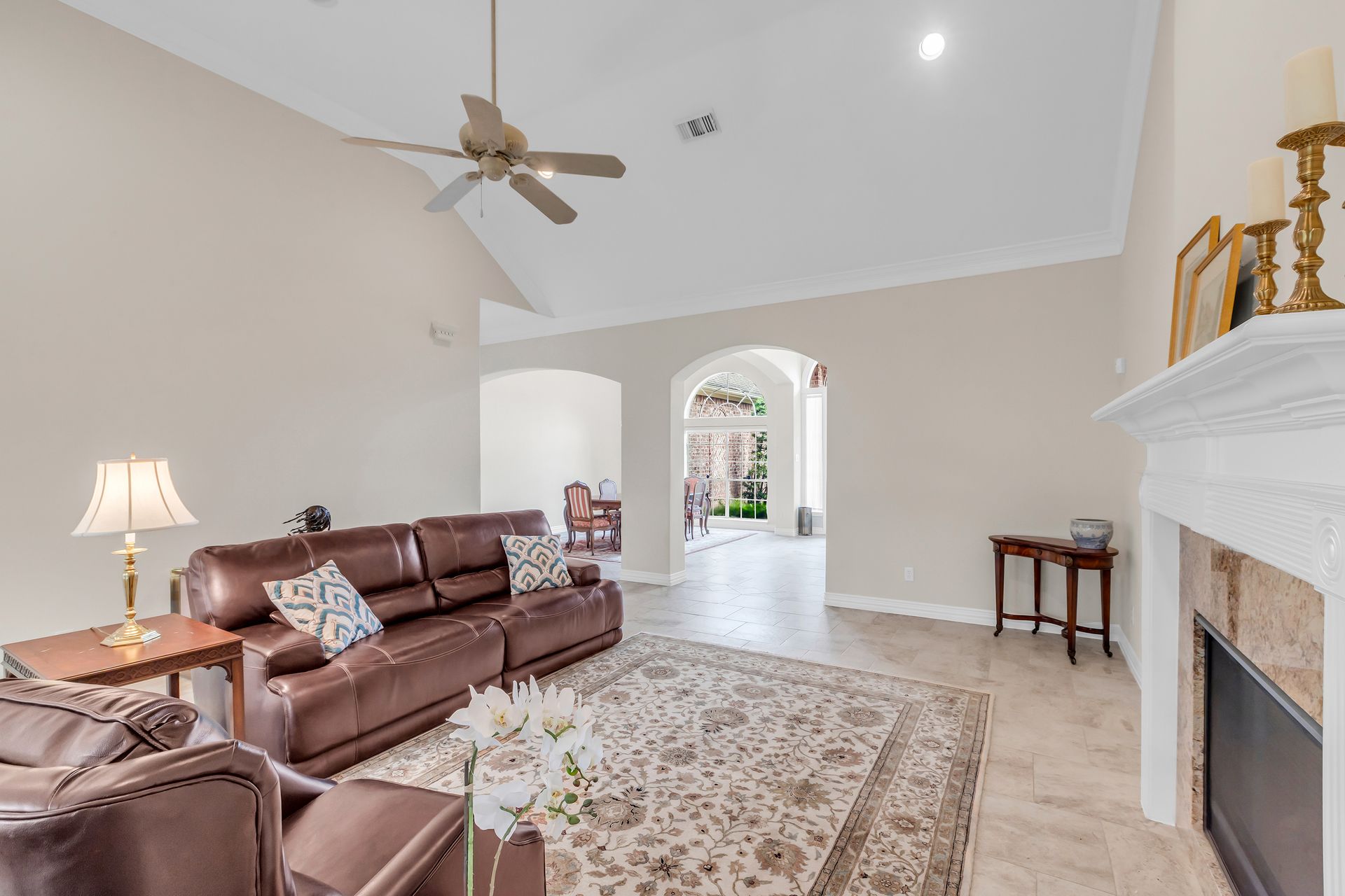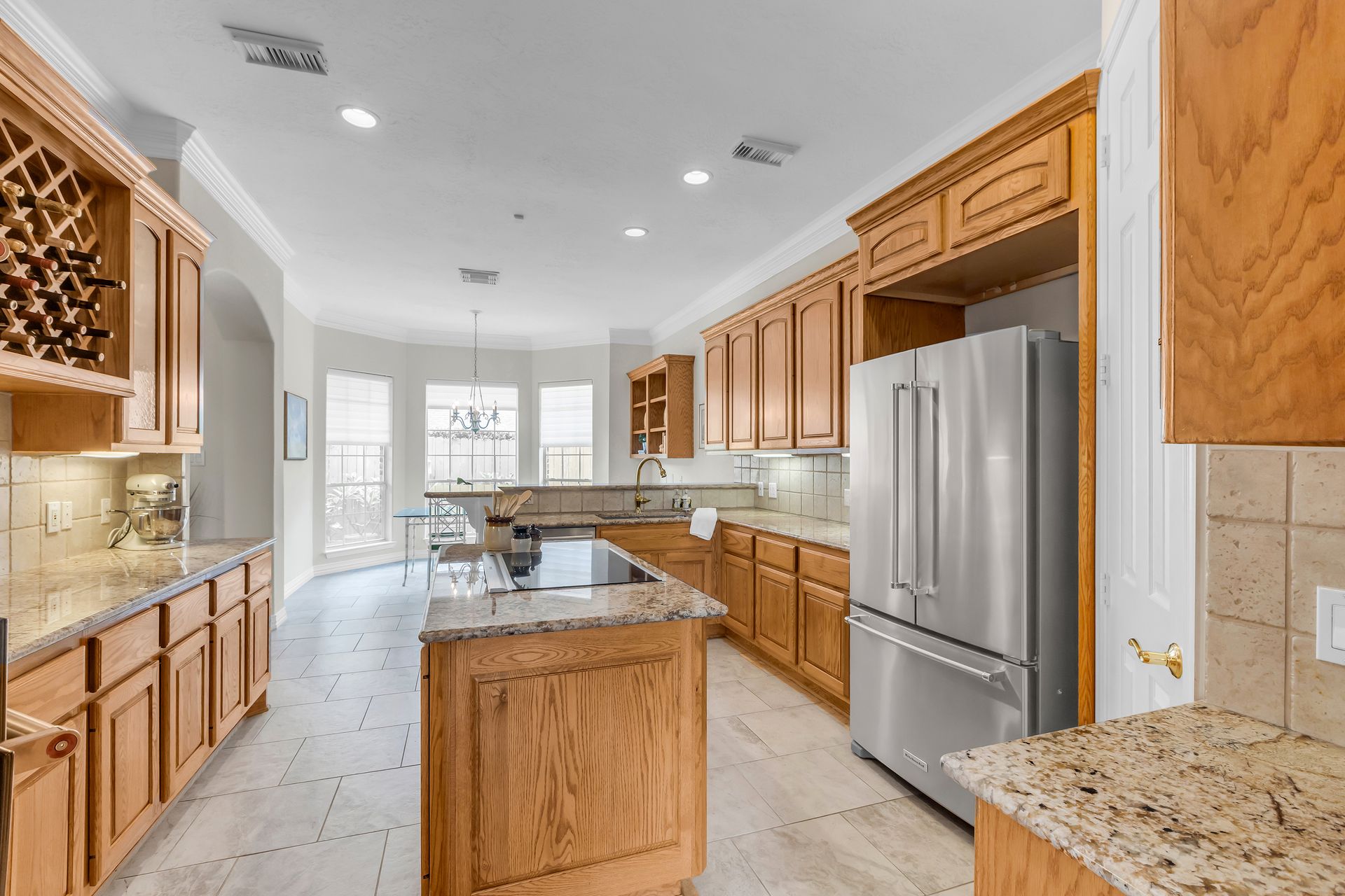 Experience refined one-story living in this custom-built all-brick home with stone cladding, ideally positioned on a corner cul-de-sac lot for both space and privacy. This three-bed, three-bath home features a flexible layout with a den and private study, perfect for work or relaxation. The open-concept design is accentuated by soaring ceilings, creating a light and airy ambiance in the entry, living, and dining areas. The guest suite to the left of the entry, with its en-suite bath, offers comfort and seclusion. The hall leading from the dining area provides privacy for the third bedroom, full bath, and den area. The expansive primary suite is a true retreat, boasting dual walk-in closets with custom-built-ins, a luxurious Jacuzzi tub, a separate shower, and a spacious vanity area. The double-car garage features three large closets and built-ins. Enjoy year-round relaxation on the covered back porch. A side yard includes a generator. This home is just a short distance from the Terry Hershey Trails.