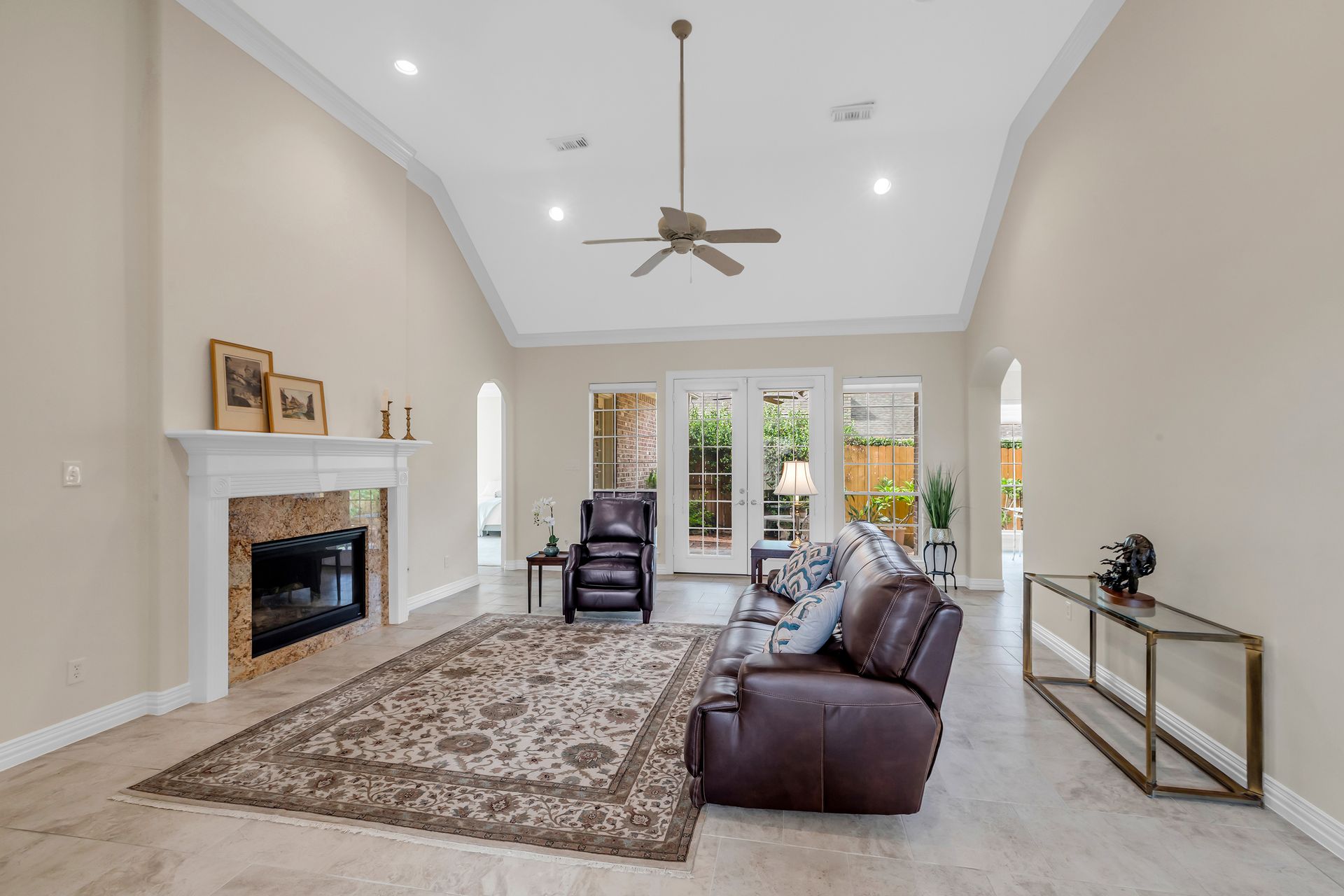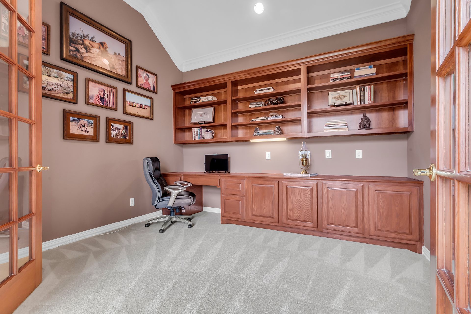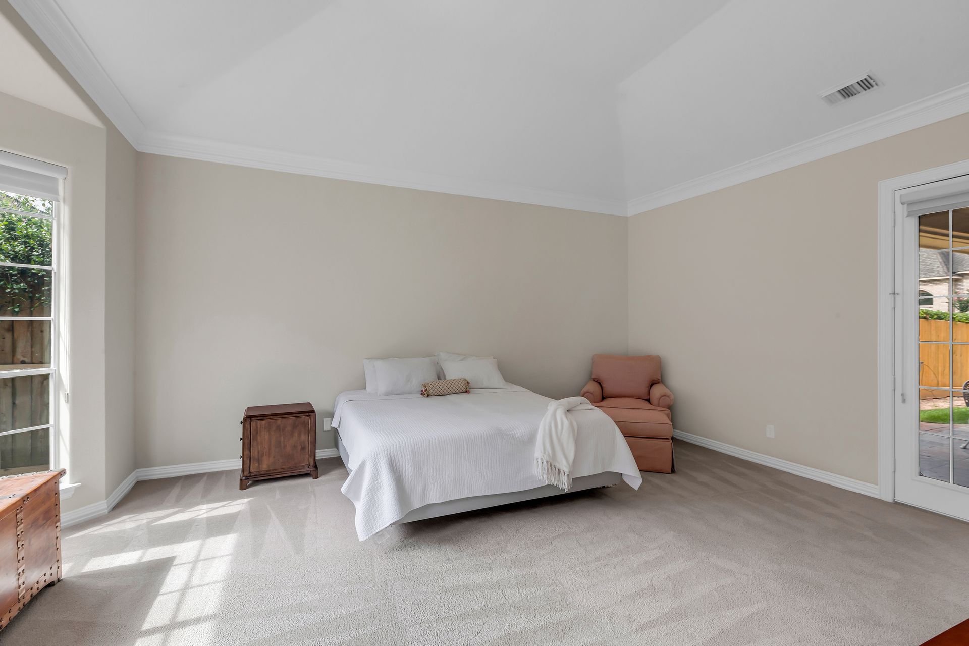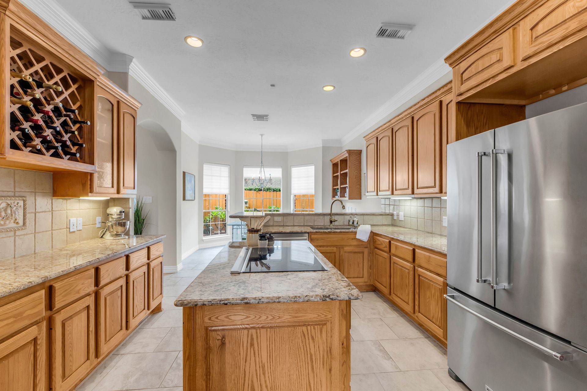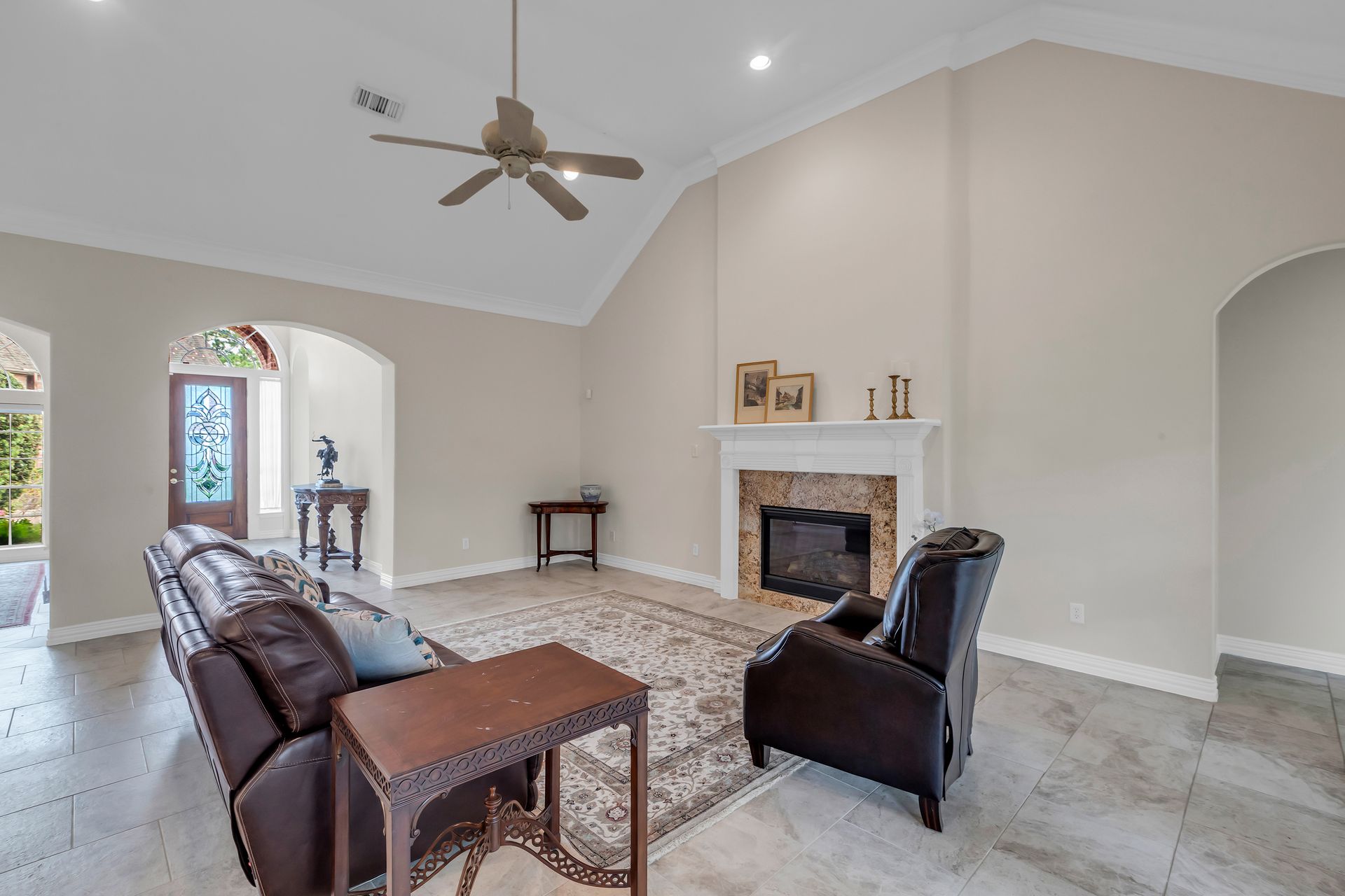 Experience refined one-story living in this custom-built all-brick home with stone cladding, ideally positioned on a corner cul-de-sac lot for both space and privacy. This three-bed, three-bath home features a flexible layout with a den and private study, perfect for work or relaxation. The open-concept design is accentuated by soaring ceilings, creating a light and airy ambiance in the entry, living, and dining areas. The guest suite to the left of the entry, with its en-suite bath, offers comfort and seclusion. The hall leading from the dining area provides privacy for the third bedroom, full bath, and den area. The expansive primary suite is a true retreat, boasting dual walk-in closets with custom-built-ins, a luxurious Jacuzzi tub, a separate shower, and a spacious vanity area. The double-car garage features three large closets and built-ins. Enjoy year-round relaxation on the covered back porch. A side yard includes a generator. This home is just a short distance from the Terry Hershey Trails.