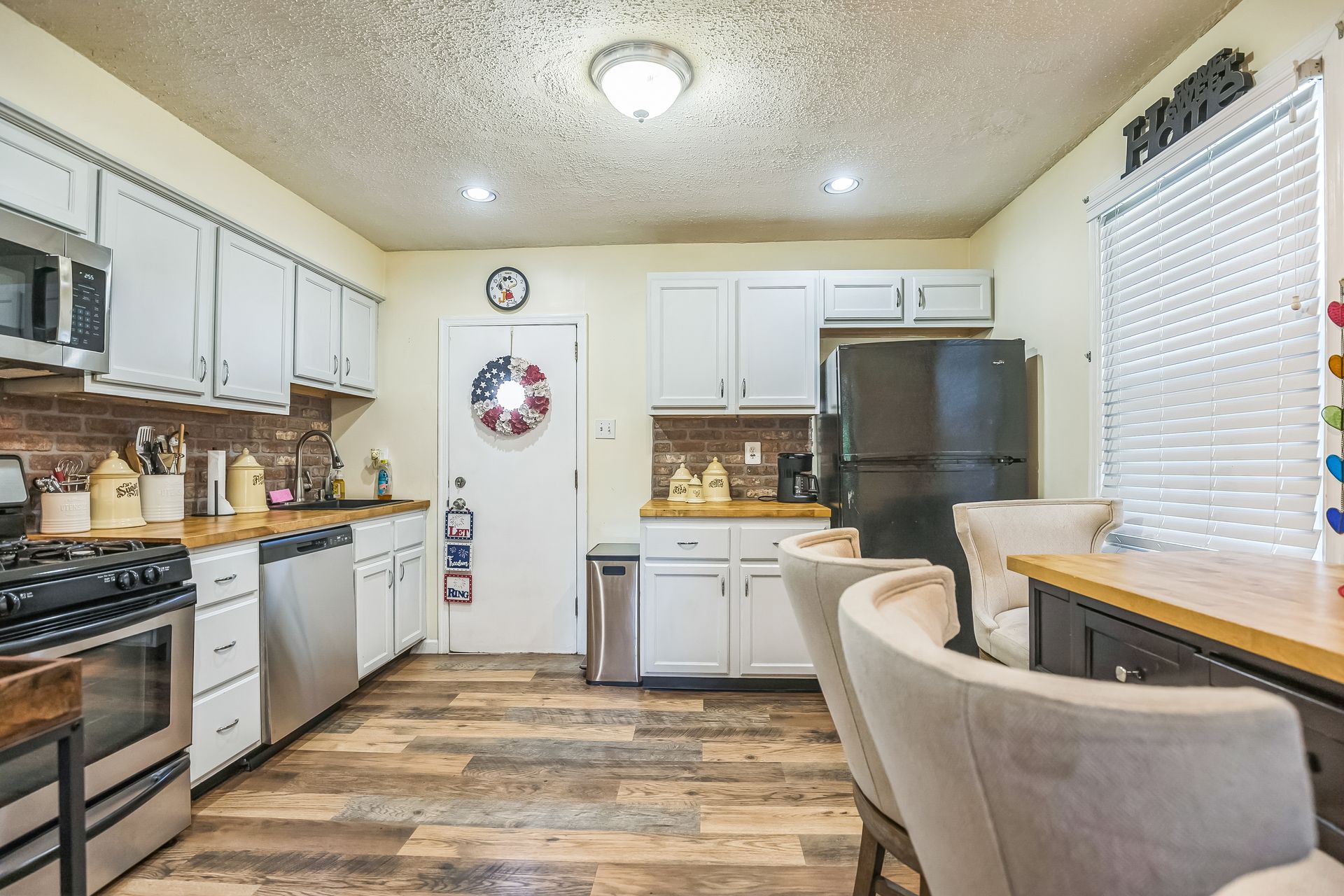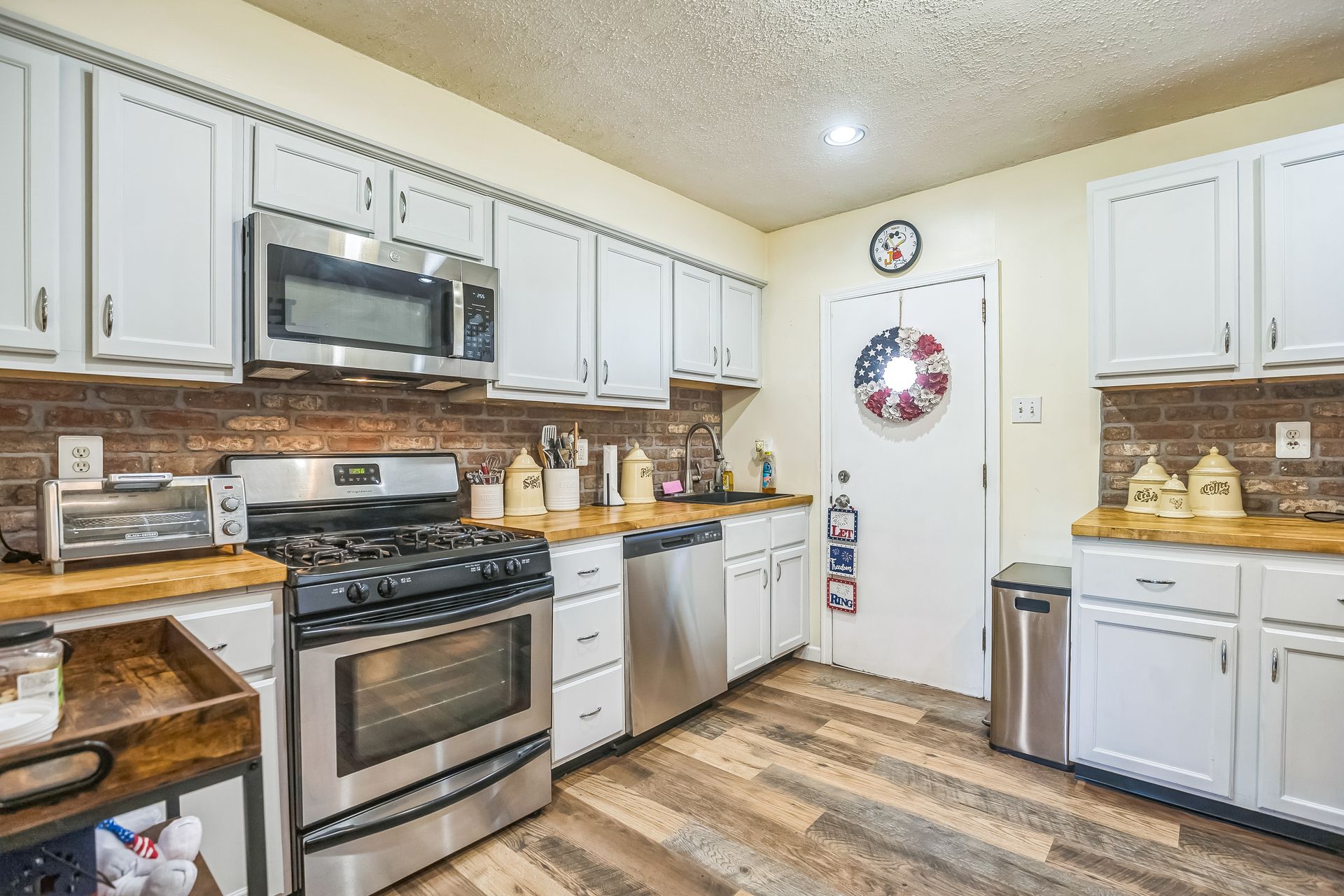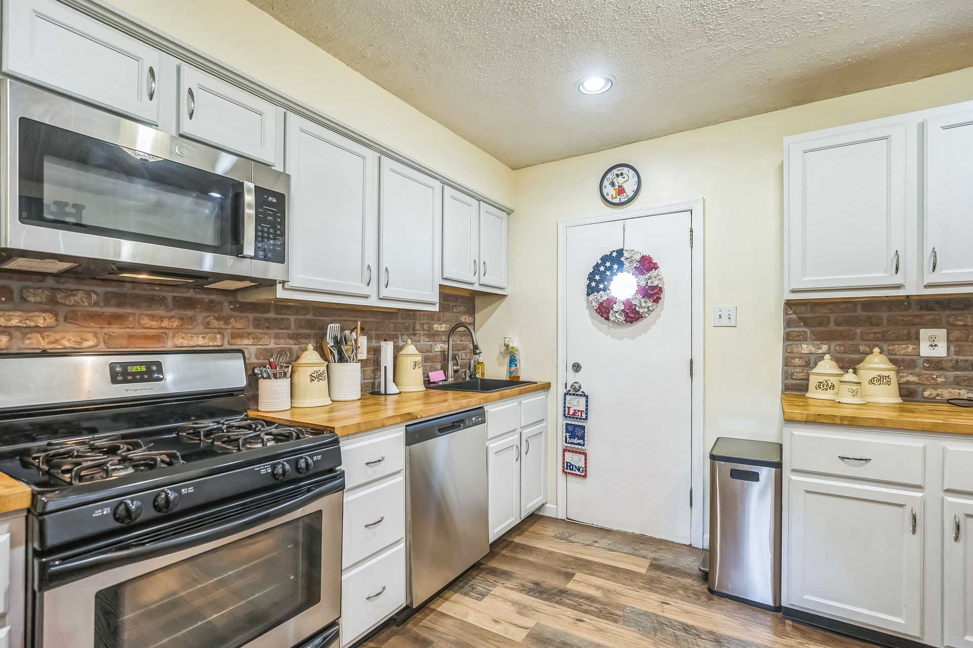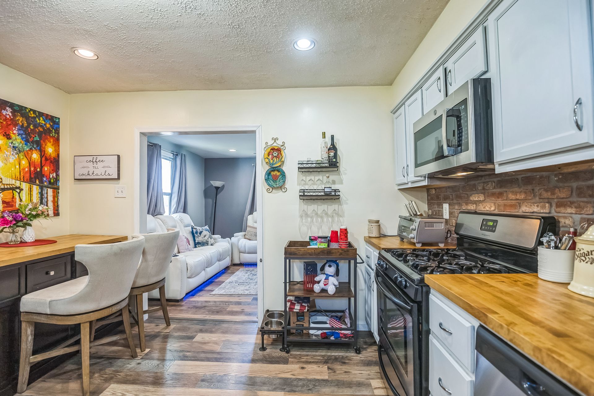 The updated kitchen features butcher block countertops, a brick backsplash, white cabinetry and stainless steel appliances. Two main-floor bedrooms offer flexibility for guests, a home office, or a first floor laundry room.