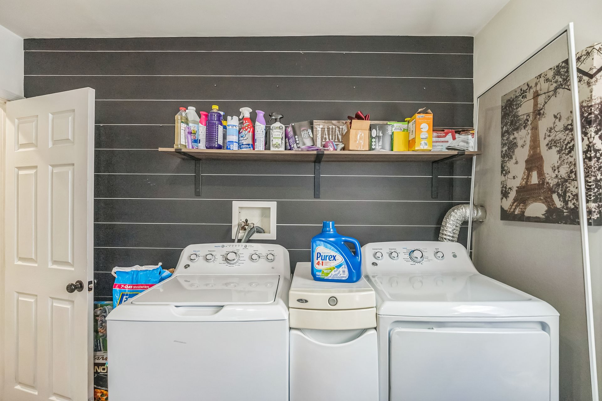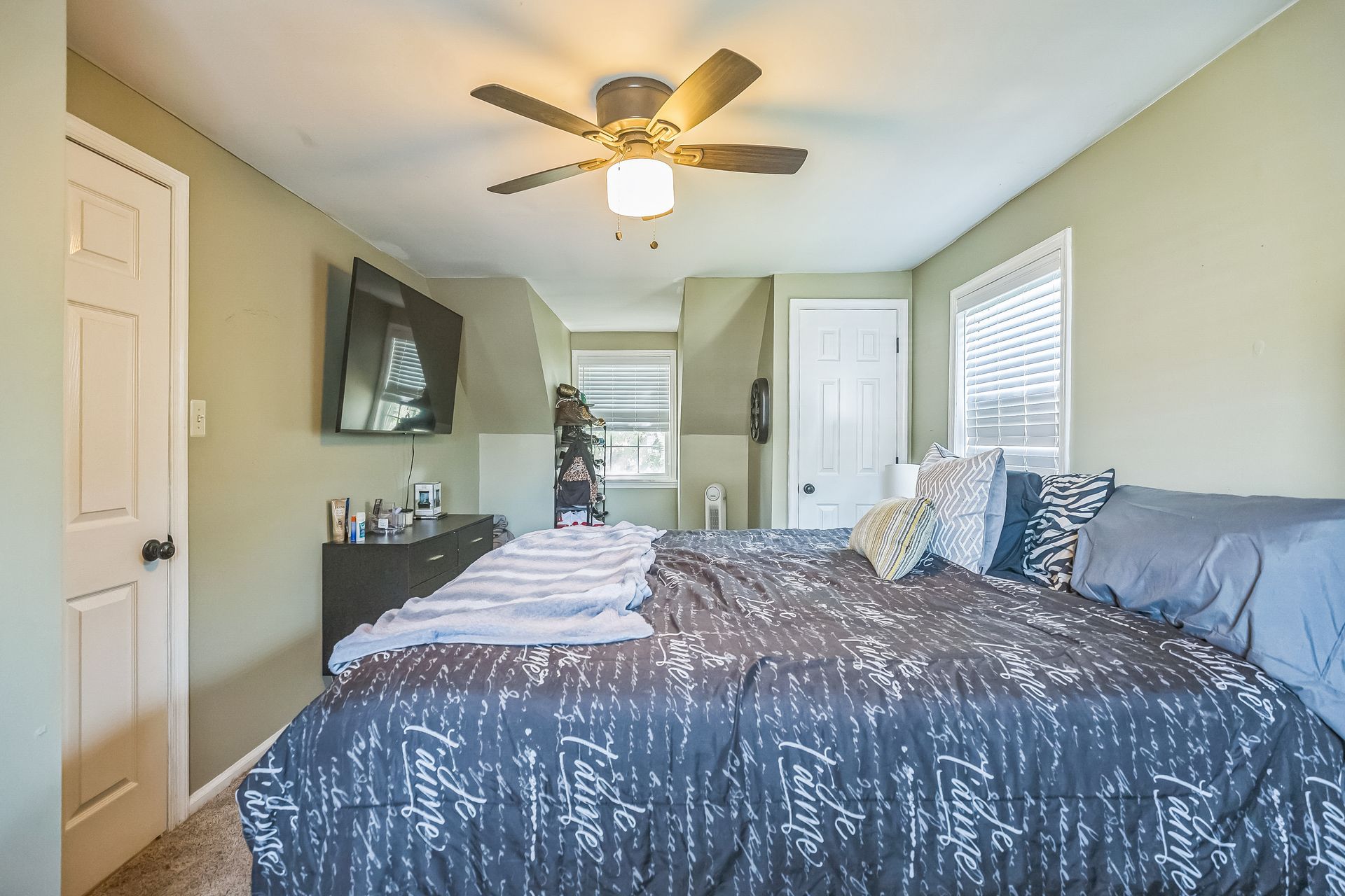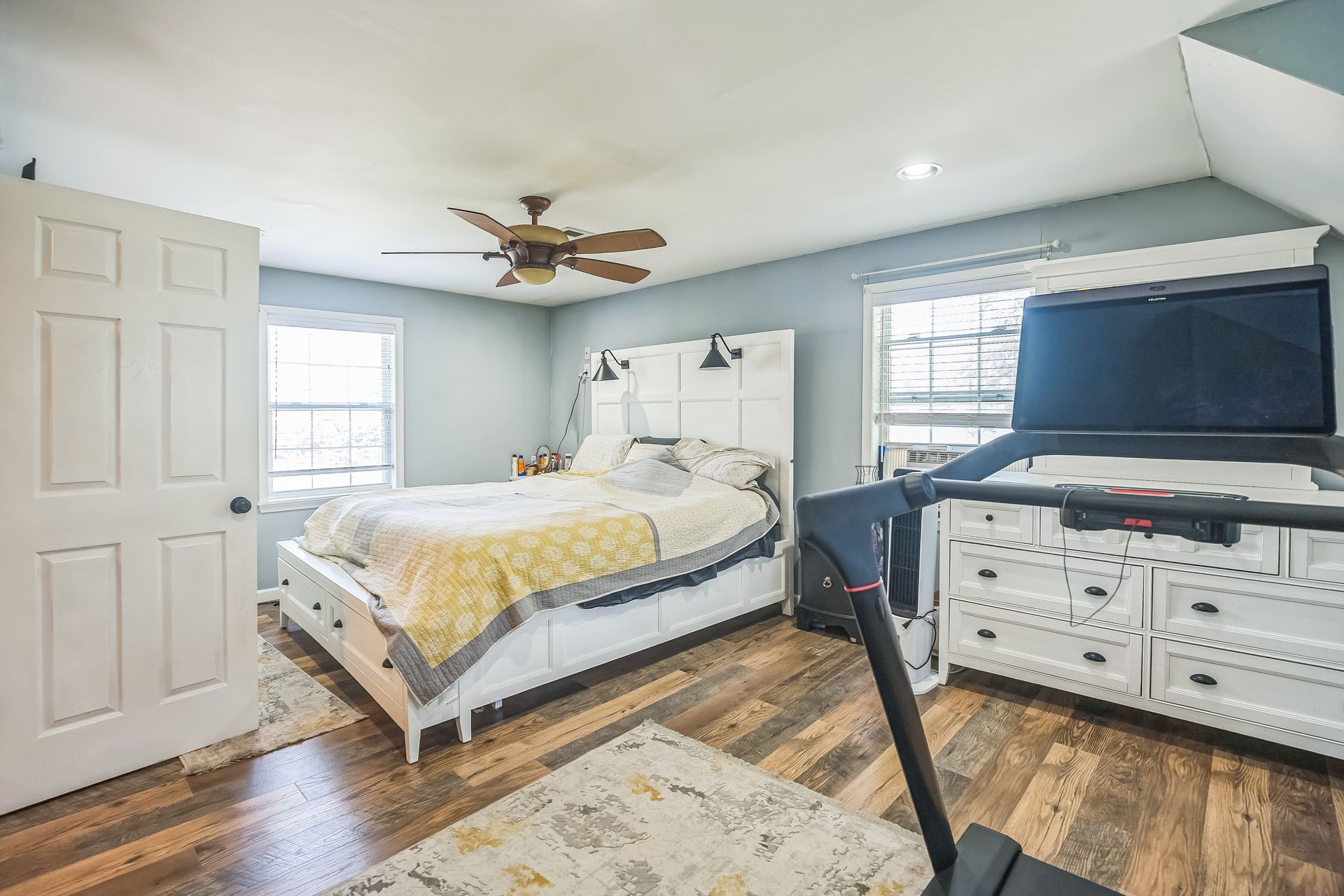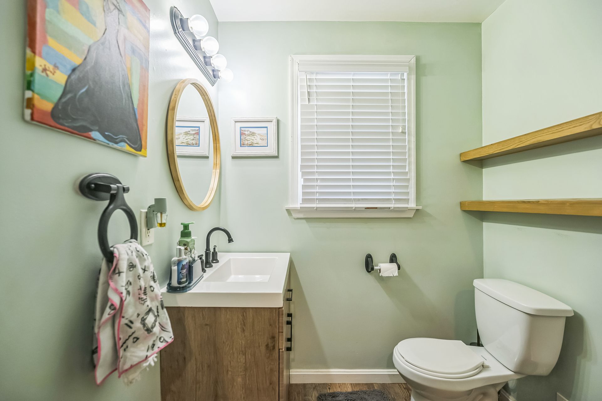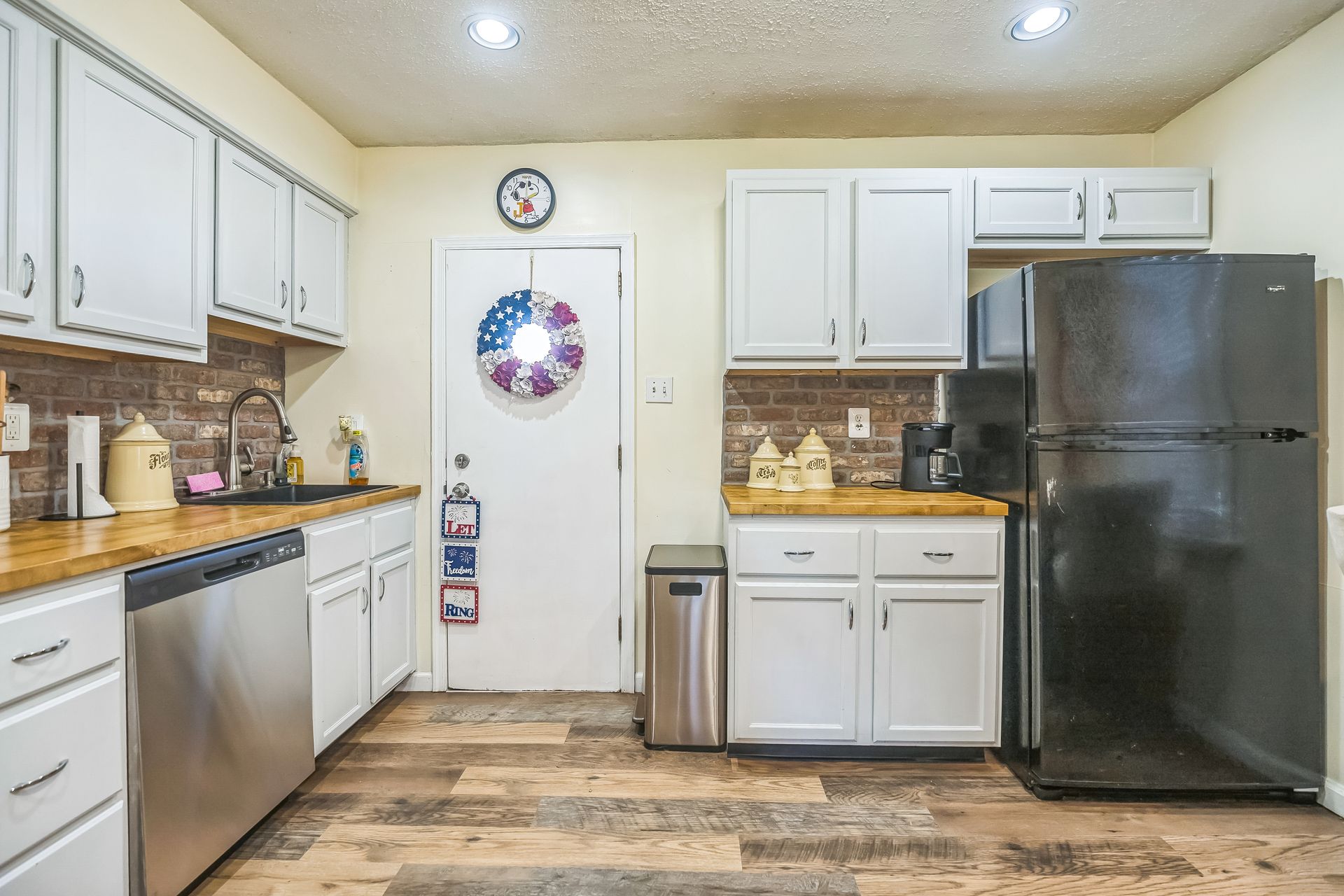 The updated kitchen features butcher block countertops, a brick backsplash, white cabinetry and stainless steel appliances. Two main-floor bedrooms offer flexibility for guests, a home office, or a first floor laundry room.