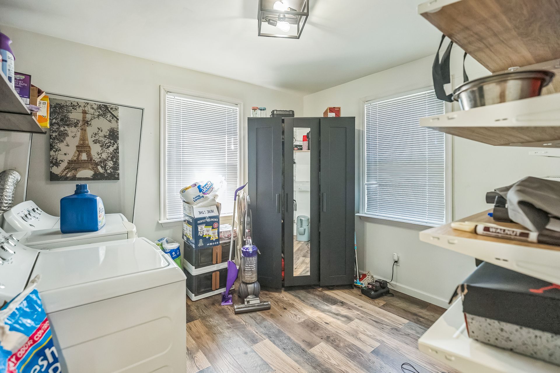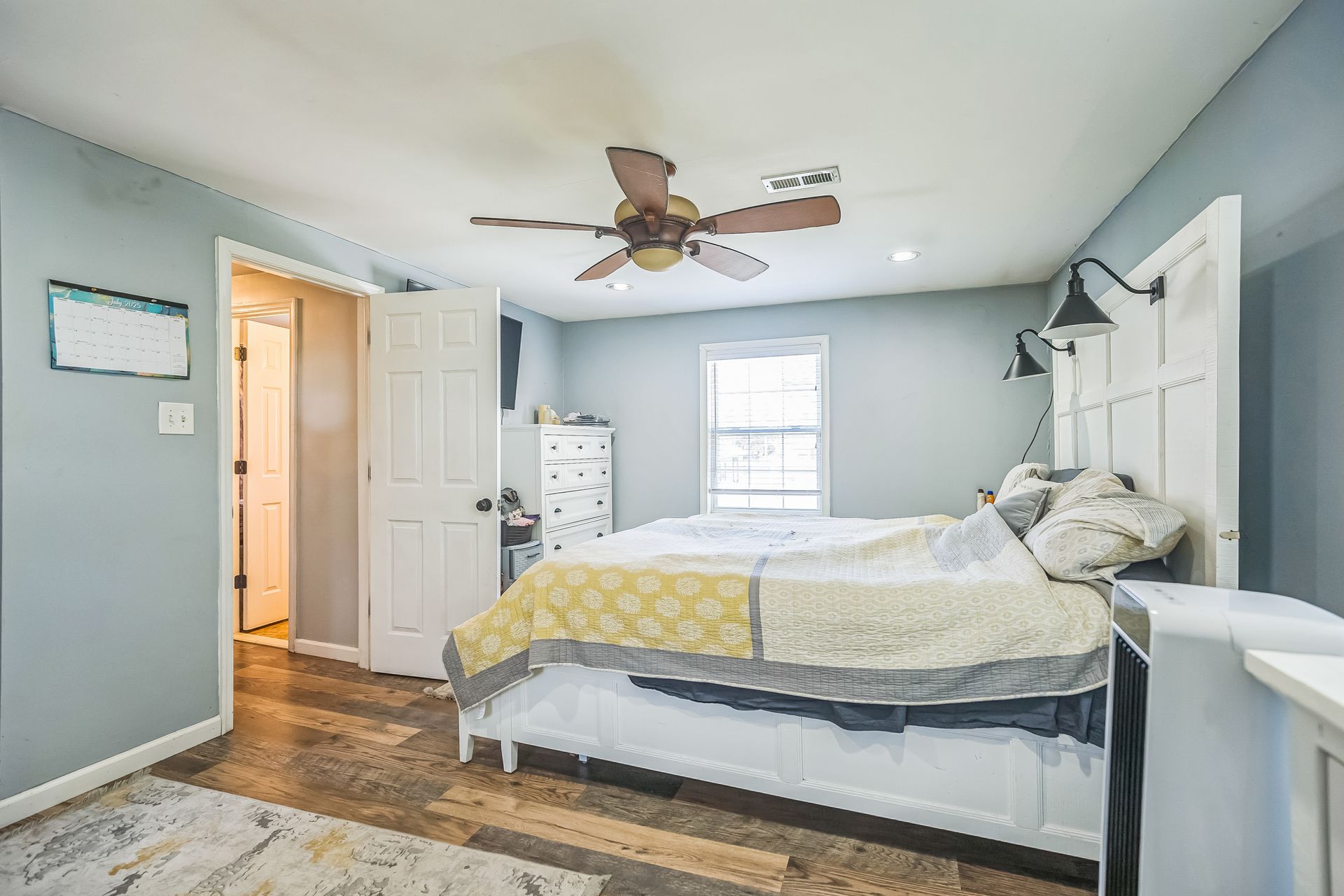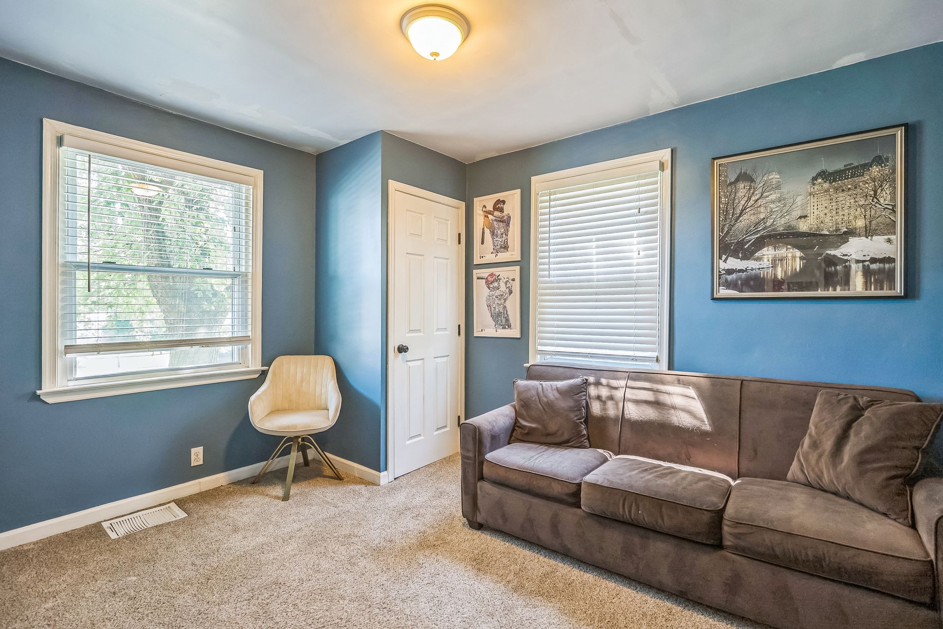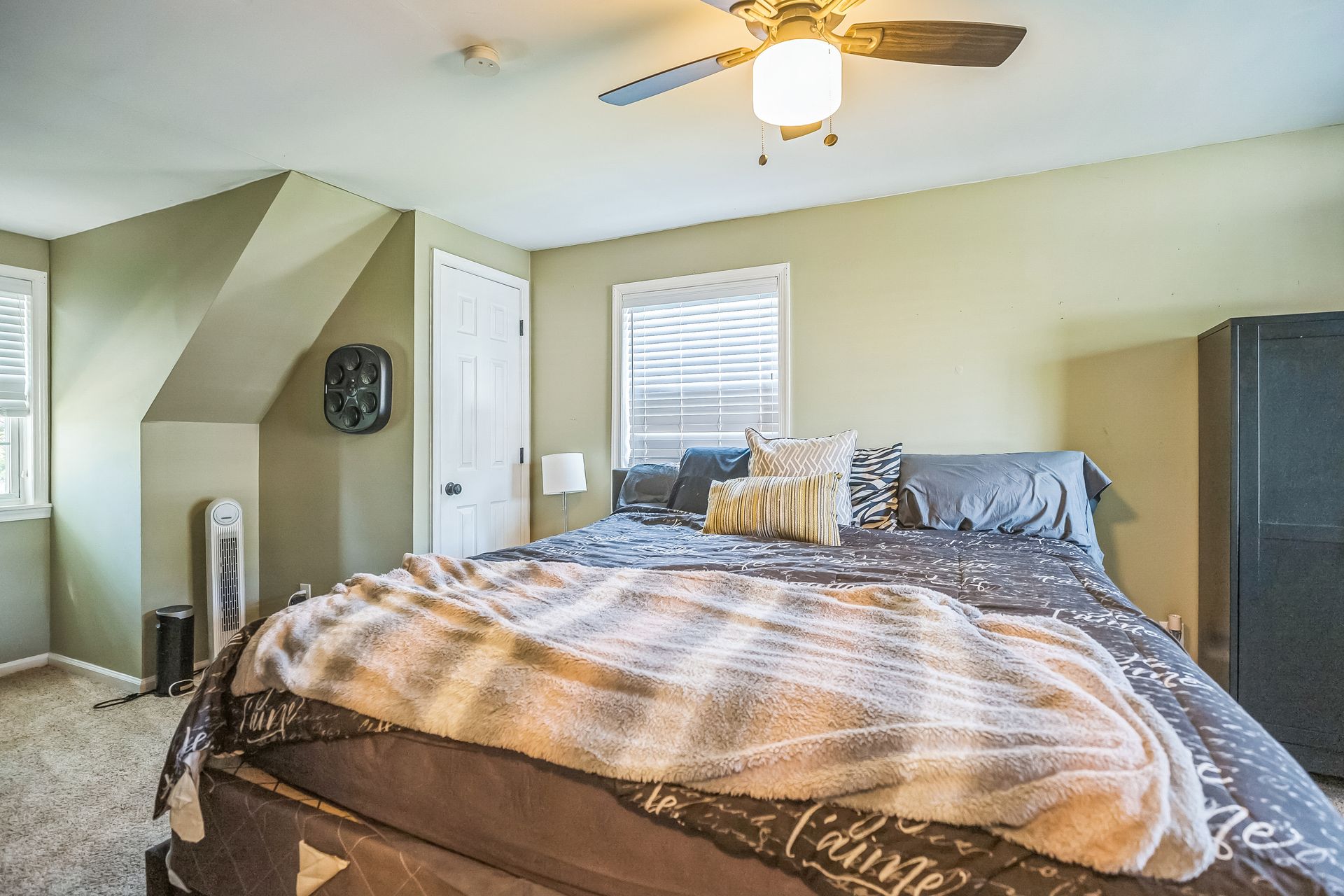 The updated kitchen features butcher block countertops, a brick backsplash, white cabinetry and stainless steel appliances. Two main-floor bedrooms offer flexibility for guests, a home office, or a first floor laundry room.