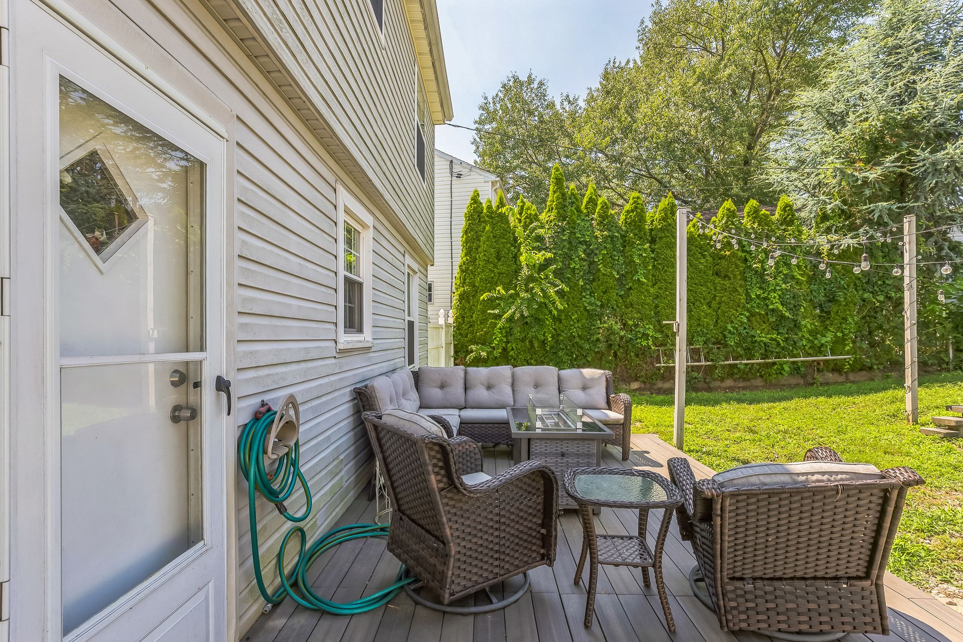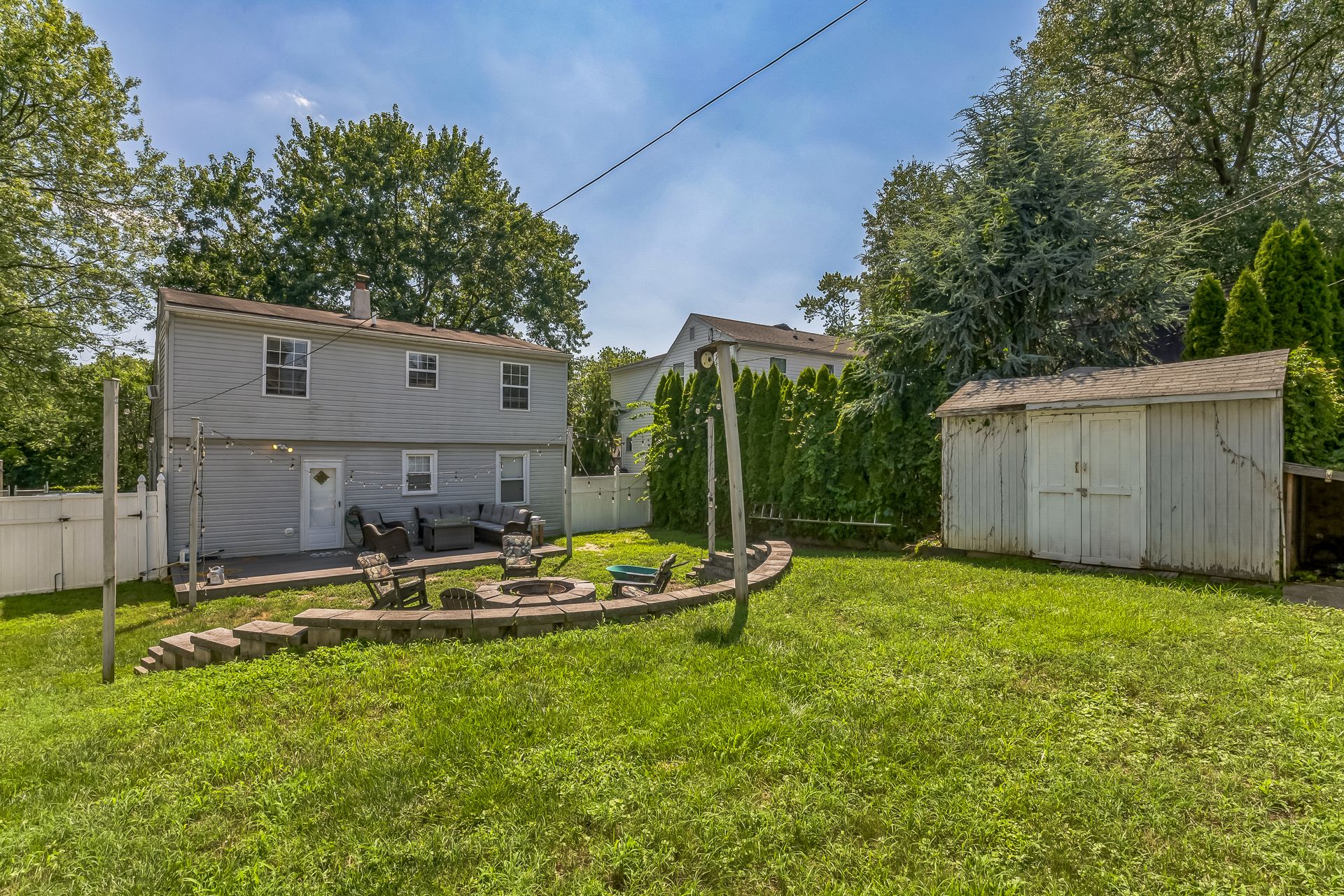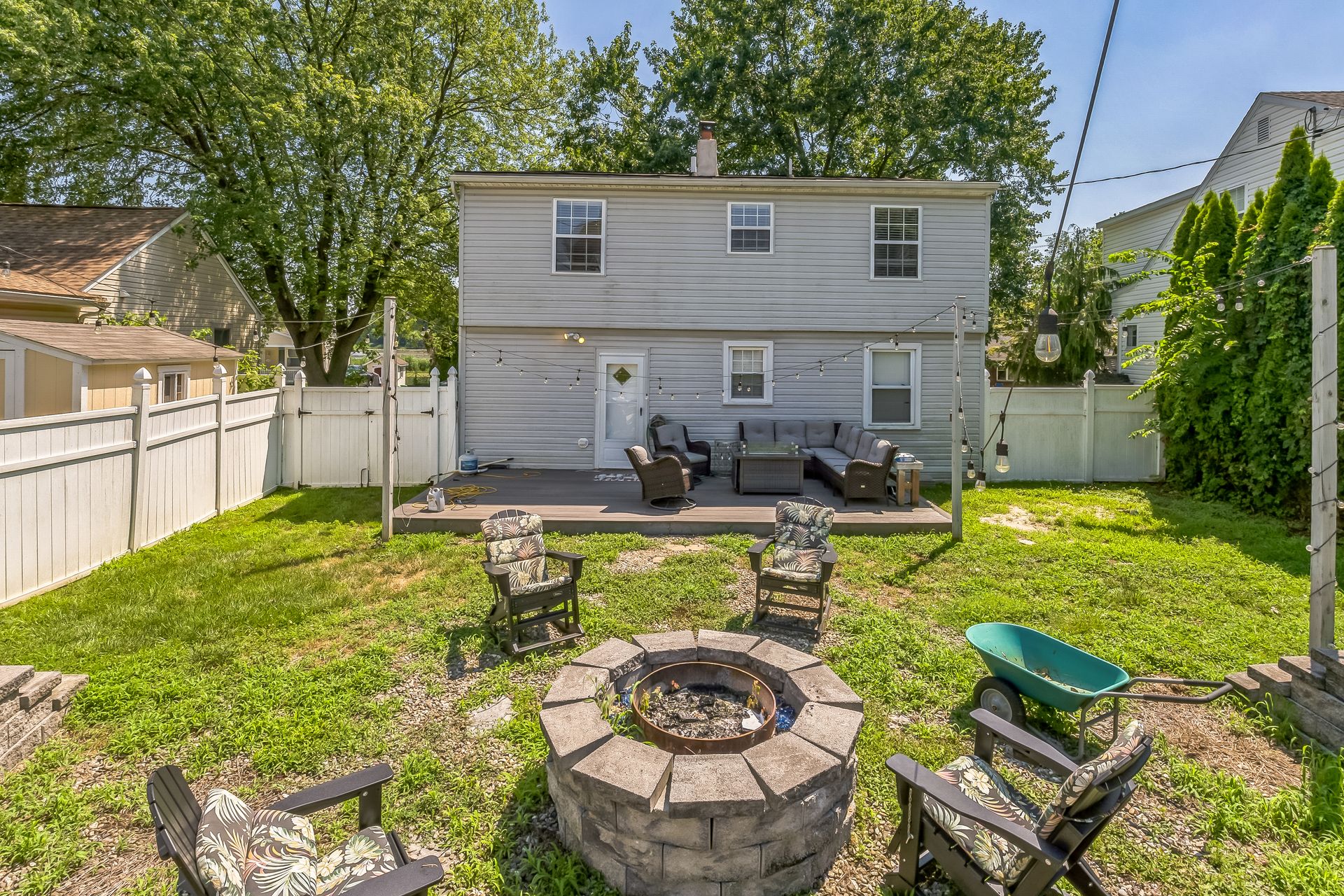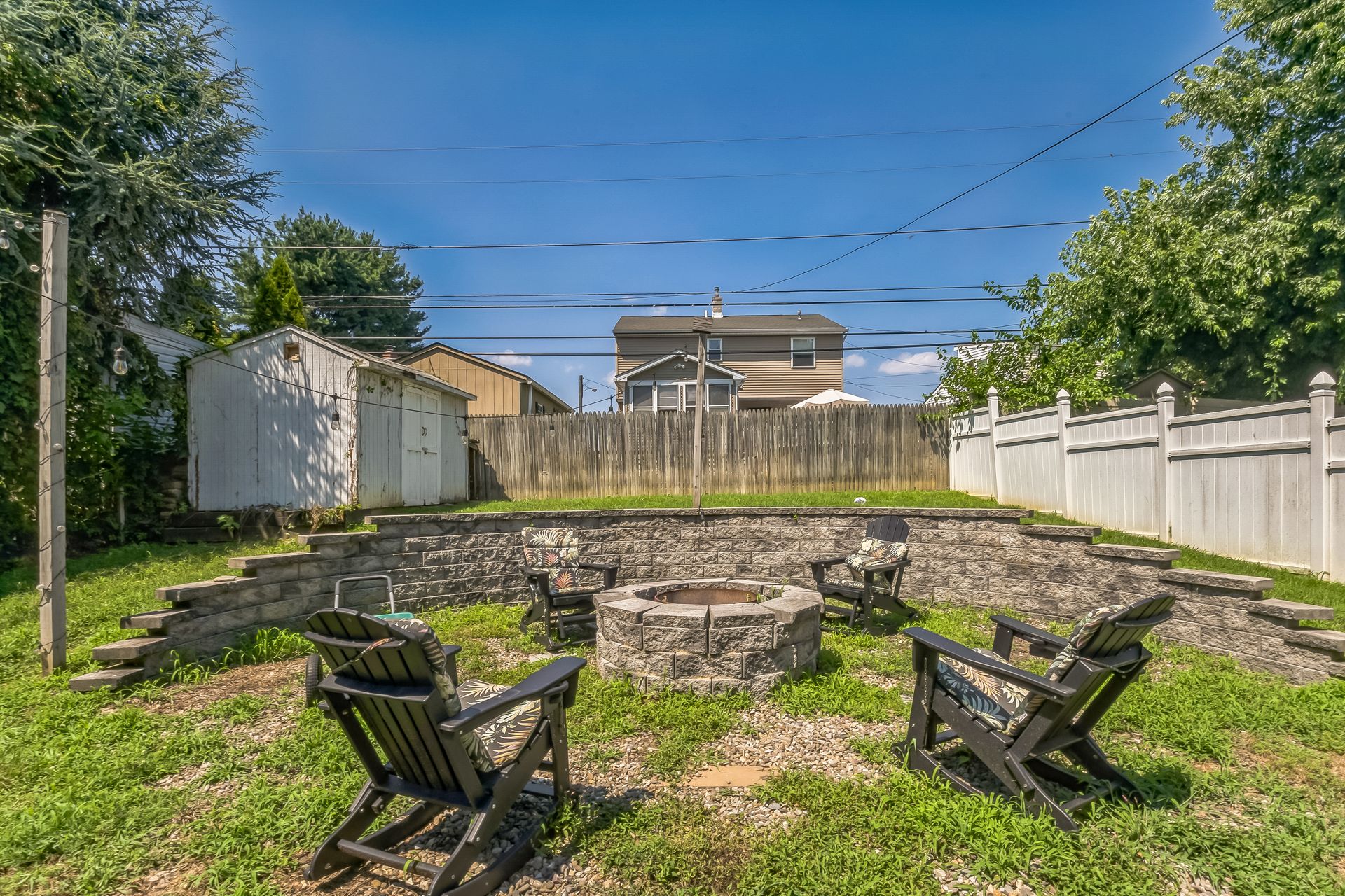 The fully fenced backyard is perfect for entertaining, with a large deck, stone fire pit, and a spacious shed for storage.
