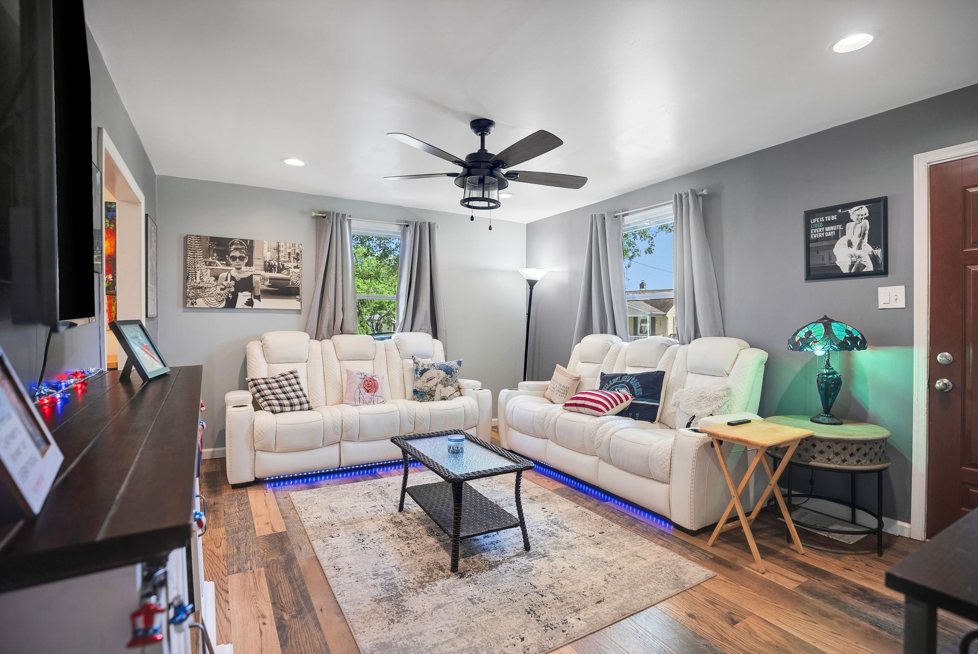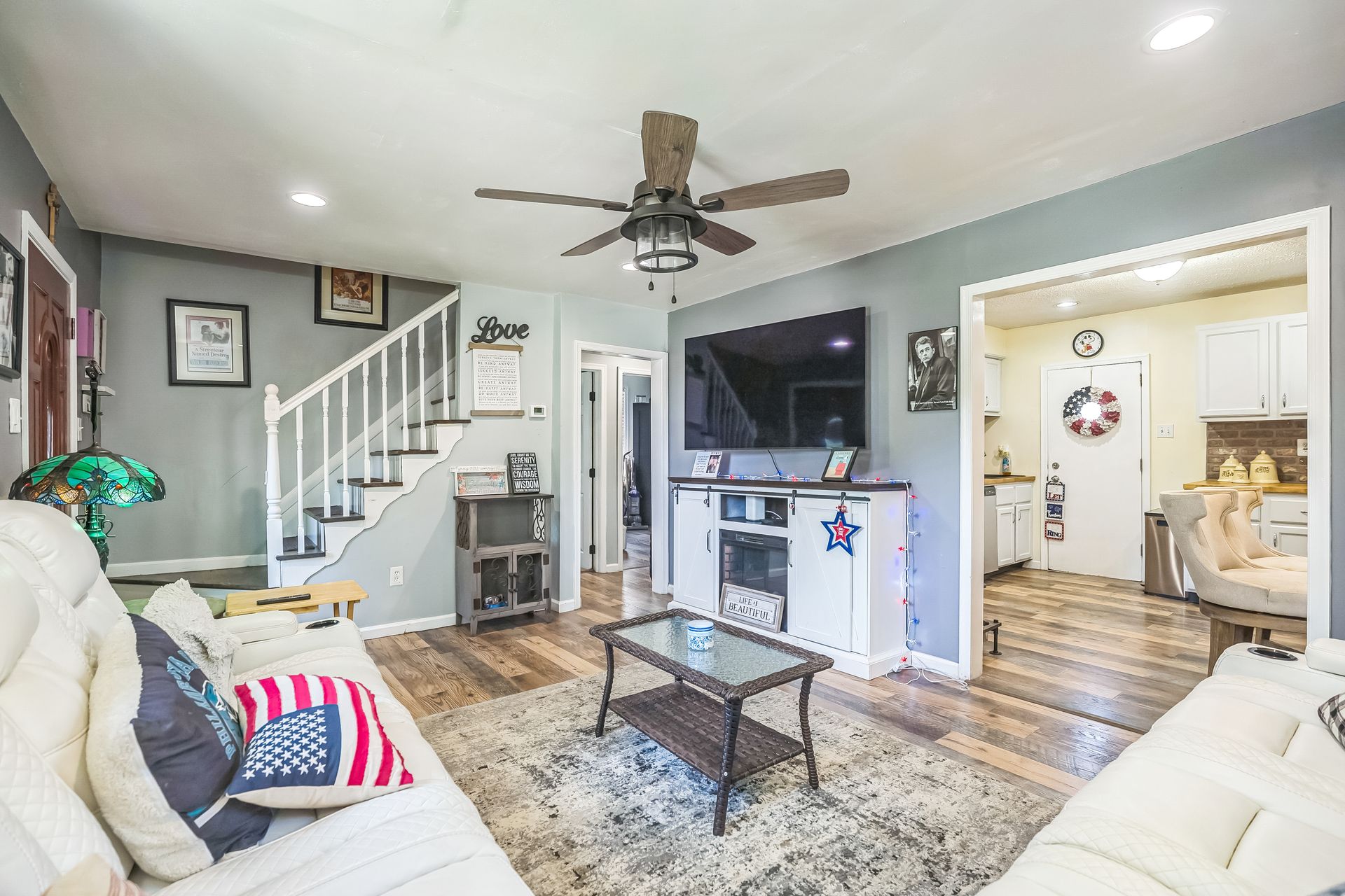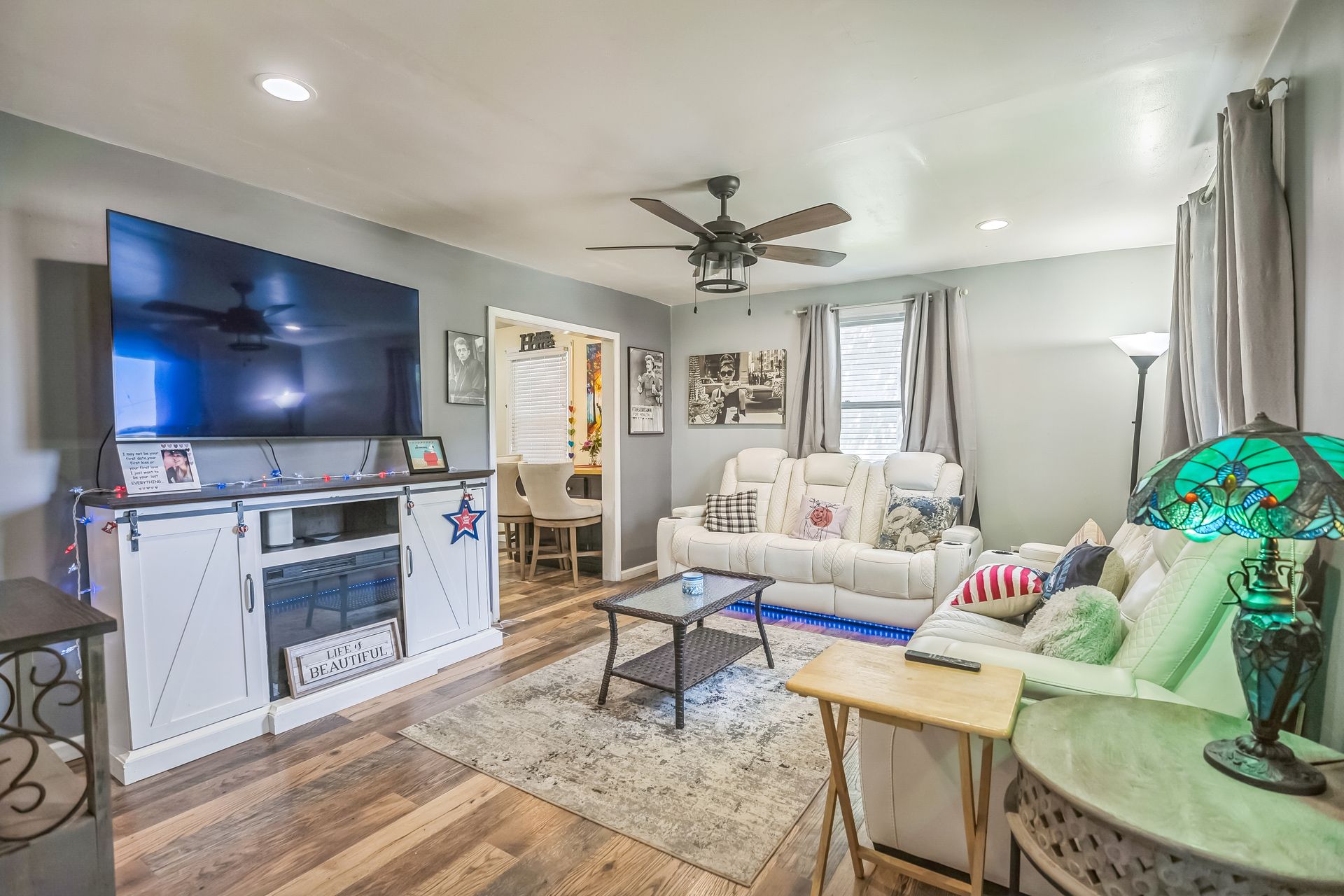 Inside, luxury vinyl flooring flows through much of the main level, starting in the cozy living room with an electric fireplace, recessed lighting, and ceiling fan—perfect for relaxing evenings.