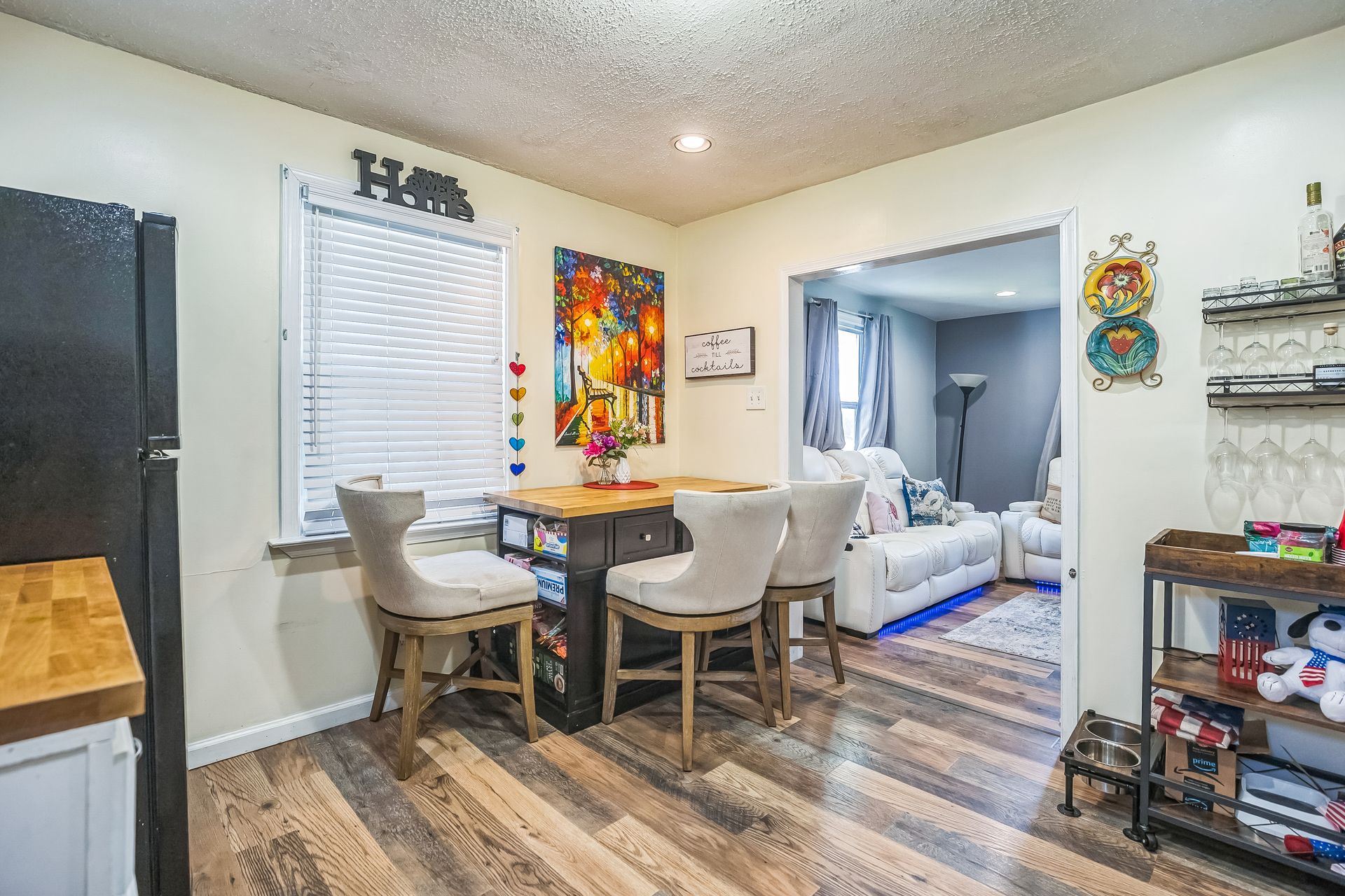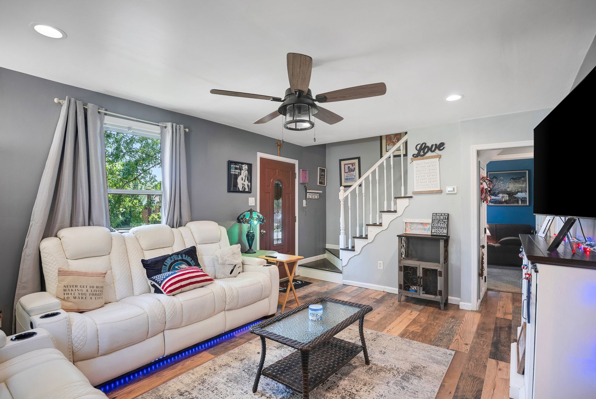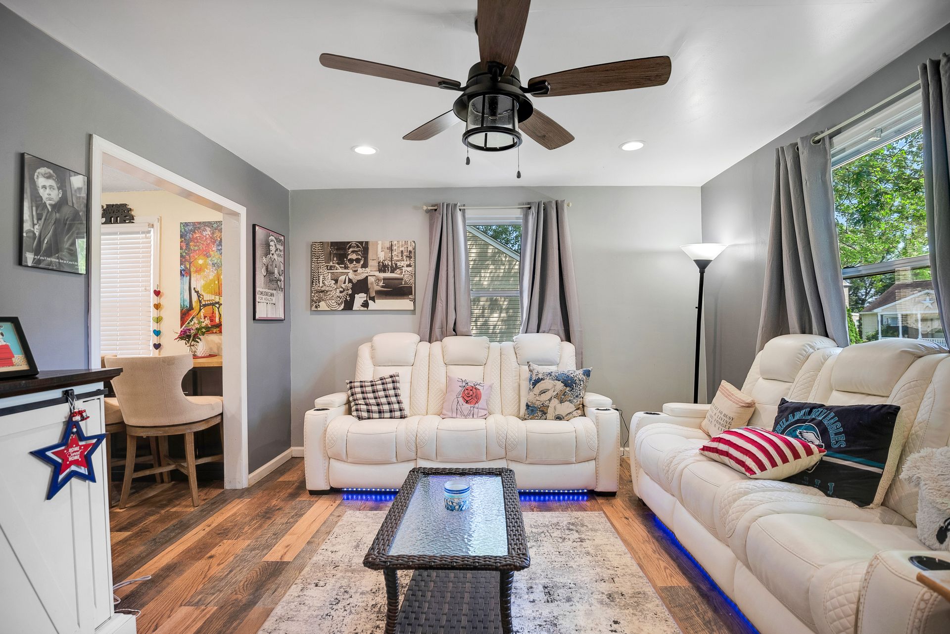 Inside, luxury vinyl flooring flows through much of the main level, starting in the cozy living room with an electric fireplace, recessed lighting, and ceiling fan—perfect for relaxing evenings.