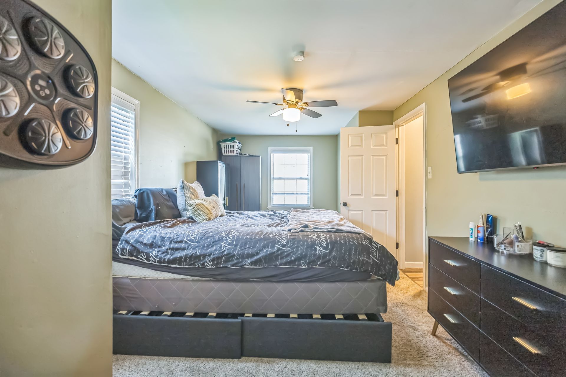 Upstairs, the spacious primary suite includes another electric fireplace, recessed lighting, and ceiling fan, plus a fourth bedroom and a second full bath.