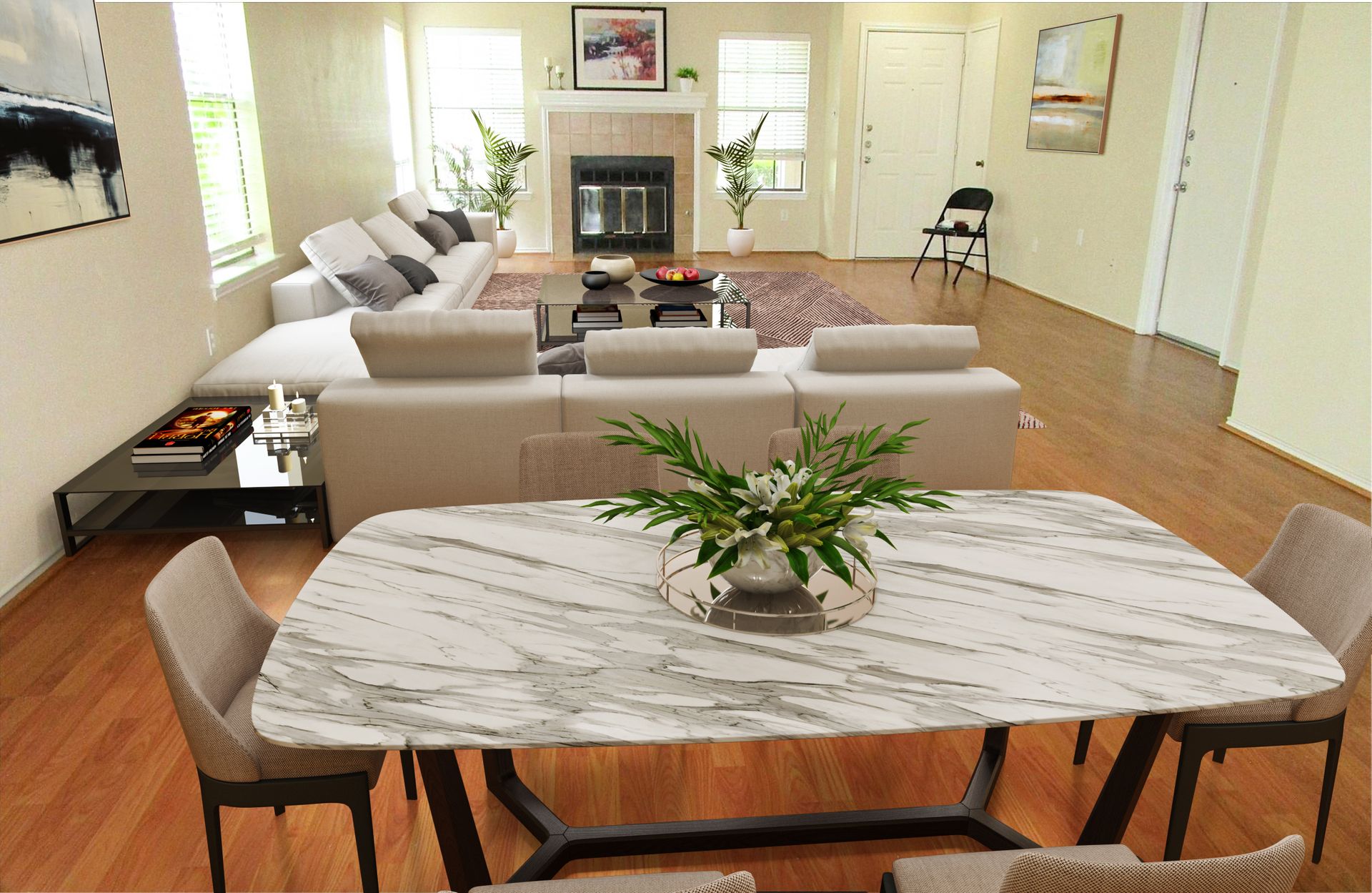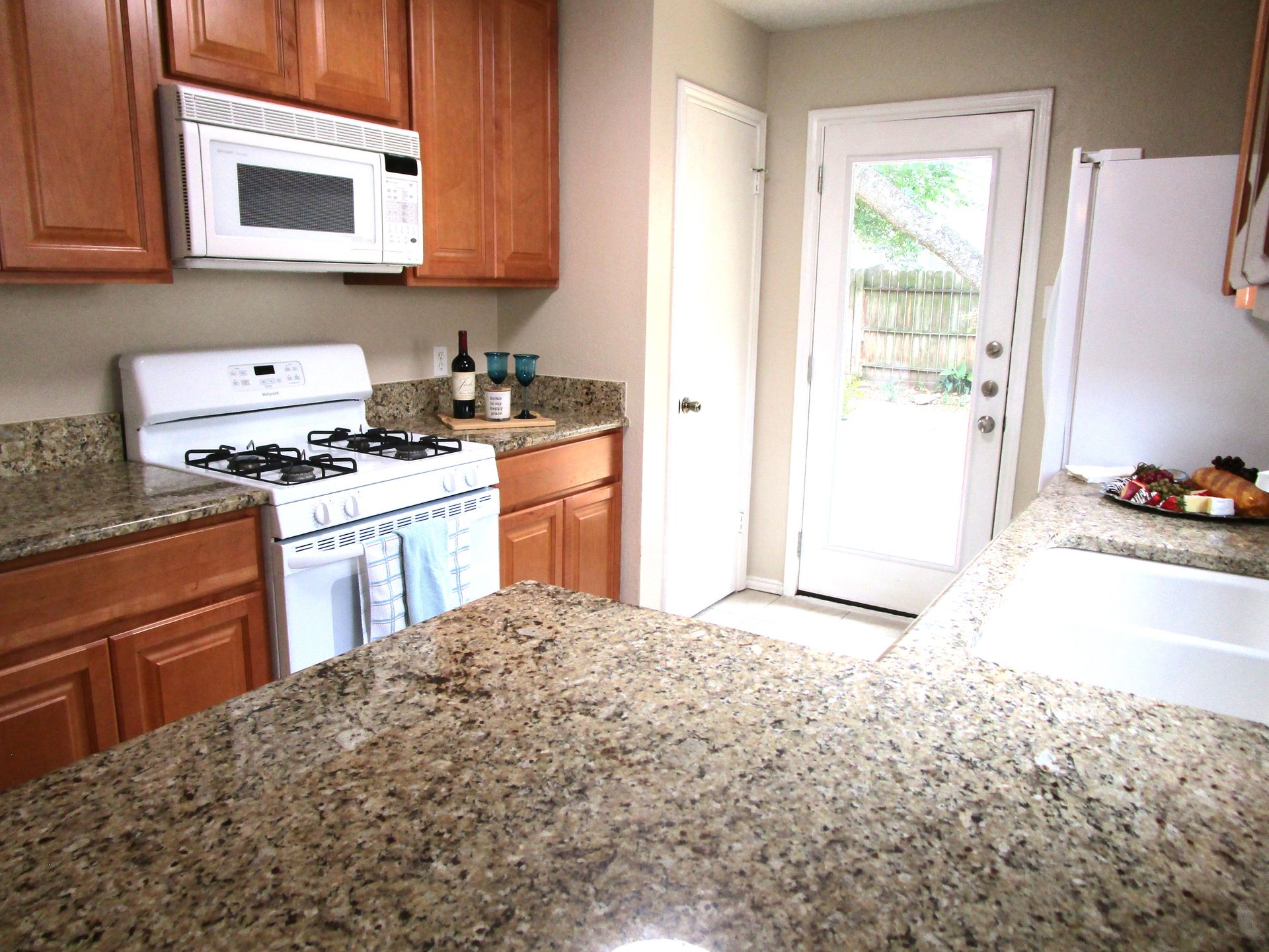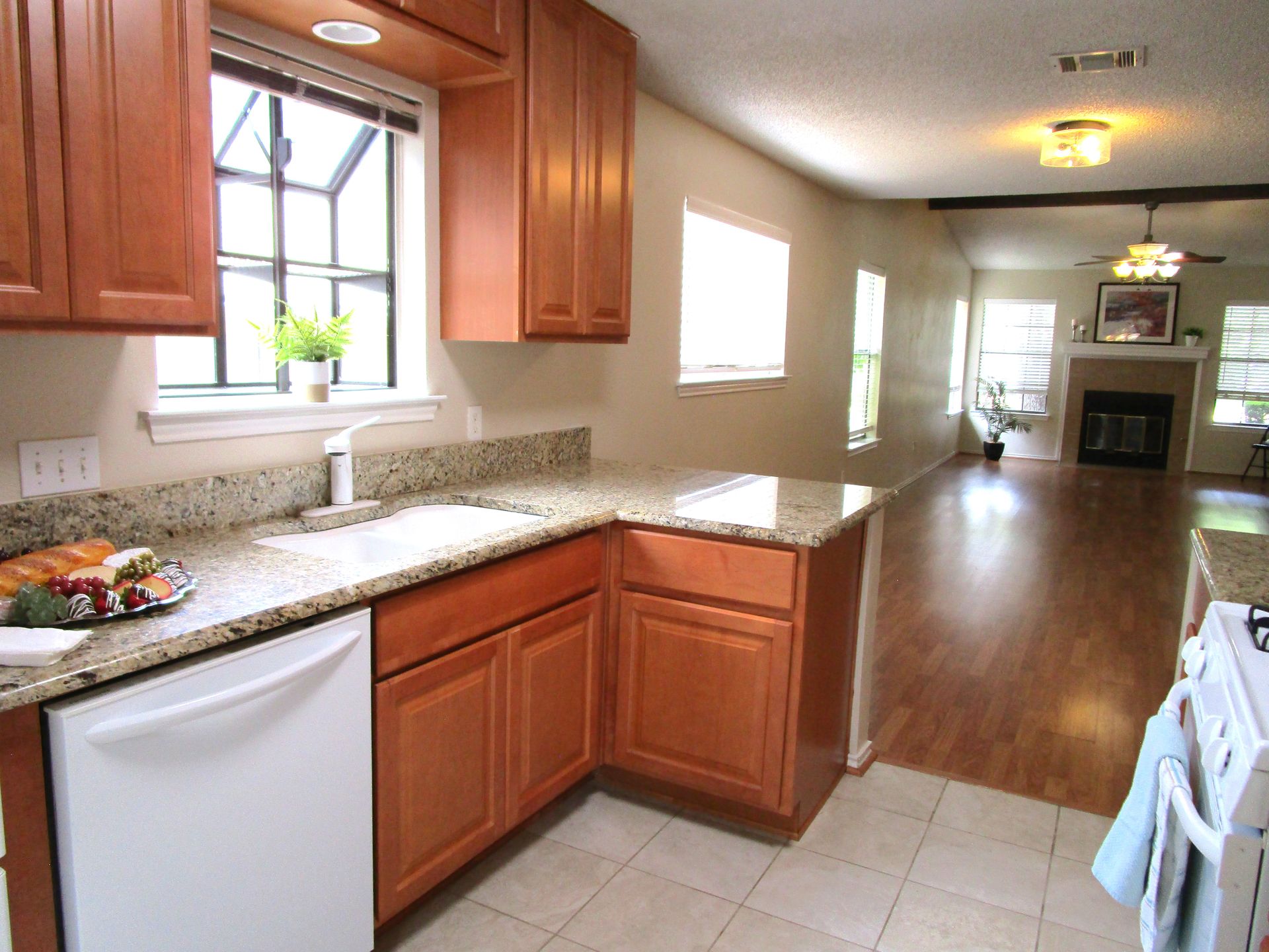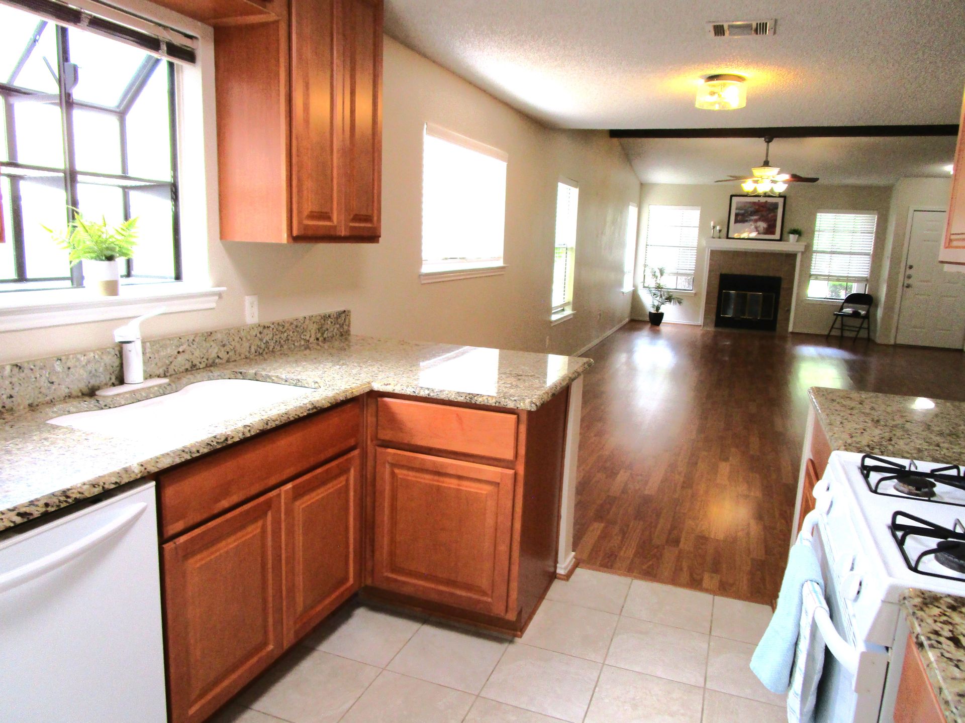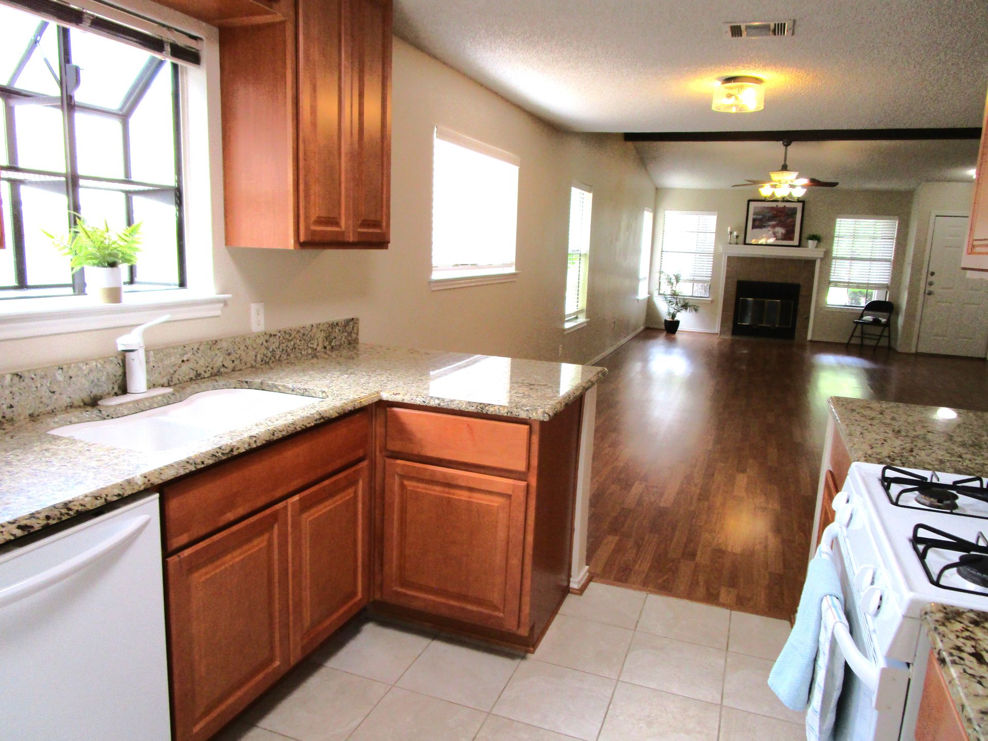 This open floor plan allows for ease of conversation while entertaining. The recently updated kitchen features~a bay window over the sink, where you can enjoy growing your favorite herbs & flowers~neutral granite countertops & updated 42” cabinets, which provide ample storage for all your cookware~