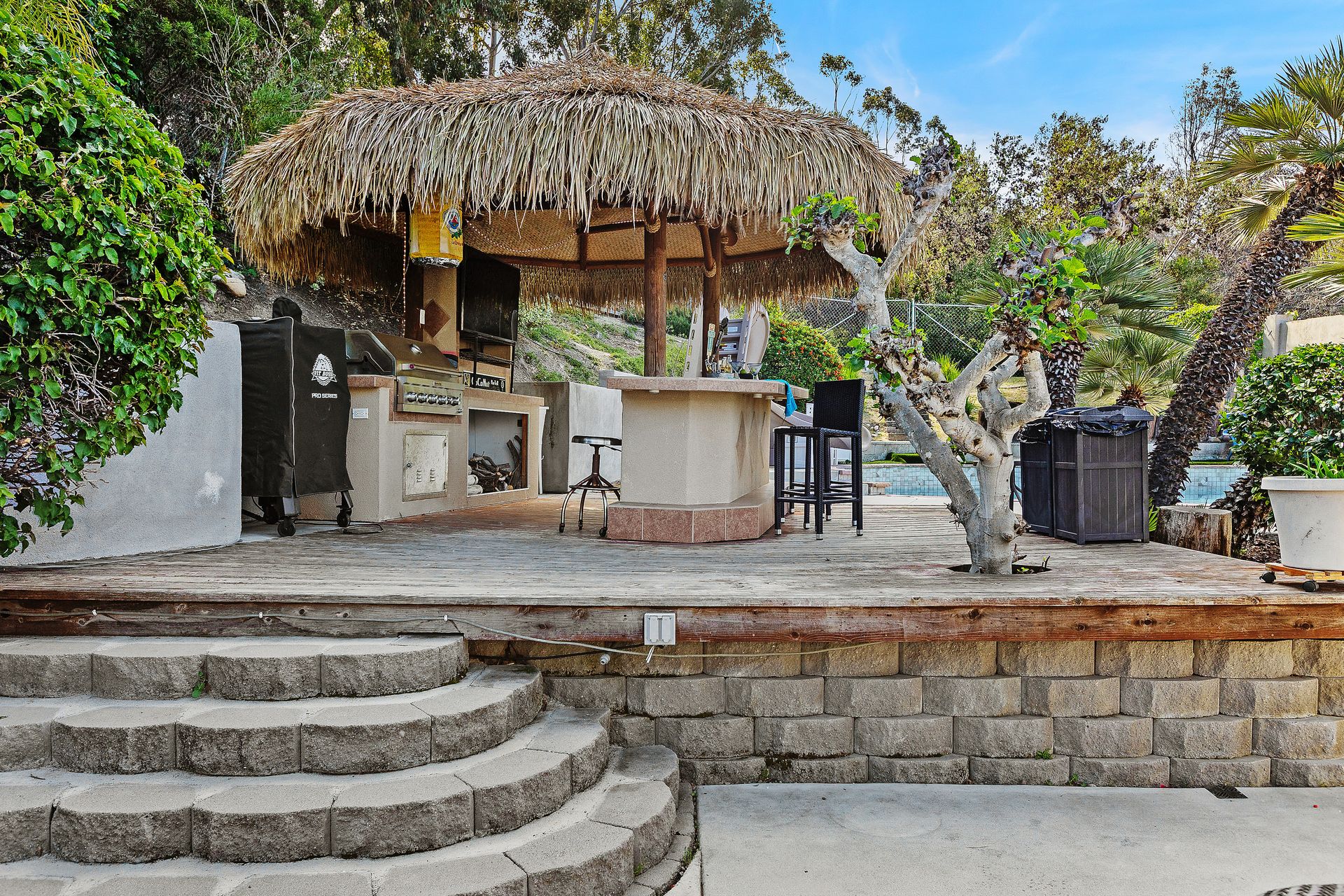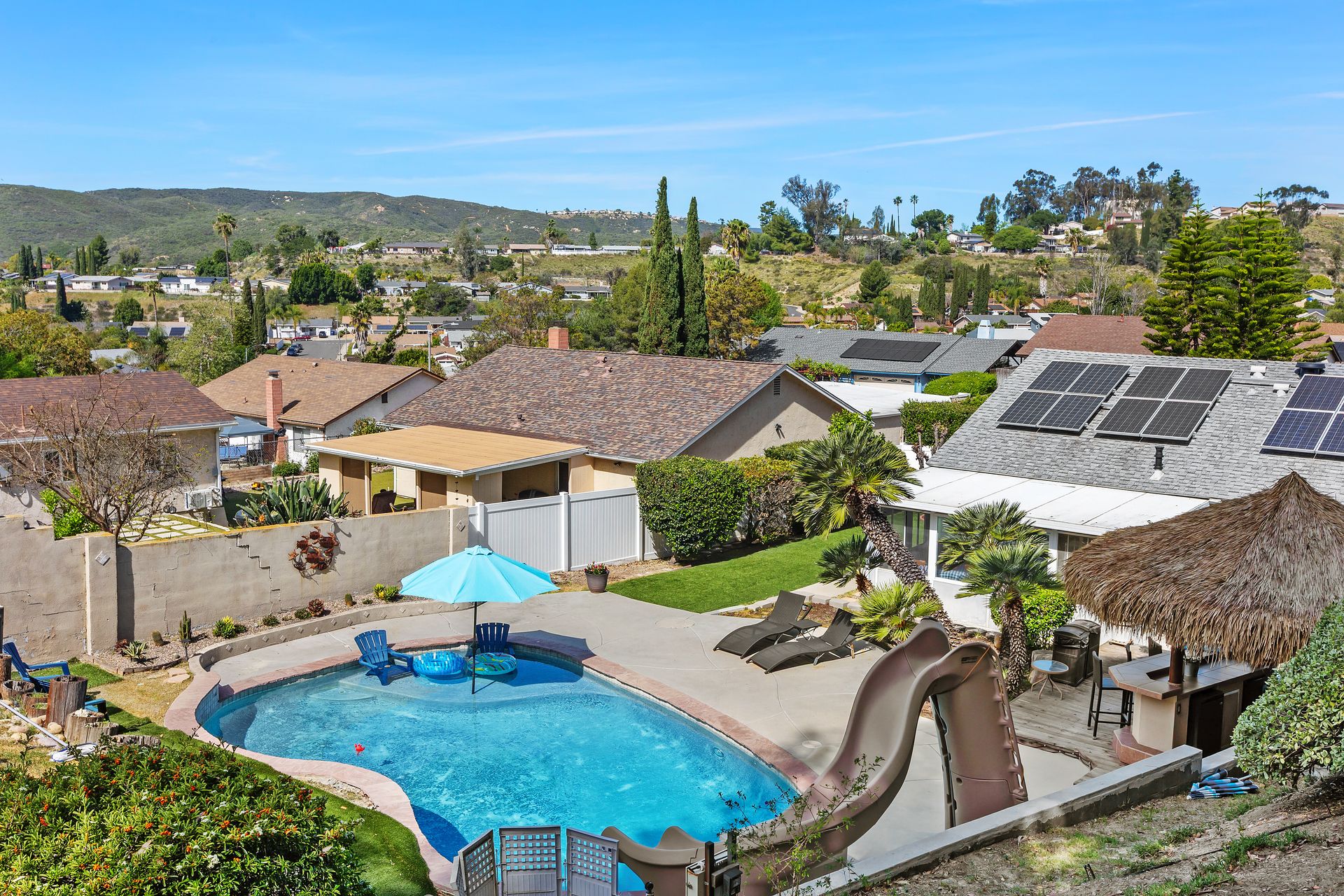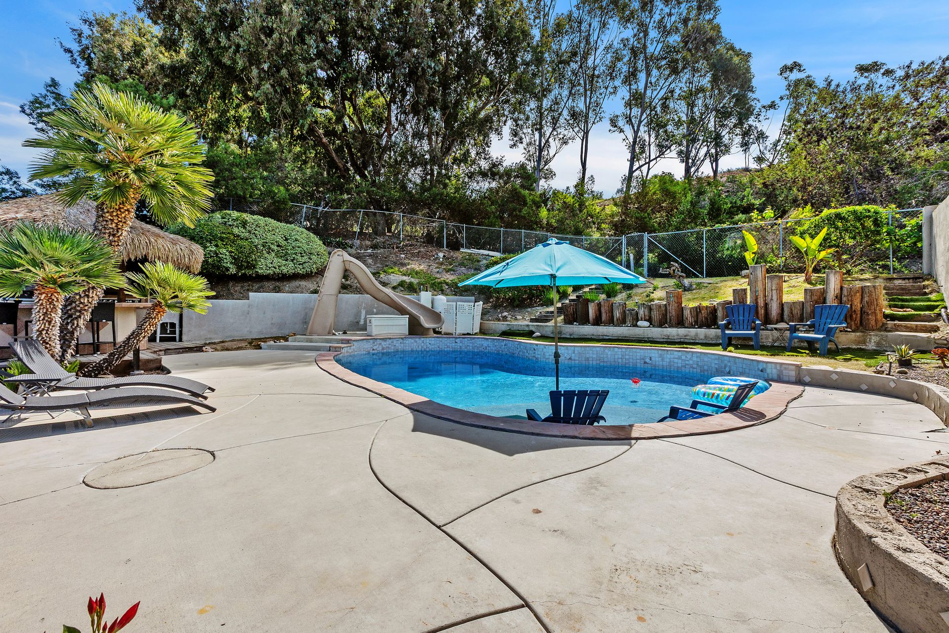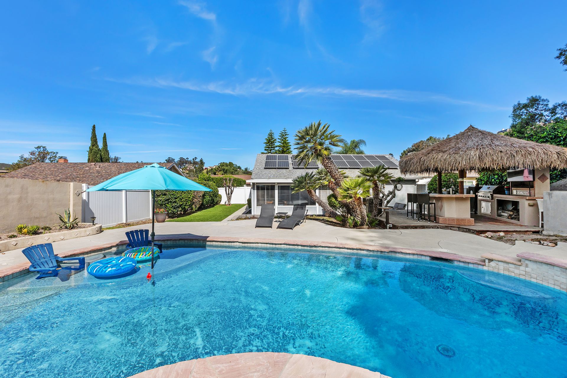 The backyard is a true entertainer’s dream, meticulously designed to be the standout feature of the home. You will find a beautifully constructed 15-foot palapa shading a custom outdoor kitchen with a bar and grill, alongside a refreshing salt water pool featuring a "Shamu" Baja shelf, umbrella holder, and a massive slide for endless summer fun. Relax in the above-ground spa or harvest fresh fruit from your own urban orchard of mature lemon, grapefruit, and fig trees. The property also includes a converted garage that provides flexible space for a guest suite or hobby room with a full bathroom nearby. Perfectly located within the boundaries of the award-winning Poway Unified School District, this one-of-a-kind retreat is just minutes from premier shopping, dining, and easy freeway access.