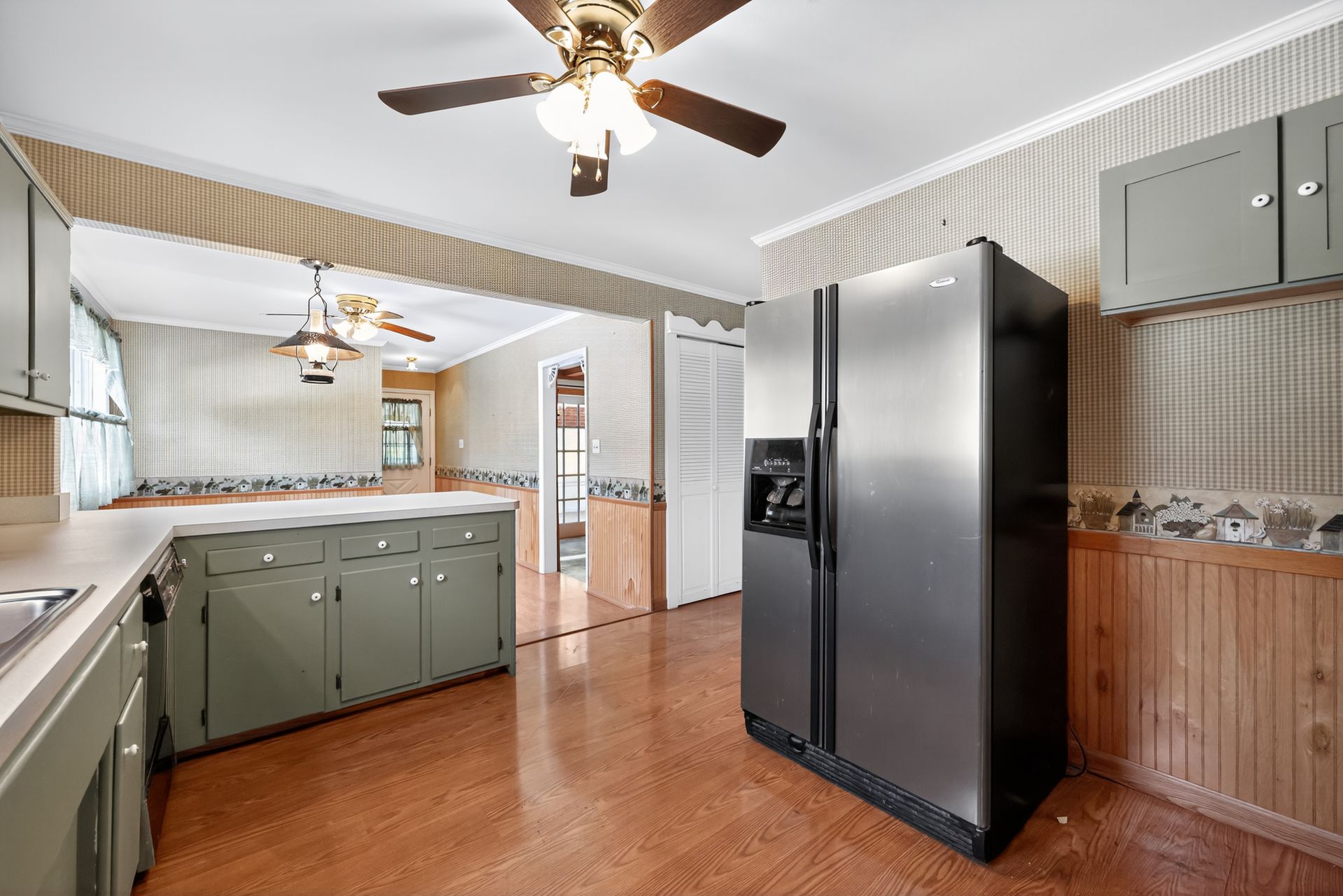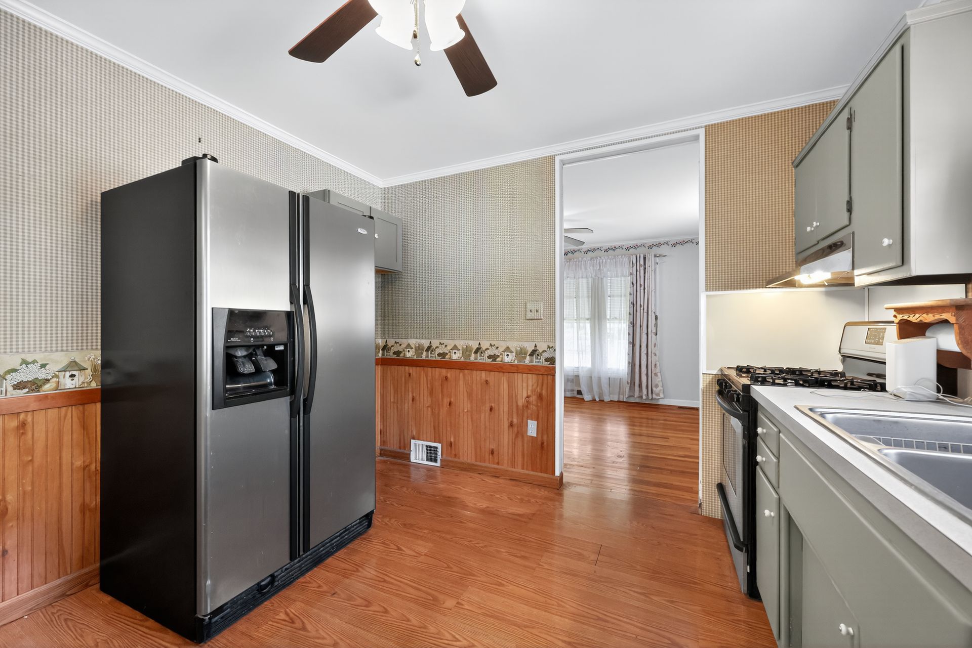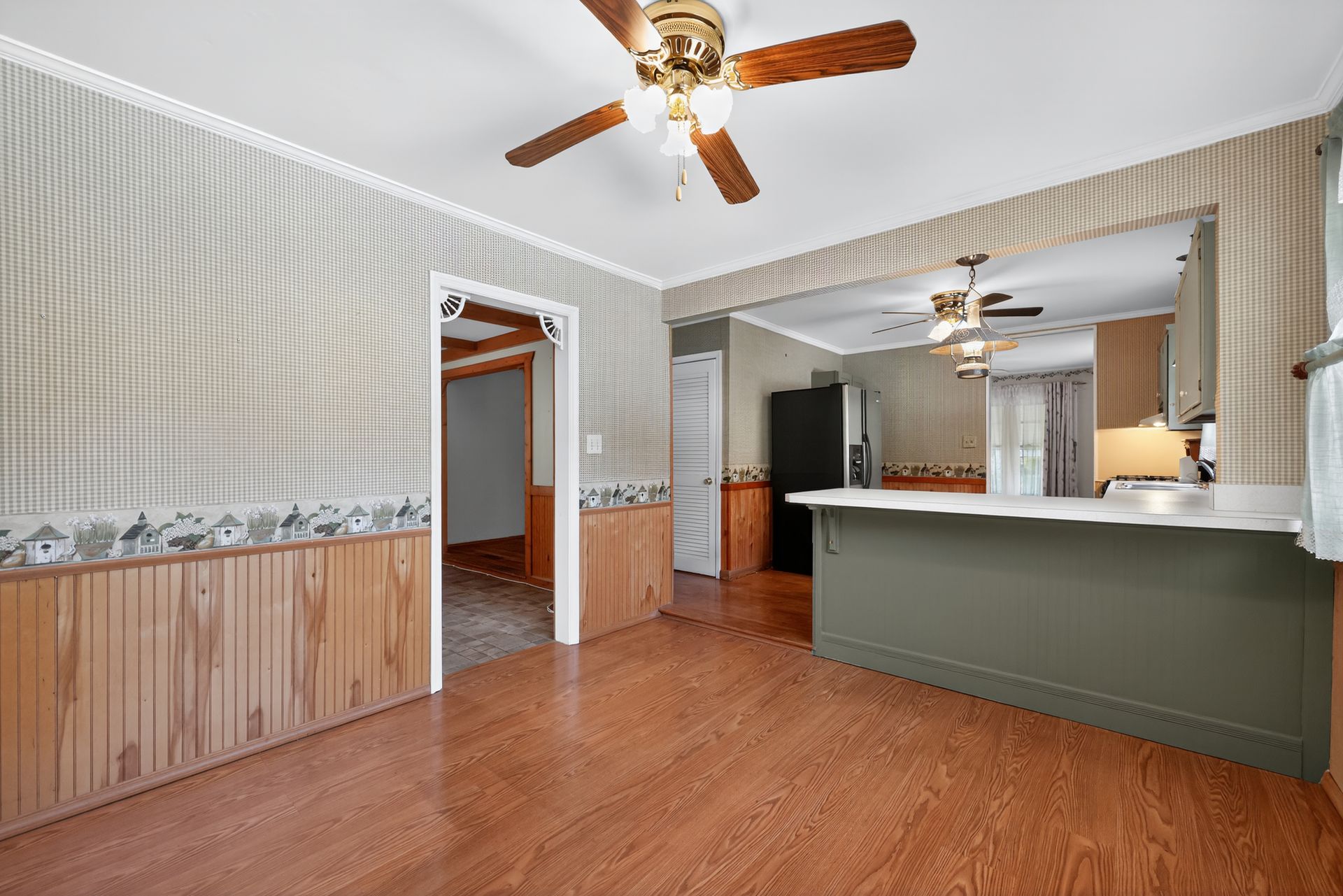 To the left of the entry, the updated kitchen boasts stainless steel appliances, a breakfast bar, and easy flow into the formal dining room—ideal for hosting dinners or backyard BBQs with the nearby half bath for guests’ convenience. The main level also includes a washer and dryer for effortless laundry access.