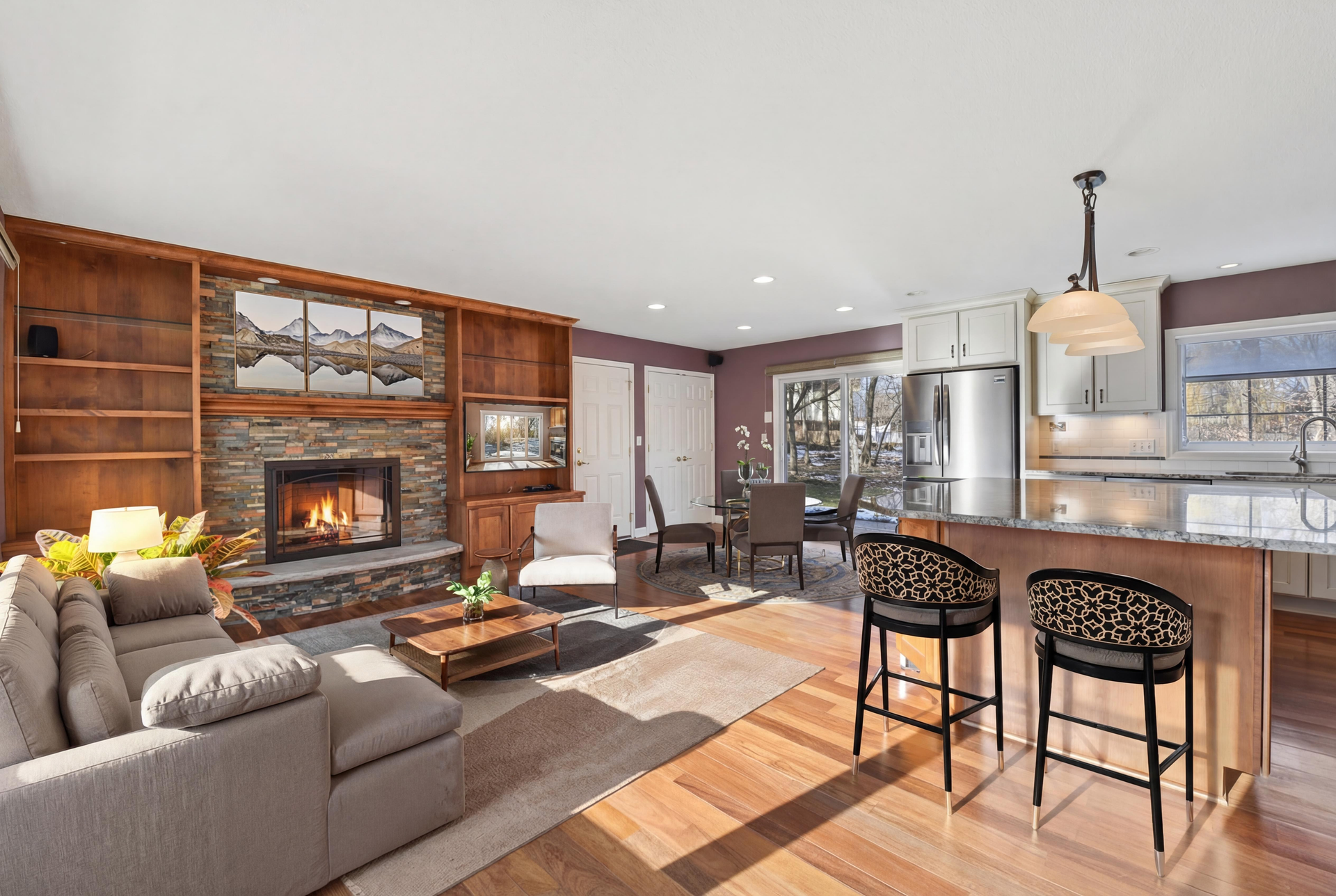As you enter the home on the main level the cheery kitchen and hearth room is breath-taking! Tastefully updated, these blended rooms boast a huge center island, stone surround gas fireplace with mantle and hearth, impressive granite tops and Brazilian teak hardwood floors. You will also notice a pantry closet, high-end built-in shelving, eat-in space and a garden window. Plus, you have access to an amazing paver patio and large flat yard.