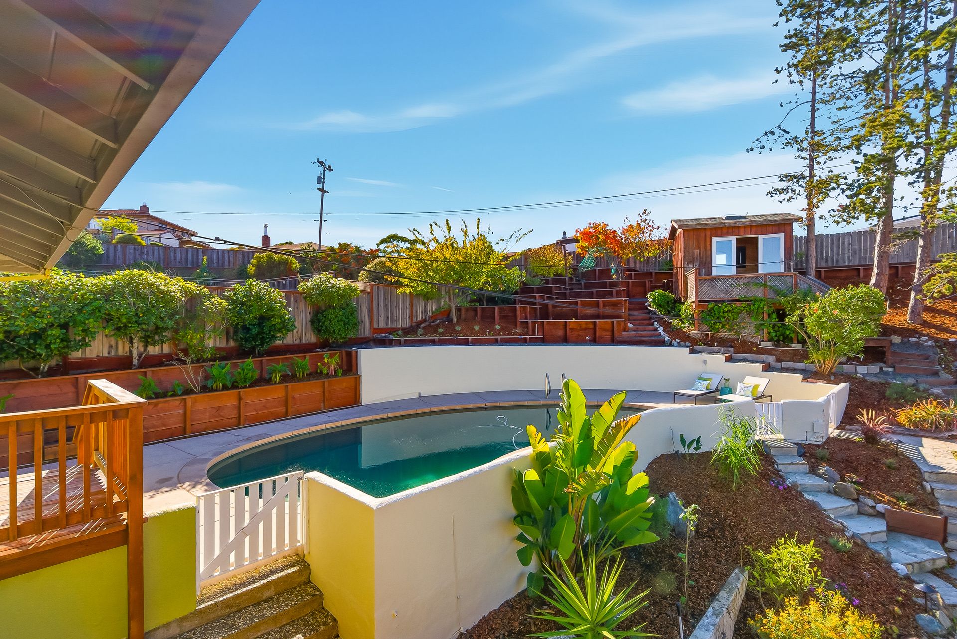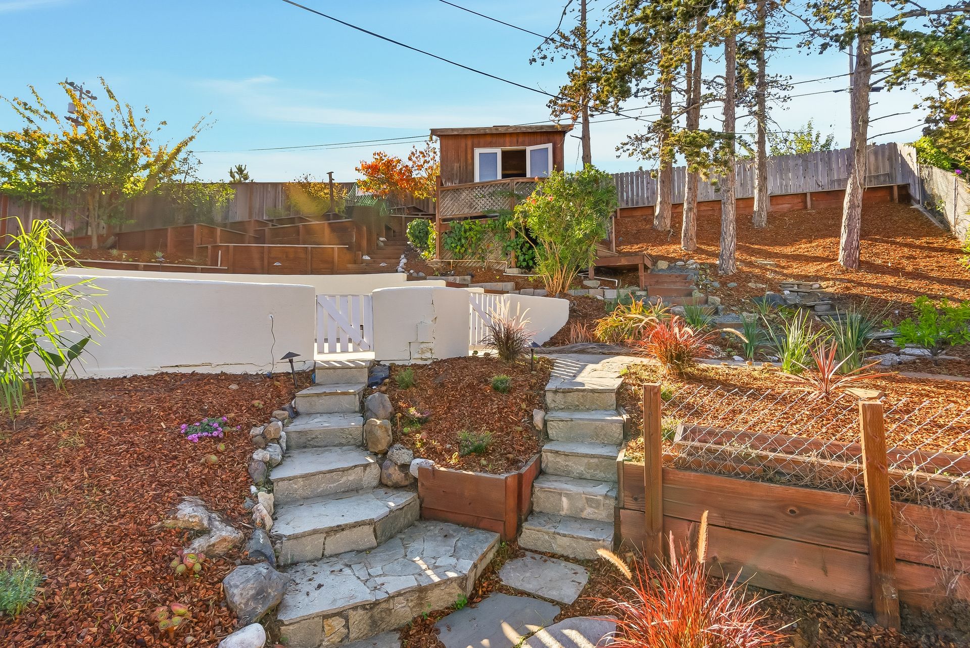 Additional bonus room for office or hobbies. The spacious, approximately 9,414 square foot lot includes private terraced gardens lined with a multitude of fruit trees, tranquil seating areas, a sparkling pool, and a charming cabana overlooking the Bay.
