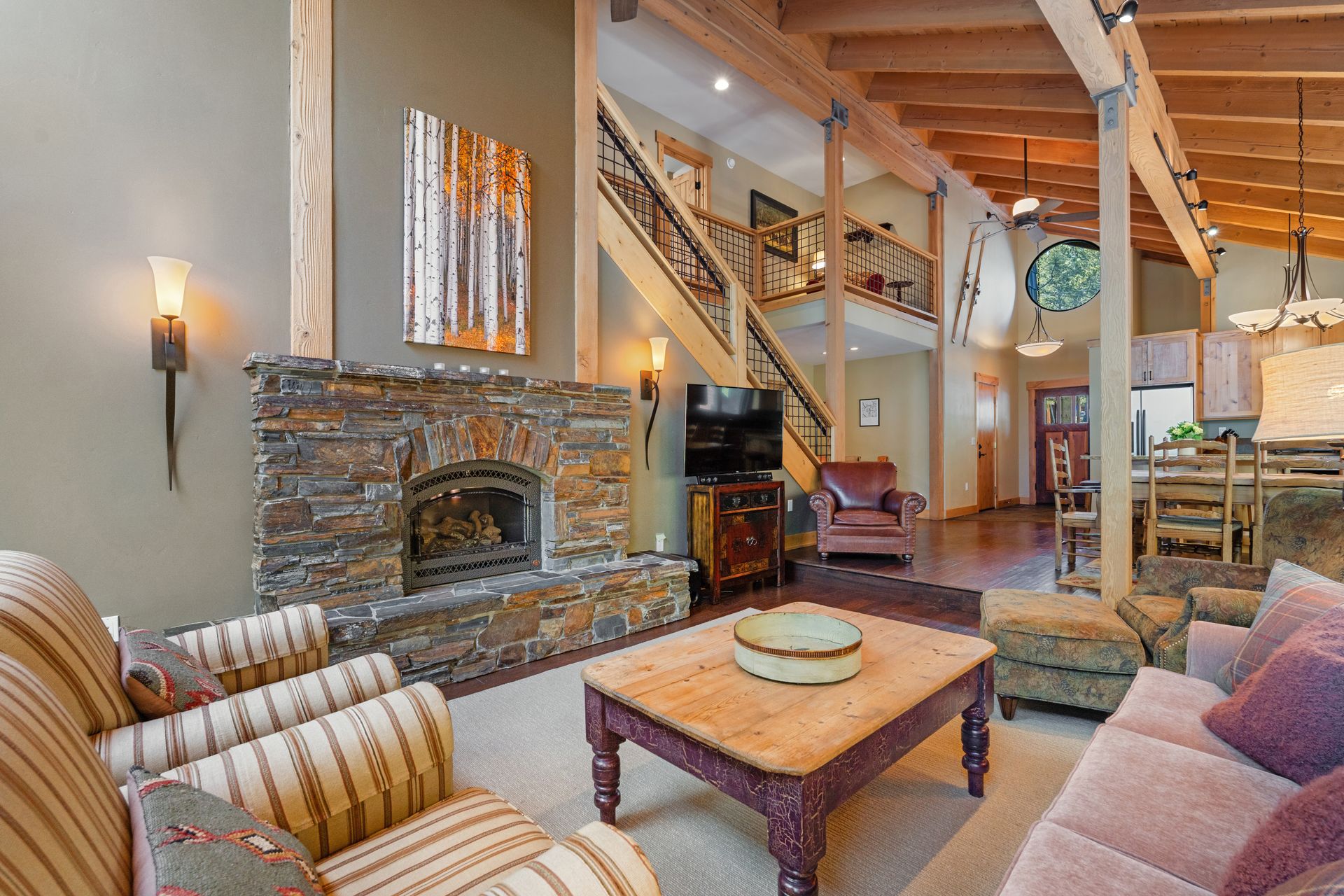 The vaulted ceilings and walls of south-facing windows flood the open-concept kitchen & living area with natural light. Top-tier appliances and large countertops in the kitchen are a dream for cooking and gracious entertaining, while the striking large stone fireplace creates a cozy gathering spot for all your loved ones.