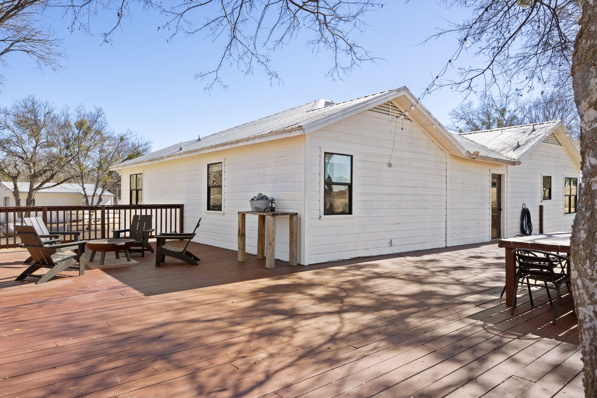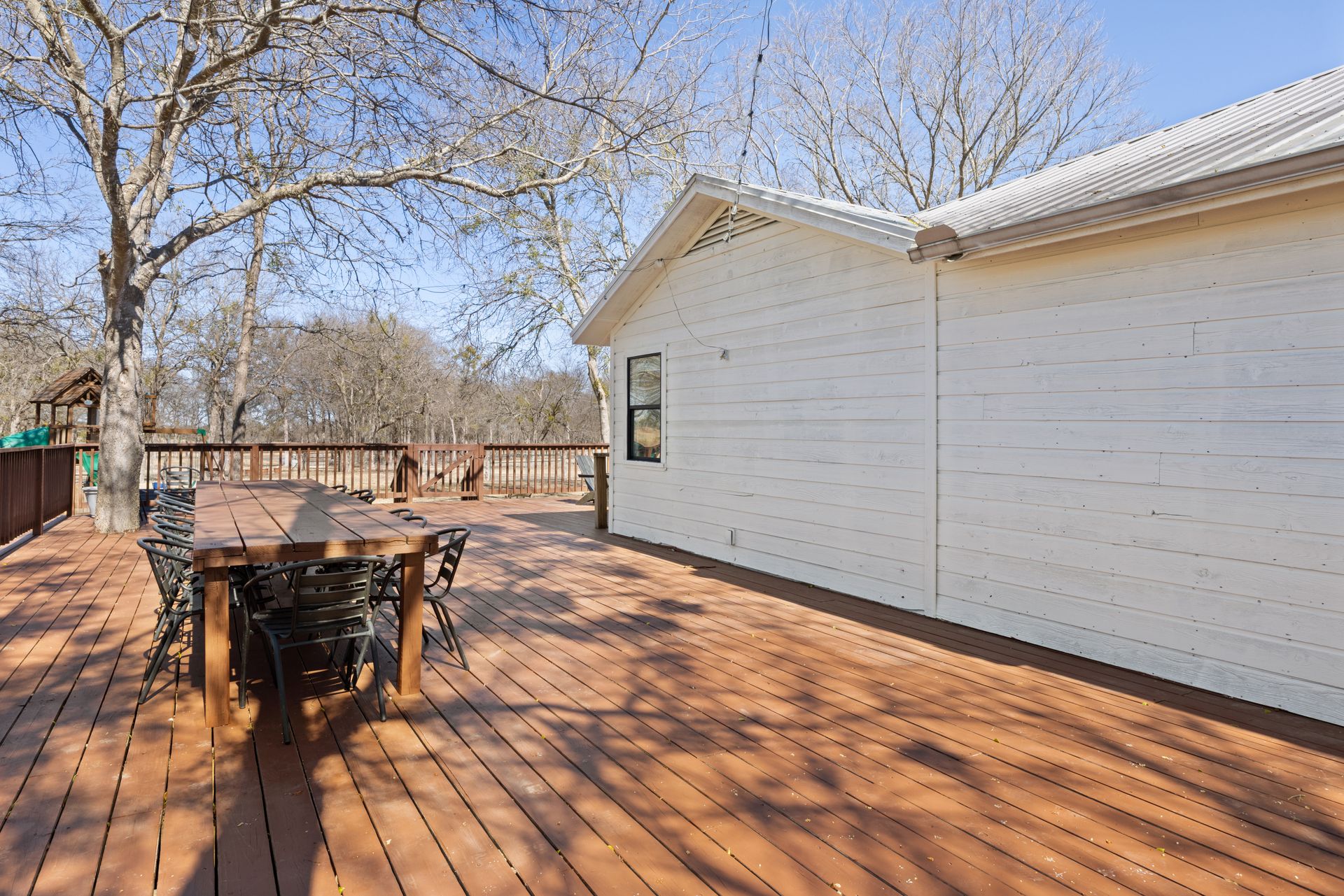 Single-story cedar farmhouse with a metal roof, large covered entry deck, and new colossal extended deck with seating area on the side, perfect for large gatherings and cookouts under the heritage trees!