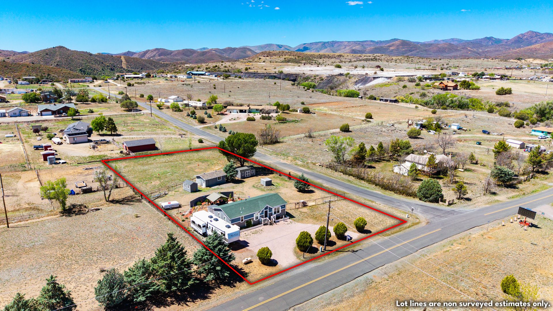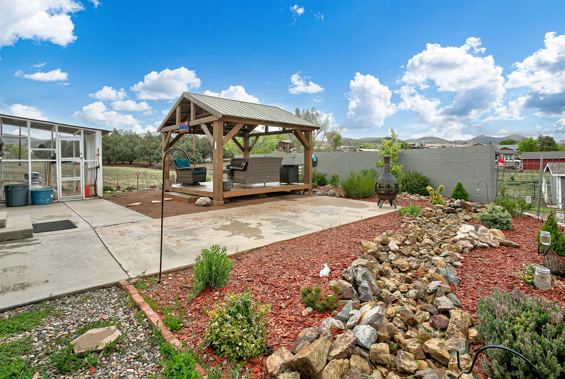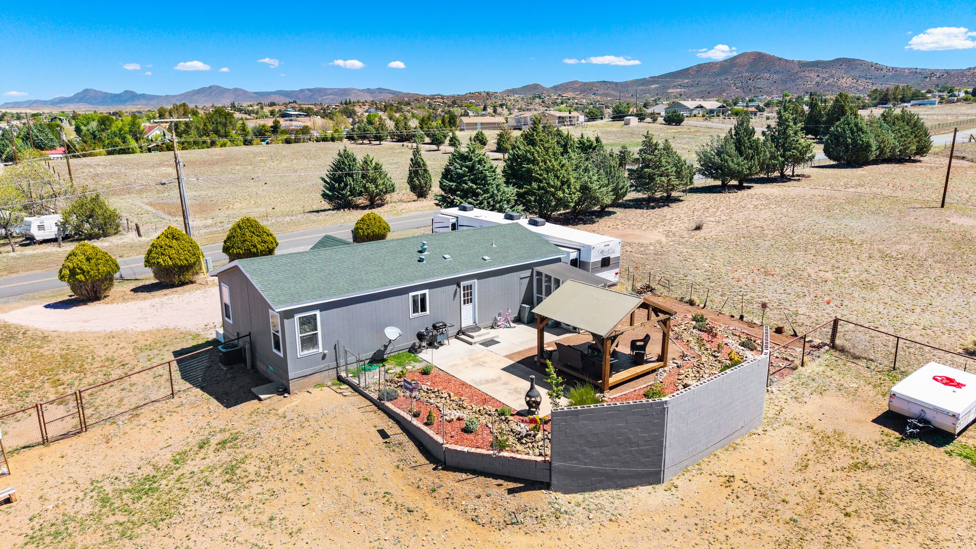 Beyond the interior, the property boasts a private gazebo covered patio. This 1.1-acre rural parcel has mountain views all around. The detached structures and RV parking add to the property's versatility and convenience. All have power to them and one could be a garage. There is secondary access off a side road.