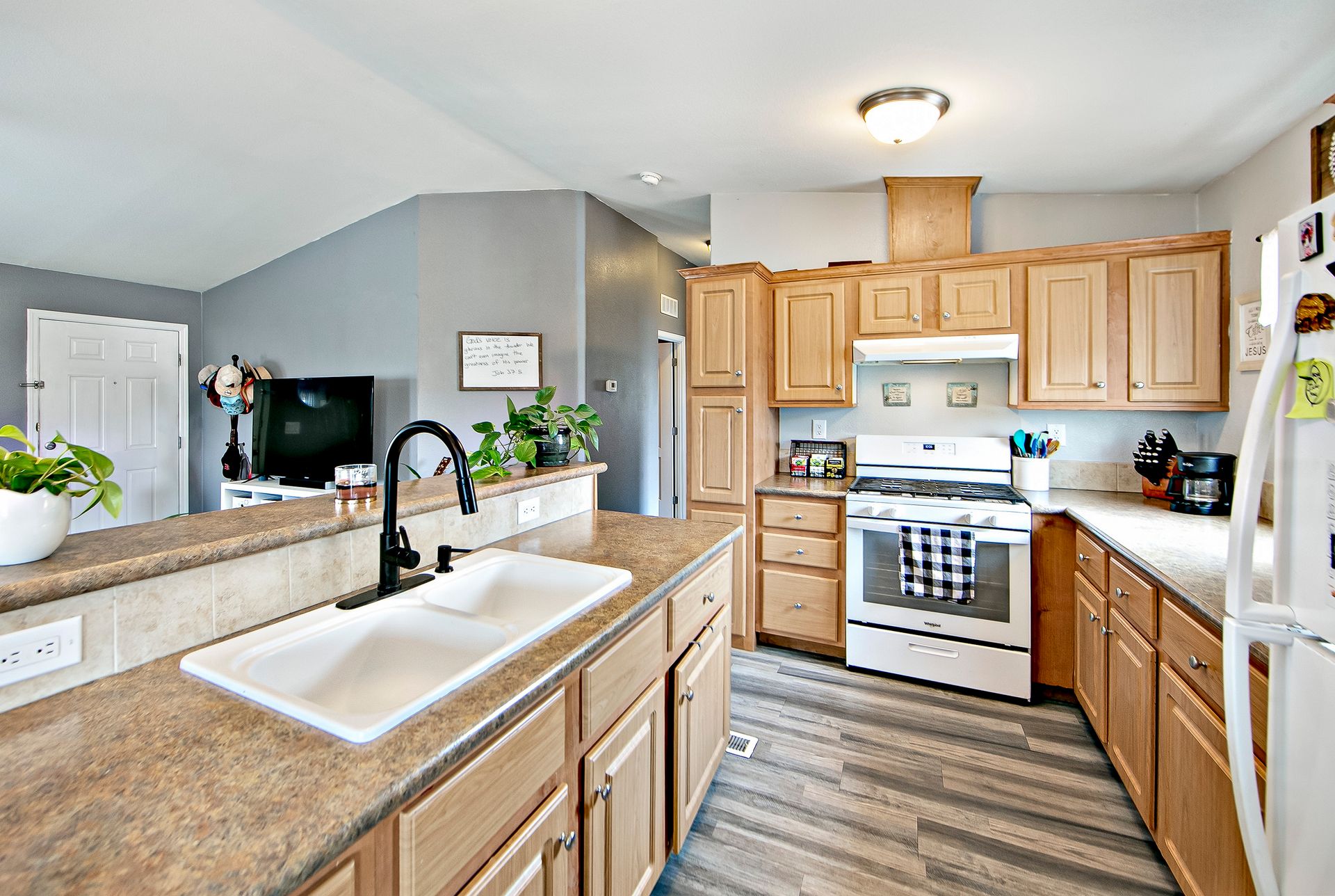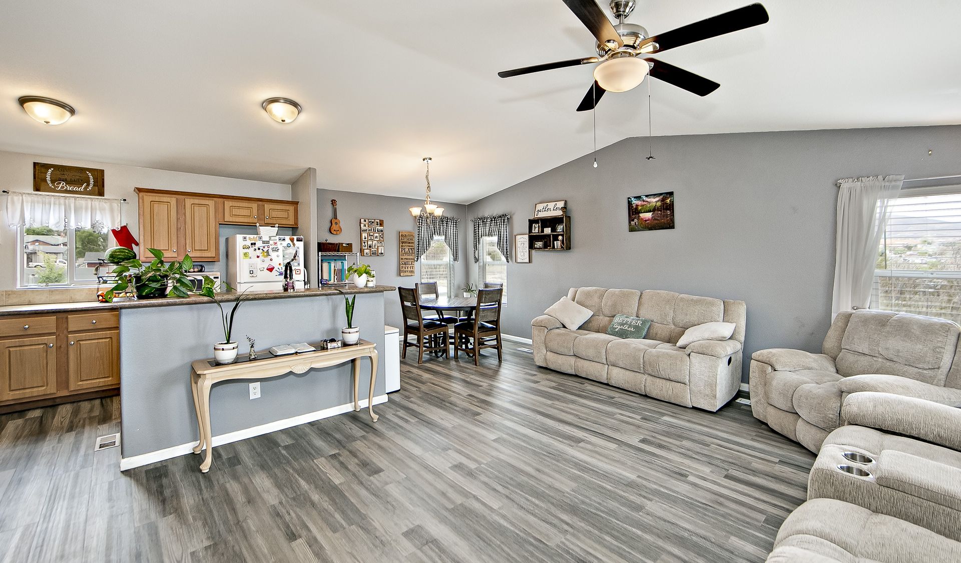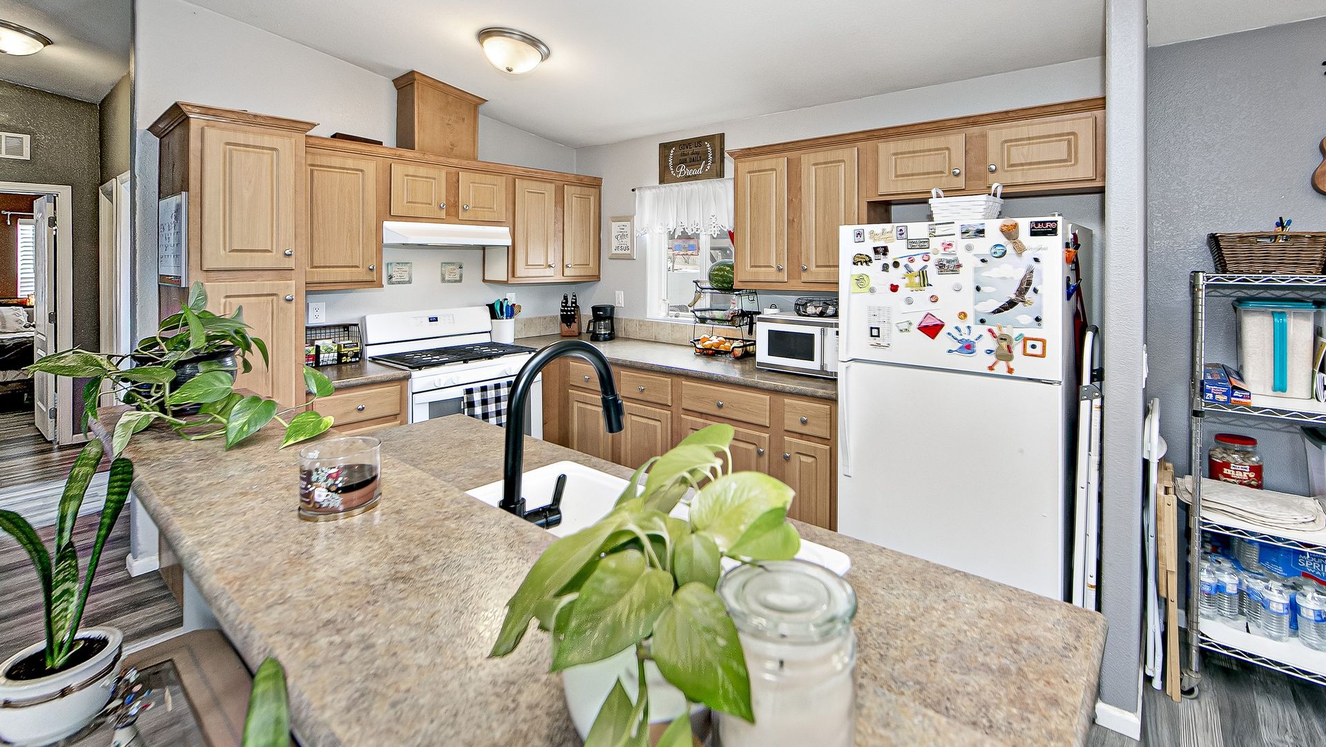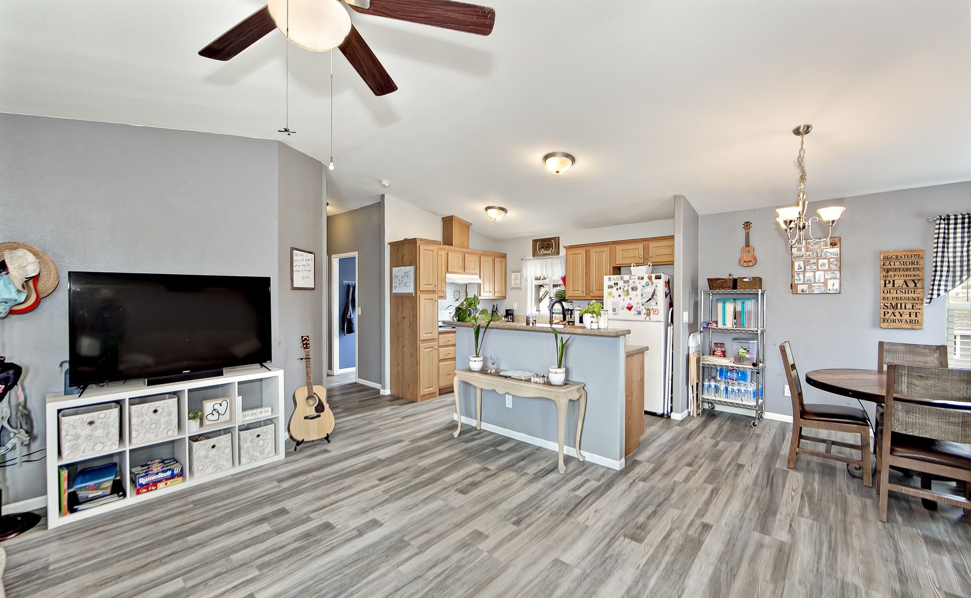 This charming house features a spacious layout with an abundance of natural light throughout the home. The home features a spacious kitchen with ample cabinetry and bright lighting, creating a warm and inviting atmosphere. The open floor plan seamlessly connects the kitchen to the living areas, allowing for easy flow and entertaining.