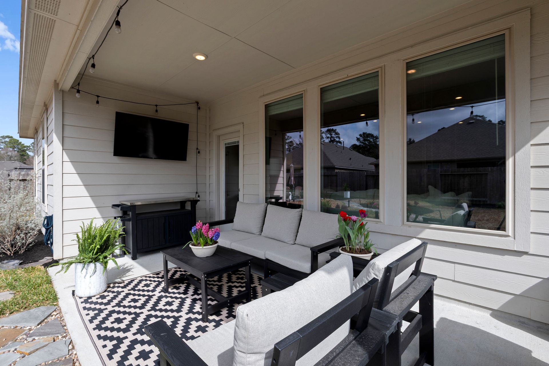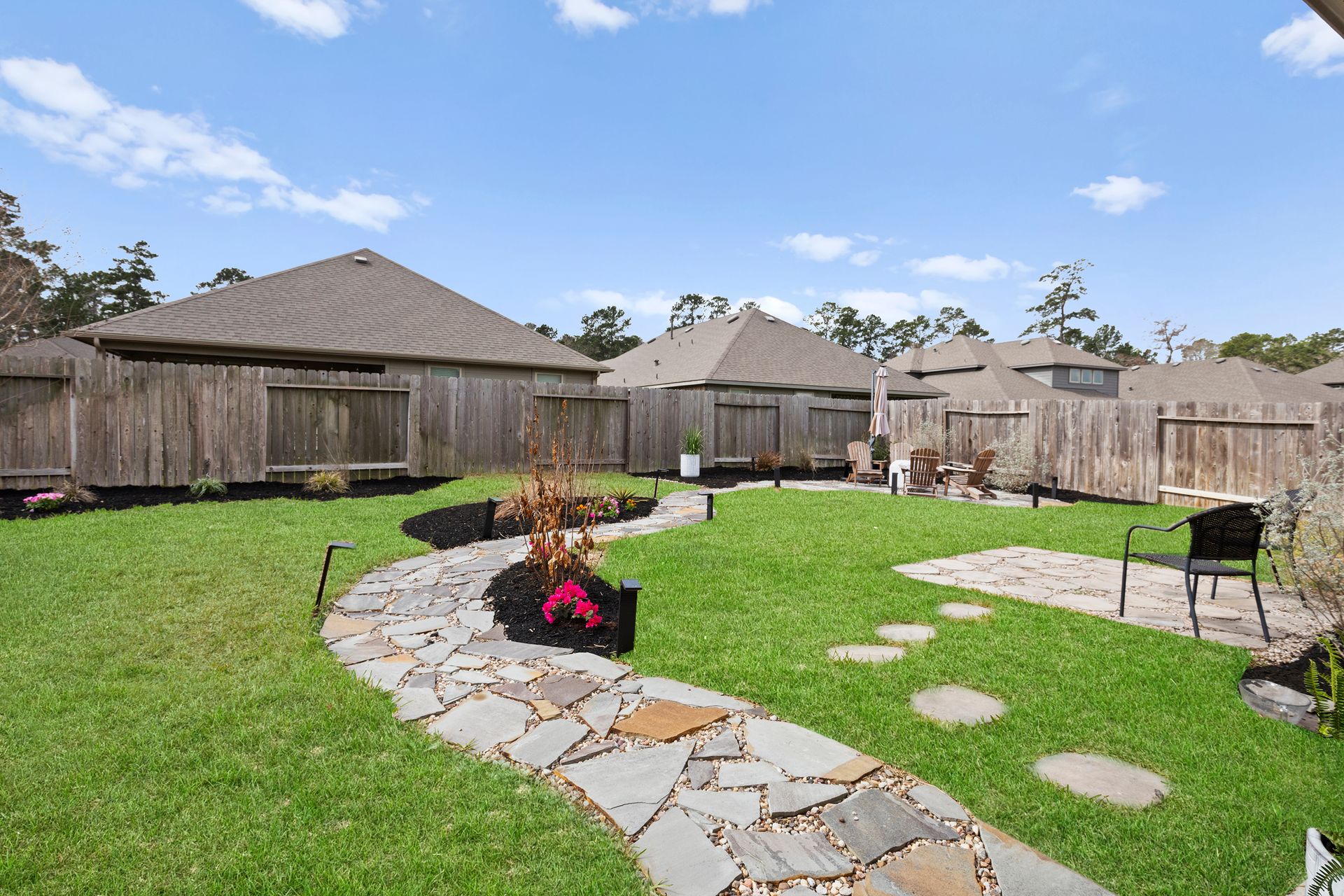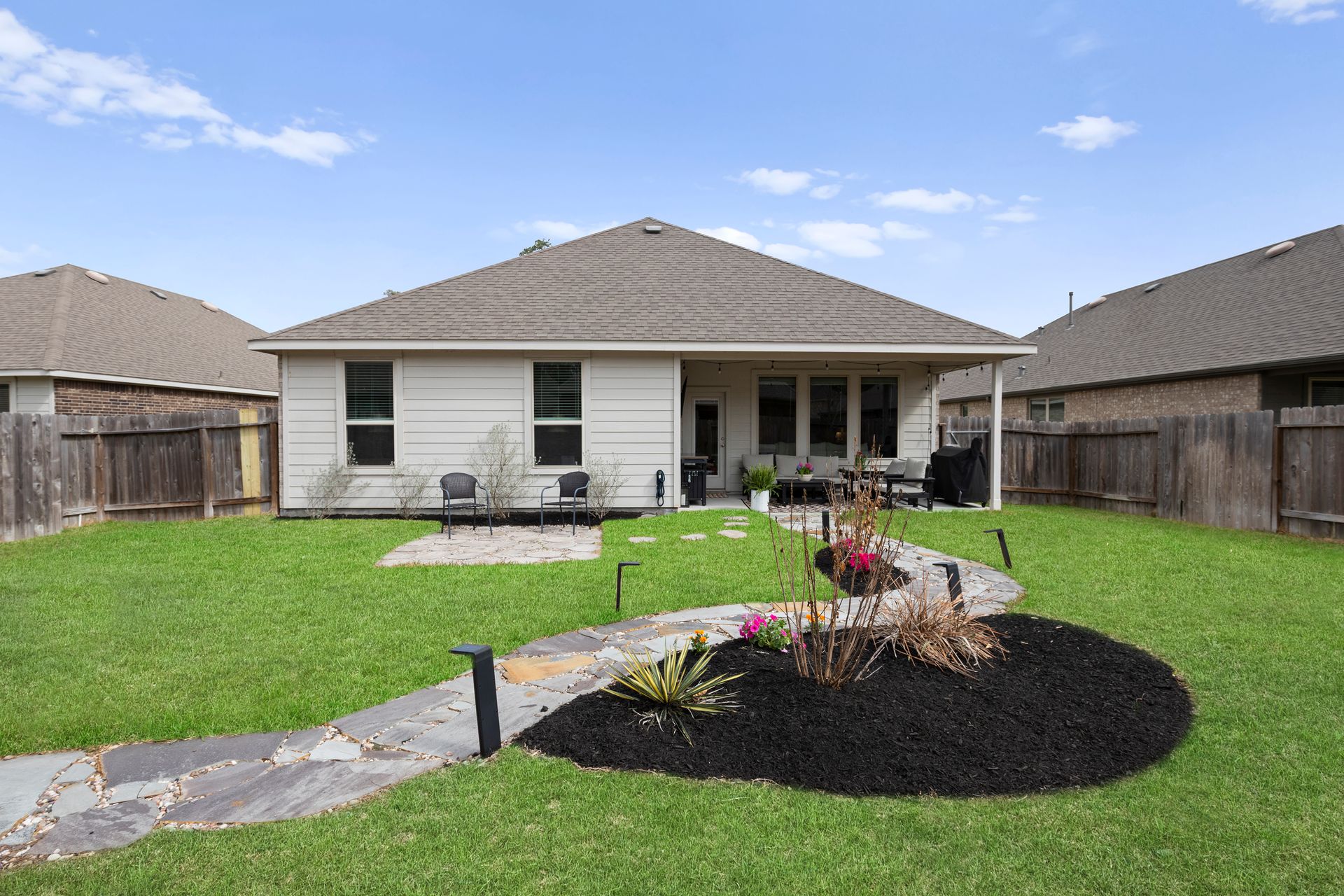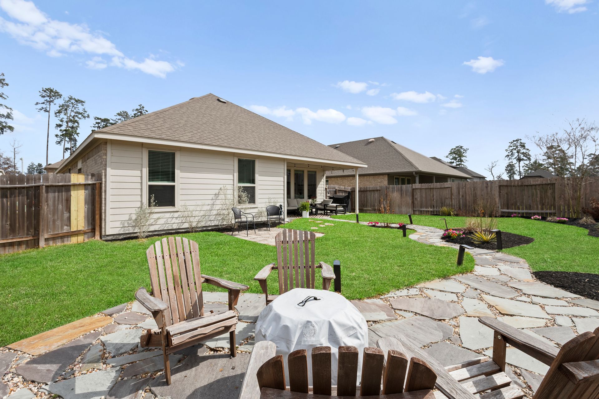 Sophisticated one-story living awaits in this flexible plan! You can entertain with ease in this open-concept layout where the kitchen and dining area f low perfectly into the family room which is filled with natural light. The kitchen shines with granite countertops, complementing soft gray subway tile, stainless steel appliances, a gas range, and 42-inch cabinetry. Vinyl plank flooring adds a modern, upscale look with everyday durability. Retreat to the expansive and private primary suite with vaulted ceilings and a spa-like bath featuring a double vanity, separate shower, large soaking tub and a walk-in closet. Two secondary bedrooms are located near a shared bath, while a third secondary bedroom sits in a separate hallway near a full bath that could also serve as the guest bath. Enjoy the covered patio and hardscape walkways to a firepit/sitting area. And don't forget to check out the garage - the sellers have created a gym area with super cool hexagon lighting. Other notable features include a Smart Home package, tankless water heater, sprinkler system, and it's EV-ready! Zoned to highly rated Woodlands schools
