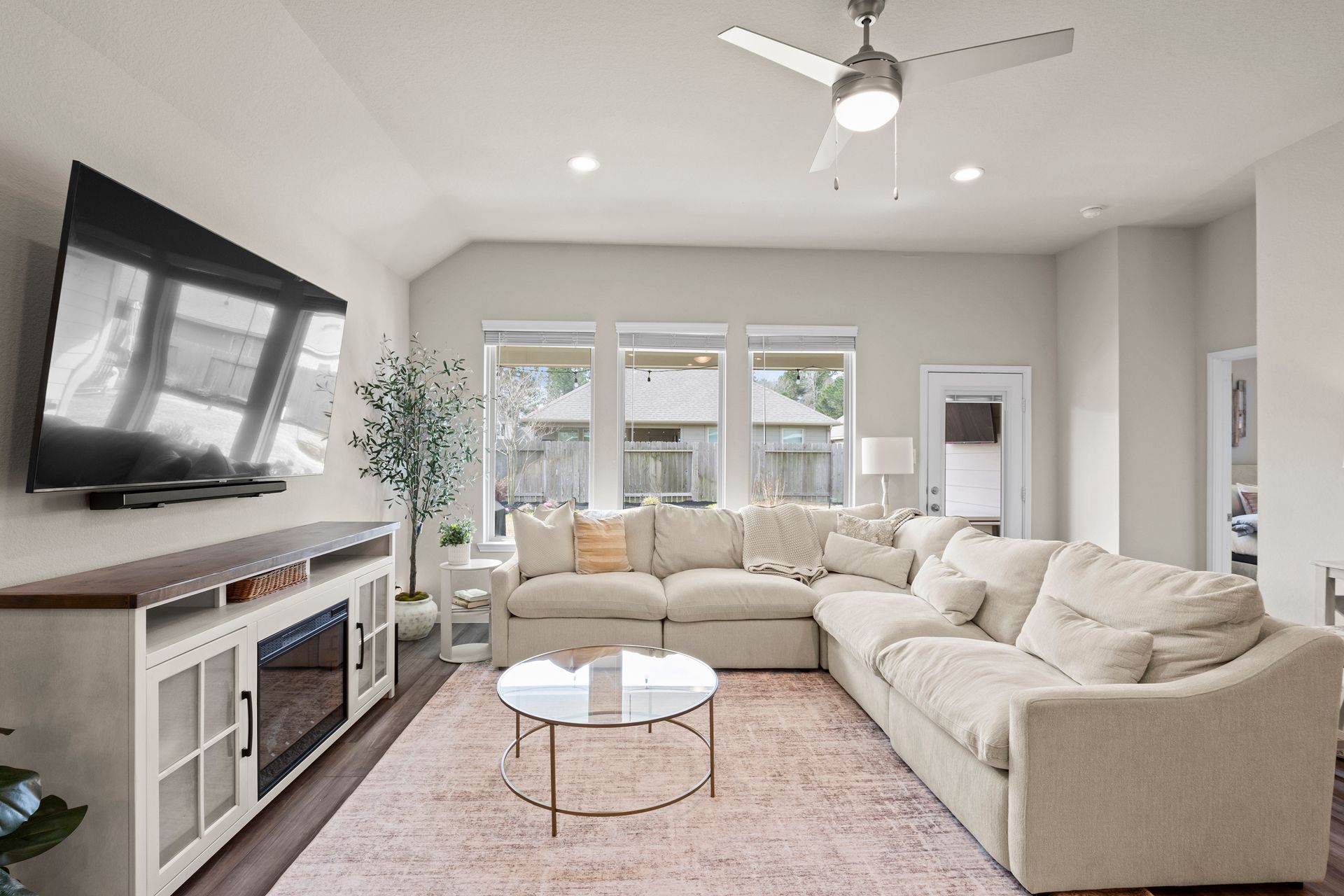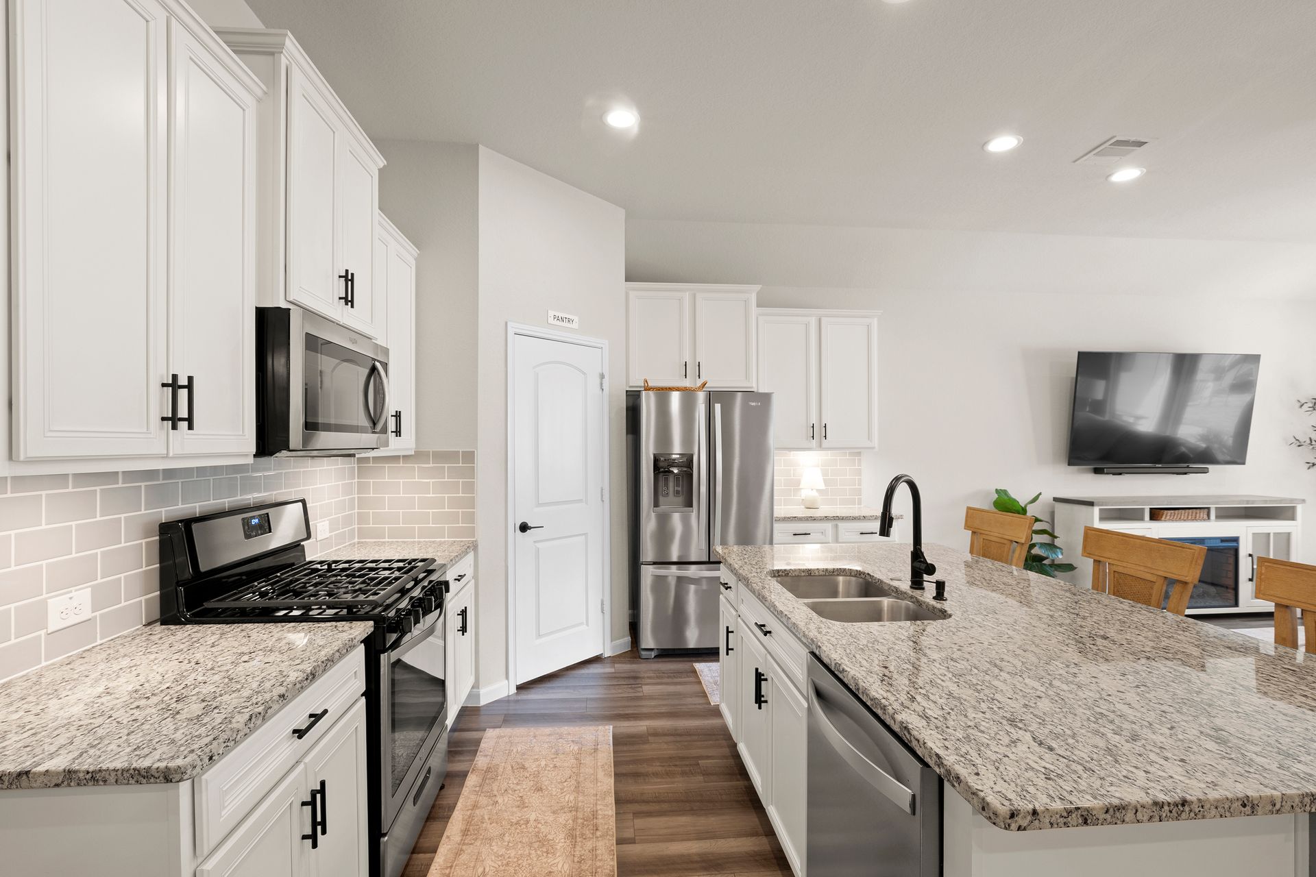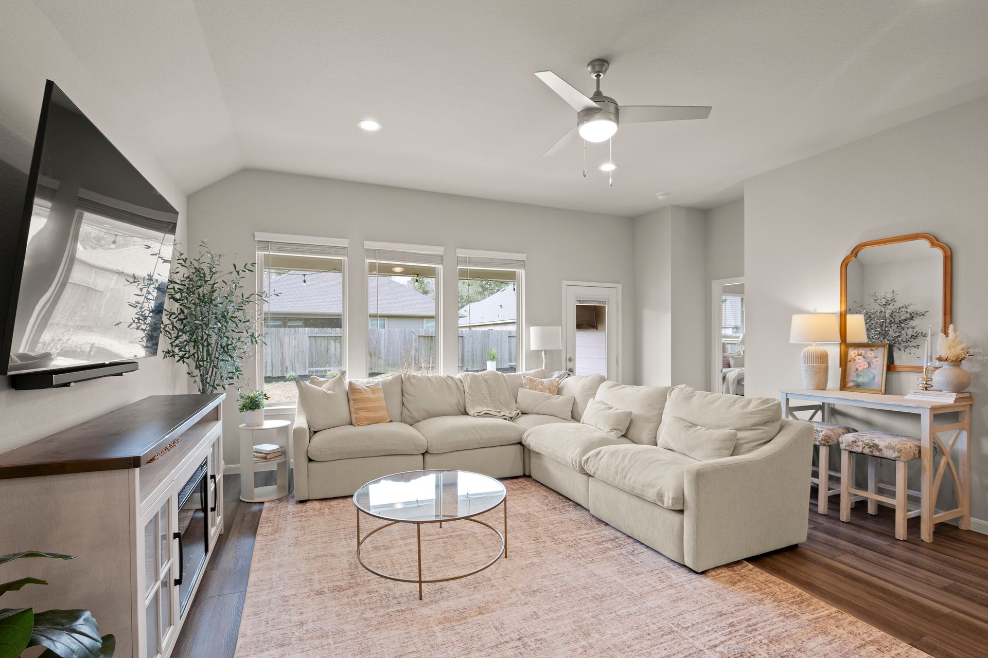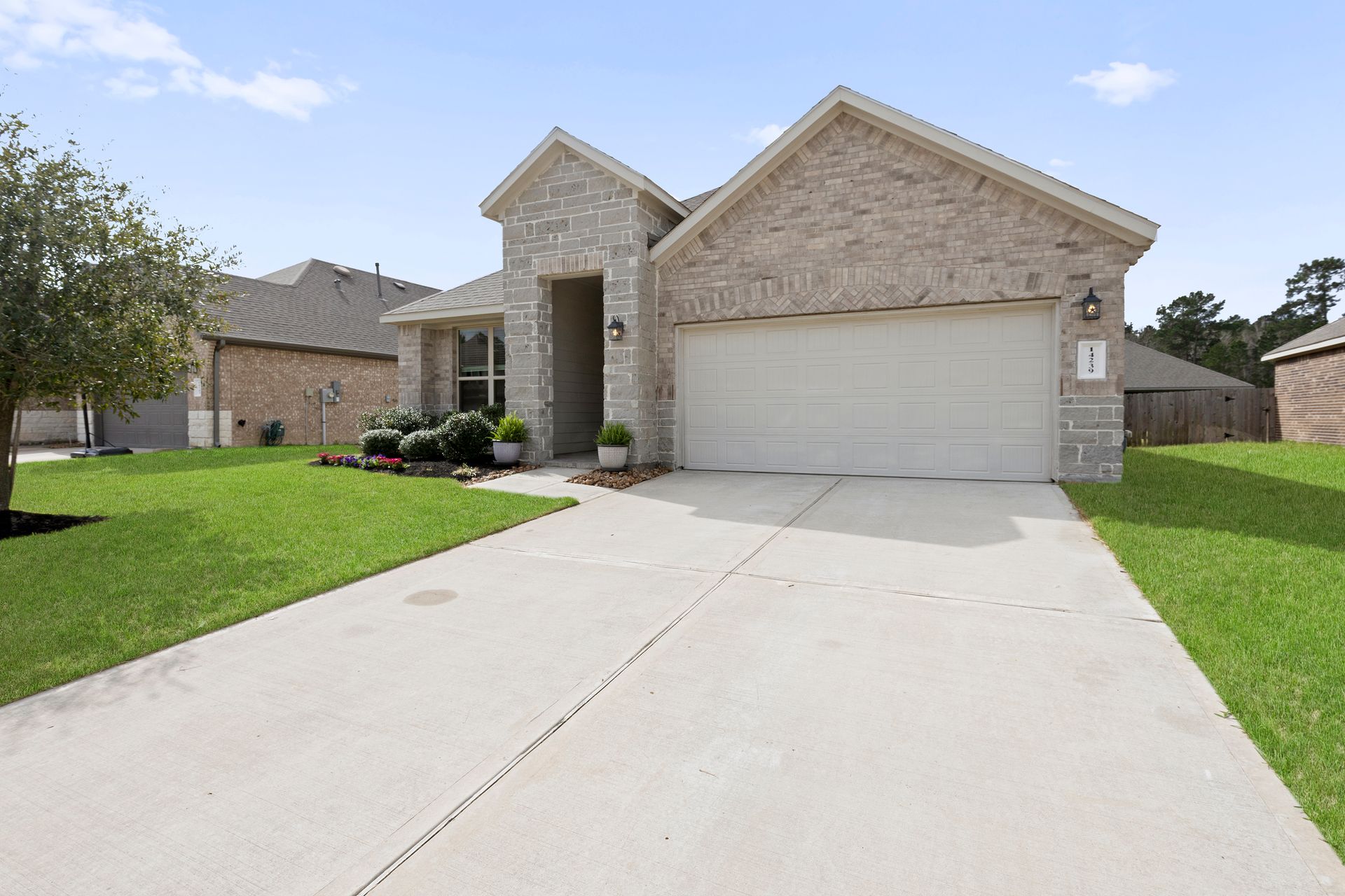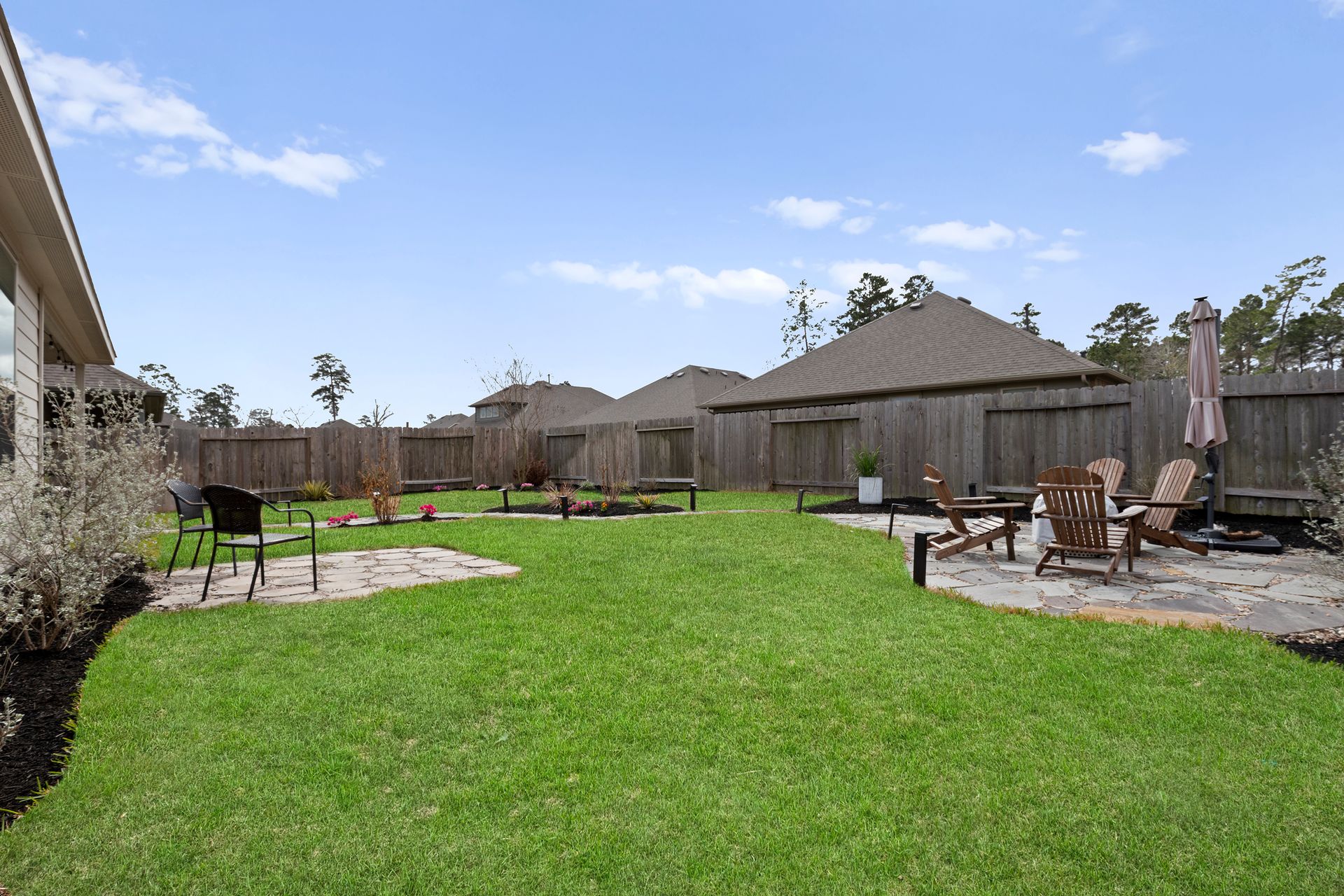 Sophisticated one-story living awaits in this flexible plan! You can entertain with ease in this open-concept layout where the kitchen and dining area f low perfectly into the family room which is filled with natural light. The kitchen shines with granite countertops, complementing soft gray subway tile, stainless steel appliances, a gas range, and 42-inch cabinetry. Vinyl plank flooring adds a modern, upscale look with everyday durability. Retreat to the expansive and private primary suite with vaulted ceilings and a spa-like bath featuring a double vanity, separate shower, large soaking tub and a walk-in closet. Two secondary bedrooms are located near a shared bath, while a third secondary bedroom sits in a separate hallway near a full bath that could also serve as the guest bath. Enjoy the covered patio and hardscape walkways to a firepit/sitting area. And don't forget to check out the garage - the sellers have created a gym area with super cool hexagon lighting. Other notable features include a Smart Home package, tankless water heater, sprinkler system, and it's EV-ready! Zoned to highly rated Woodlands schools