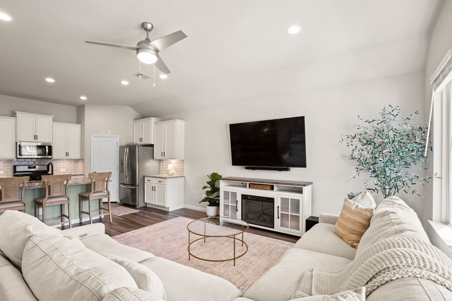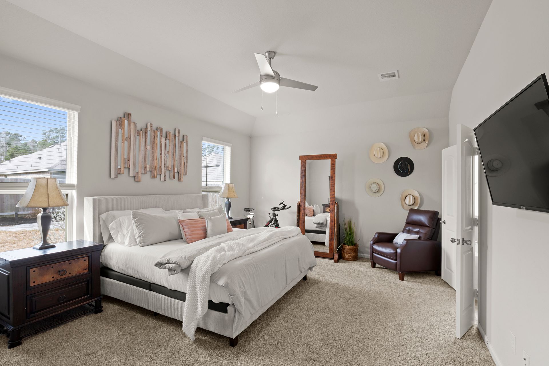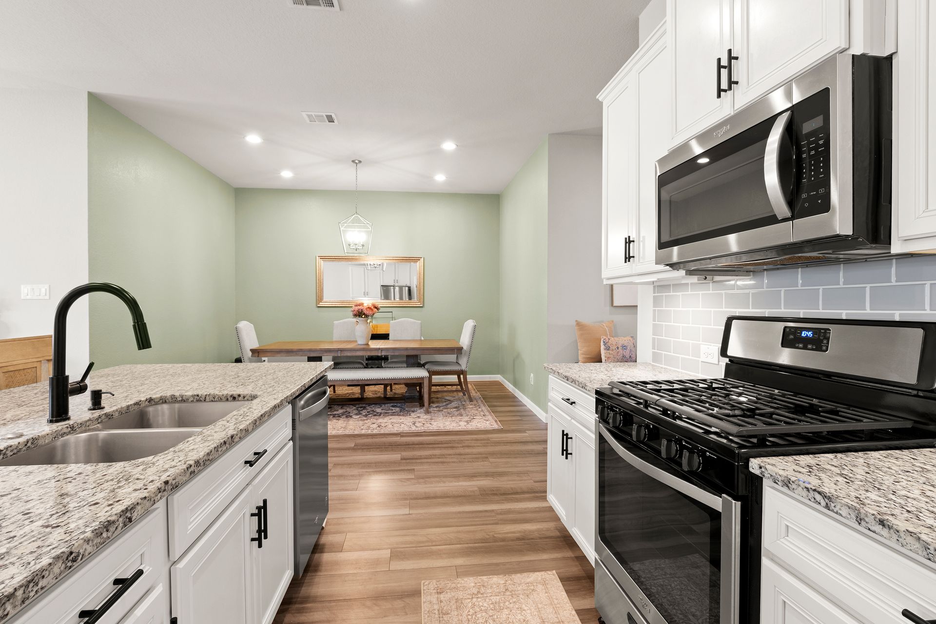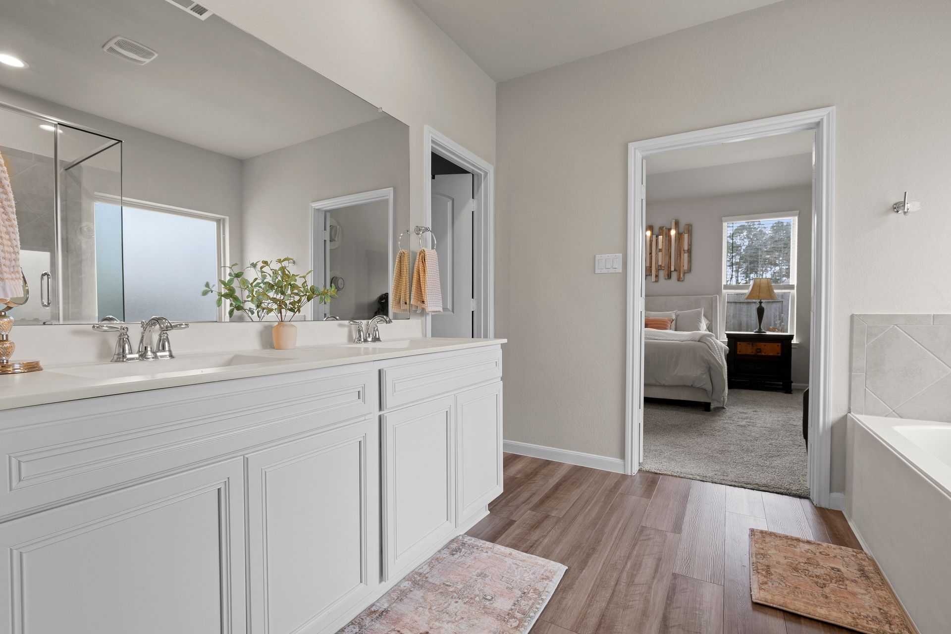 Sophisticated one-story living awaits in this flexible plan! You can entertain with ease in this open-concept layout where the kitchen and dining area f low perfectly into the family room which is filled with natural light. The kitchen shines with granite countertops, complementing soft gray subway tile, stainless steel appliances, a gas range, and 42-inch cabinetry. Vinyl plank flooring adds a modern, upscale look with everyday durability. Retreat to the expansive and private primary suite with vaulted ceilings and a spa-like bath featuring a double vanity, separate shower, large soaking tub and a walk-in closet. Two secondary bedrooms are located near a shared bath, while a third secondary bedroom sits in a separate hallway near a full bath that could also serve as the guest bath. Enjoy the covered patio and hardscape walkways to a firepit/sitting area. And don't forget to check out the garage - the sellers have created a gym area with super cool hexagon lighting. Other notable features include a Smart Home package, tankless water heater, sprinkler system, and it's EV-ready! Zoned to highly rated Woodlands schools