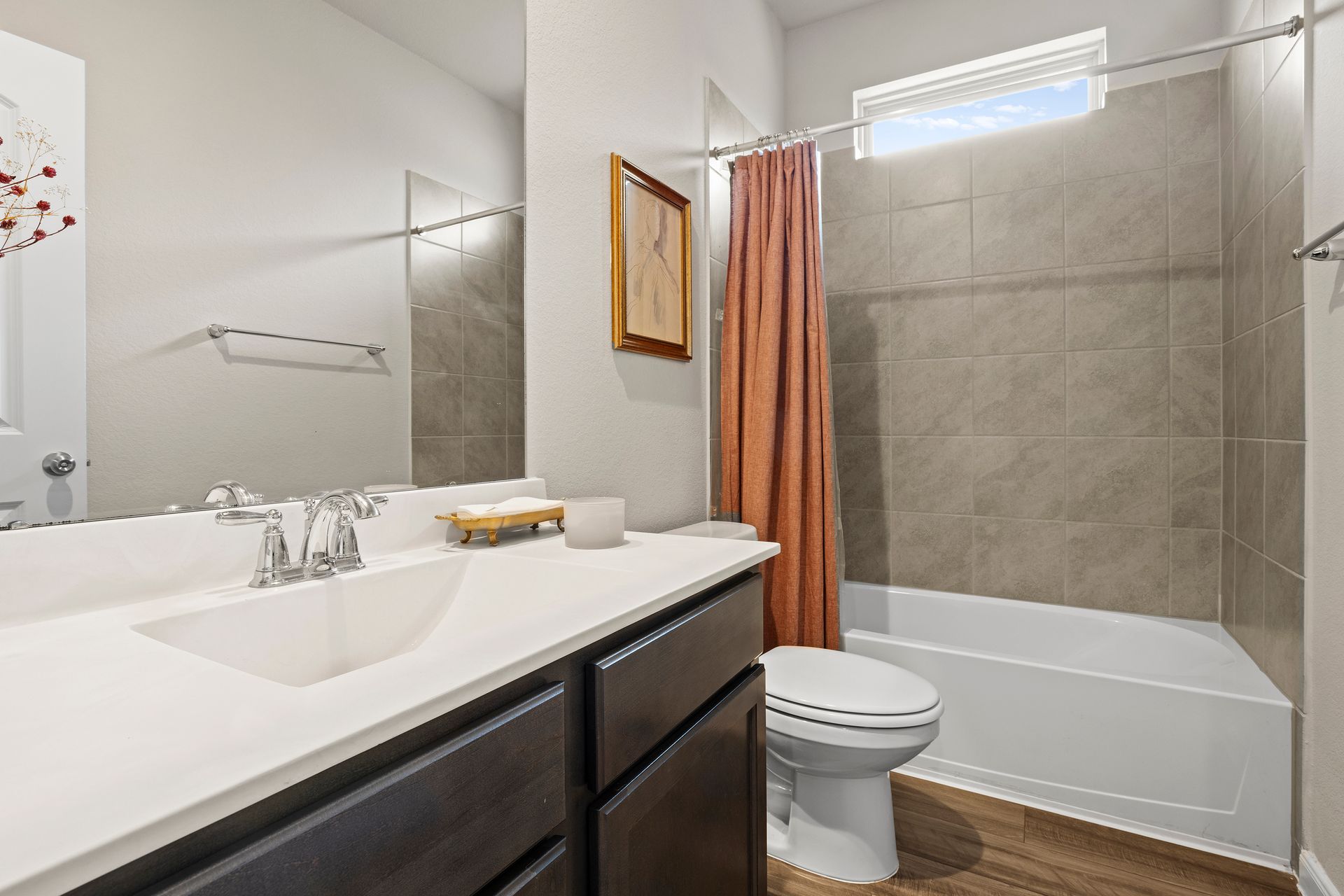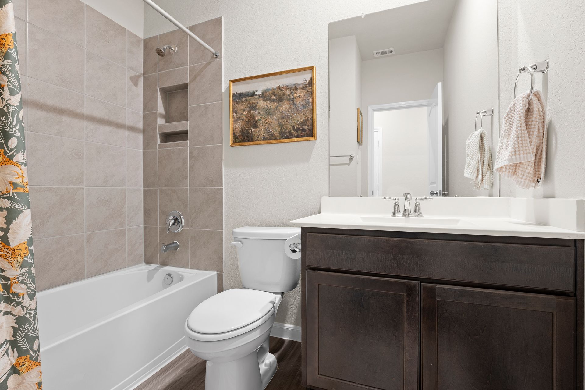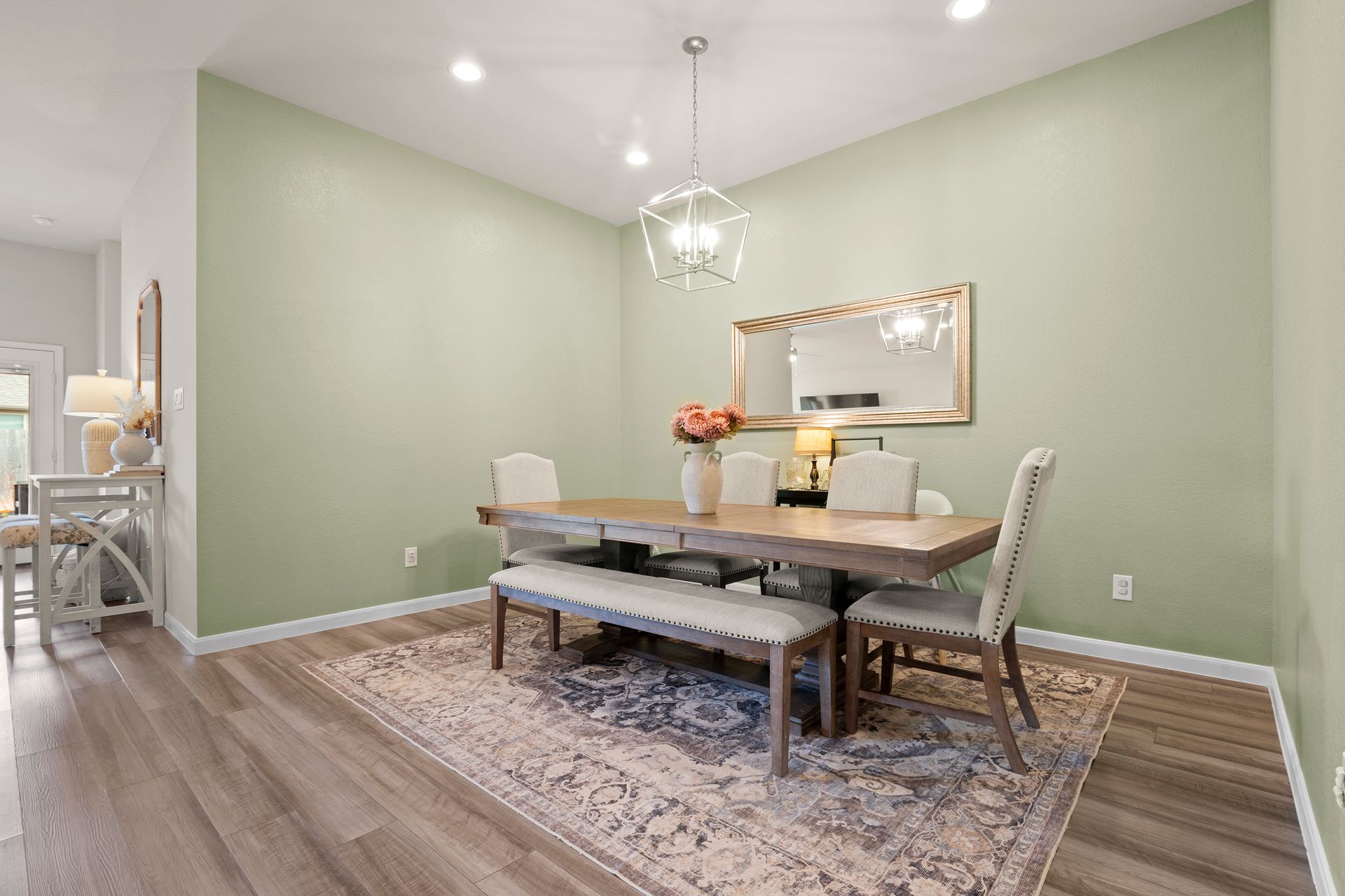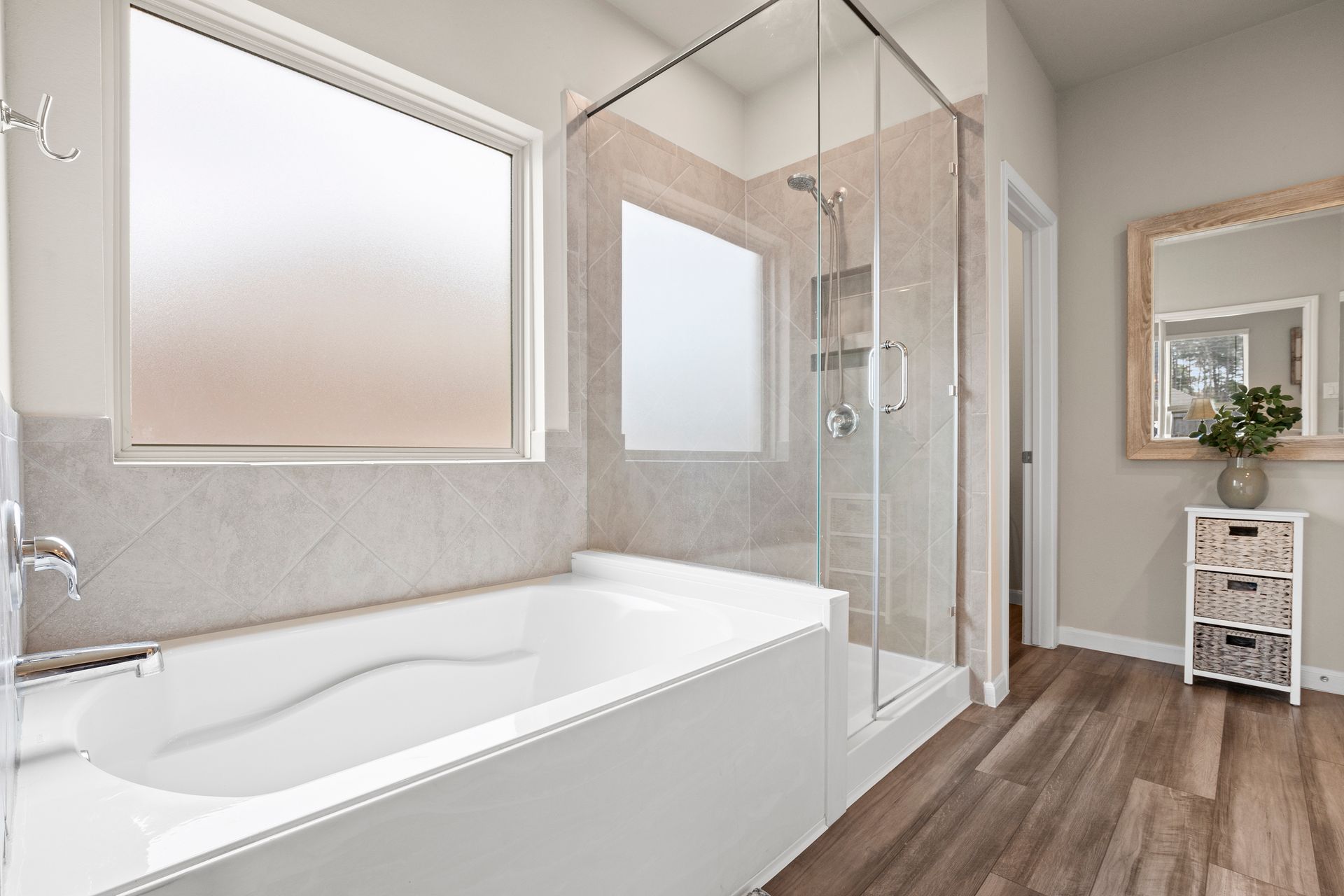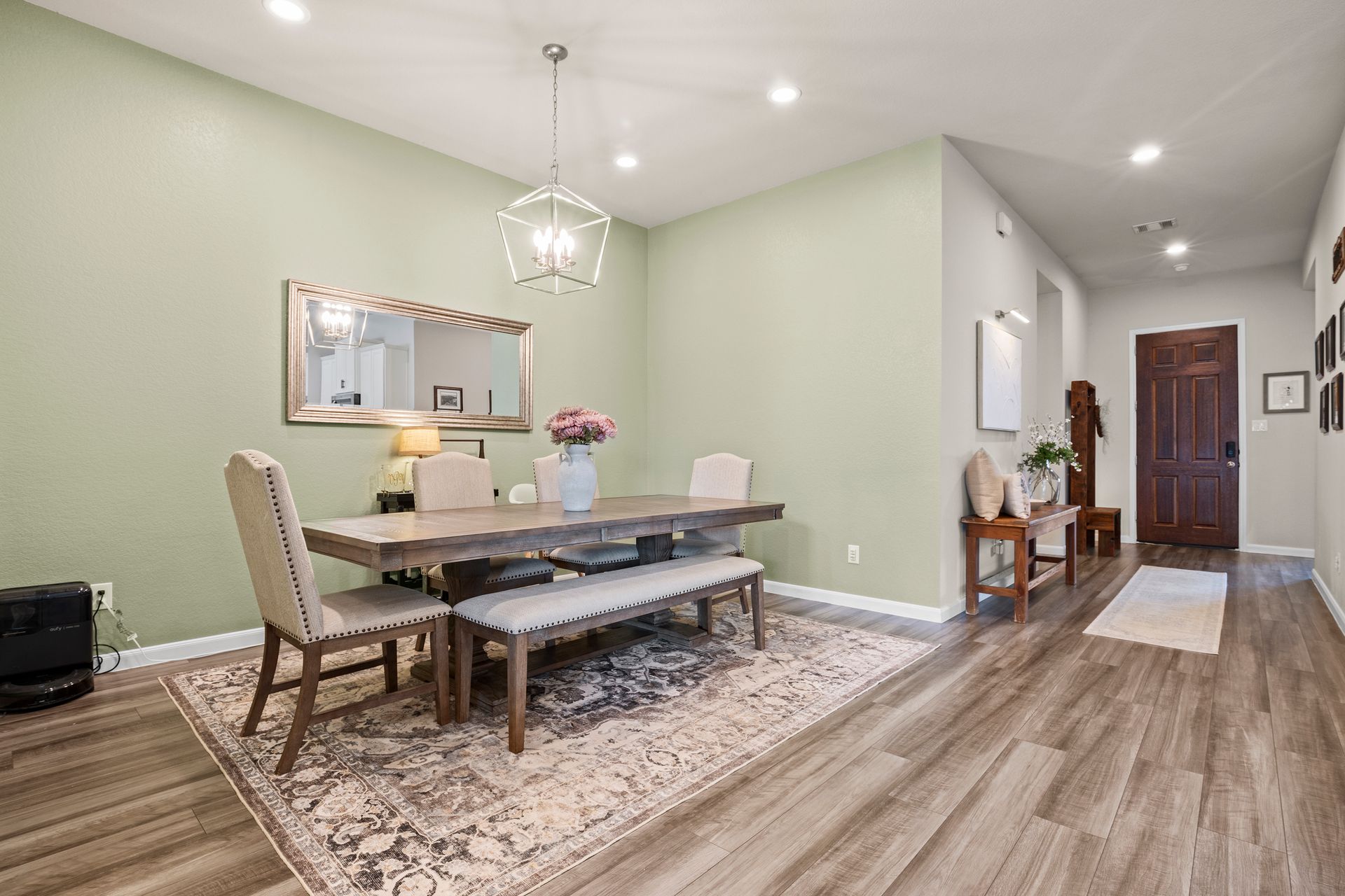 Sophisticated one-story living awaits in this flexible plan! You can entertain with ease in this open-concept layout where the kitchen and dining area f low perfectly into the family room which is filled with natural light. The kitchen shines with granite countertops, complementing soft gray subway tile, stainless steel appliances, a gas range, and 42-inch cabinetry. Vinyl plank flooring adds a modern, upscale look with everyday durability. Retreat to the expansive and private primary suite with vaulted ceilings and a spa-like bath featuring a double vanity, separate shower, large soaking tub and a walk-in closet. Two secondary bedrooms are located near a shared bath, while a third secondary bedroom sits in a separate hallway near a full bath that could also serve as the guest bath. Enjoy the covered patio and hardscape walkways to a firepit/sitting area. And don't forget to check out the garage - the sellers have created a gym area with super cool hexagon lighting. Other notable features include a Smart Home package, tankless water heater, sprinkler system, and it's EV-ready! Zoned to highly rated Woodlands schools