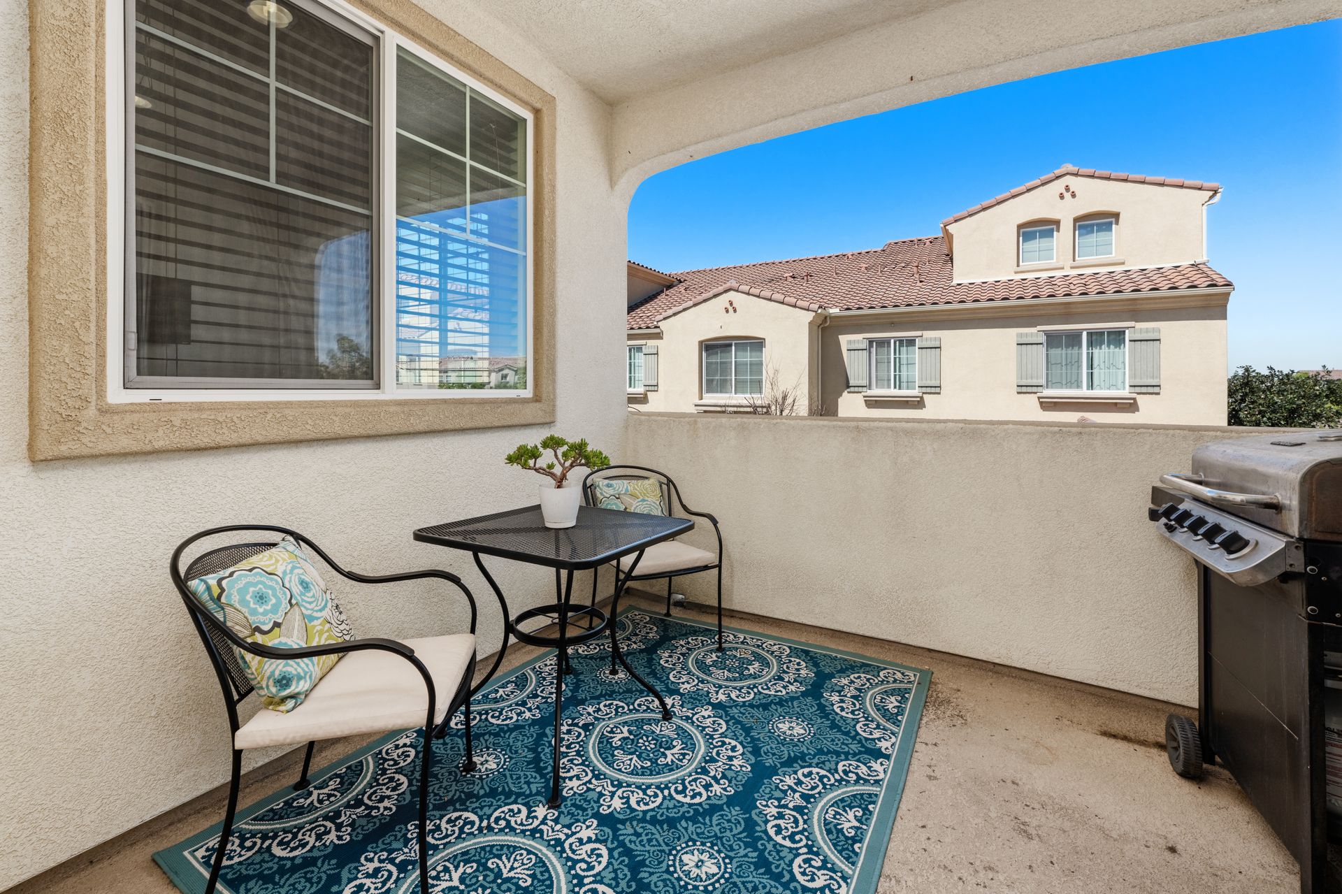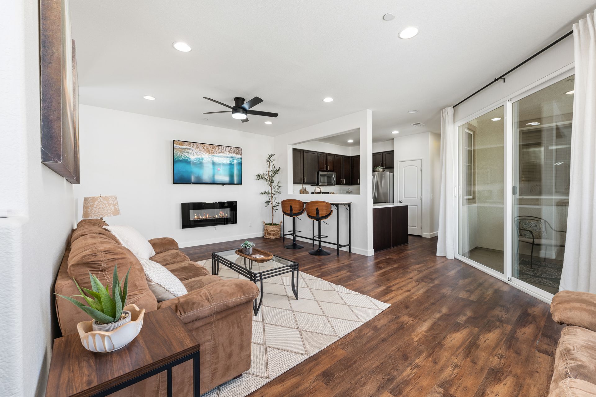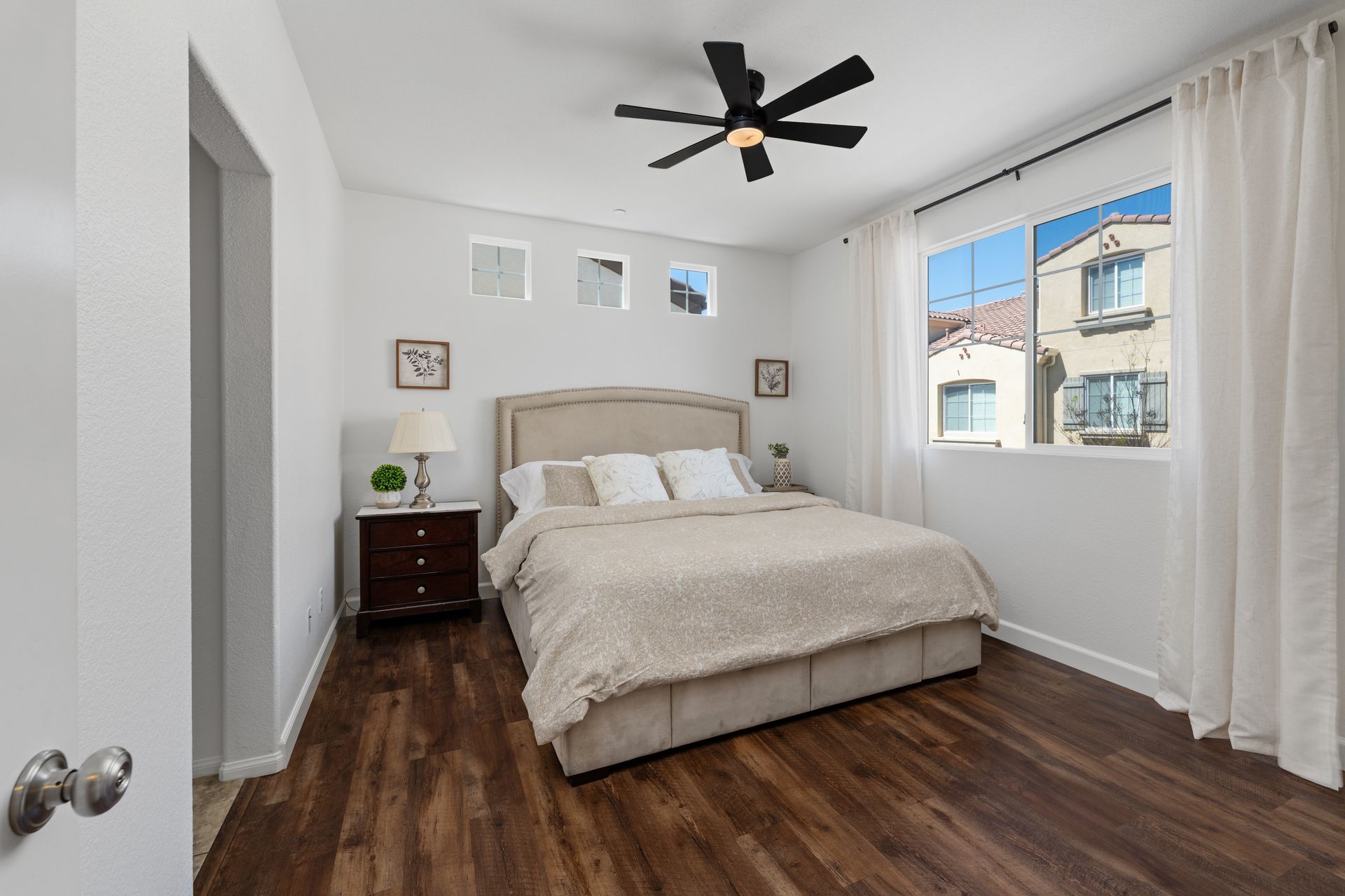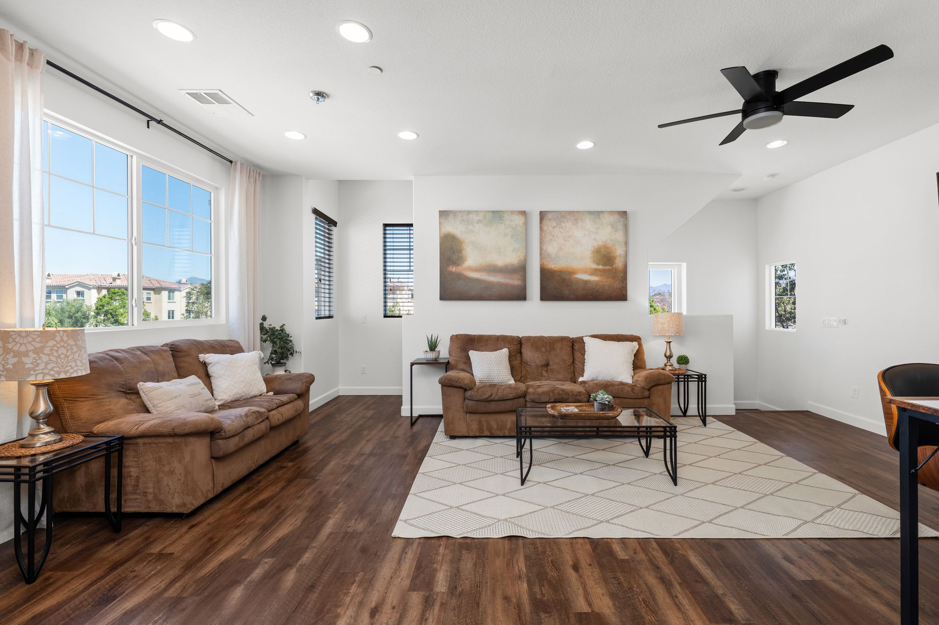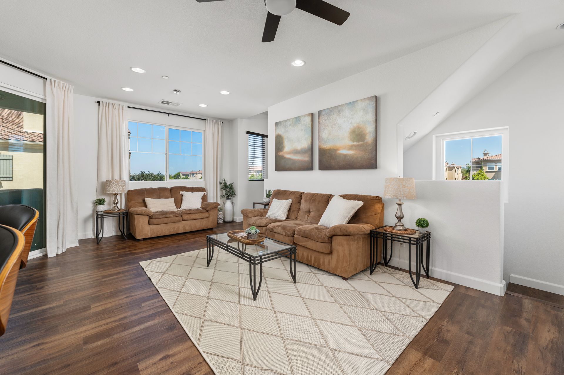 Step into a home that feels elevated, intentional, and truly move-in ready—enhanced by the convenience of an attached garage. This beautifully upgraded Aviare condo in the sought-after Village of Montecito community stands out with a cohesive, designer-inspired aesthetic and luxury vinyl plank flooring throughout every level—including the stairs—creating a clean, carpet-free living experience buyers love. The kitchen is the showpiece, featuring quartz countertops, a white single-basin sink, dark cabinetry, and elegant gold hardware for a custom, high-end look rarely found in this floor plan. Natural light fills the open-concept living space through large picture windows and sliding glass doors, creating a bright and inviting atmosphere ideal for both everyday living and entertaining. Recessed lighting, ceiling fans, and designer window treatments add comfort and style throughout. The flexible layout offers dual primary suites, each with its own private bath, plus an additional space perfect for a home office, guest room, or flex use. Enjoy indoor-outdoor living with a private balcony off the main living area, perfect for morning coffee or evening wind-downs. Located in the vibrant Montecito community, residents enjoy resort-style amenities including a pool and spa with dedicated lap lanes, expansive sun deck, multiple BBQ areas, and inviting spaces to relax or entertain. The community also offers a clubhouse with fitness center, along with basketball, tennis, and bocce ball courts—creating a lifestyle that feels both active and resort-inspired, all just minutes from top-rated schools, shopping, dining, and major commuter routes. Modern upgrades. Prime location. Turnkey living. This is the one buyers have been waiting for.
