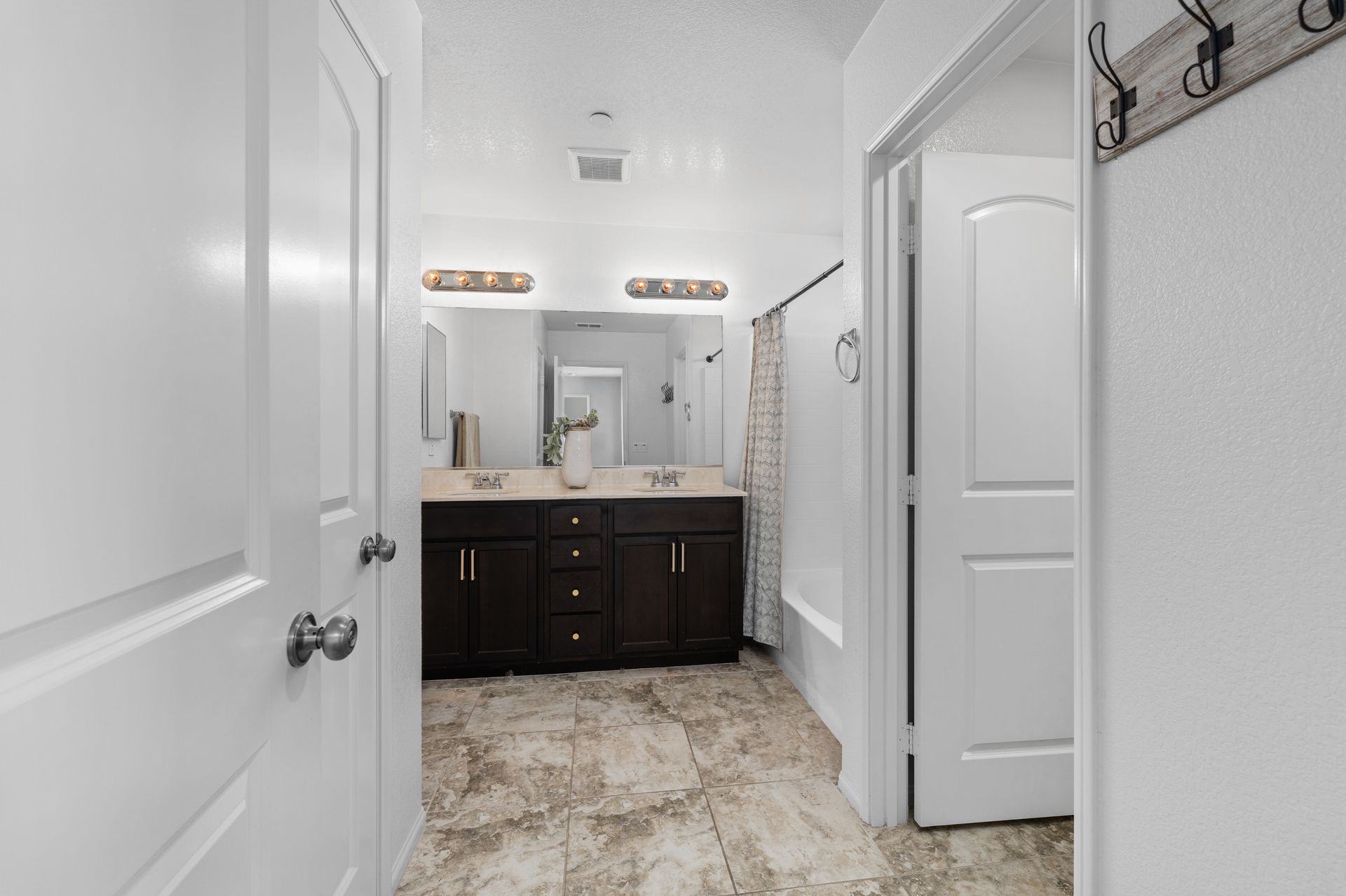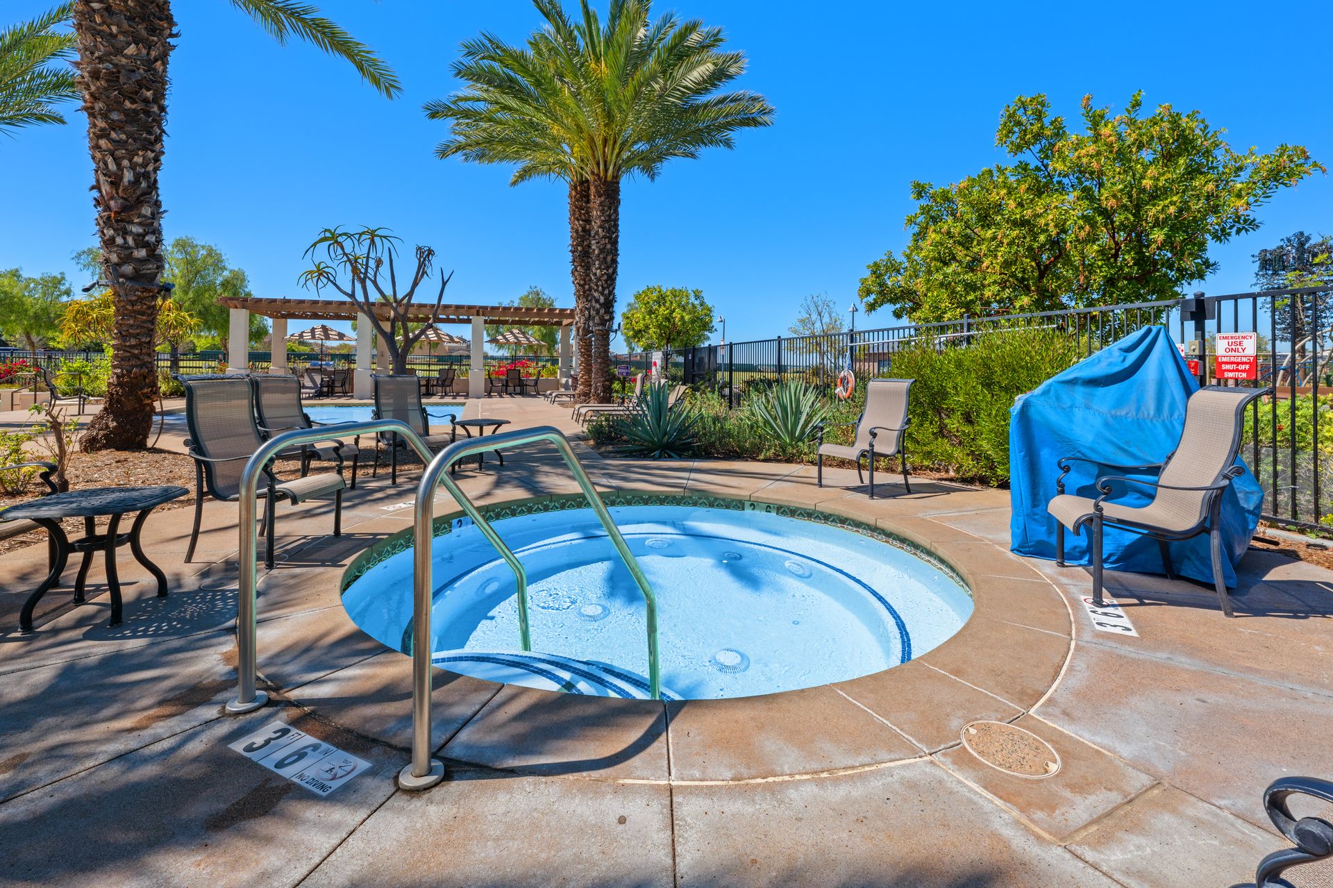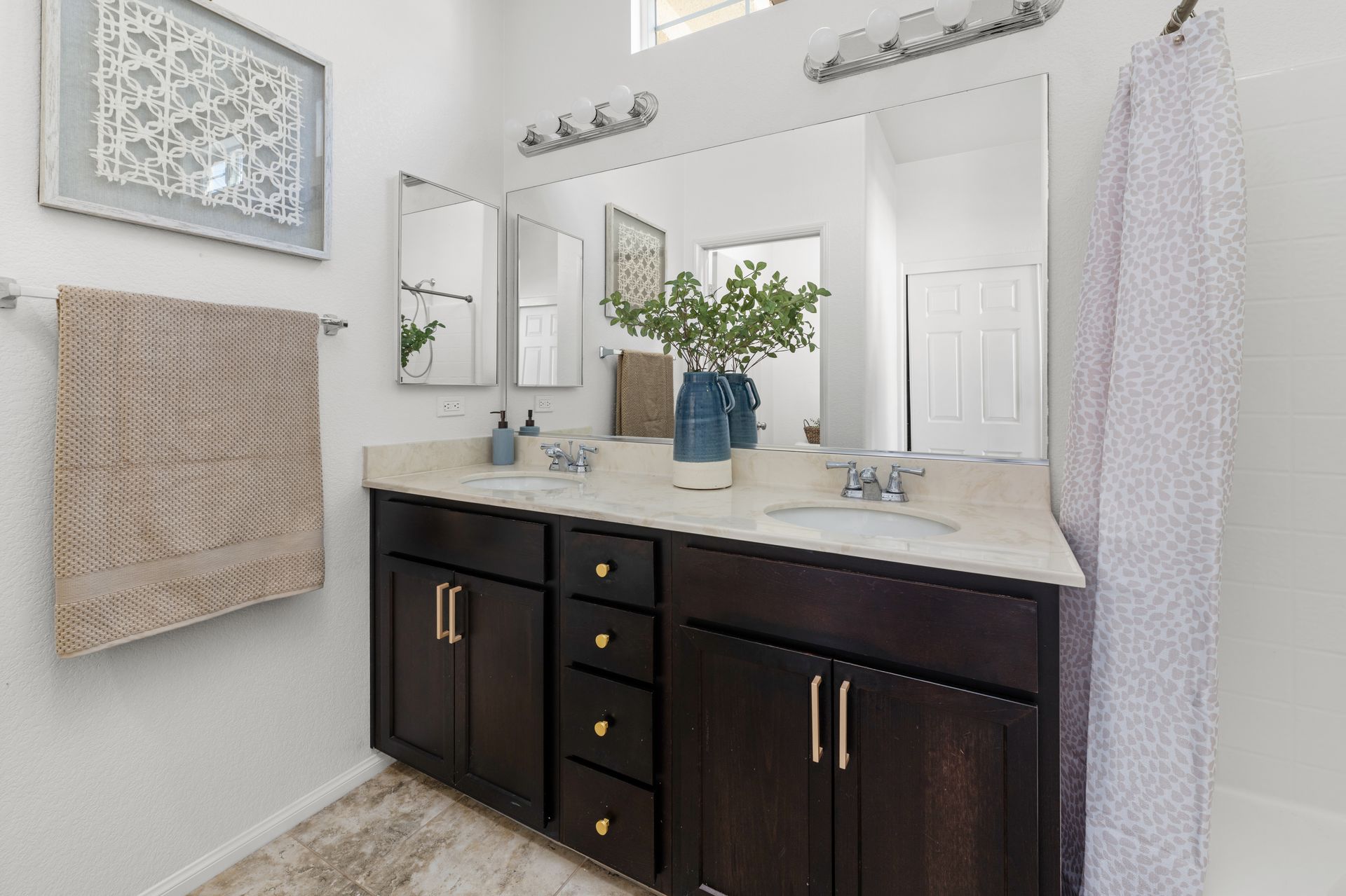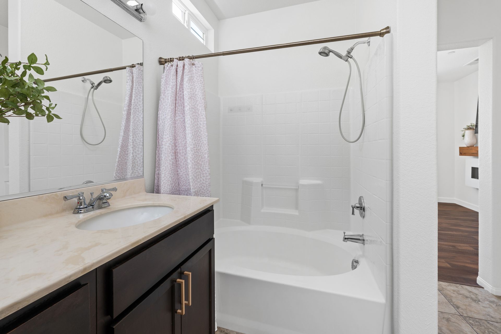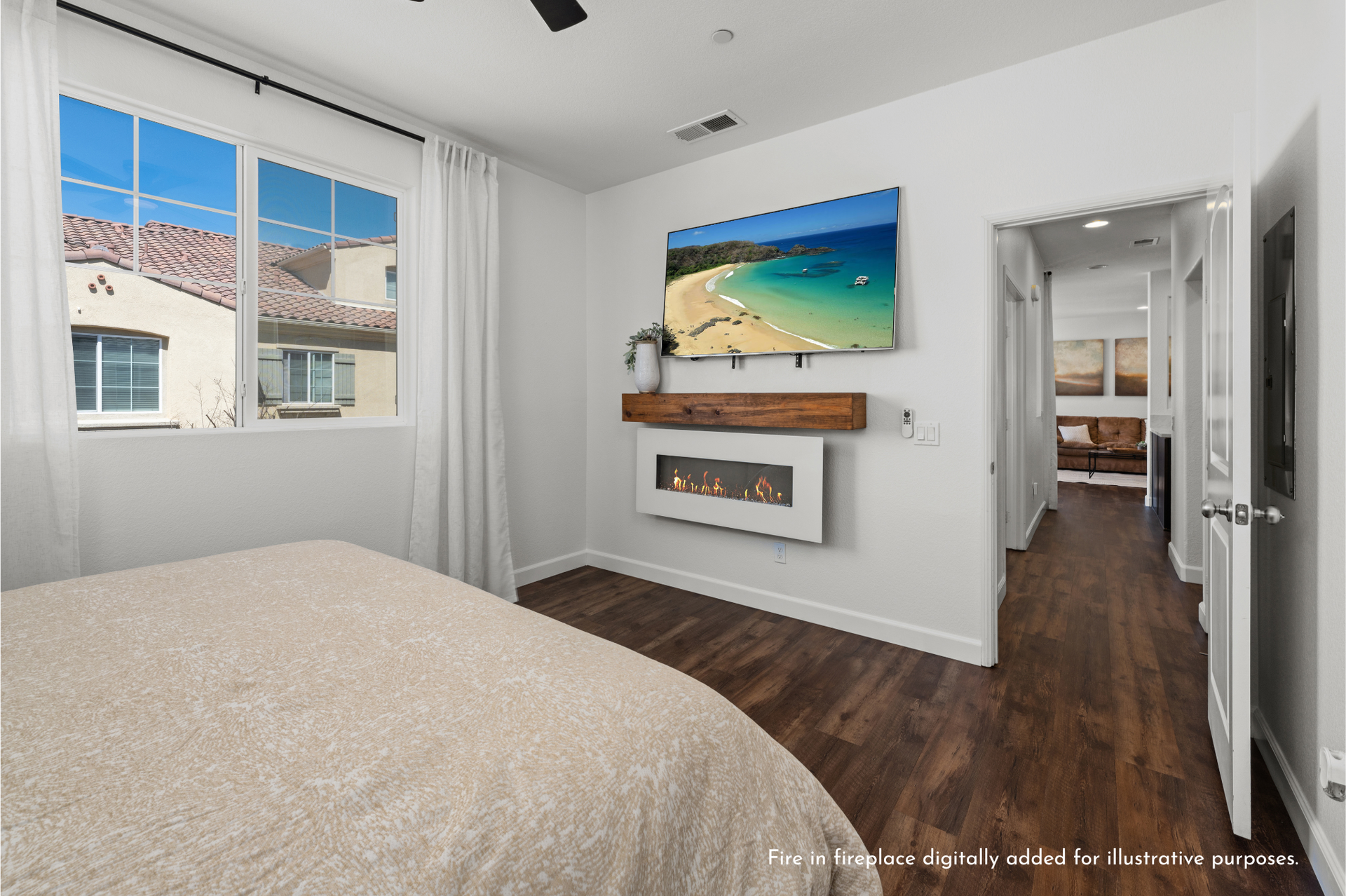 Step into a home that feels elevated, intentional, and truly move-in ready—enhanced by the convenience of an attached garage. This beautifully upgraded Aviare condo in the sought-after Village of Montecito community stands out with a cohesive, designer-inspired aesthetic and luxury vinyl plank flooring throughout every level—including the stairs—creating a clean, carpet-free living experience buyers love. The kitchen is the showpiece, featuring quartz countertops, a white single-basin sink, dark cabinetry, and elegant gold hardware for a custom, high-end look rarely found in this floor plan. Natural light fills the open-concept living space through large picture windows and sliding glass doors, creating a bright and inviting atmosphere ideal for both everyday living and entertaining. Recessed lighting, ceiling fans, and designer window treatments add comfort and style throughout. The flexible layout offers dual primary suites, each with its own private bath, plus an additional space perfect for a home office, guest room, or flex use. Enjoy indoor-outdoor living with a private balcony off the main living area, perfect for morning coffee or evening wind-downs. Located in the vibrant Montecito community, residents enjoy resort-style amenities including a pool and spa with dedicated lap lanes, expansive sun deck, multiple BBQ areas, and inviting spaces to relax or entertain. The community also offers a clubhouse with fitness center, along with basketball, tennis, and bocce ball courts—creating a lifestyle that feels both active and resort-inspired, all just minutes from top-rated schools, shopping, dining, and major commuter routes. Modern upgrades. Prime location. Turnkey living. This is the one buyers have been waiting for.