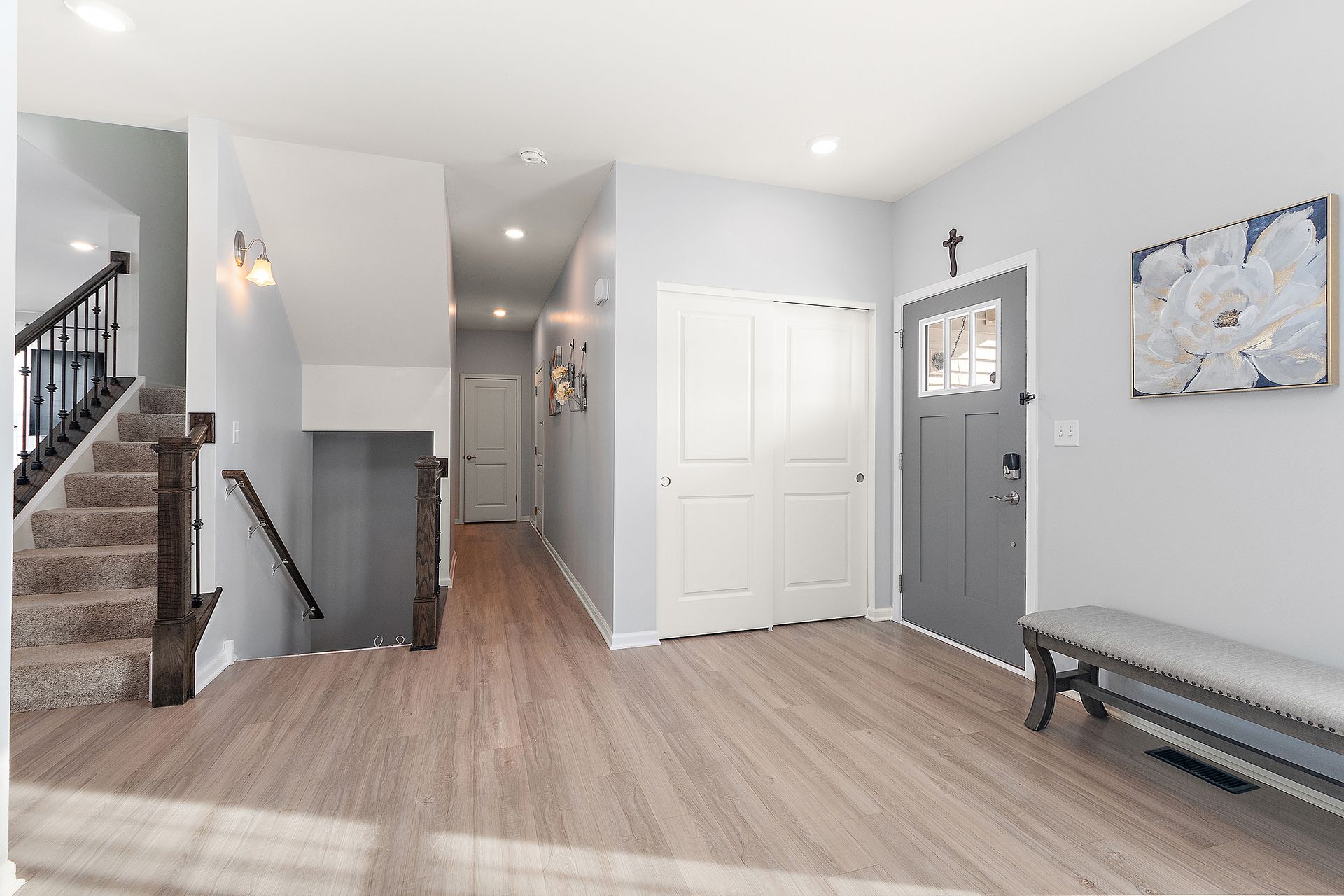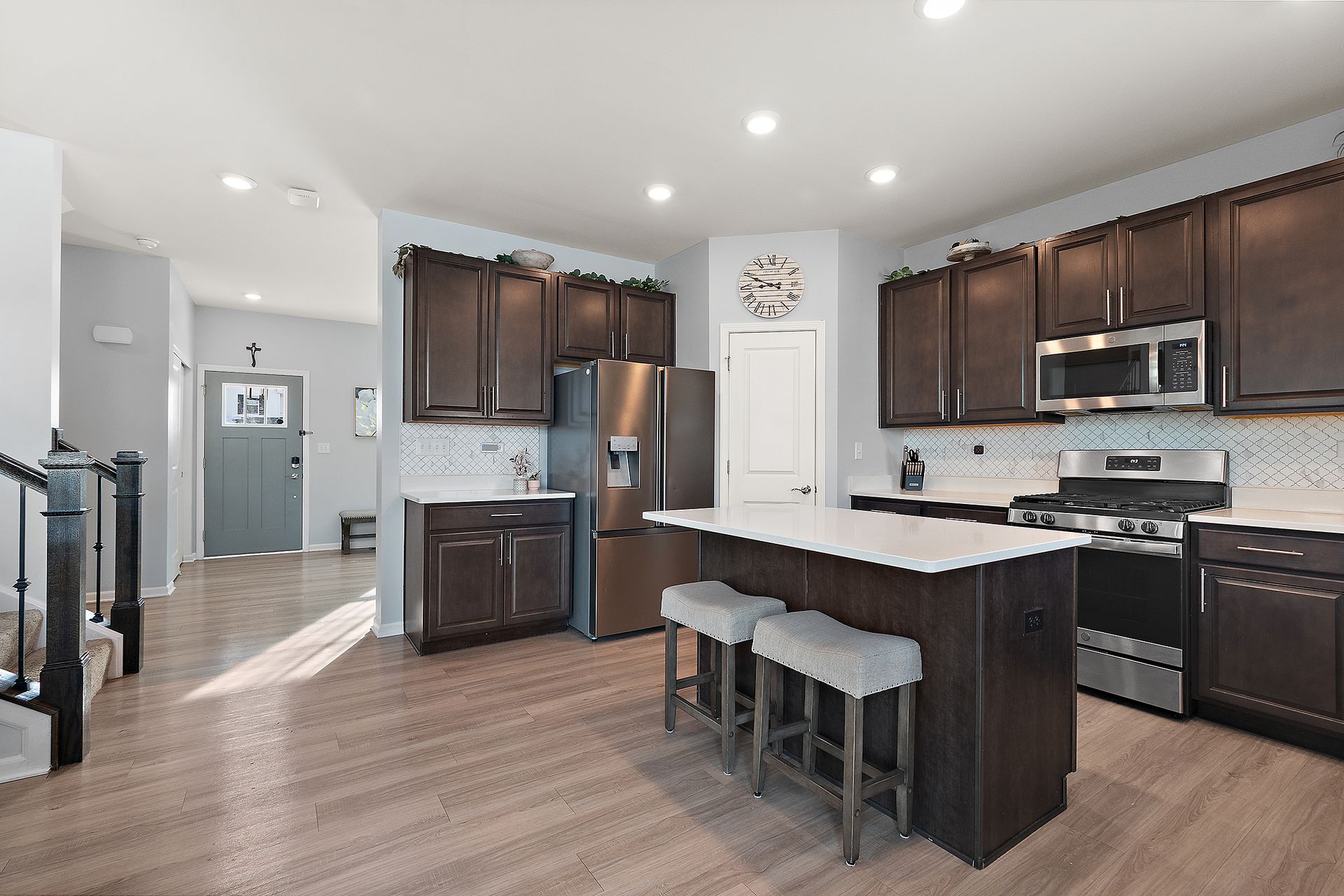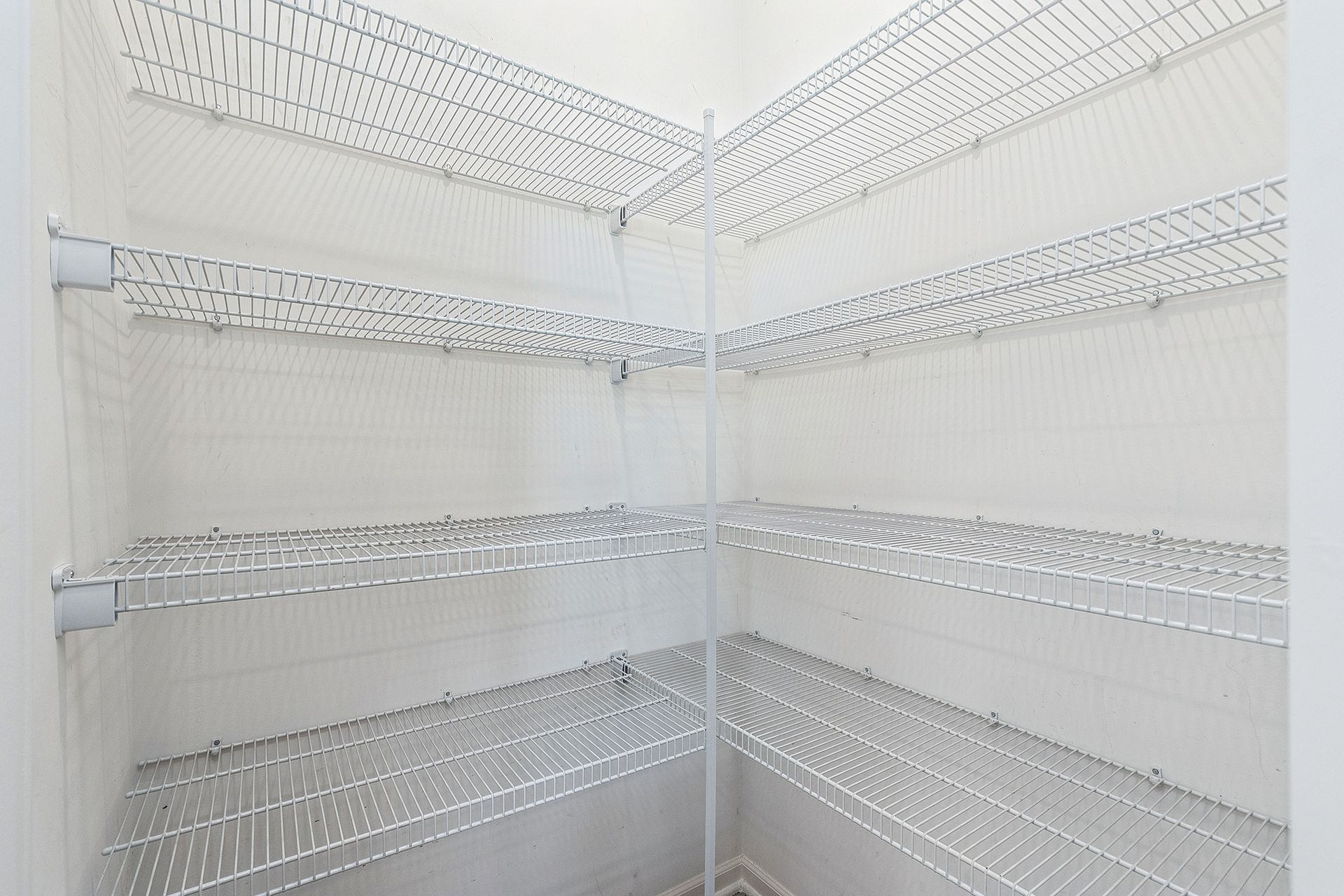 Inside, the open concept design is filled with natural light, accentuated by vinyl plank flooring, an accent wall, and modern appliances. The ample countertop space and storage, as well as the walk-in pantry in the kitchen, create a functional and organized cooking environment. The primary bedroom boasts a spacious layout with a walk-in closet and organizer, while the additional bedrooms feature plush carpeting.
