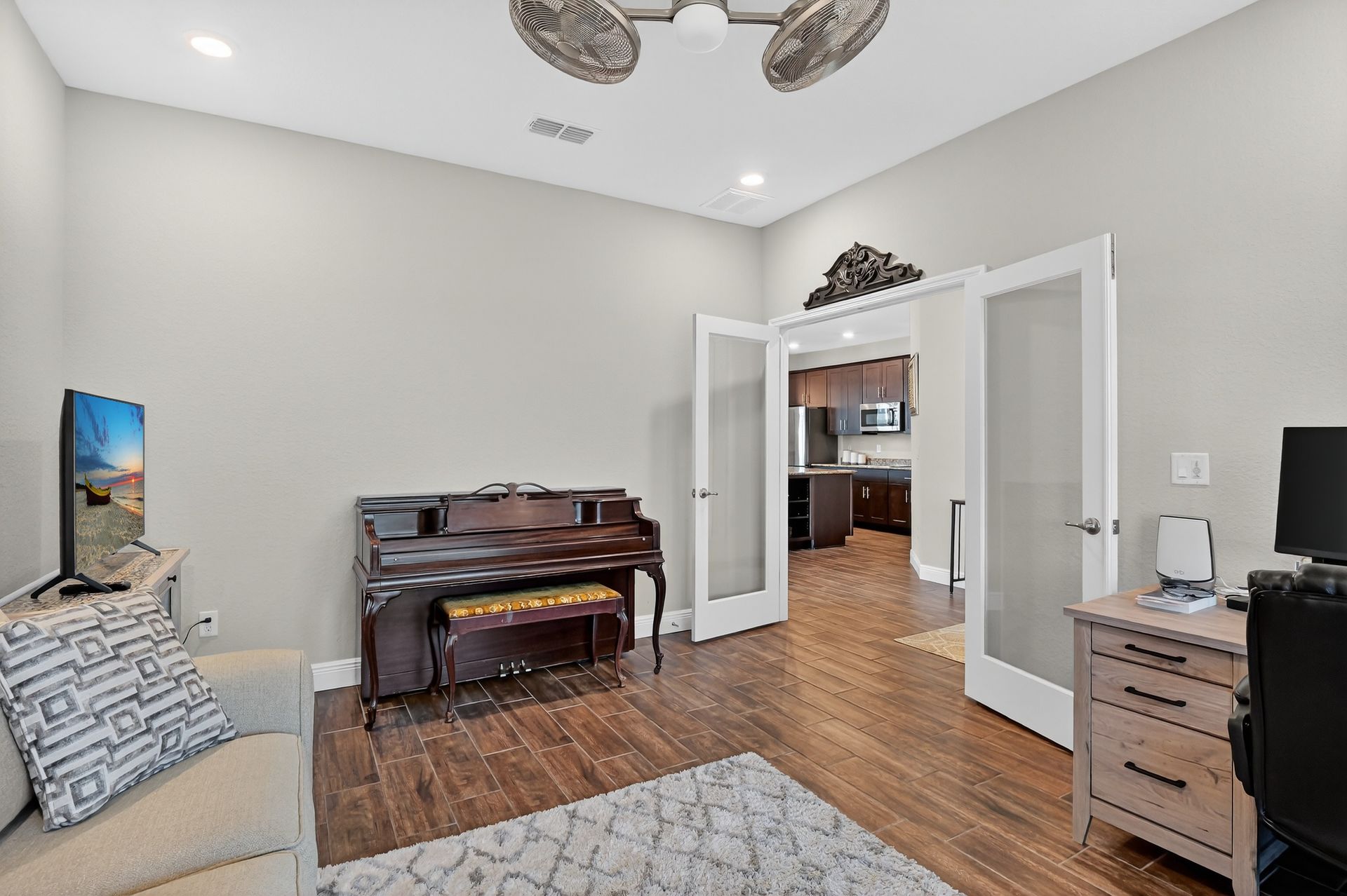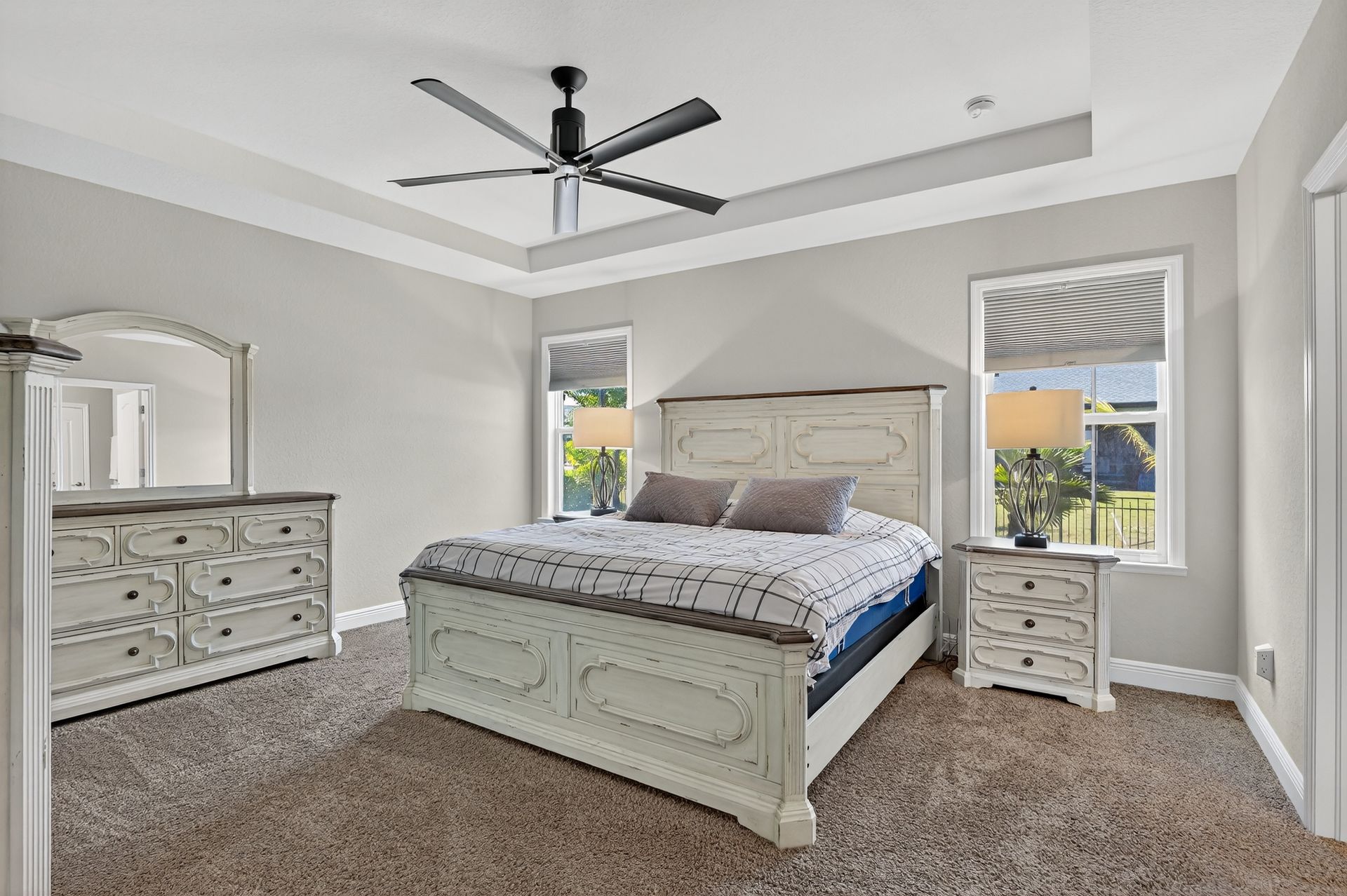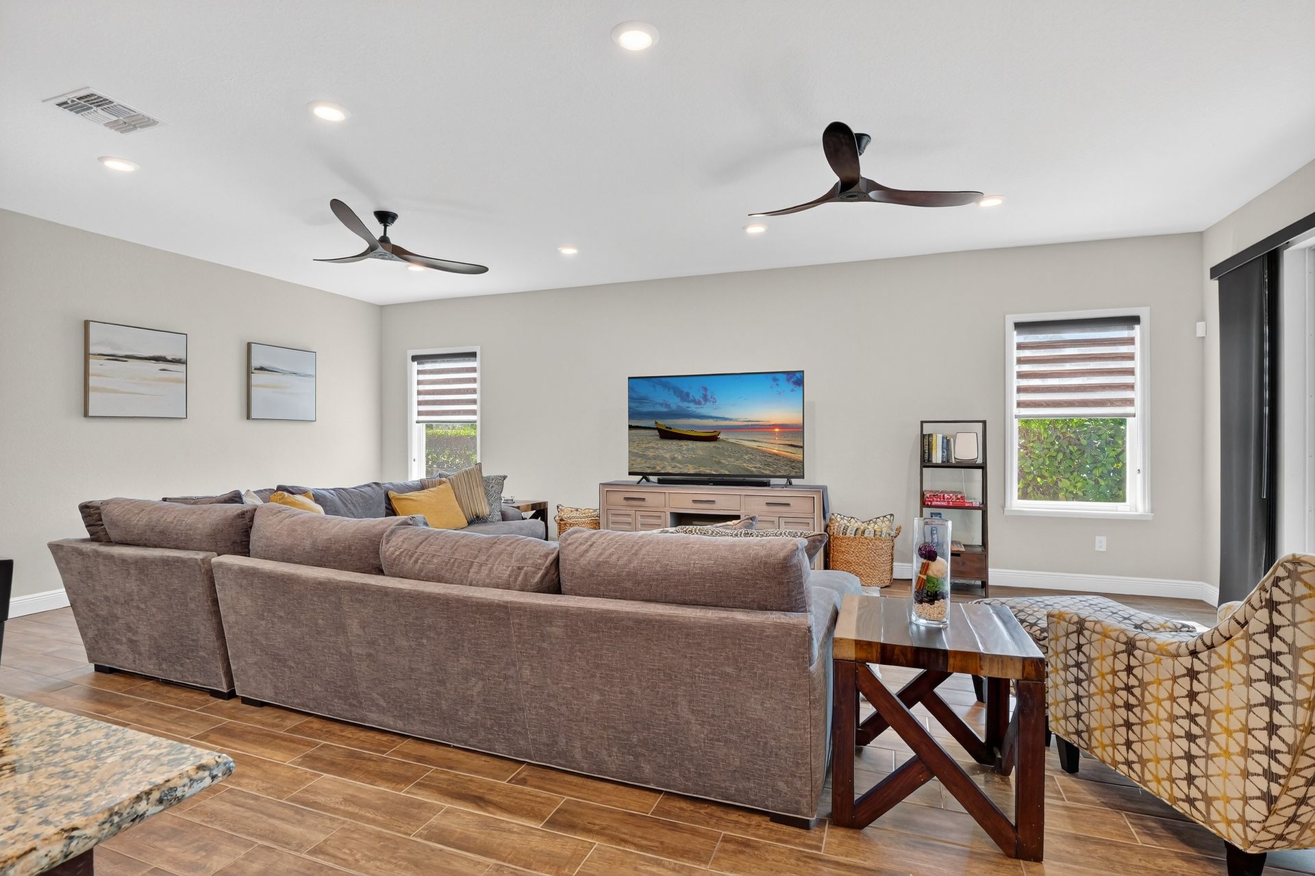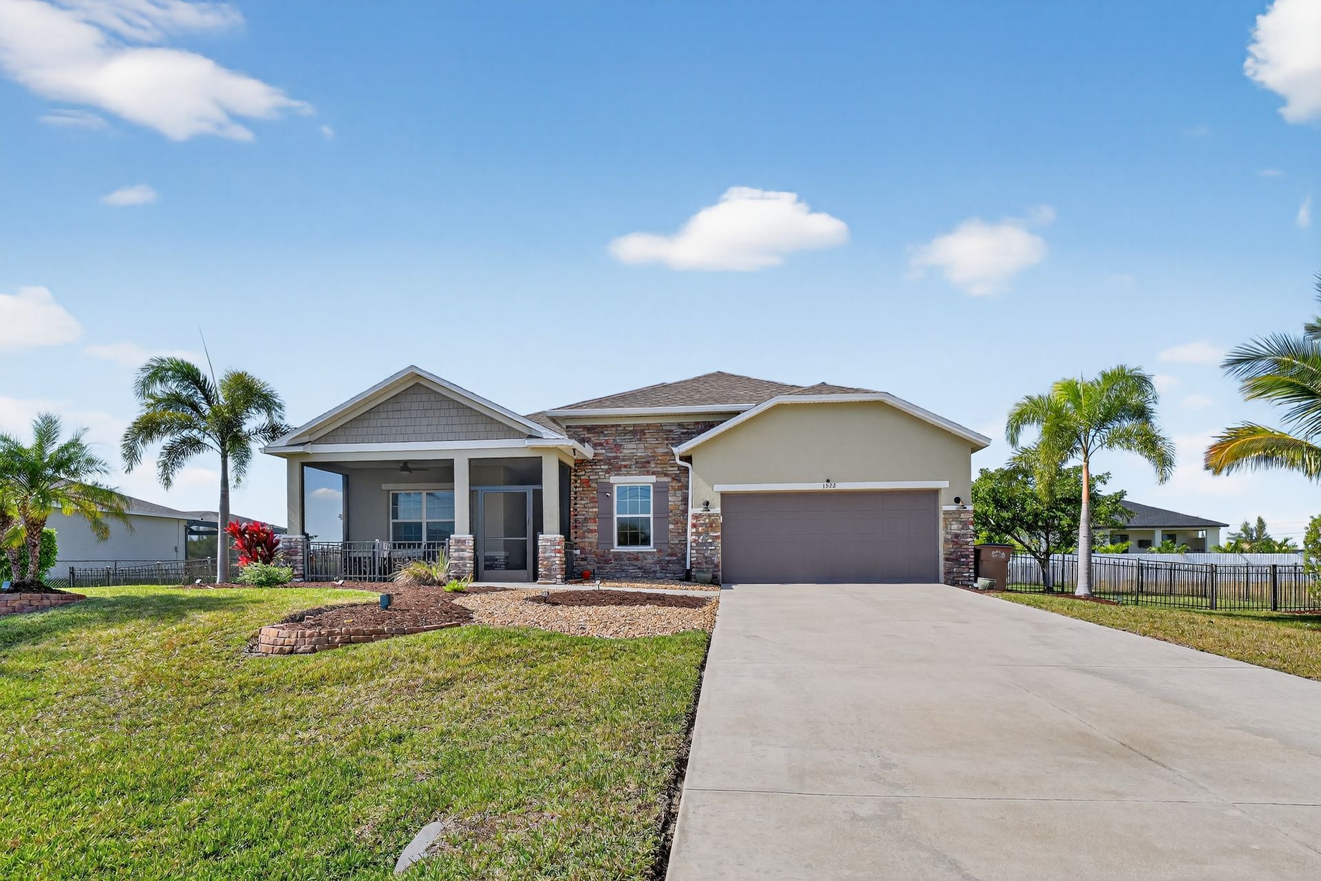 BEING SOLD TURNKEY! Stunning Western-Exposure Pool Home on an Oversized 0.344-Acre Lot with a welcoming screened front porch sets the tone the moment you arrive. inside and the serene, open feel immediately pulls you in, with a perfect sightline straight to the heart of the home—the spacious gathering room that flows seamlessly into a kitchen any chef would love. Designed for entertaining and everyday ease, the kitchen features a massive granite island with plenty of seating, double wall ovens, abundant soft-close cabinetry, a walk-in pantry, and expansive counter space that makes cooking for two or twenty effortless. Beautiful wood-plank porcelain tile runs throughout all the main living areas, while plush carpet keeps the bedrooms cozy and quiet. Tucked near the entrance, a private home office with double doors offers the ideal quiet retreat (or easily converts to a playroom or guest space when needed). The true magic happens outside. The western-exposure lanai stretches the full width of the house, framing spectacular sunset views every evening. Dive into the heated saltwater pool with its sun shelf and bubbler, dine under the covered truss area, or simply relax on the generous travertine-paver deck. An aluminum fence encloses the expansive, fully fenced backyard—one of the largest lots in the area at 0.344 acres (150 ft deep)—delivering rare space and privacy you won’t find in most Cape Coral homes. Thoughtful upgrades elevate the entire property: designer lighting, ceiling fans, custom window treatments, a whole-house reverse osmosis water system, in-wall pest control, an extra-wide garage with epoxy flooring, and well irrigation for low water bills. Move-in ready and brimming with upgrades, this home truly exceeds expectations. Come see for yourself.