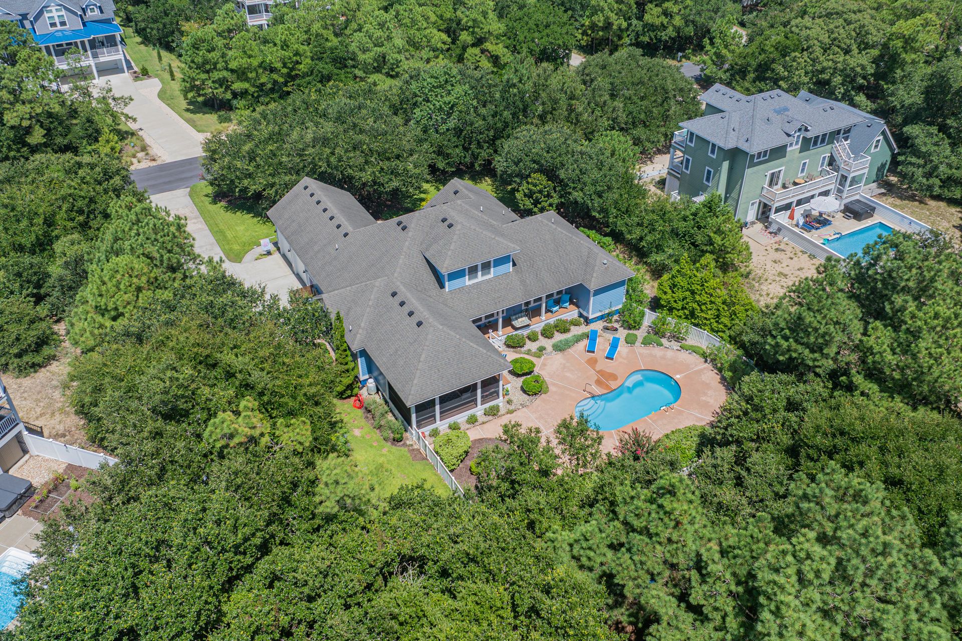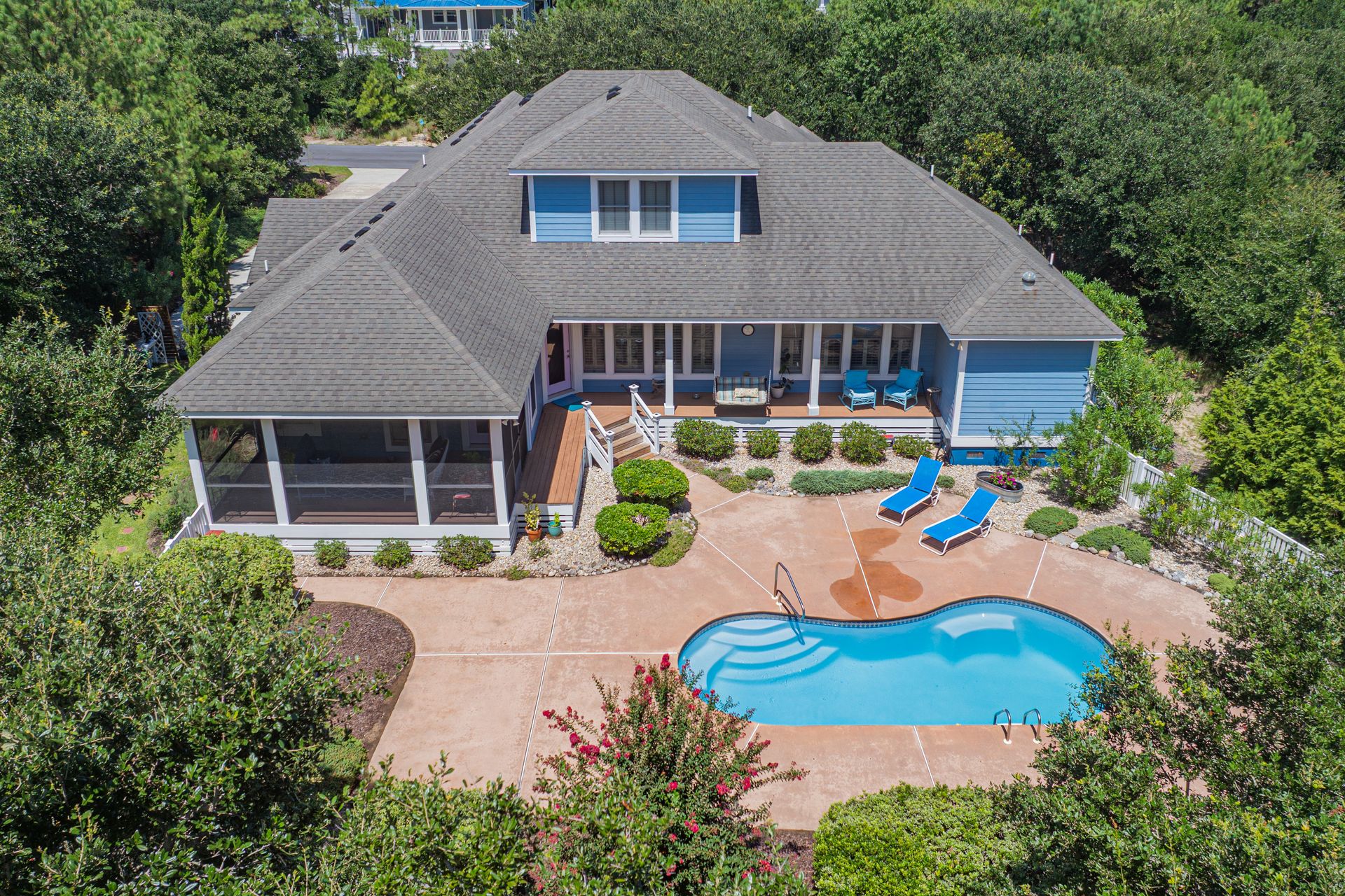 Welcome to your private coastal haven in the heart of Southern Shores. Perfectly positioned on a sprawling .65-acre lot and backing up to peaceful common space, this elevated home blends privacy, comfort, and convenience in one of the Outer Banks’ most sought-after locations. Situated in an X flood zone with an elevation of approximately 18 feet above sea level, it offers both peace of mind and timeless charm. From here, you’re just a short walk to the ocean via a private neighborhood path, making daily beach walks and sunrise strolls part of your everyday life. Inside, you’ll find 3 bedrooms, an additional office, and a versatile bonus space perfect for a workout room, movie room, or more. The thoughtful layout features a first-floor ensuite, dual master sinks and closets, a walk-in attic, and plantation shutters throughout. High-end details abound, from hickory hardwood floors to Viking appliances in the gourmet kitchen. Comfort is assured with a whole-house 34 KW Generac generator and a 500-gallon gas tank, while outdoor living shines with a screened-in porch, indoor/outdoor gas fireplace, and a fiberglass pool with tile coping. A fenced yard offers a 9-zone irrigation system fed by a clean well, ensuring lush landscaping year-round, with an extra space for pets. From this ideal location, you can hop on your bike and enjoy local Southern Shores favorites like Steamers, Shore Coffee, and Southern Shores Pizza, or venture just minutes to explore all that the Town of Duck has to offer. Homeowners also enjoy membership opportunities with both Chicahauk Property Owners Association and Southern Shores Civic Association, providing multiple community amenities to enjoy year-round. This home is a must see!
