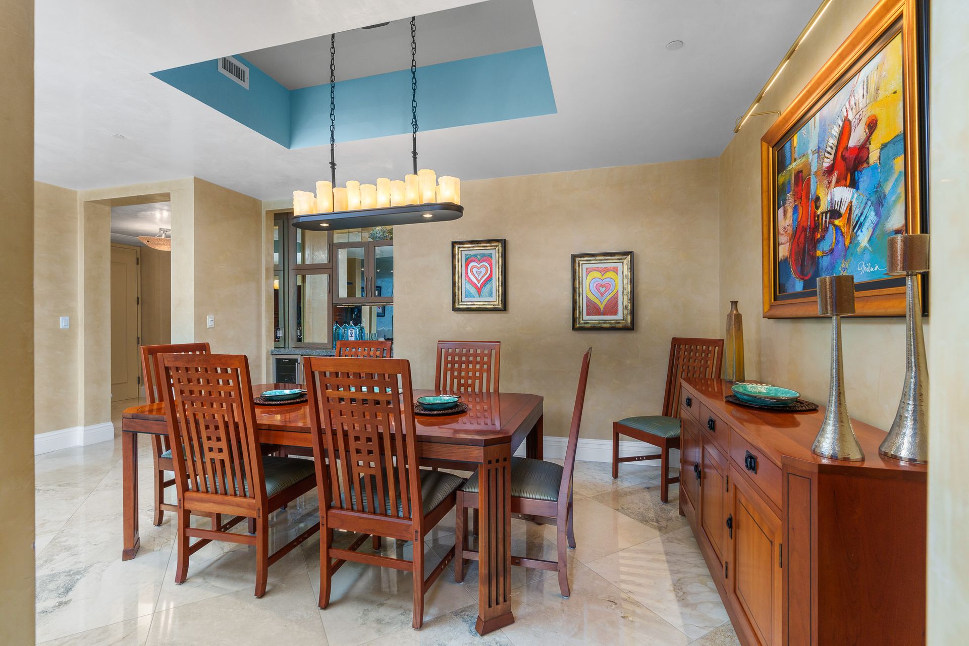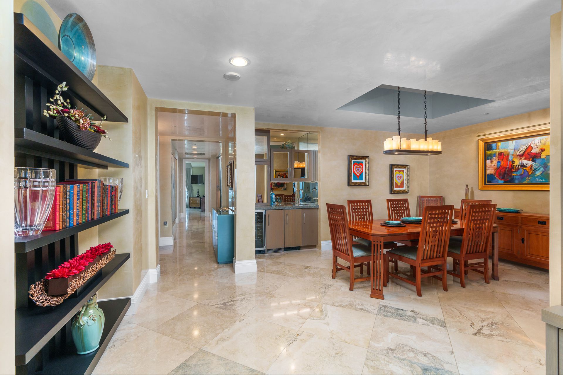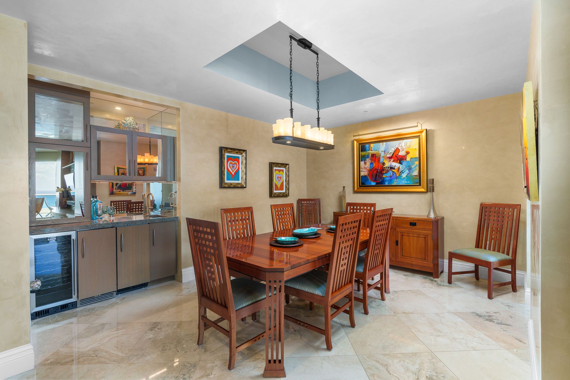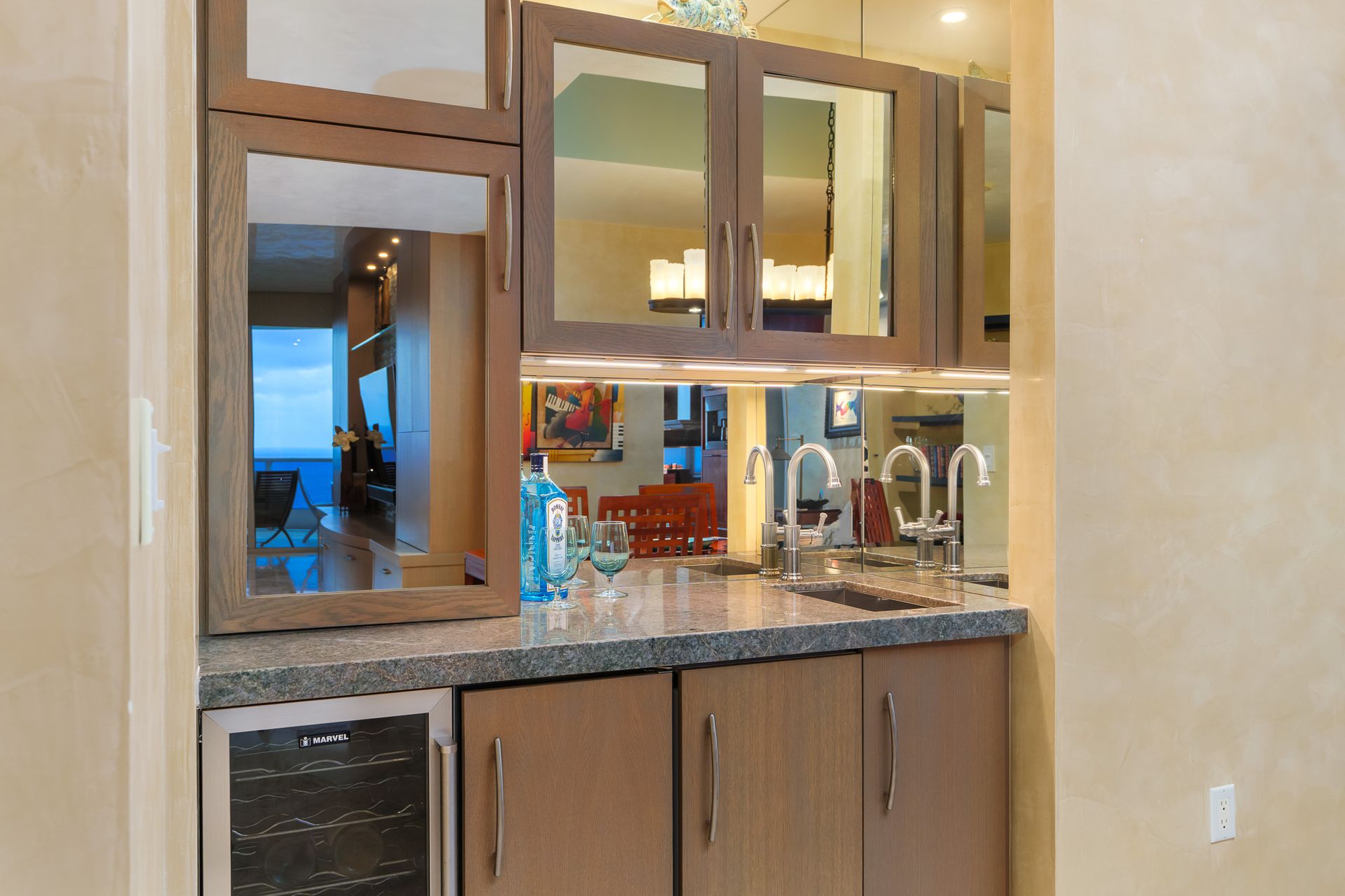 • Wet bar with wine cooler, fridge, and sink—perfect for hosting