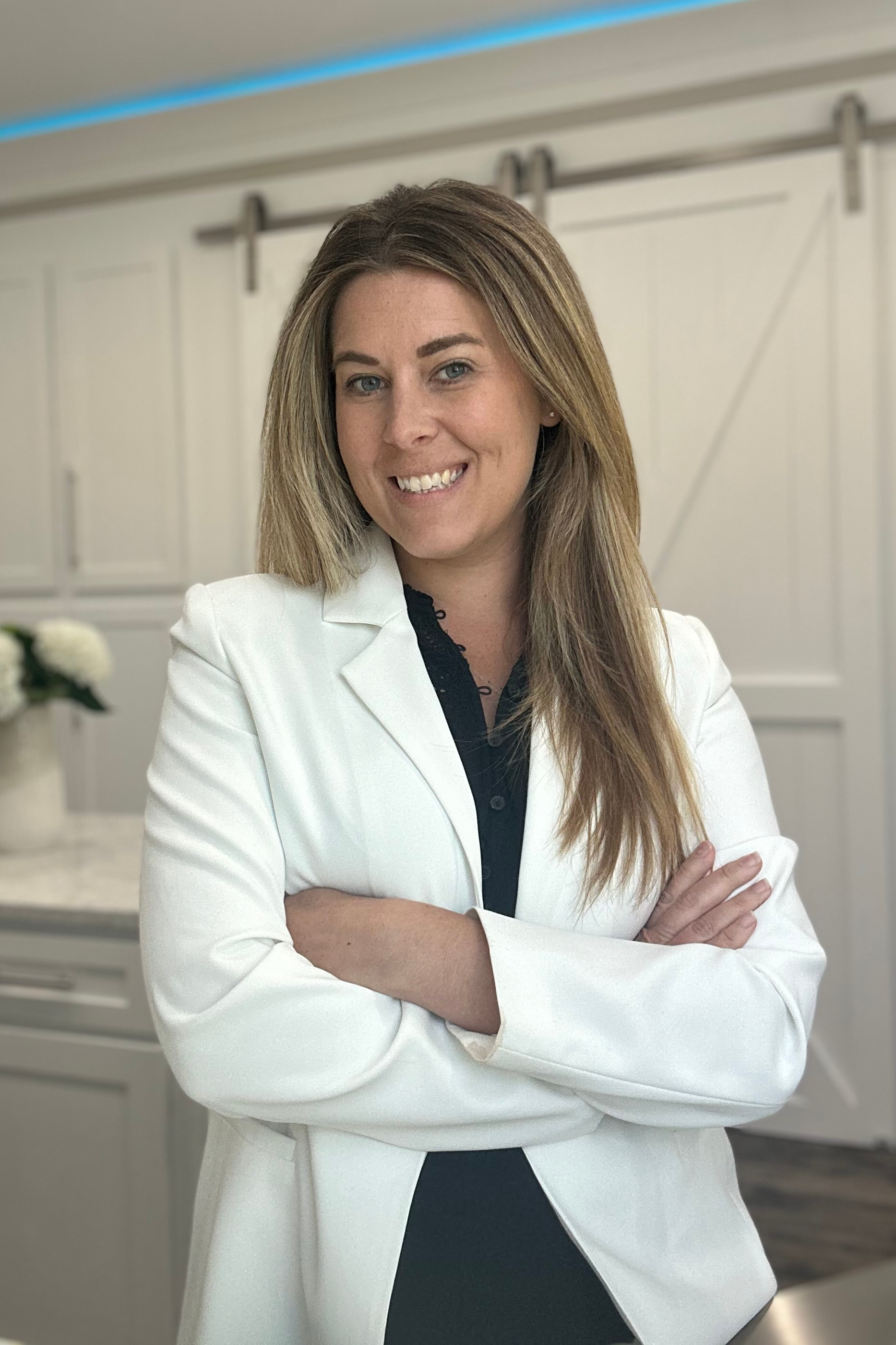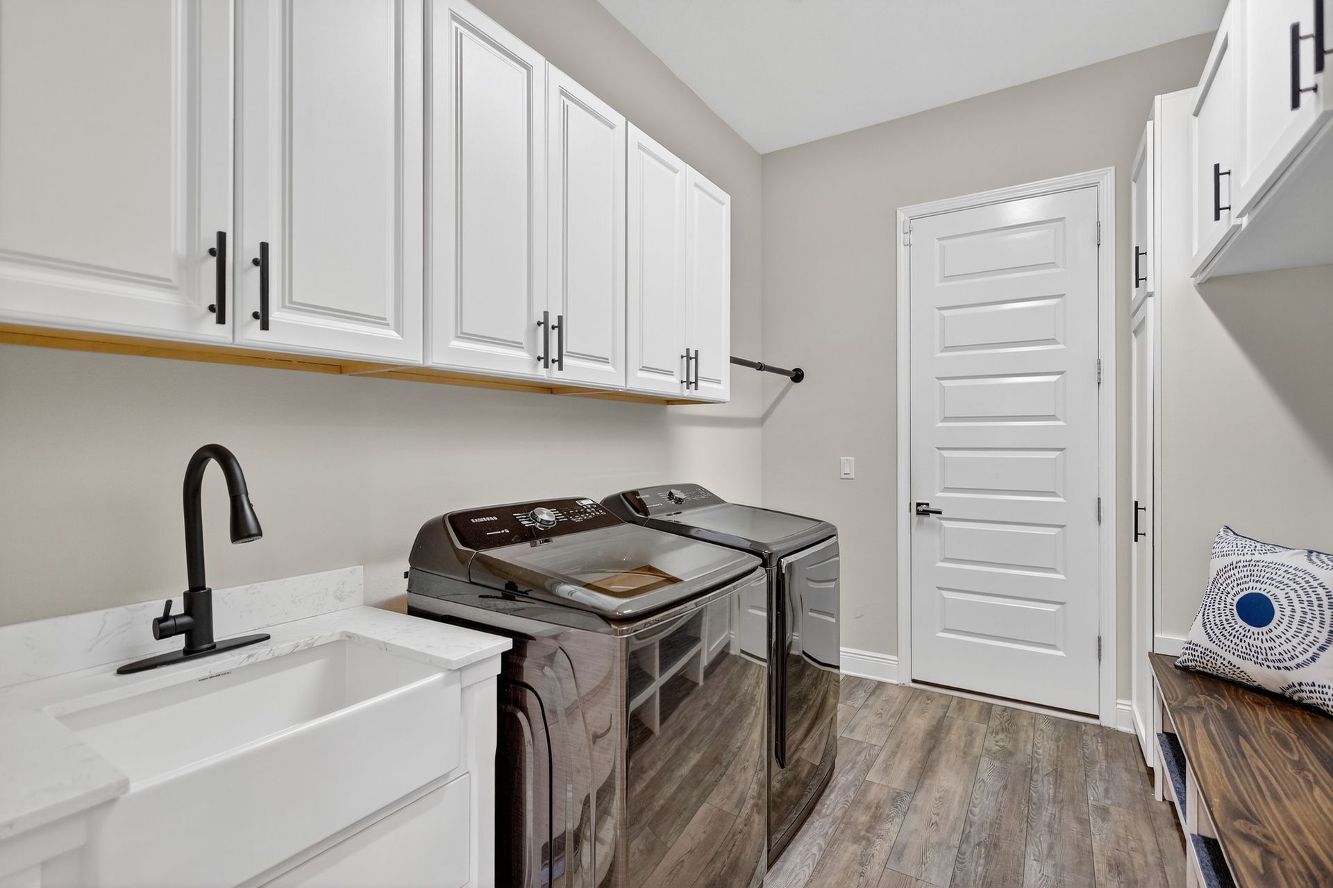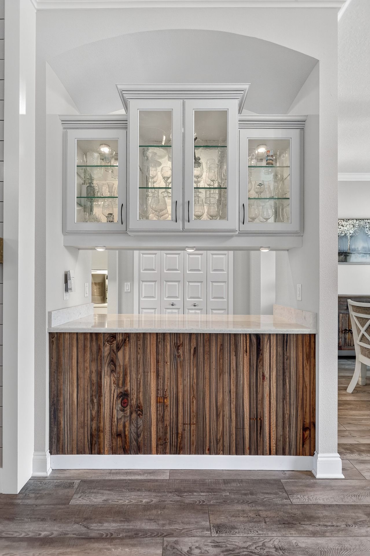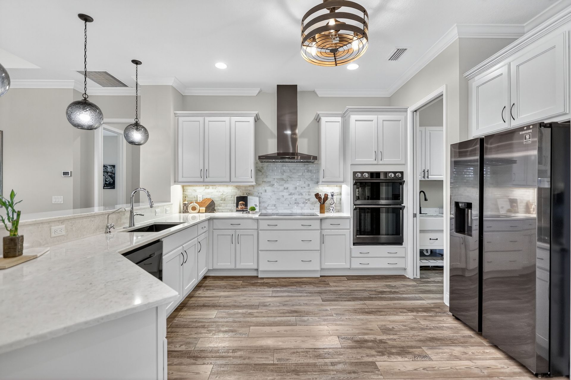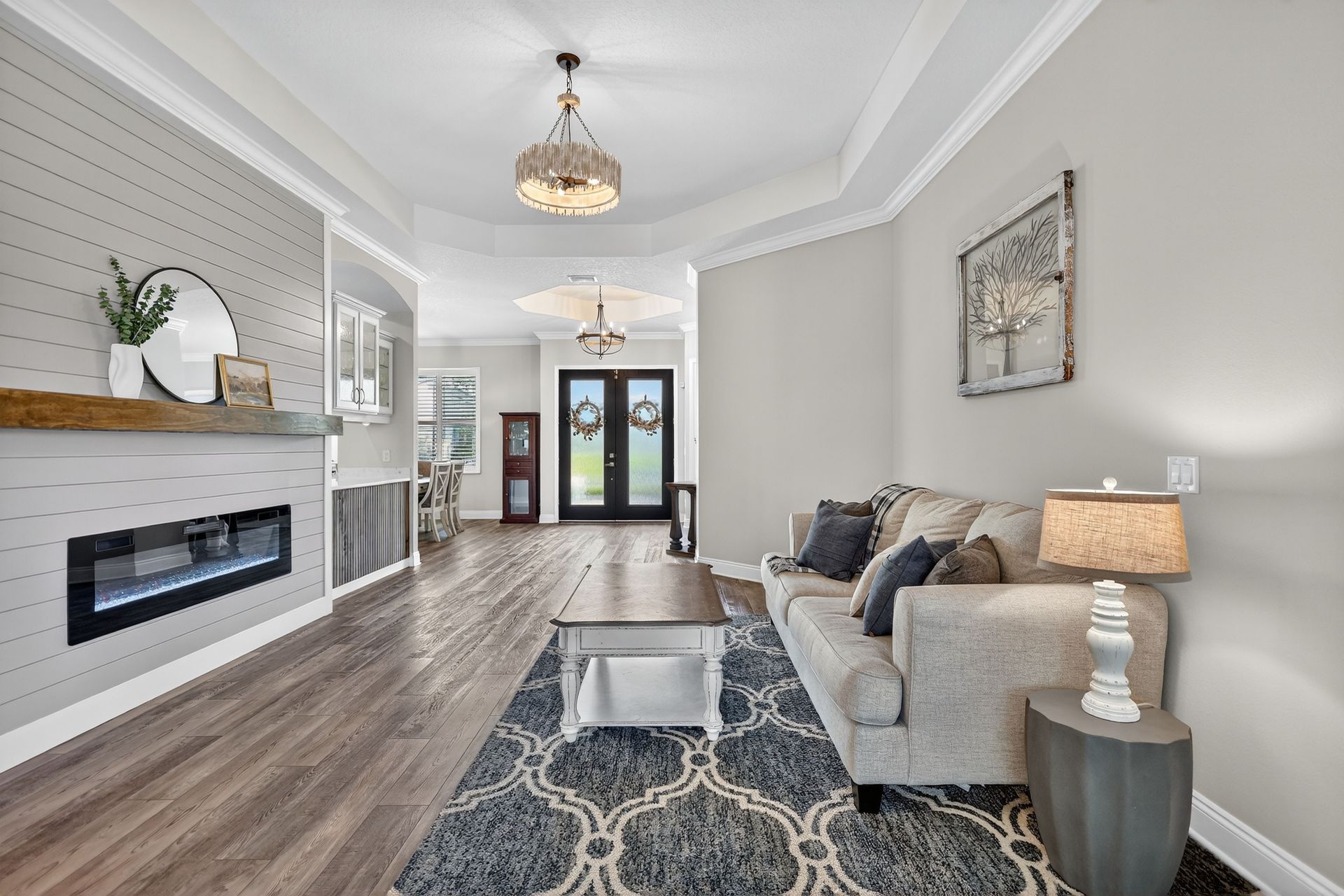 The main living area offers a formal dining room, a welcoming living room with custom shiplap wall and electric fireplace, and glass double doors that fill the space with natural light. The chef’s kitchen is a true showpiece, featuring quartz countertops, an oversized island with seating, built-in oven and microwave, induction cooktop, soft-close cabinetry, and an expansive pantry. A stylish butler’s pantry with wine fridge and a designer laundry room with custom drop zone add functional flair.