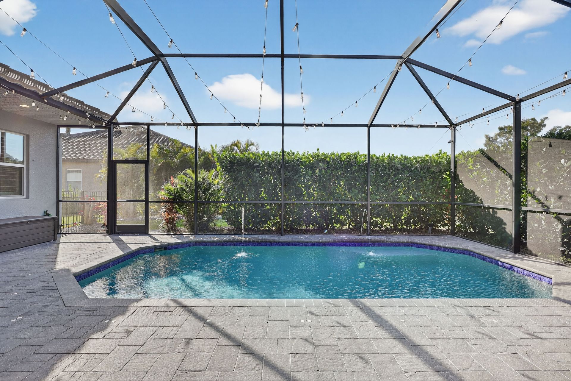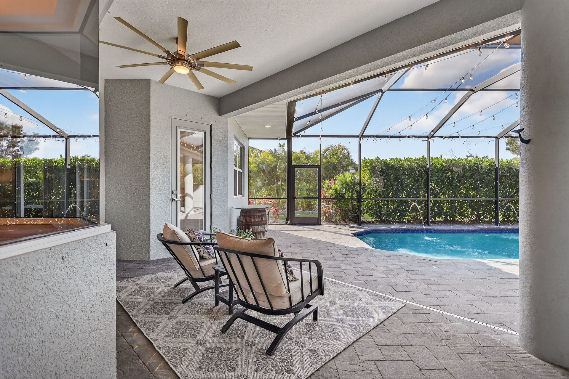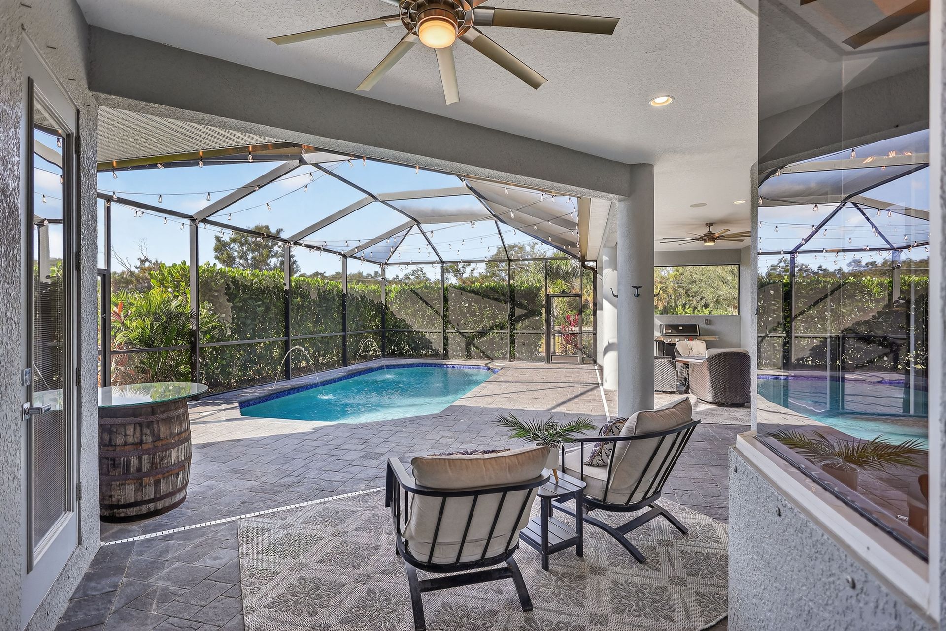 The private primary suite is a sanctuary of calm, with serene pool views, private lanai access, dual walk-in closets with custom organization, and a spa-like bath. The smart split plan includes three additional bedrooms, a versatile office, and a dedicated pool bath with lanai access for added convenience.