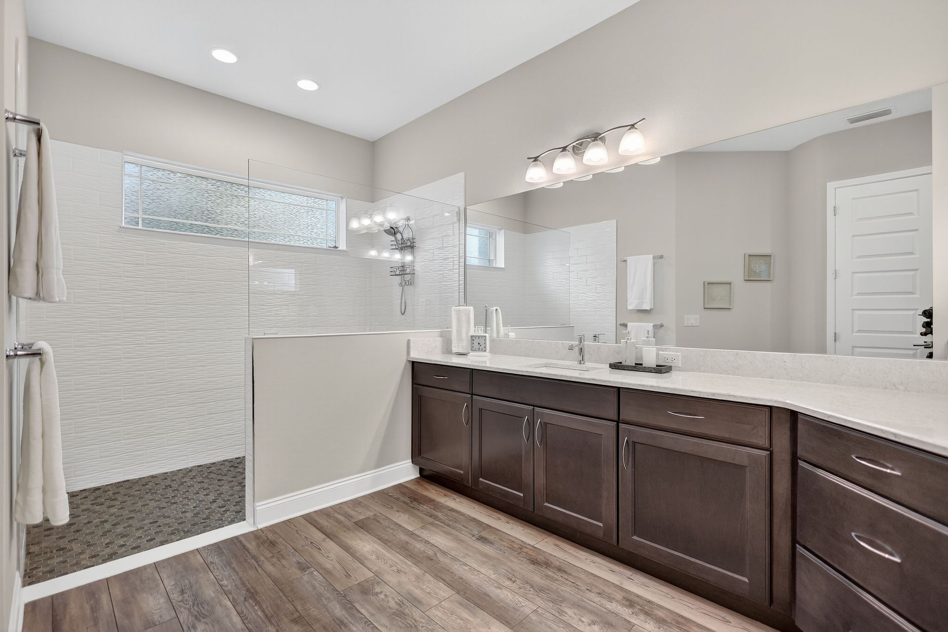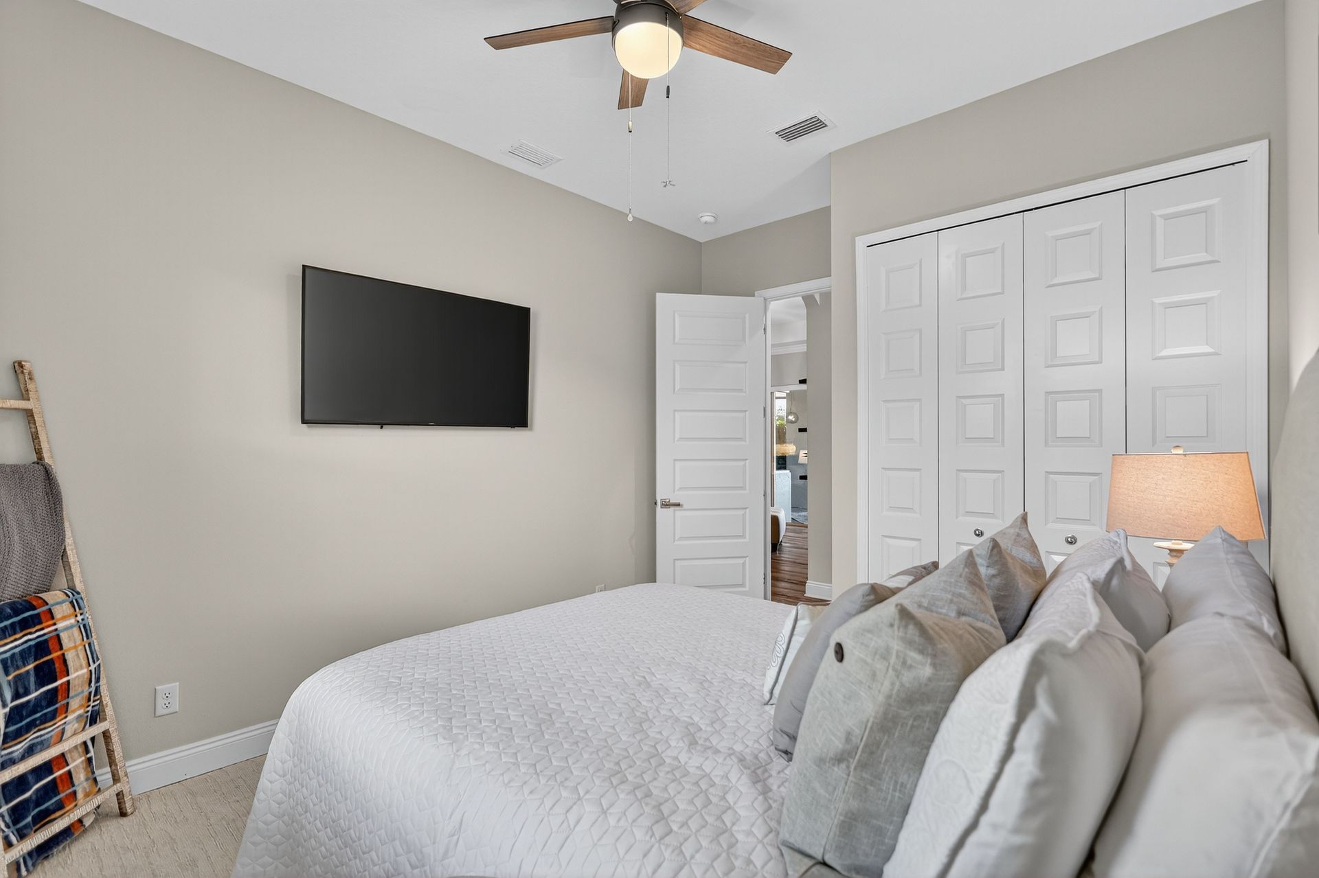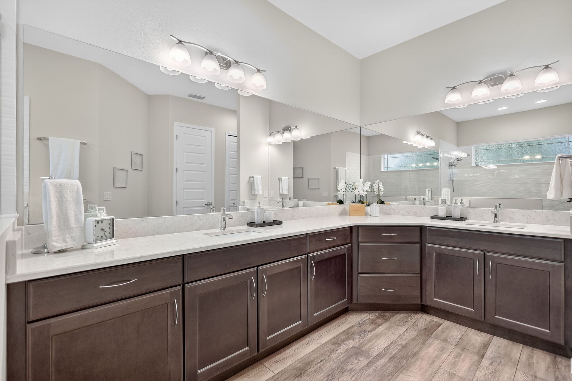 The private primary suite is a sanctuary of calm, with serene pool views, private lanai access, dual walk-in closets with custom organization, and a spa-like bath. The smart split plan includes three additional bedrooms, a versatile office, and a dedicated pool bath with lanai access for added convenience.