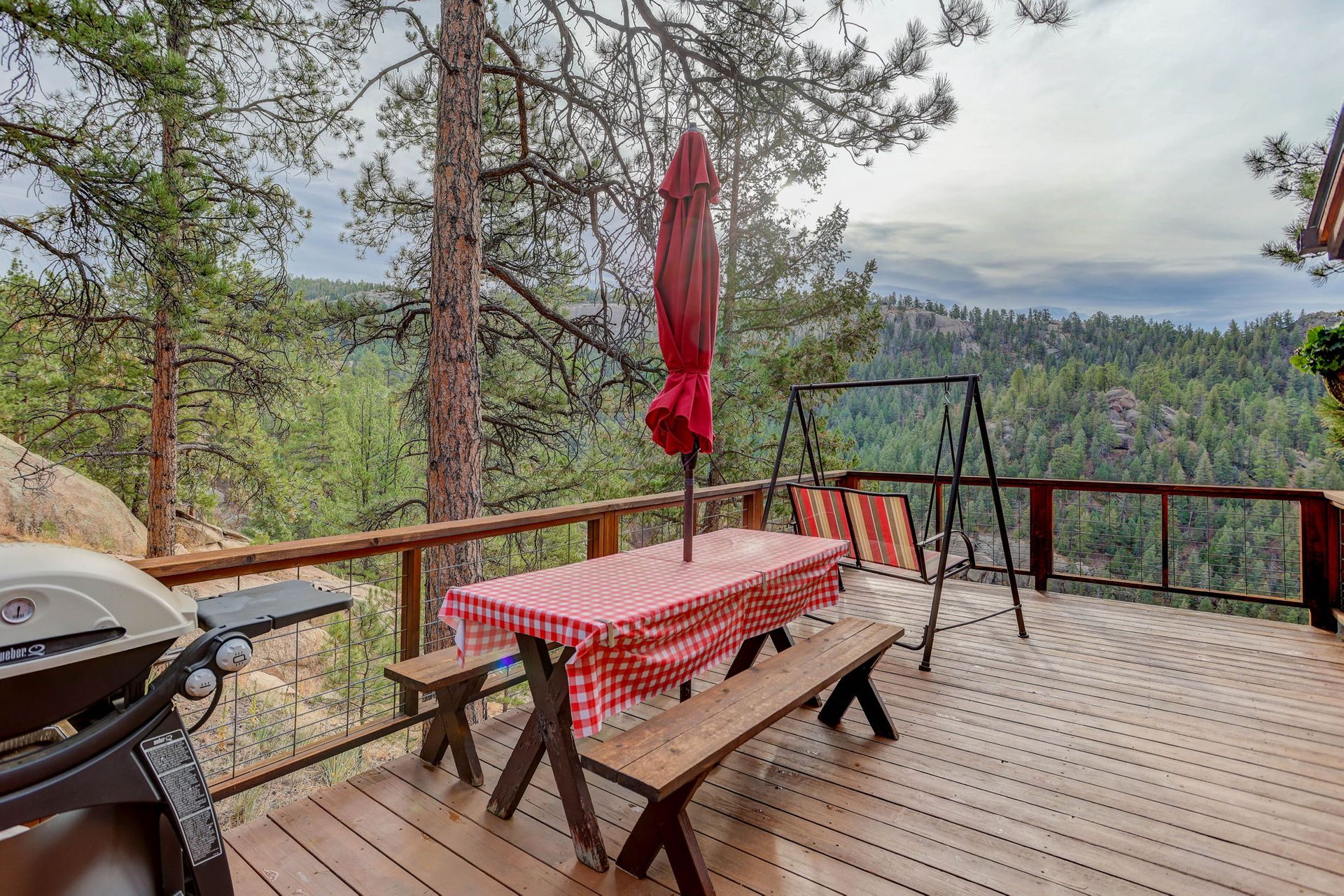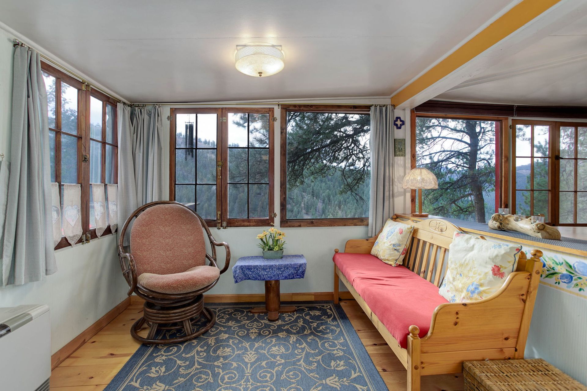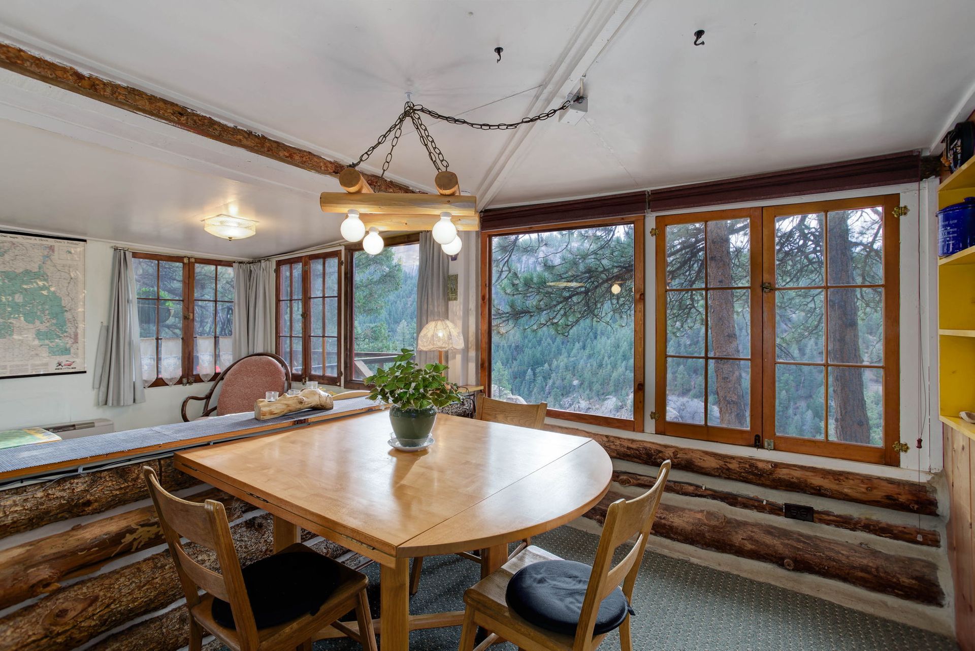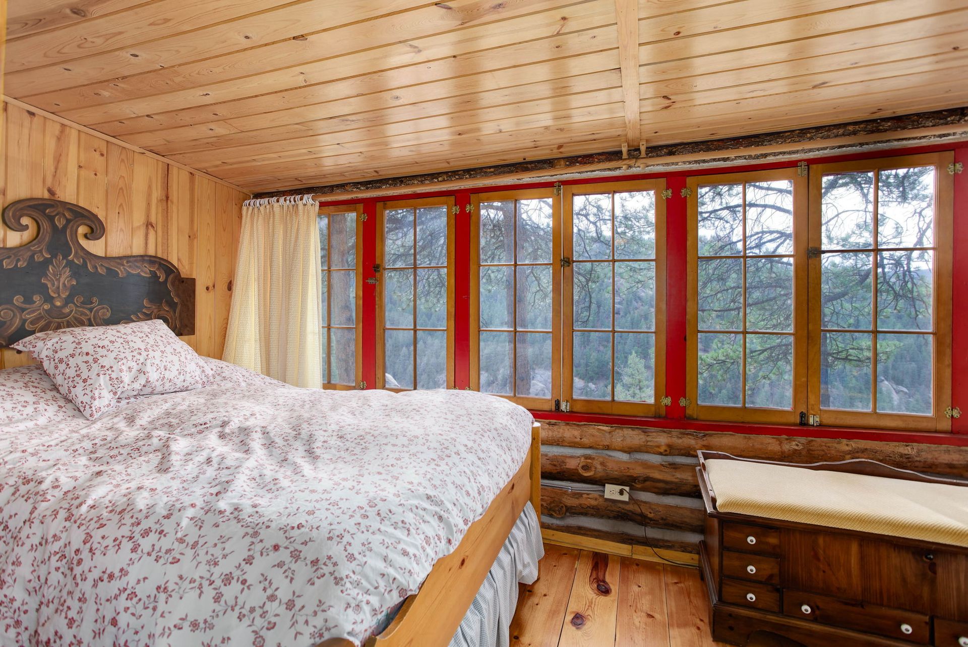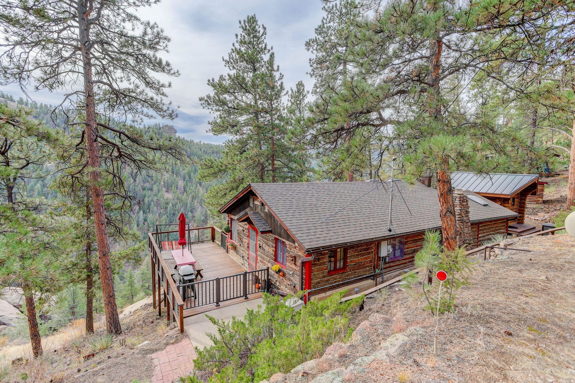 Escape to Your Mountain Sanctuary in Sphinx Park! Nestled among soaring pines-perched atop incredible rock formations, this enchanting log cabin is a true retreat that blends historic charm with modern comforts. This beautifully preserved home, lovingly named "Sonnenalp" meaning (sunny) and nalp (nap) offers a peaceful escape into nature—without sacrificing convenience. Head inside to discover warm, wood-lined walls, cozy carpeting, and a spacious sunroom that frames breathtaking mountain views—perfect for relaxing with your morning coffee. The open-concept living and dining areas flow seamlessly into a well-appointed kitchen, anchored by vaulted ceilings, skylights, and a large gas fireplace—ideal for chilly Colorado evenings. This home features 2 bedrooms and 1 bathroom, along with a newer-built log ADU offering a third bedroom, radiant floor heating, a skylight, and ample storage space beneath. The large lower level of the main home includes a laundry area and plenty of additional storage, ensuring functionality and ease of living. Exit outside to multiple spacious decks where you can watch wildlife, and listen to the soothing sounds of the nearby creek, where you can relax, recharge, refresh, renew, and restore. With two decks and starry skies overhead, this home is perfect for both solitude and entertaining. Whether you're enjoying live music in town at nearby Bucksnort Saloon, fishing in local streams, paddling nearby rivers, hiking and biking through vibrant Deckers, or a spontaneous dip at the Chutes on the South Platte River, adventure is always close by. Fully furnished and move-in ready, this home offers the best of rustic elegance, privacy, and peaceful living. Fully furnished and move-in ready, this charming European-inspired Swiss Chalet is a rare gem—offering rustic elegance, unparalleled location and true Colorado foothills living. Don’t miss your chance to own a piece of local history and create lasting memories in this one-of-a-kind mountain haven.
