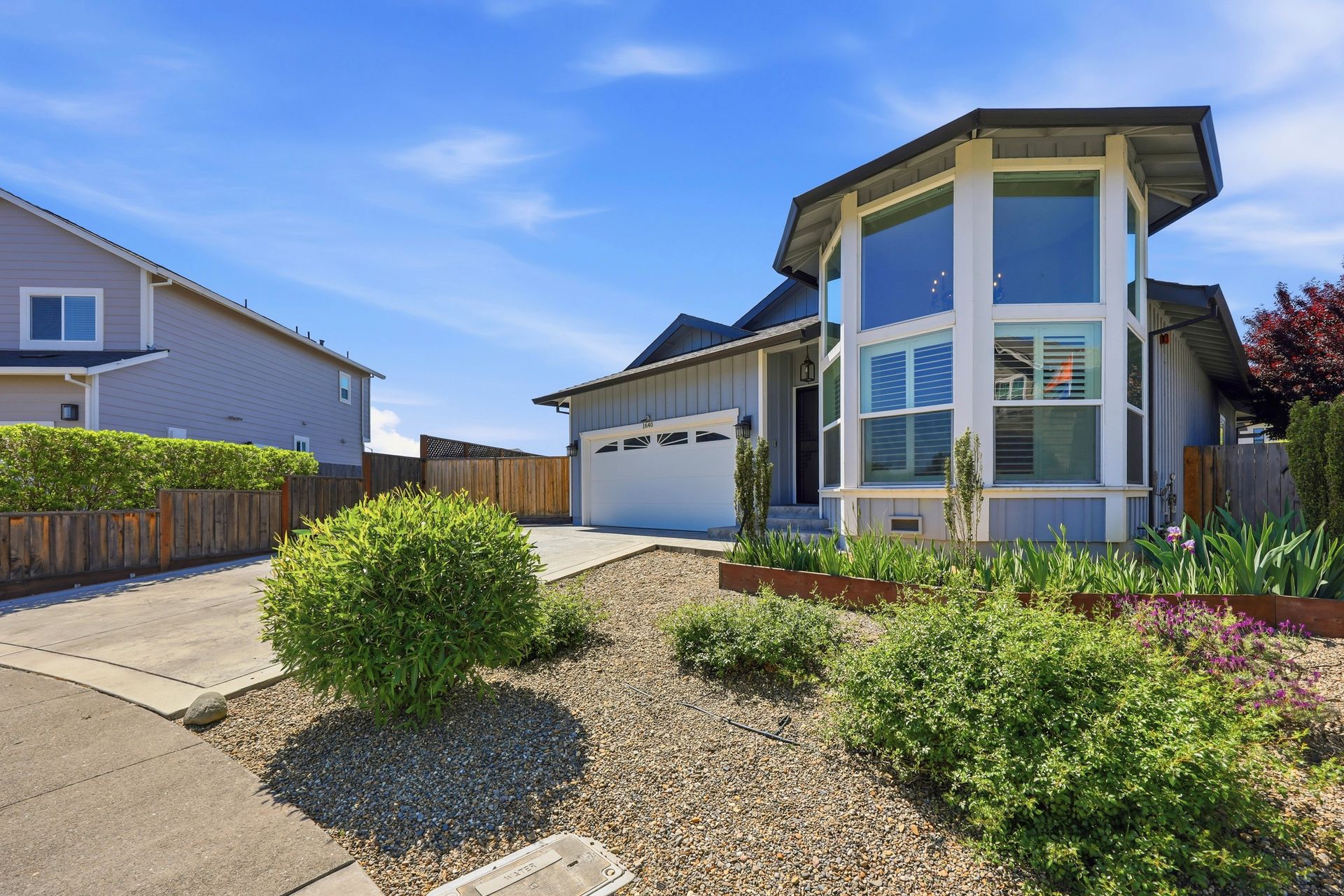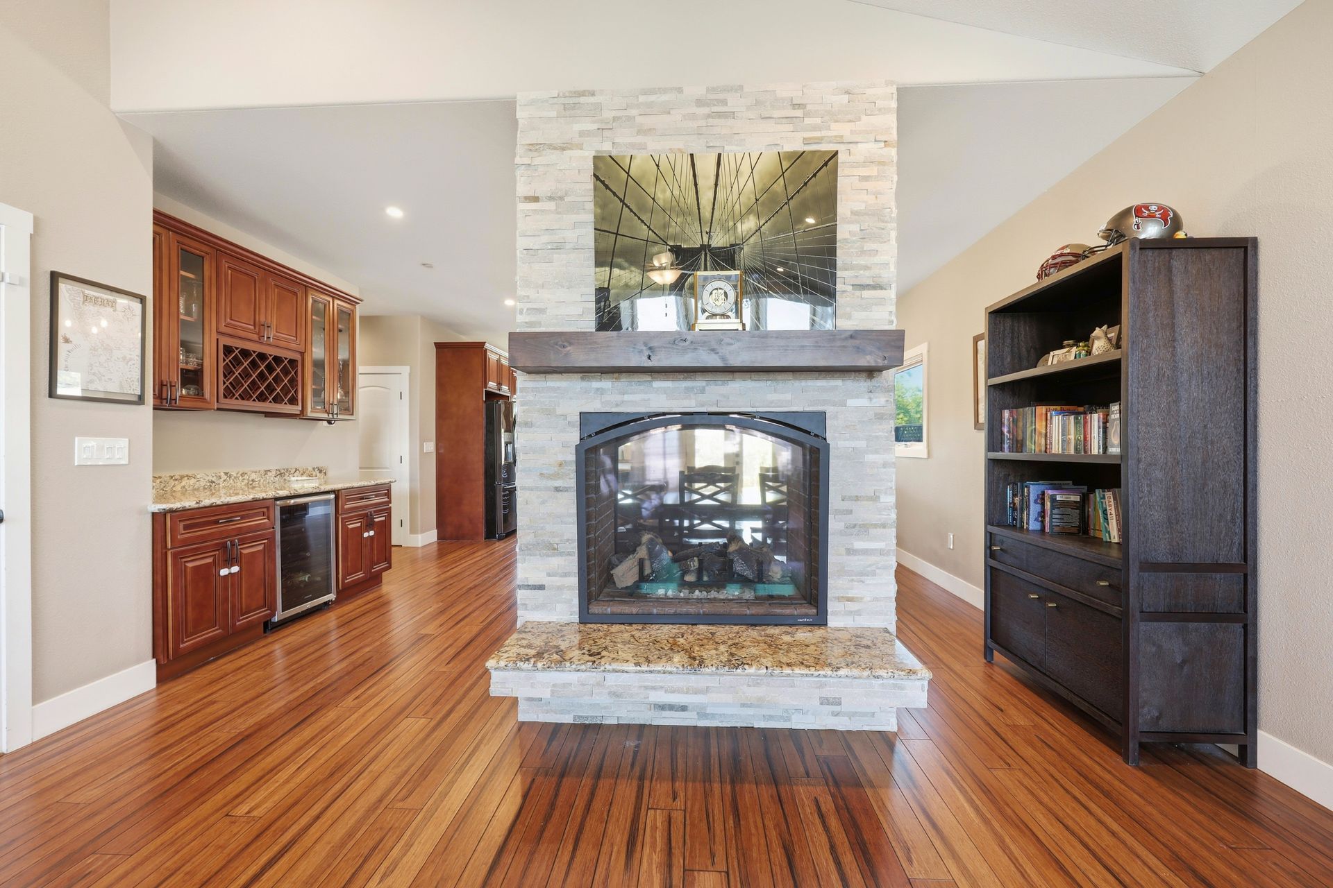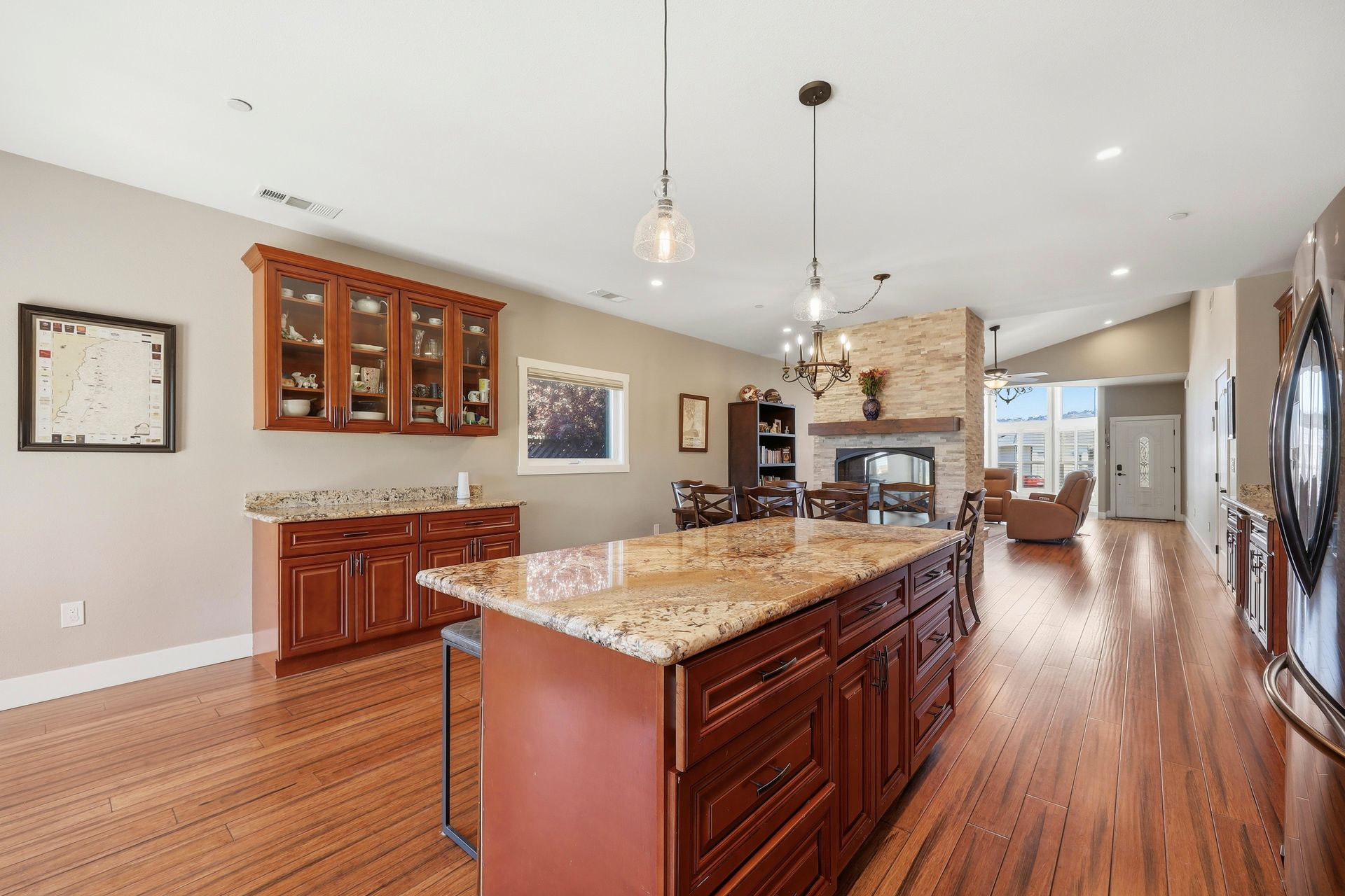 Discover a stunning custom-designed Coffey Park rebuild in the heart of Santa Rosa, offering newer construction, single-level living, and an exceptional end-of-cul-de-sac location. Just a block from a park, this three-bedroom, two-bathroom home blends comfort, efficiency, and style in one beautifully crafted package. Step inside to soaring vaulted ceilings, abundant natural light, and an inviting fireplace that anchors the open-concept living space. The gourmet kitchen is a showstopper—featuring a spacious island, granite countertops, stainless steel appliances, a wine bar, and generous storage designed for effortless entertaining.