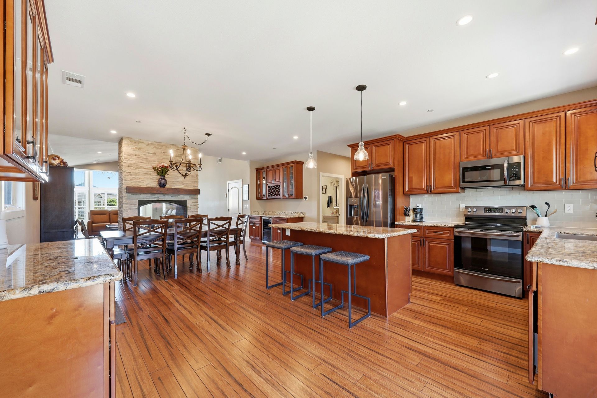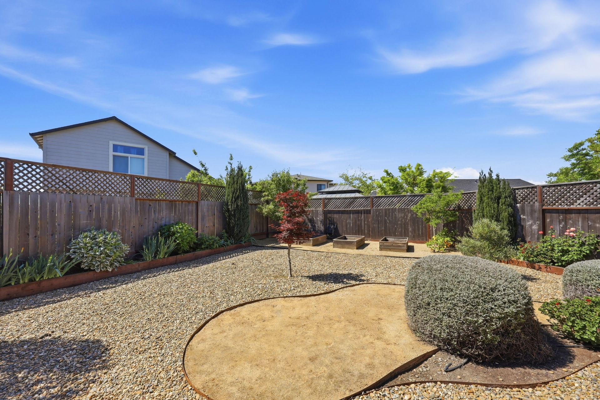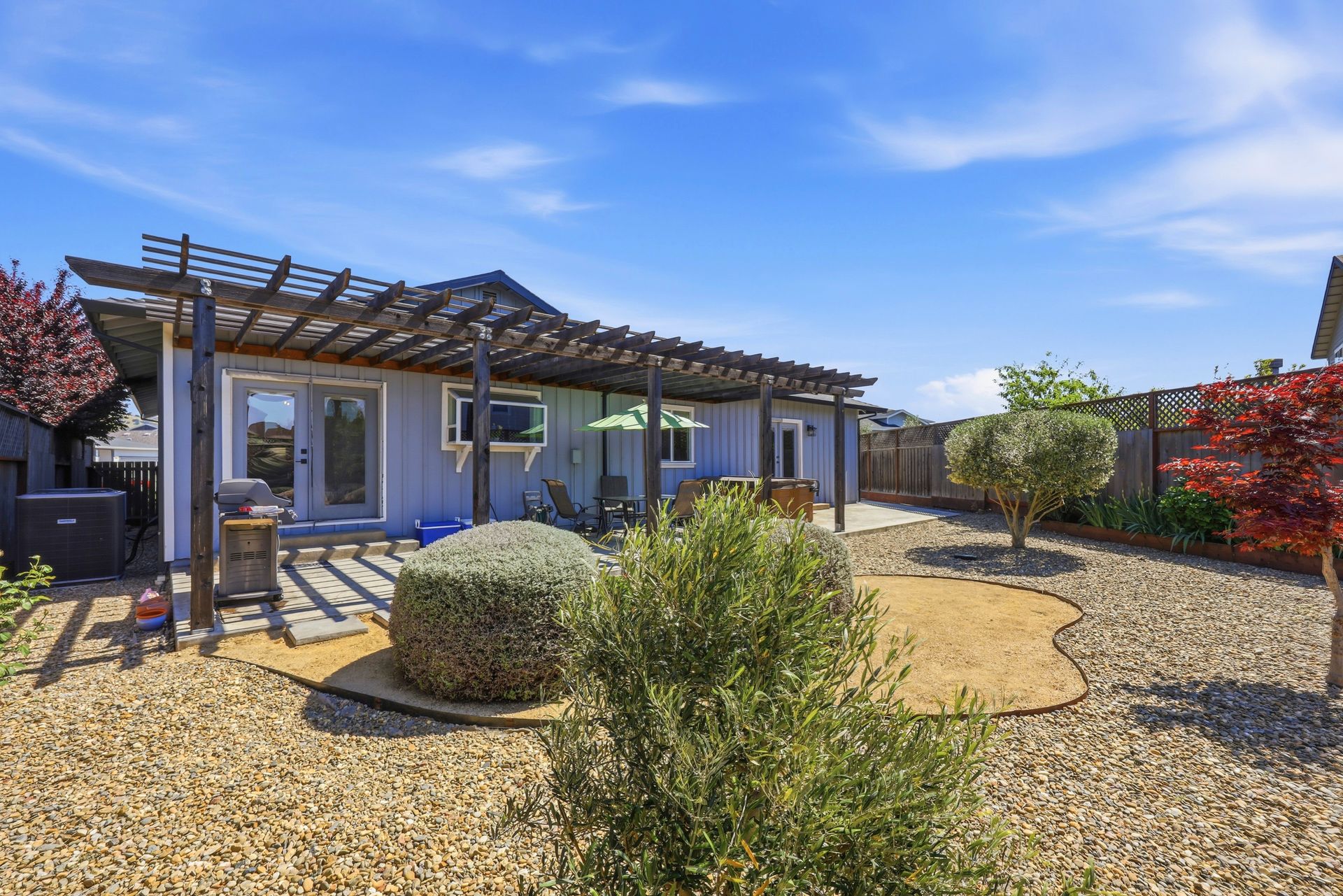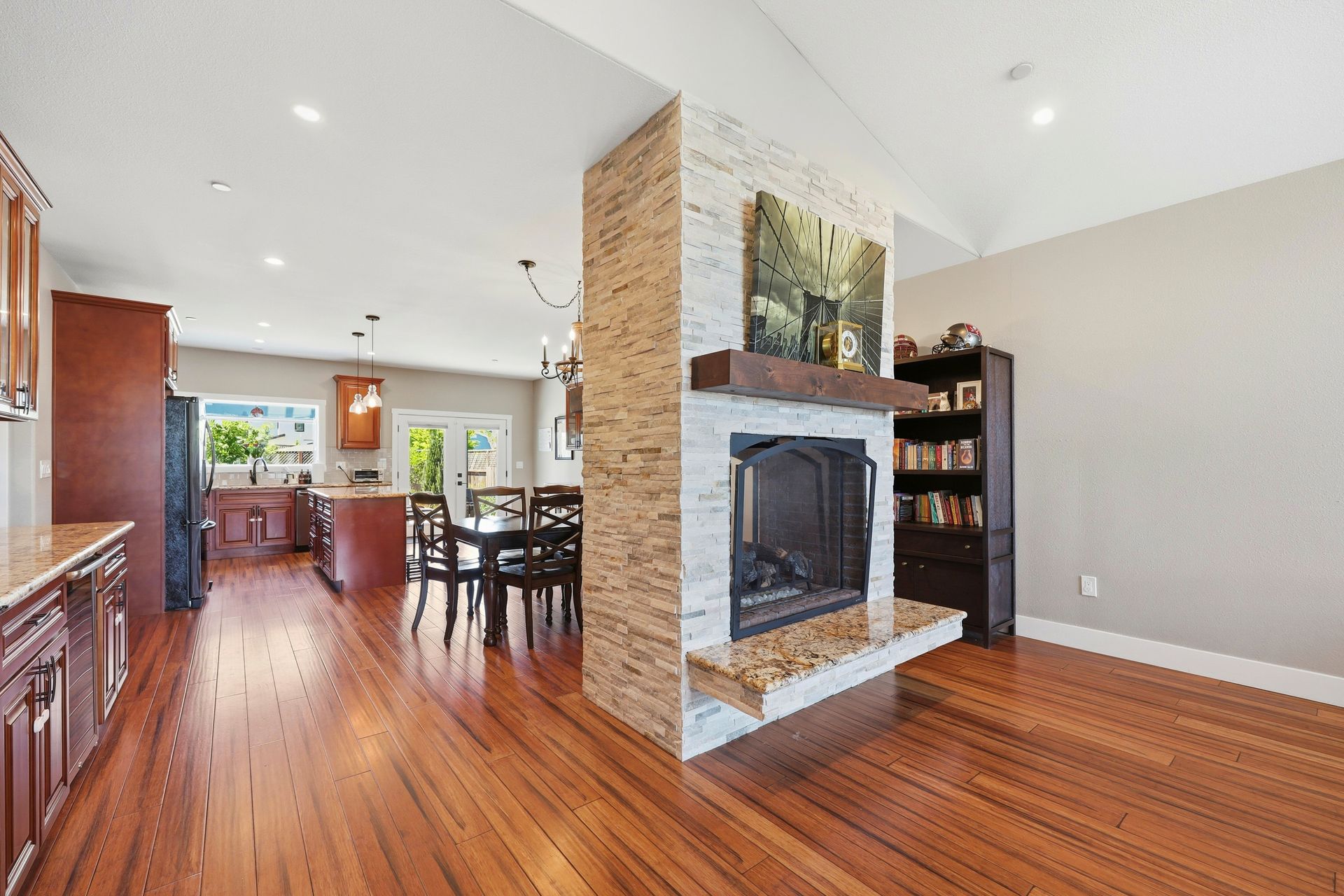 Discover a stunning custom-designed Coffey Park rebuild in the heart of Santa Rosa, offering newer construction, single-level living, and an exceptional end-of-cul-de-sac location. Just a block from a park, this three-bedroom, two-bathroom home blends comfort, efficiency, and style in one beautifully crafted package. Step inside to soaring vaulted ceilings, abundant natural light, and an inviting fireplace that anchors the open-concept living space. The gourmet kitchen is a showstopper—featuring a spacious island, granite countertops, stainless steel appliances, a wine bar, and generous storage designed for effortless entertaining.