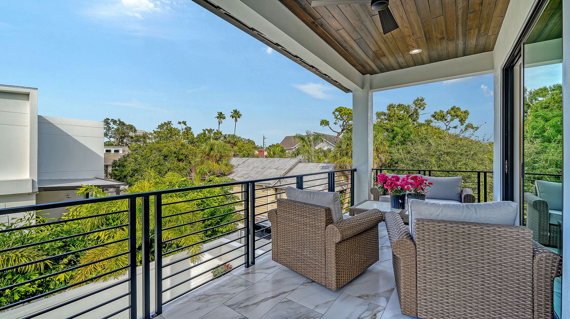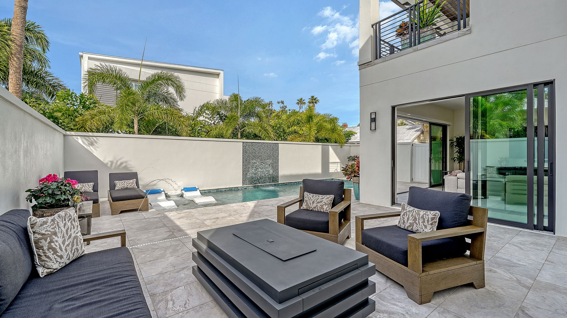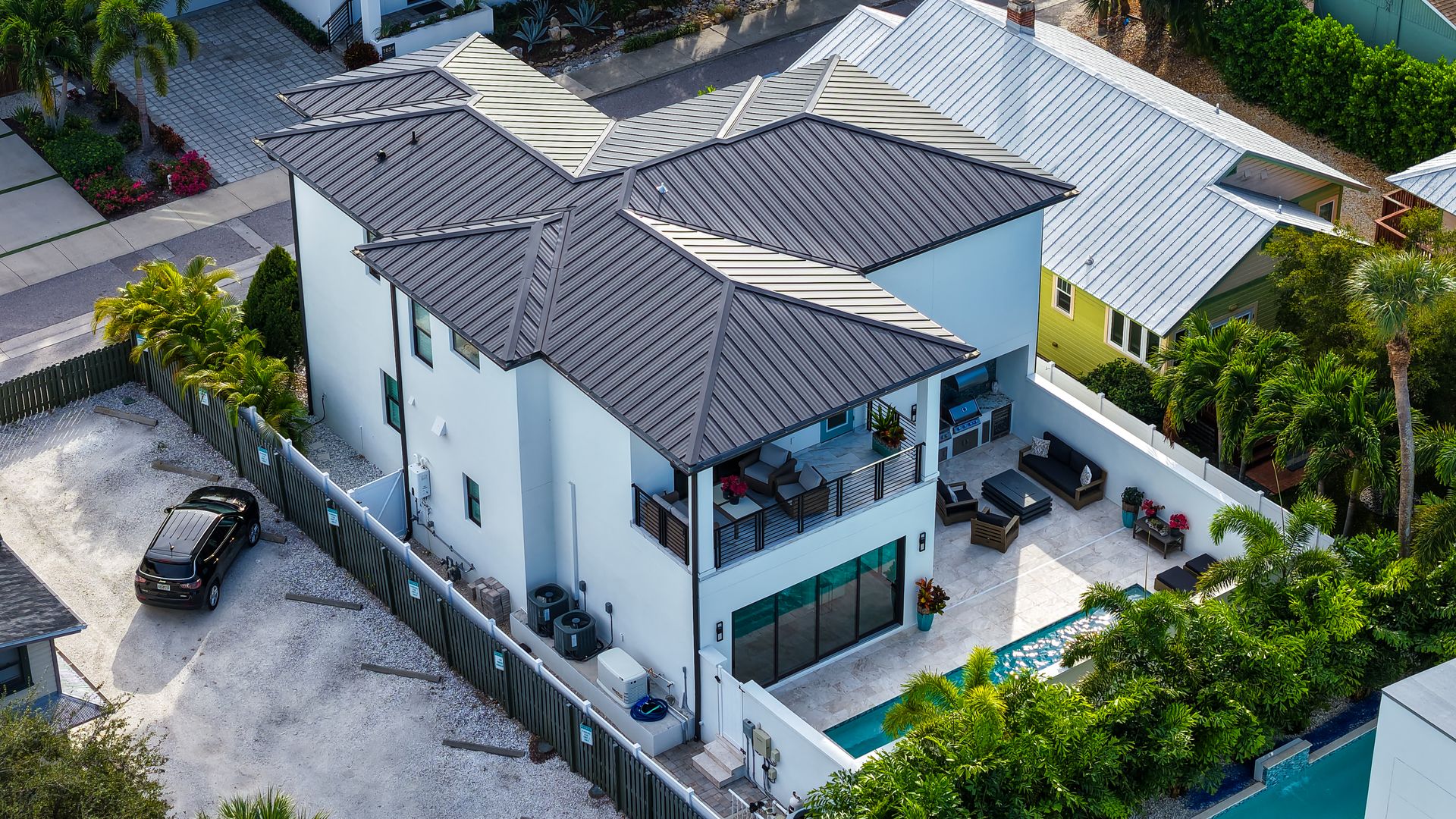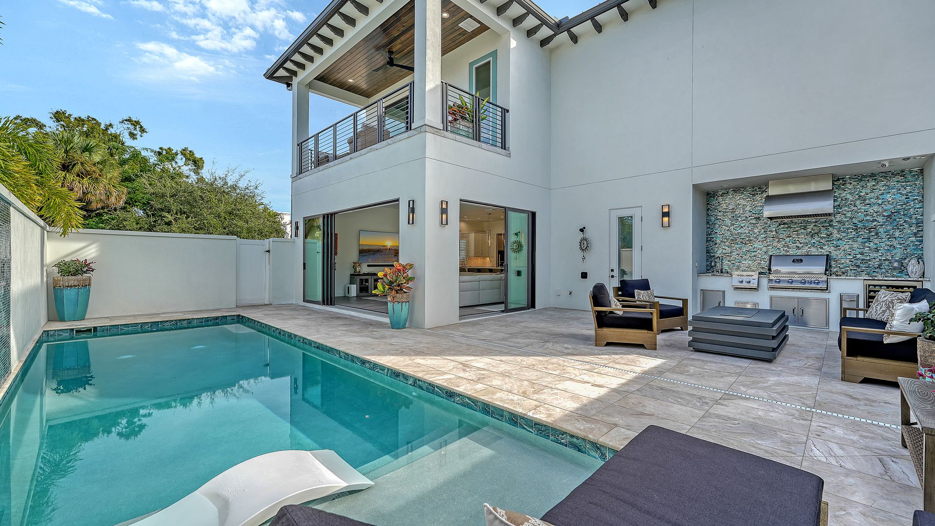 This beautifully designed residence completed in 2024 offers four bedrooms and three and one-half baths, blending elegance with functionality. The open-concept kitchen and living area showcase premium Thermador appliances, complemented by a walk-in pantry with built-in coffee maker and a large island. Step outside to your private oasis featuring heated saltwater pool and outdoor kitchen, all set within textured stucco walls. Enjoy added conveniences such as a backup generator, & RO water system. Constructed entirely of block with cat 5 hurricane windows, stucco exterior and durable metal roof, quartz countertops throughout and a two-car garage with epoxy floor. The outdoor spaces are equally impressive, with a marble pool deck and two balconies—one front and one rear. Additional amenities include a one-half bath off the pool deck. The primary suite offers an ensuite bath and a walk-in closet. The two upstairs bedrooms are separated by a dual bath with a walk-in shower with bench seat. The first floor bedroom can be used as an office with an attached full bath. All of this located in the heart of downtown Sarasota within close distance to shops, restaurants and Bayfront Park/Marina.