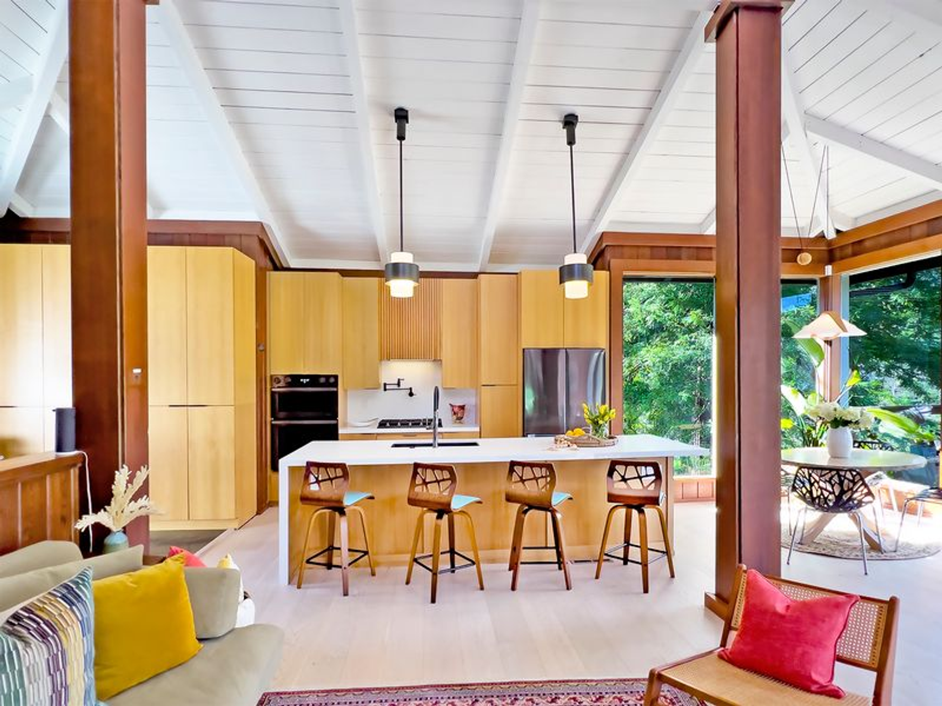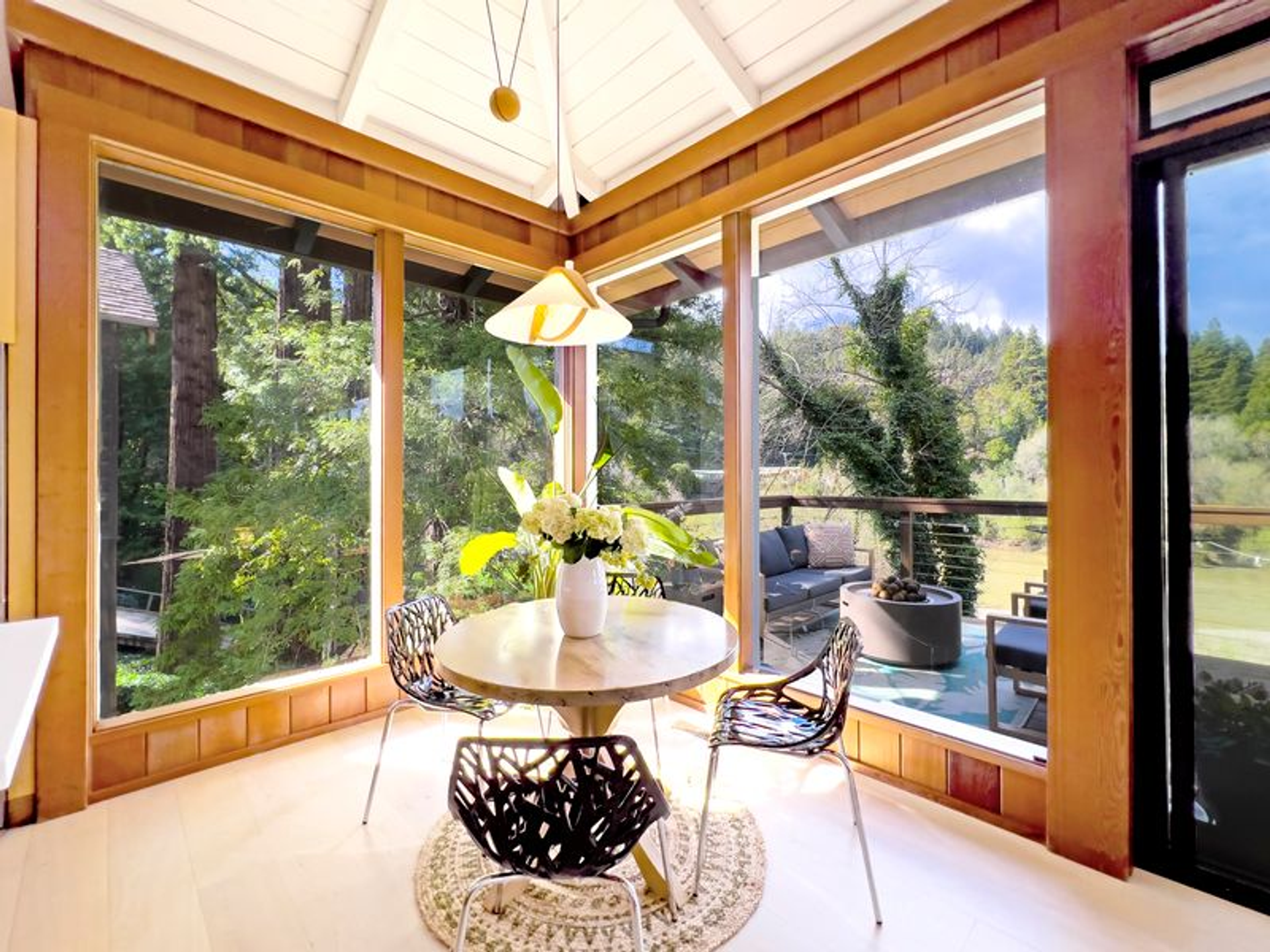 Simple Elegance. Purposely Designed. This tri-level, mid-century home with stunning panoramic water views has been renewed and refinished on every level. Personal living spaces include full baths and sleeping rooms on each floor along with a wet bar, spirits refrigerator and wine cellar below. Kitchen and Living Room face the river with a wall of tall, wide windows and unspoiled vistas. Sweeping, manicured backyard offers easy dock and water access, as well as Duck, Osprey and Otter watching. Backyard pomegranate, maple and avocado trees. With picturesque downtown Guerneville so close, you'll never want to leave.