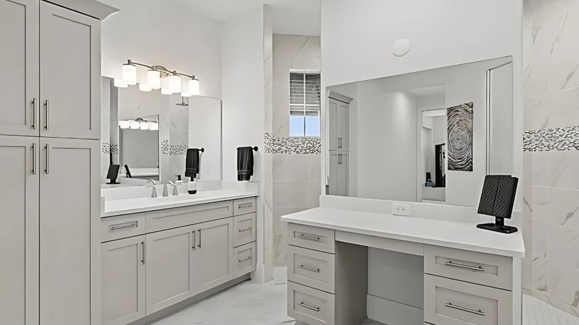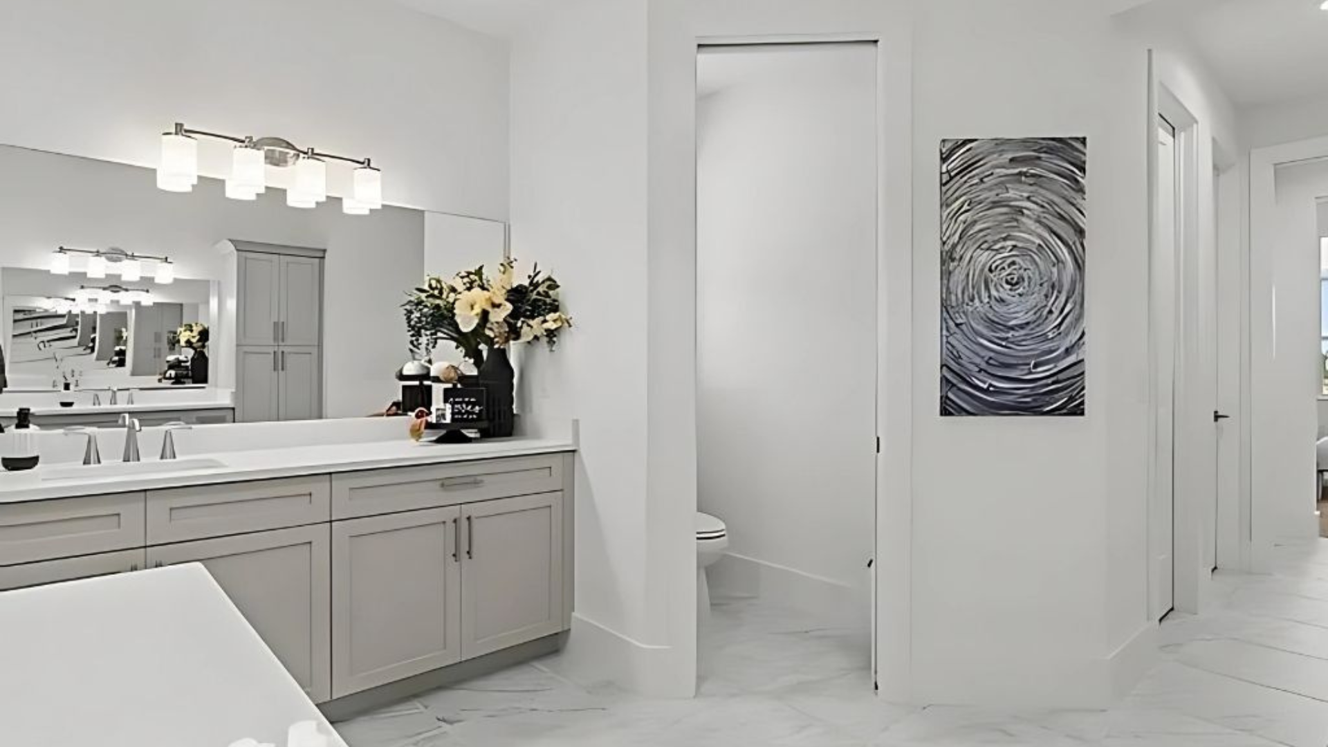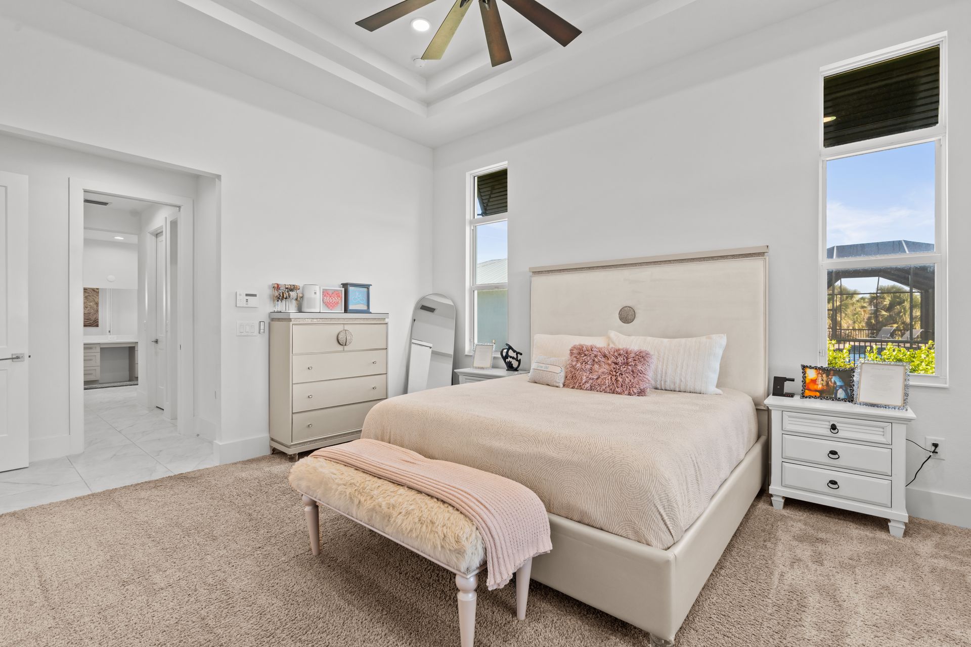 The primary bedroom features ample natural light and hardwood flooring. The en-suite bathroom includes a double vanity and a walk-in shower. The two additional bedrooms are well-proportioned and have generous closet space. The shared bathroom has a tub/shower combination.