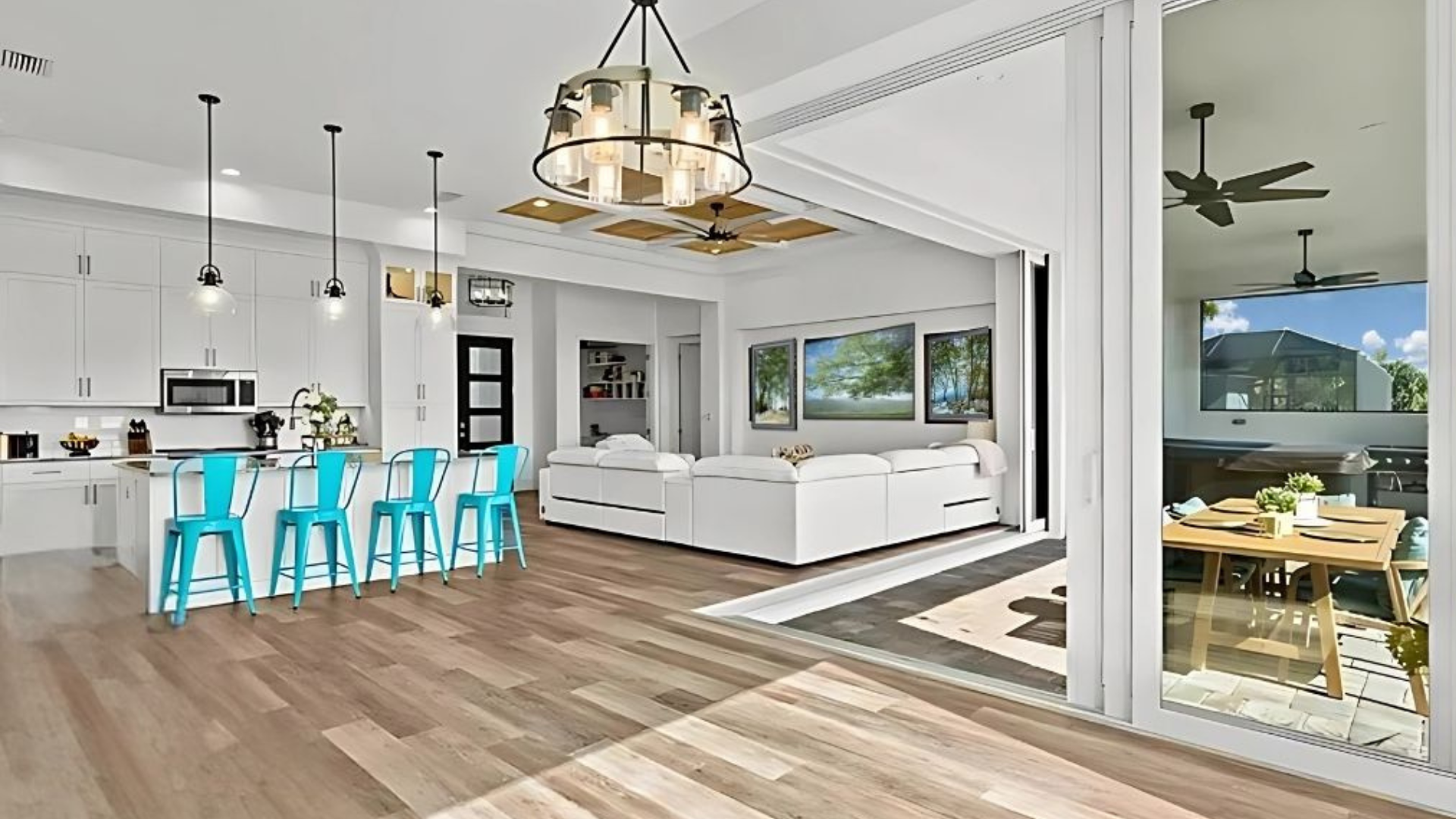The open-concept living and dining area allows for flexible furniture arrangement and seamless flow. Large windows throughout the main level create a bright and airy atmosphere. The kitchen is equipped with stainless steel appliances and ample counter space for meal preparation.