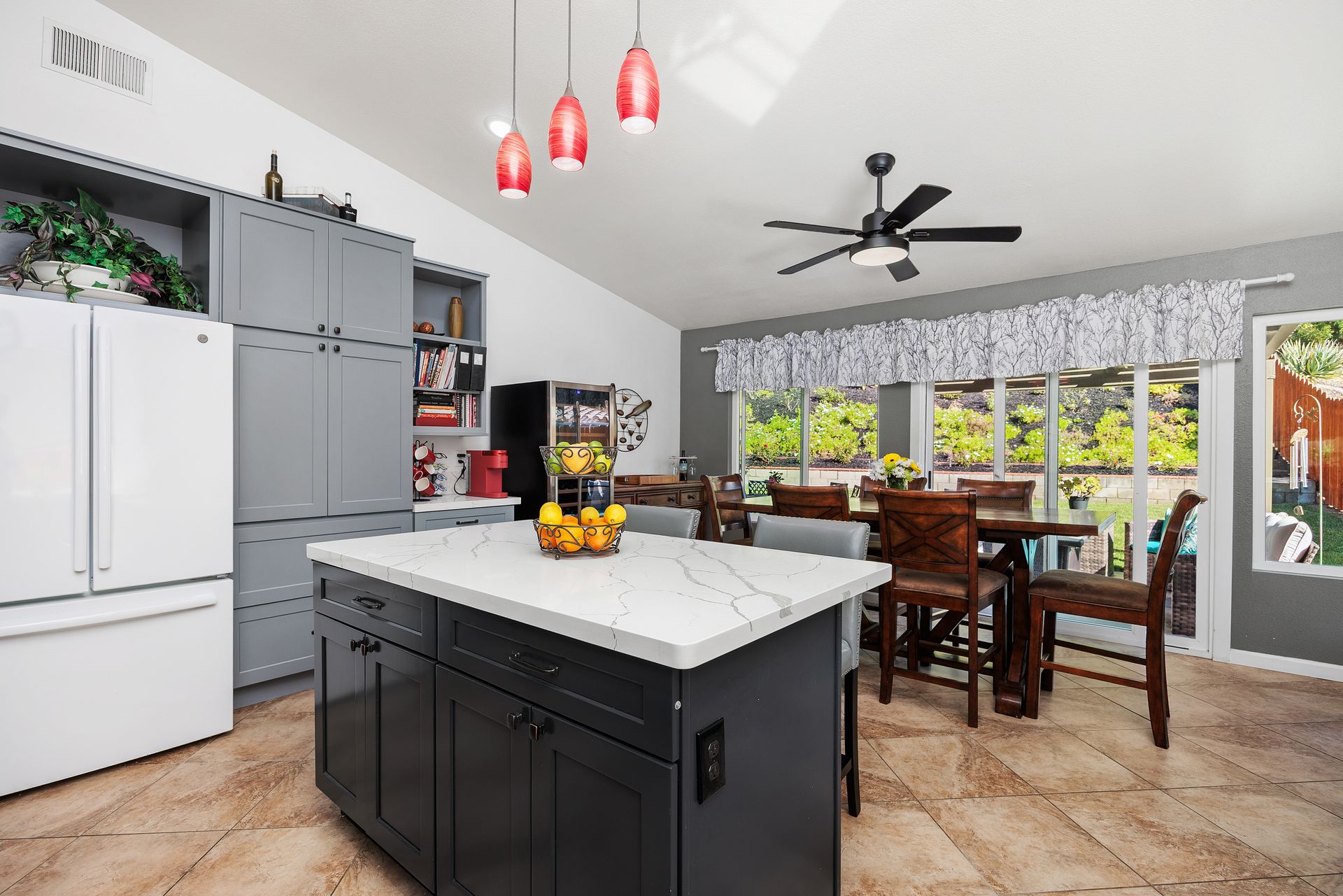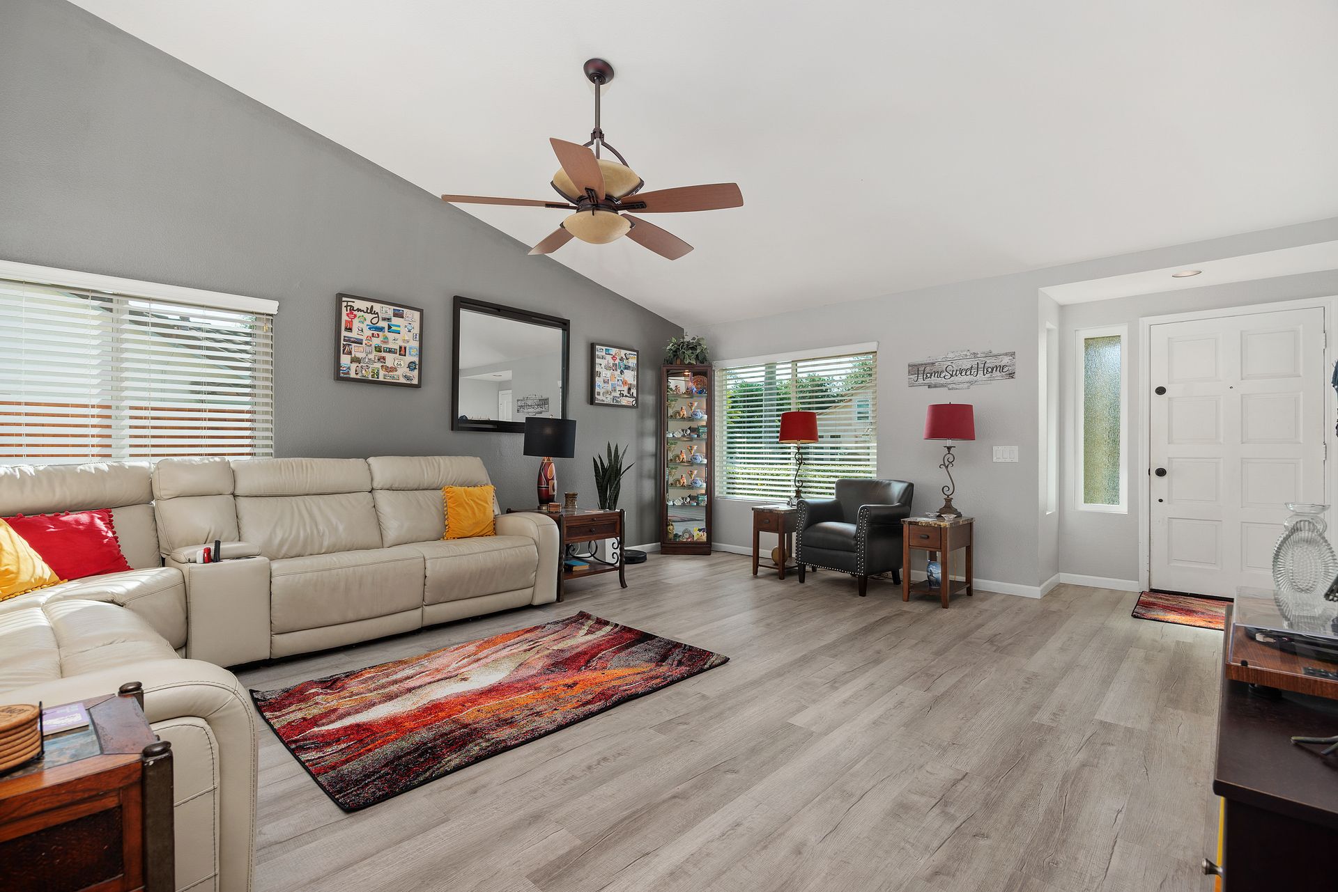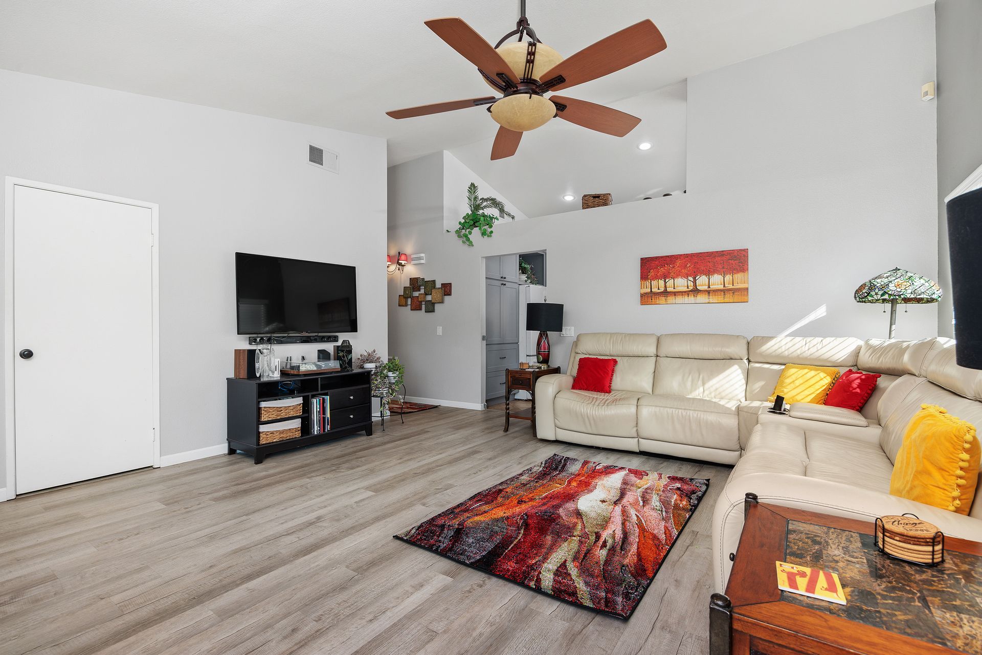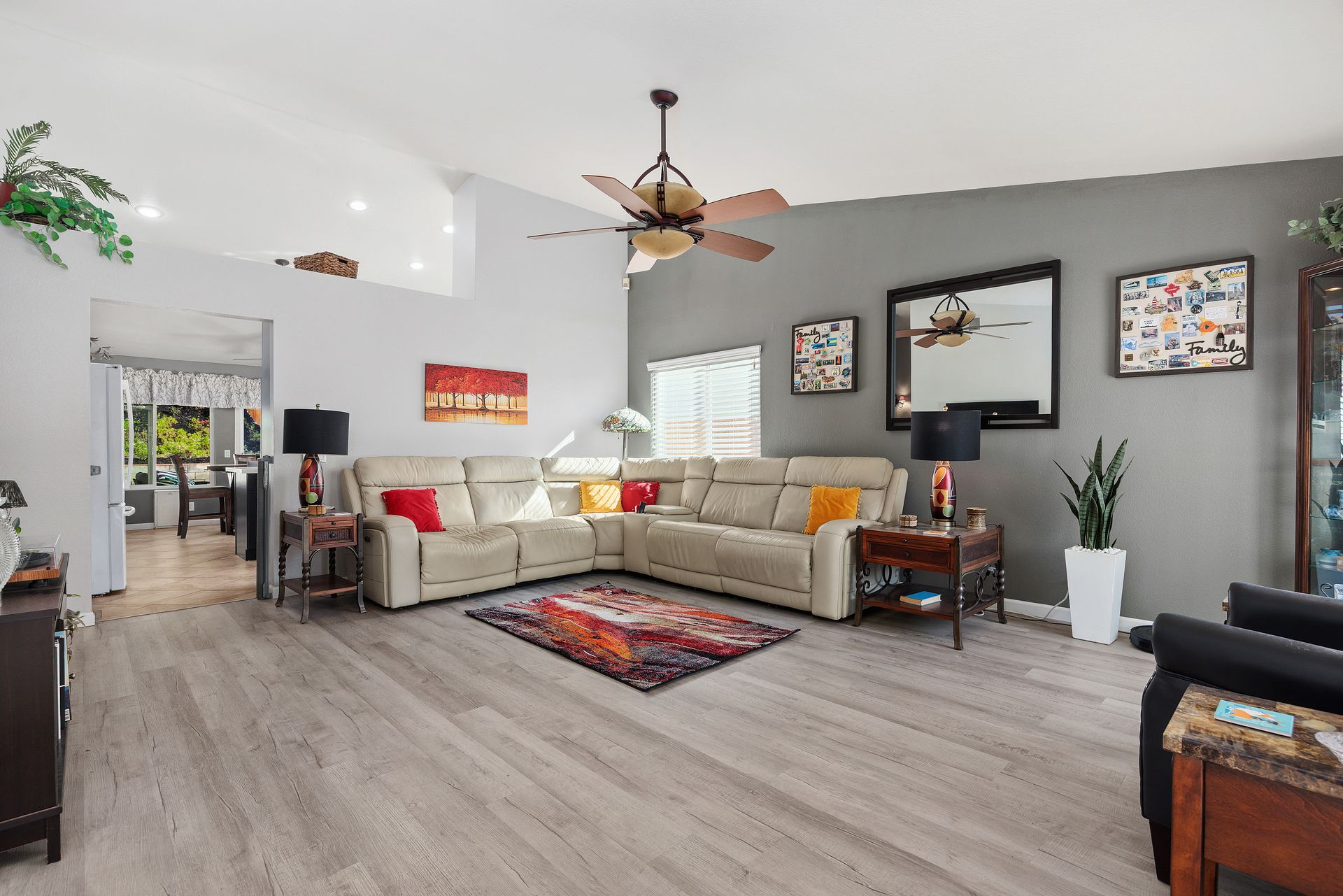 This home has been meticulously upgraded throughout with designer choices and finishes, including kitchen & bath remodels. The living room and dining areas are generously sized, featuring 18-foot vaulted ceilings that create an open and airy atmosphere. Warm paint colors enhance the inviting feel of these spaces, while large windows flood the rooms with natural light, making the home bright and welcoming. The family room (being used as a dining area) also boasts a vaulted ceiling and is anchored by a welcoming fireplace adorned with tile, providing both style and warmth. This space seamlessly connects to the kitchen making it ideal for relaxation and gatherings. The spacious, remodeled kitchen is both stylish and highly functional, offering plenty of space for preparing meals and hosting gatherings. Thoughtfully designed, it features an abundance of custom cabinetry with pull outs and soft close features, a double oven, recessed lighting, under cabinet lighting, a large quartz island with pendant lighting and generous counter space to accommodate all your culinary needs and entertaining aspirations. The primary retreat offers exceptional privacy, thoughtfully positioned away from the secondary bedrooms to ensure a peaceful and quiet environment. A large sliding glass door provides direct access to the tranquil and inviting backyard, seamlessly blending indoor comfort with outdoor serenity. This backyard is notably larger than most in the area, offering plenty of room for entertainment, relaxation, or the potential addition of a pool or expanding the home, if desired. The two-car garage offers a generous amount of storage space, providing plenty of room to keep belongings organized, store seasonal items, or accommodate recreational equipment.