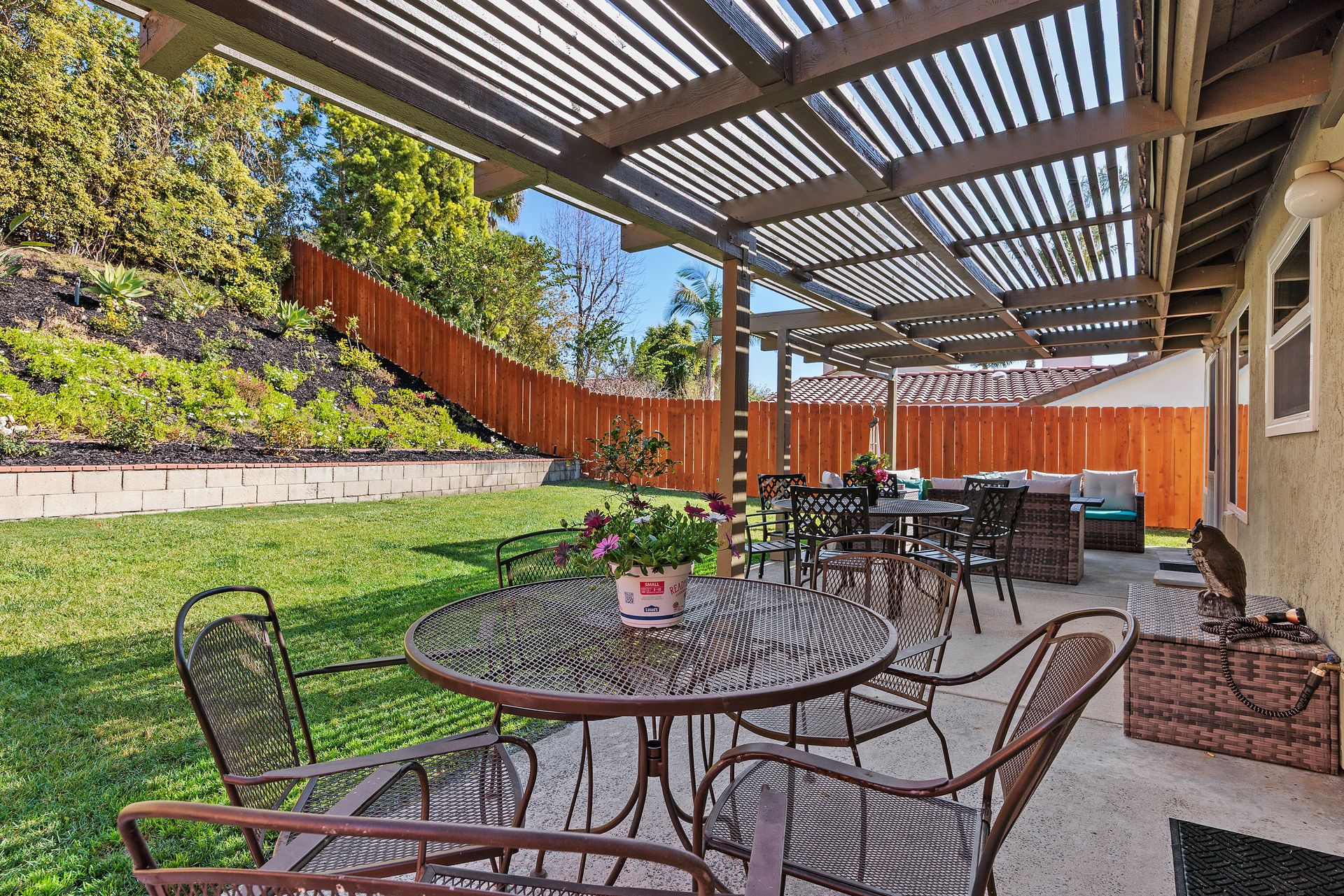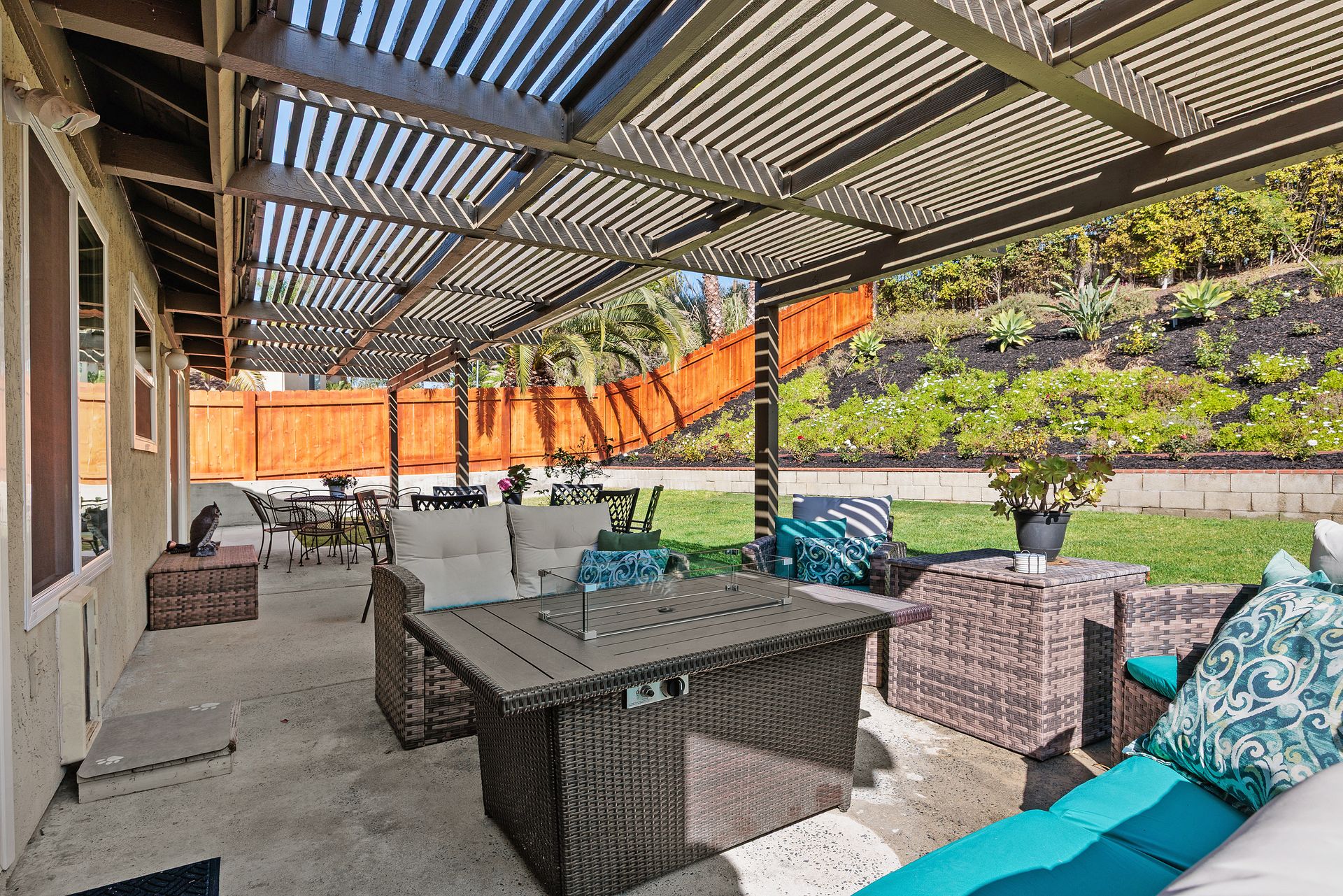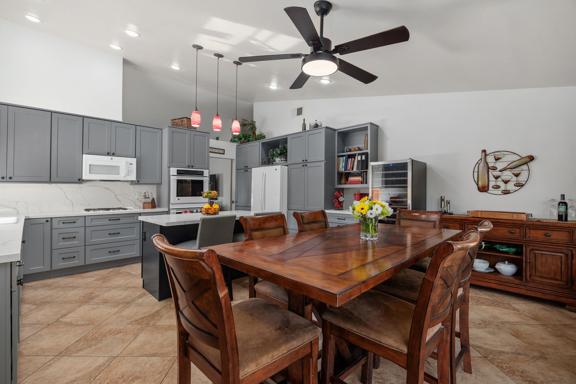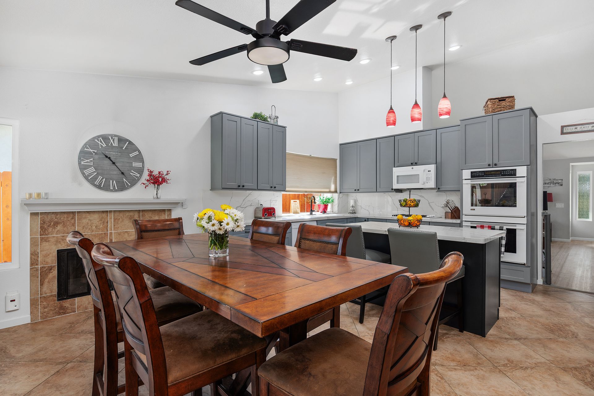 This home has been meticulously upgraded throughout with designer choices and finishes, including kitchen & bath remodels. The living room and dining areas are generously sized, featuring 18-foot vaulted ceilings that create an open and airy atmosphere. Warm paint colors enhance the inviting feel of these spaces, while large windows flood the rooms with natural light, making the home bright and welcoming. The family room (being used as a dining area) also boasts a vaulted ceiling and is anchored by a welcoming fireplace adorned with tile, providing both style and warmth. This space seamlessly connects to the kitchen making it ideal for relaxation and gatherings. The spacious, remodeled kitchen is both stylish and highly functional, offering plenty of space for preparing meals and hosting gatherings. Thoughtfully designed, it features an abundance of custom cabinetry with pull outs and soft close features, a double oven, recessed lighting, under cabinet lighting, a large quartz island with pendant lighting and generous counter space to accommodate all your culinary needs and entertaining aspirations. The primary retreat offers exceptional privacy, thoughtfully positioned away from the secondary bedrooms to ensure a peaceful and quiet environment. A large sliding glass door provides direct access to the tranquil and inviting backyard, seamlessly blending indoor comfort with outdoor serenity. This backyard is notably larger than most in the area, offering plenty of room for entertainment, relaxation, or the potential addition of a pool or expanding the home, if desired. The two-car garage offers a generous amount of storage space, providing plenty of room to keep belongings organized, store seasonal items, or accommodate recreational equipment.