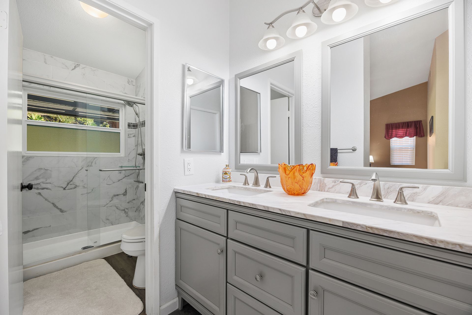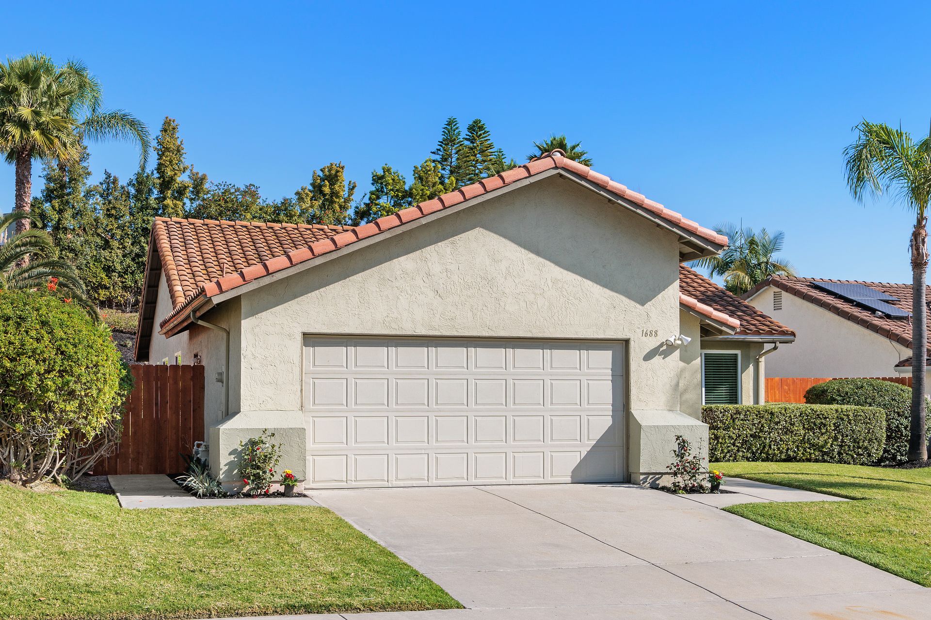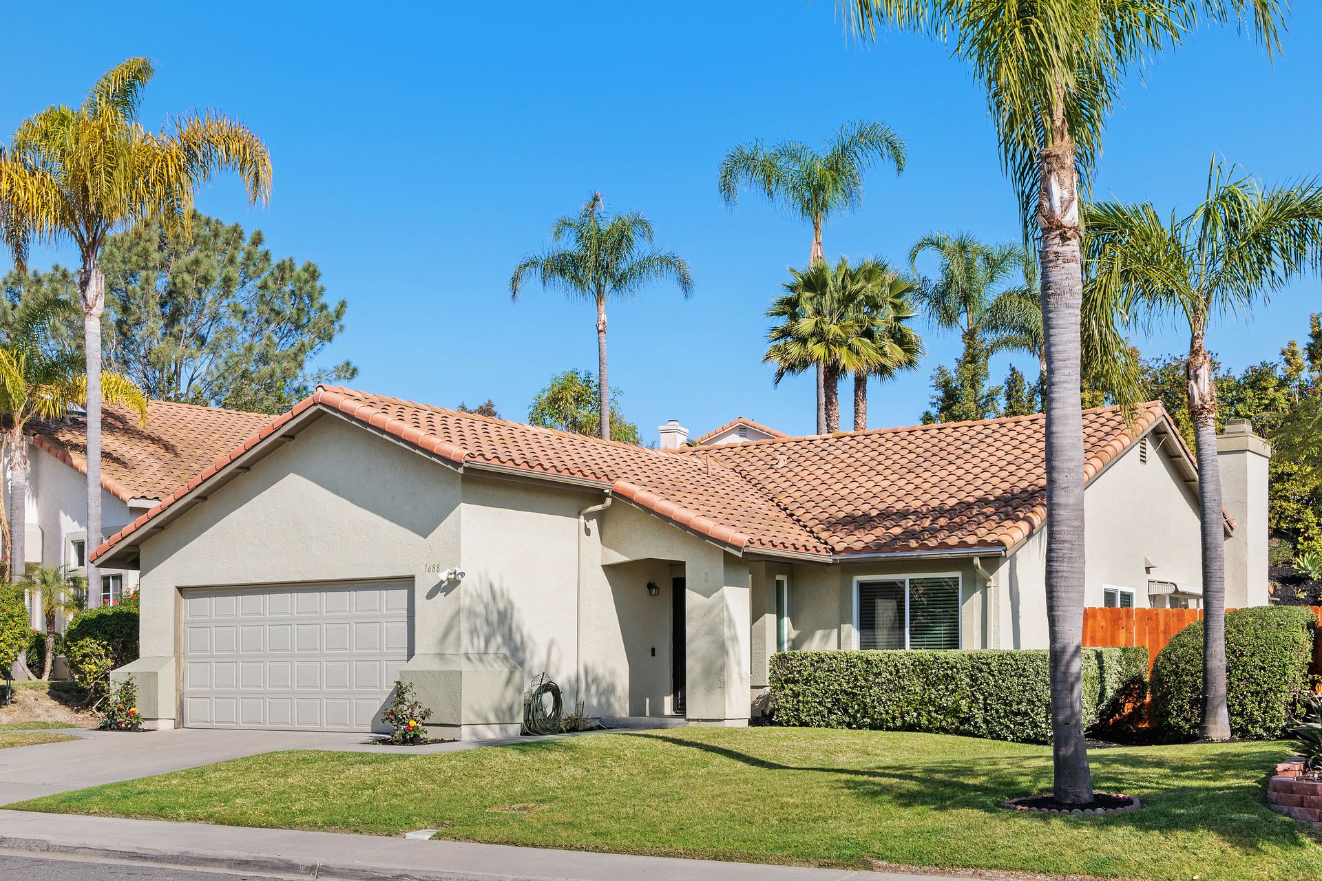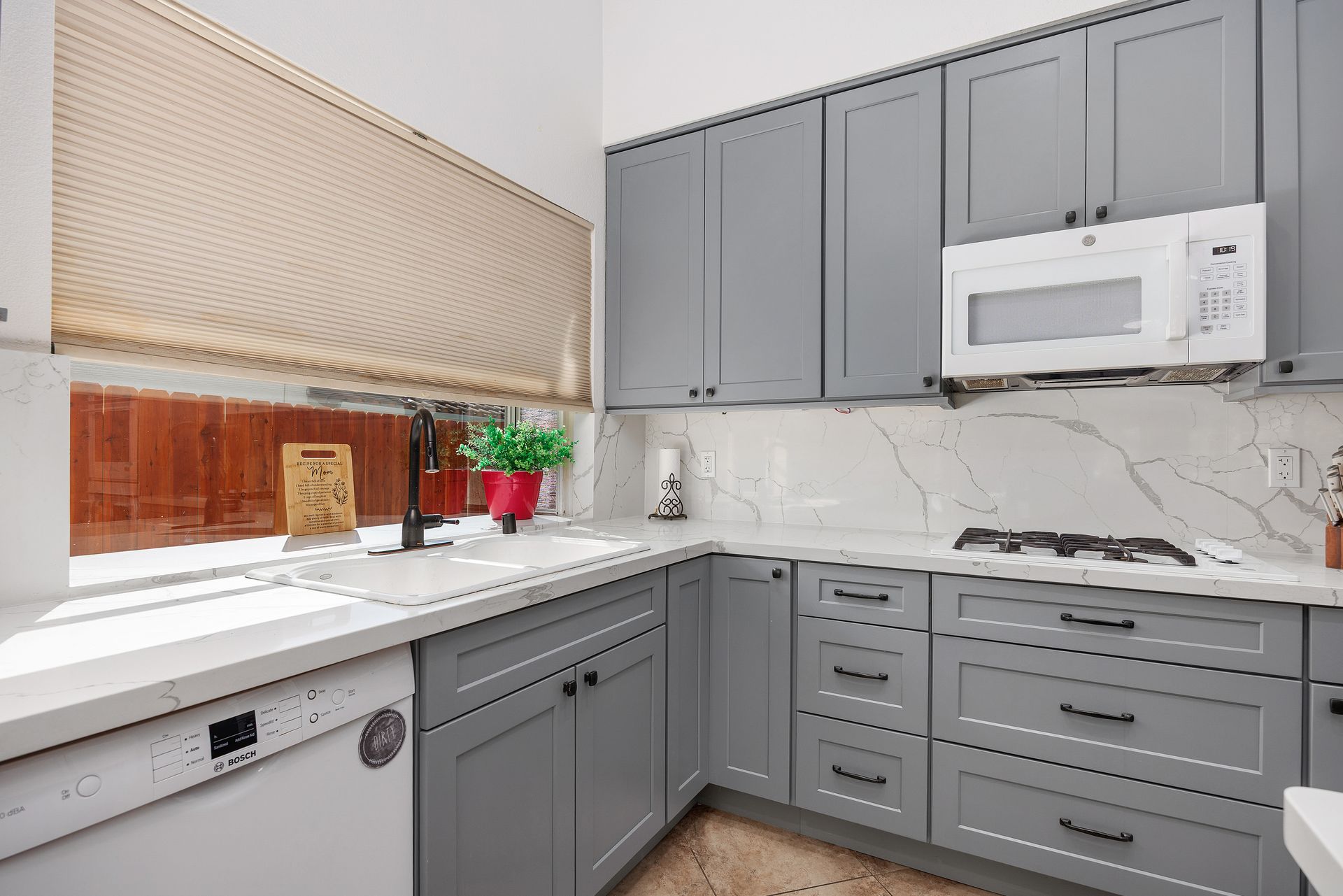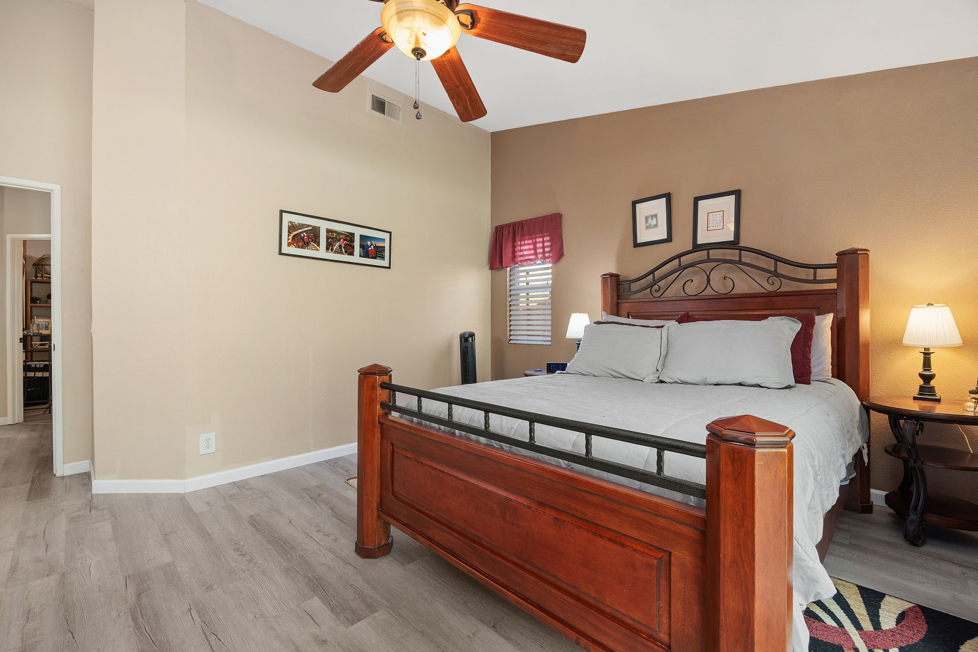 This home has been meticulously upgraded throughout with designer choices and finishes, including kitchen & bath remodels. The living room and dining areas are generously sized, featuring 18-foot vaulted ceilings that create an open and airy atmosphere. Warm paint colors enhance the inviting feel of these spaces, while large windows flood the rooms with natural light, making the home bright and welcoming. The family room (being used as a dining area) also boasts a vaulted ceiling and is anchored by a welcoming fireplace adorned with tile, providing both style and warmth. This space seamlessly connects to the kitchen making it ideal for relaxation and gatherings. The spacious, remodeled kitchen is both stylish and highly functional, offering plenty of space for preparing meals and hosting gatherings. Thoughtfully designed, it features an abundance of custom cabinetry with pull outs and soft close features, a double oven, recessed lighting, under cabinet lighting, a large quartz island with pendant lighting and generous counter space to accommodate all your culinary needs and entertaining aspirations. The primary retreat offers exceptional privacy, thoughtfully positioned away from the secondary bedrooms to ensure a peaceful and quiet environment. A large sliding glass door provides direct access to the tranquil and inviting backyard, seamlessly blending indoor comfort with outdoor serenity. This backyard is notably larger than most in the area, offering plenty of room for entertainment, relaxation, or the potential addition of a pool or expanding the home, if desired. The two-car garage offers a generous amount of storage space, providing plenty of room to keep belongings organized, store seasonal items, or accommodate recreational equipment.