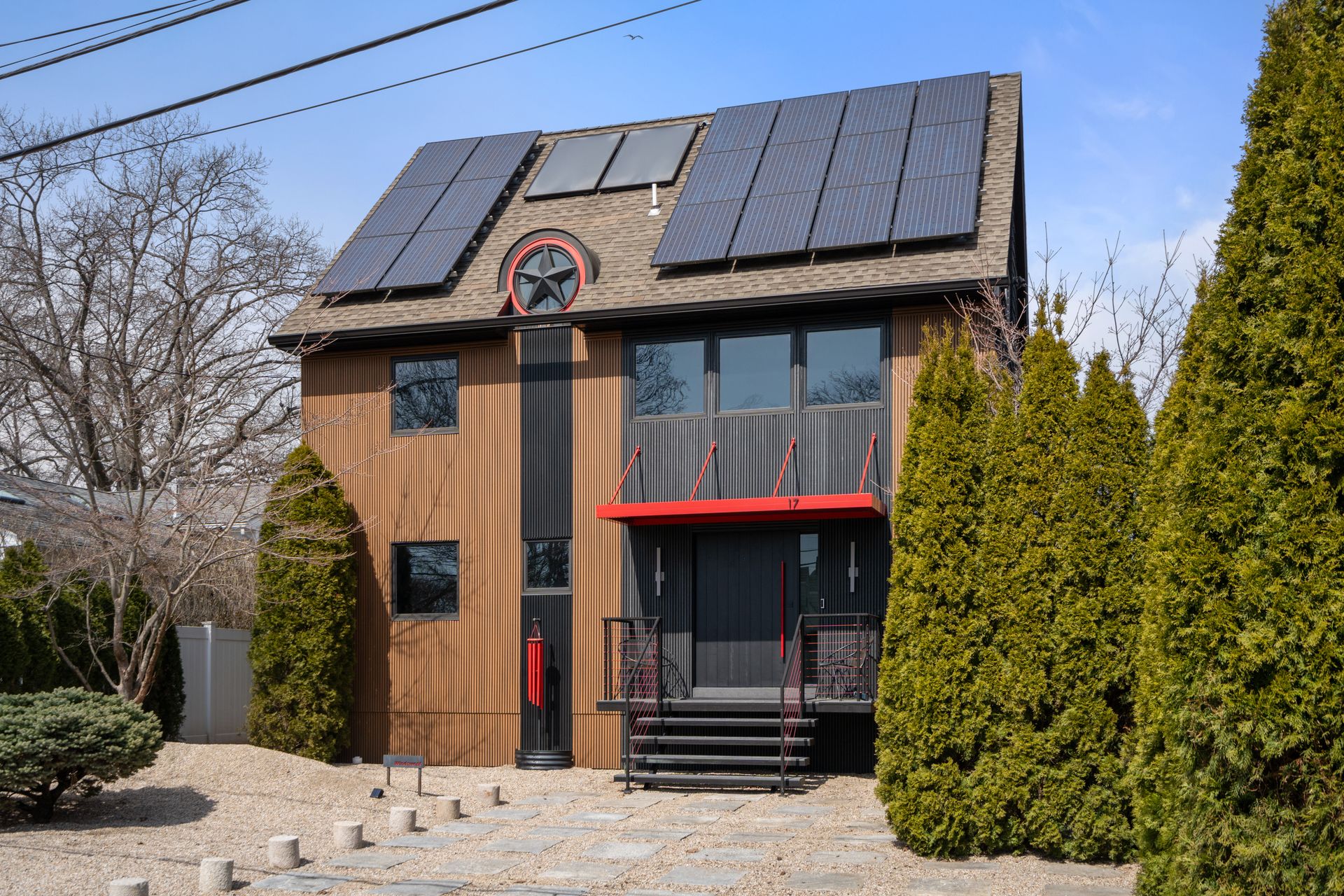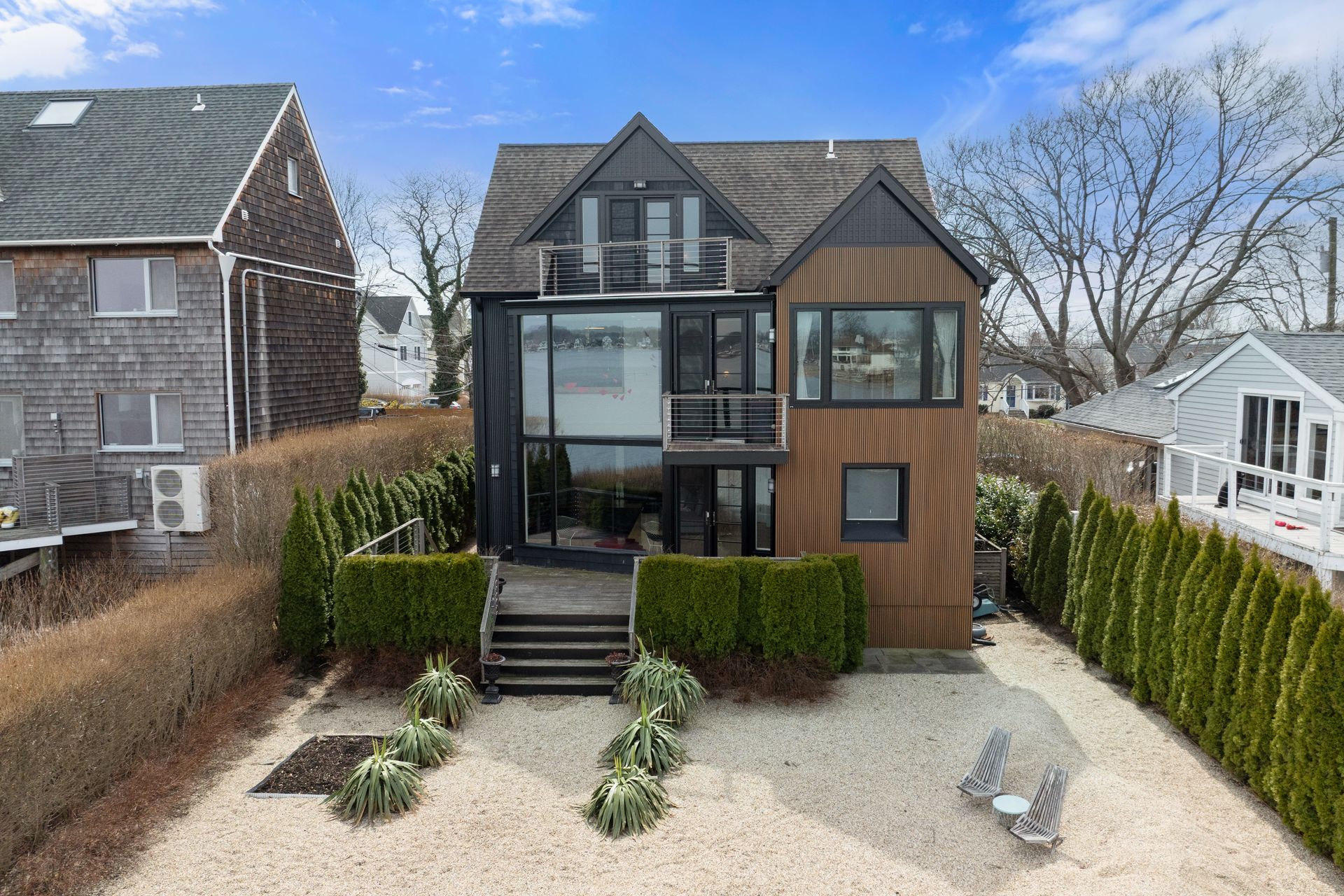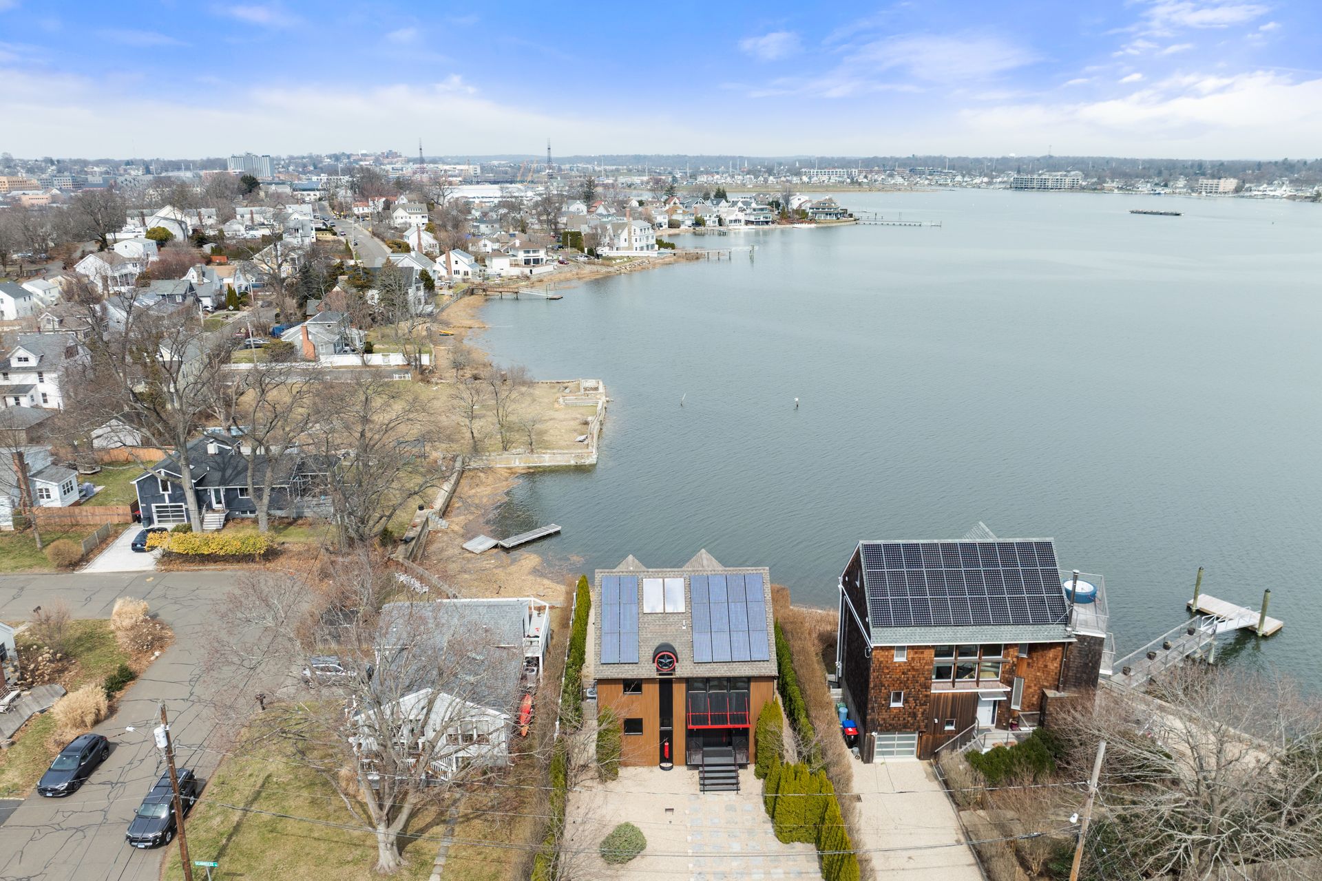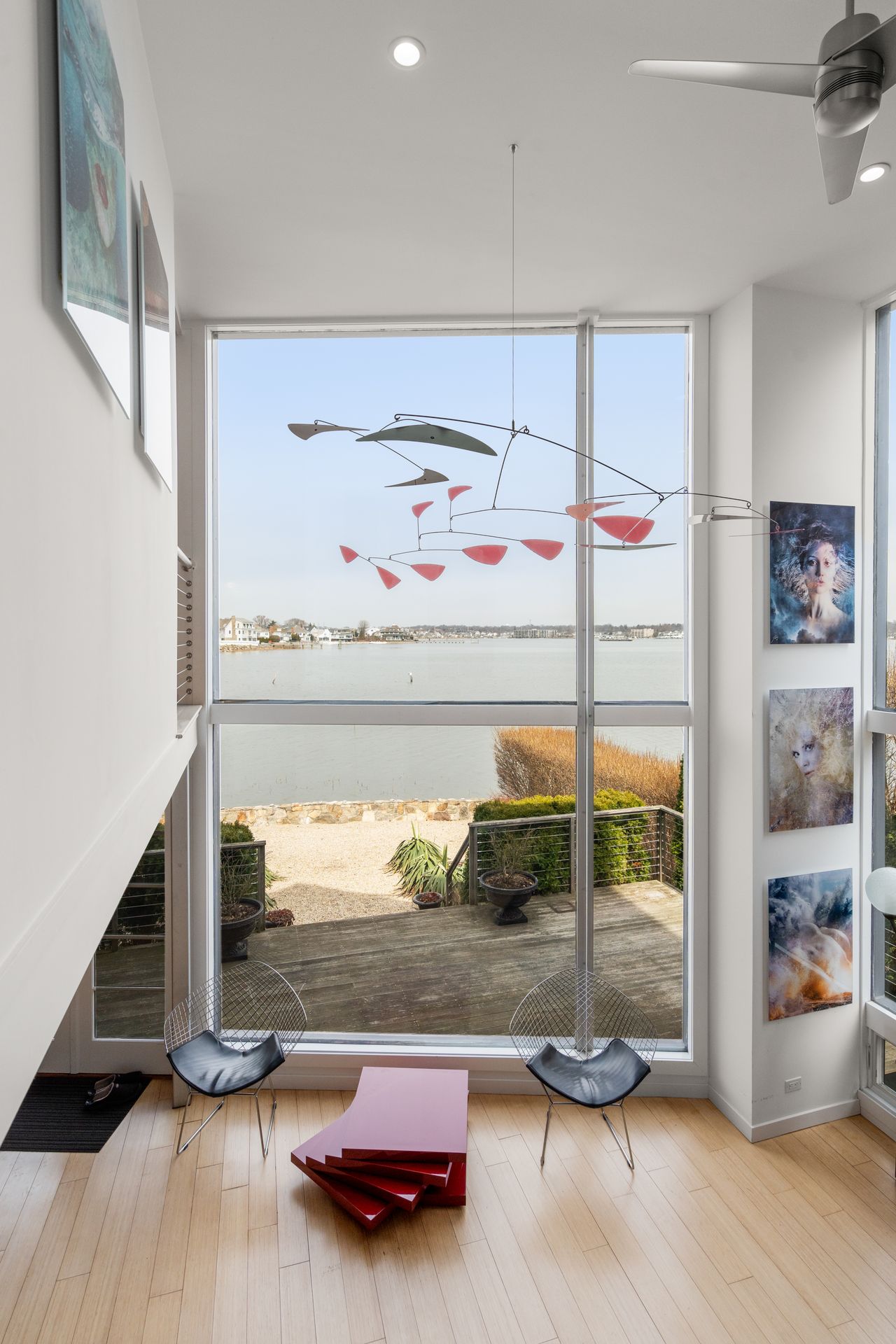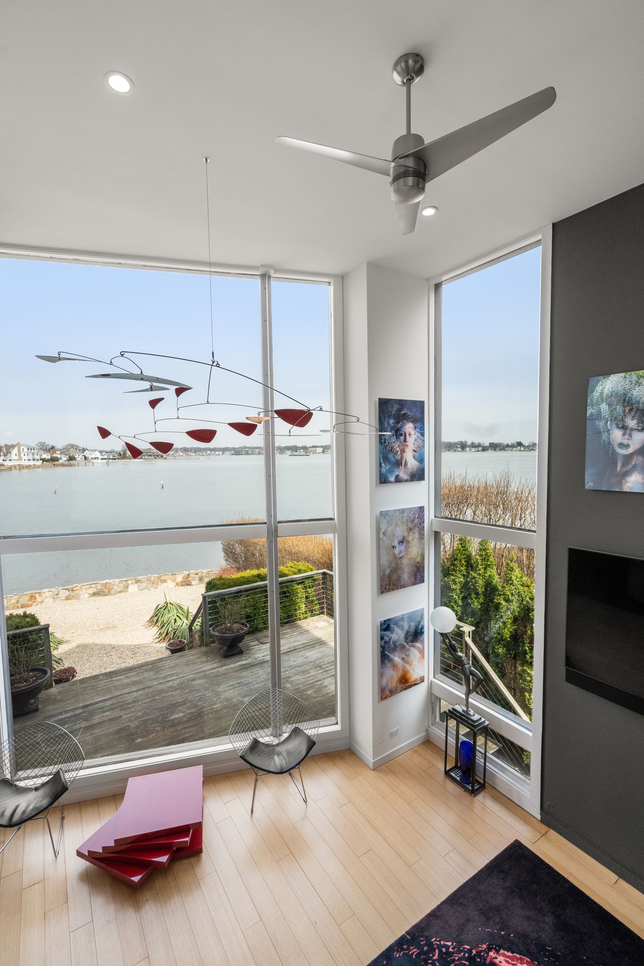 17 Seabreeze Place "Windswept" is a rare waterfront offering. A thoughtfully designed coastal retreat where architecture and setting come together to create this prized home. The steel-framed construction offers just over 2,000 square feet across three finished levels. Designed to maximize natural light and panoramic water views, the home features a dramatic 16-foot wall of glass visible from the living room, office, and primary suite. A custom pivot entry door creates a striking first impression, leading into an open living space showcasing bold interior design and subtle nautical-inspired elements, defined by coastal aesthetic metal railings throughout. The flexible floor plan includes a main-level bedroom with access to a full bath. The second floor offers a primary suite with en-suite bath, private balcony, and a custom sliding wall system allowing for privacy or expanded sightlines. An additional room functions as a home office or bedroom with a full bath nearby. The third floor, accessed via a floating staircase, features a vaulted bonus room with built-ins, a full bath, and private deck with expansive water views, ideal for relaxing or entertaining. Exterior upgrades include new composite siding, awning, and professionally designed landscaping with drip irrigation. Owned solar panels help offset rising electricity costs. Enjoy nearby Baxter Park, a city-maintained, dog-friendly waterfront park with seating and small kyak launch, a cherished amenity of the Harbor Shores community.