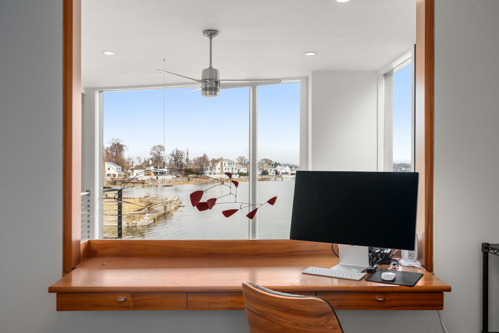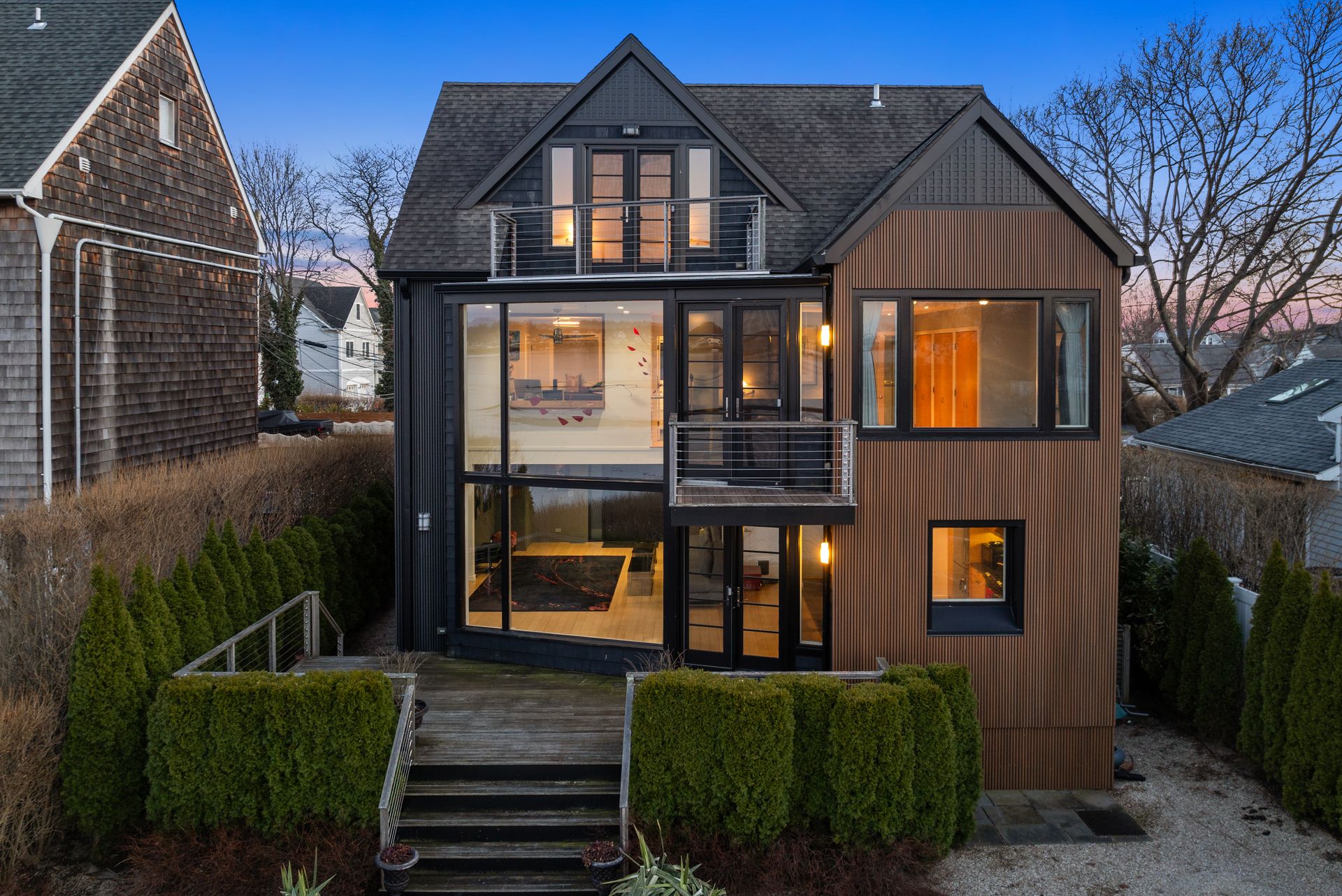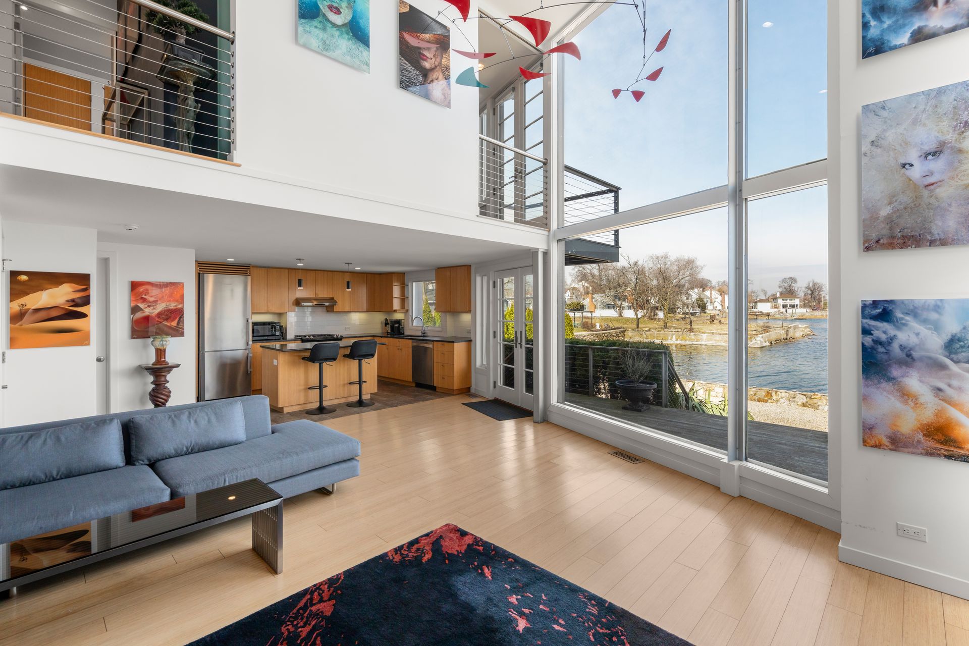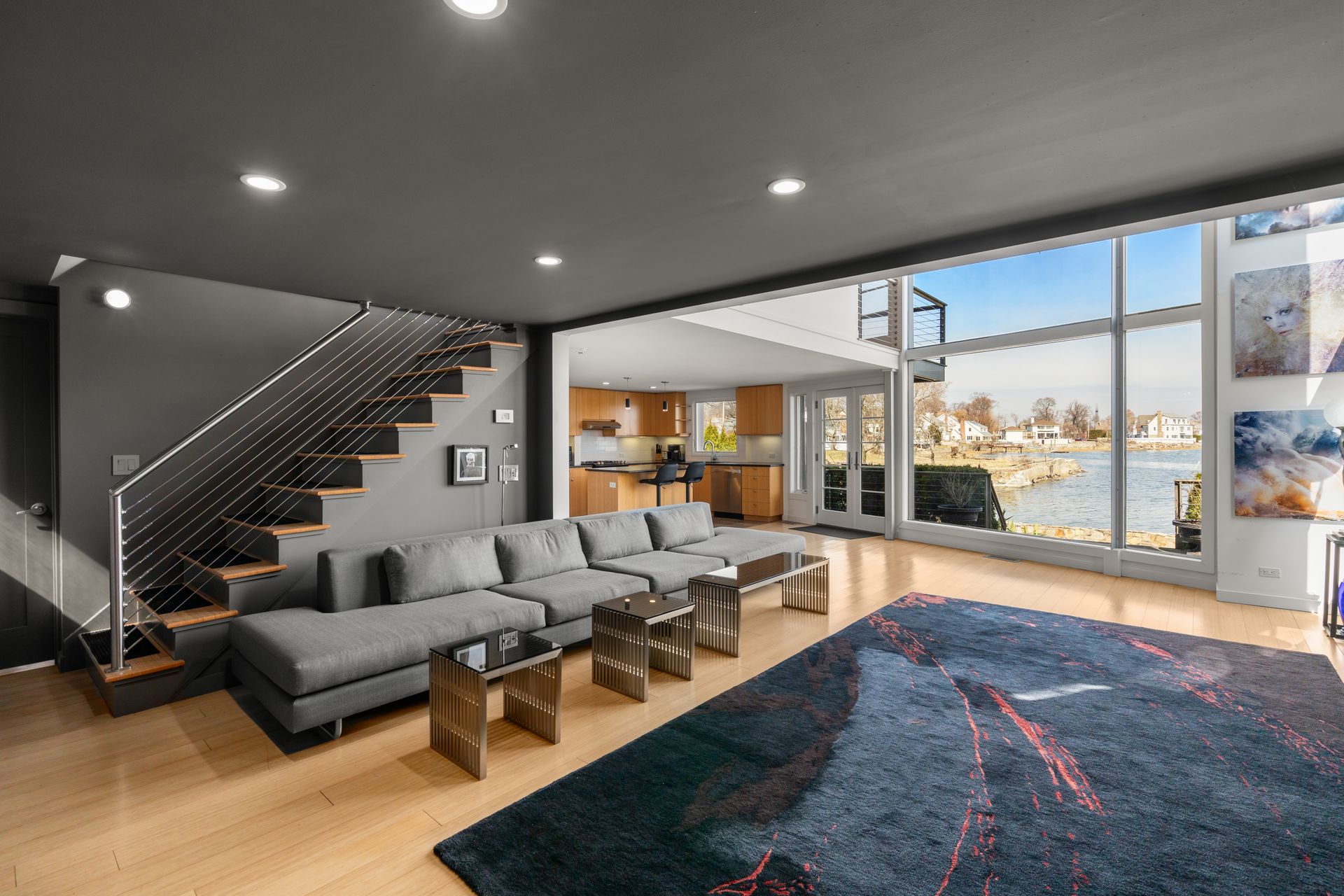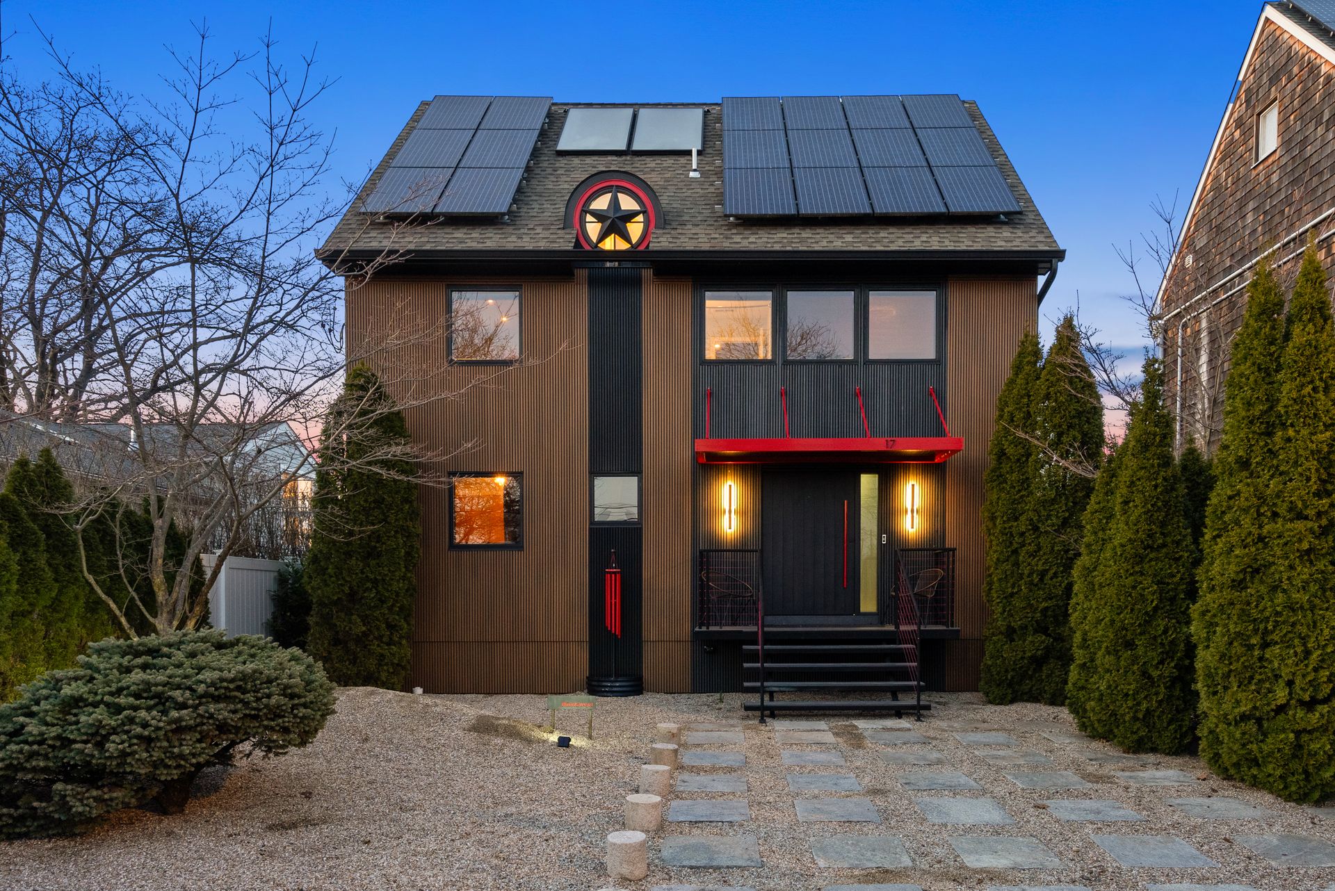17 Seabreeze Place "Windswept" is a rare waterfront offering. A thoughtfully designed coastal retreat where architecture and setting come together to create this prized home. The steel-framed construction offers just over 2,000 square feet across three finished levels. Designed to maximize natural light and panoramic water views, the home features a dramatic 16-foot wall of glass visible from the living room, office, and primary suite. A custom pivot entry door creates a striking first impression, leading into an open living space showcasing bold interior design and subtle nautical-inspired elements, defined by coastal aesthetic metal railings throughout. The flexible floor plan includes a main-level bedroom with access to a full bath. The second floor offers a primary suite with en-suite bath, private balcony, and a custom sliding wall system allowing for privacy or expanded sightlines. An additional room functions as a home office or bedroom with a full bath nearby. The third floor, accessed via a floating staircase, features a vaulted bonus room with built-ins, a full bath, and private deck with expansive water views, ideal for relaxing or entertaining. Exterior upgrades include new composite siding, awning, and professionally designed landscaping with drip irrigation. Owned solar panels help offset rising electricity costs. Enjoy nearby Baxter Park, a city-maintained, dog-friendly waterfront park with seating and small kyak launch, a cherished amenity of the Harbor Shores community.