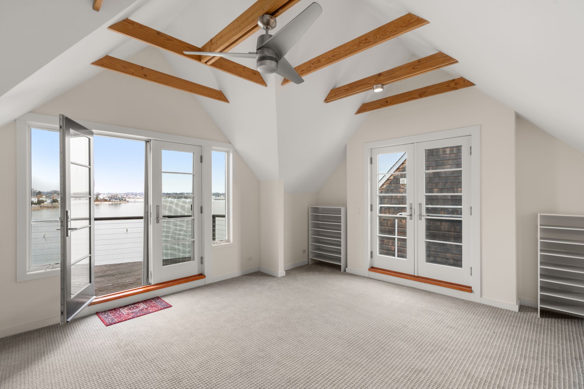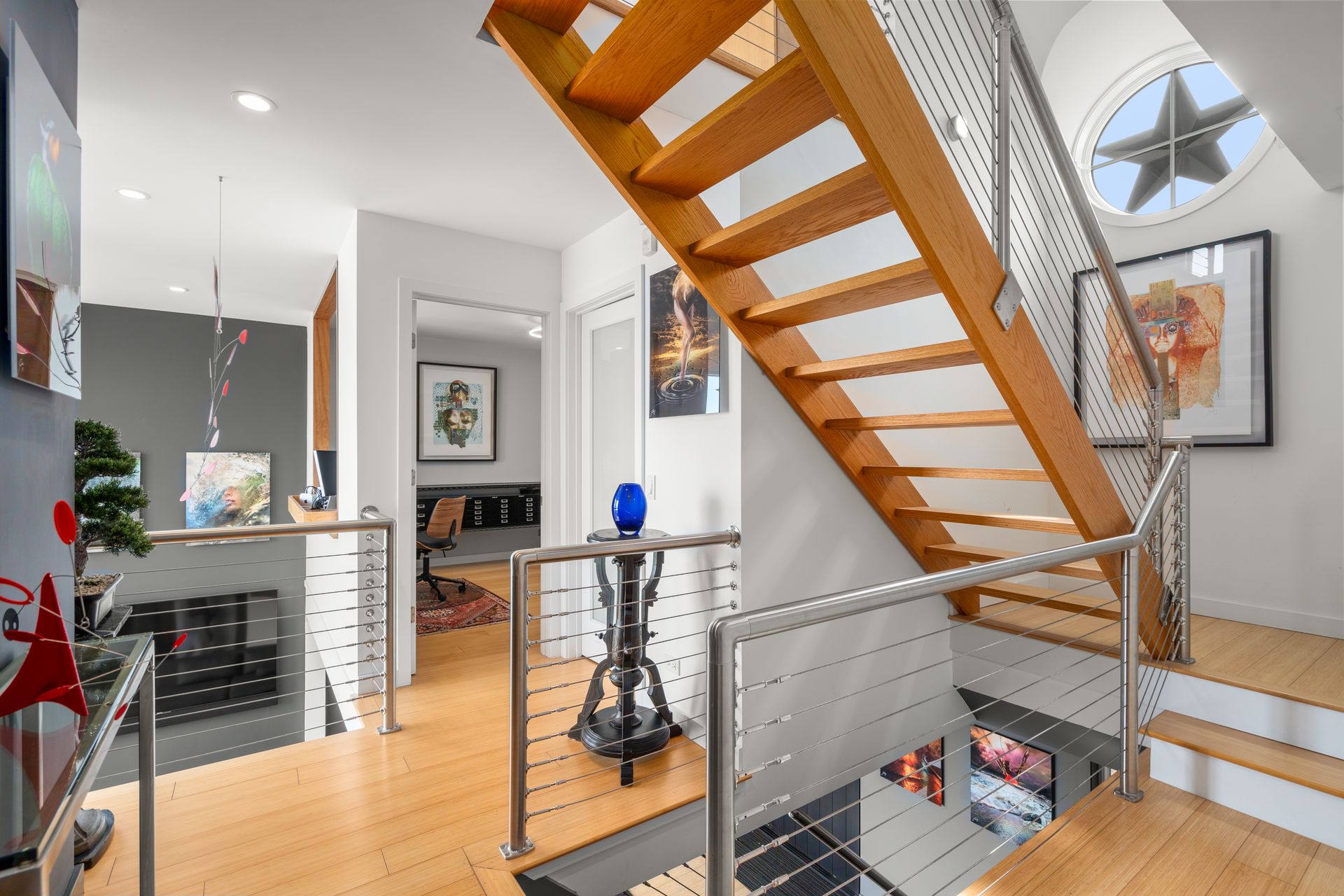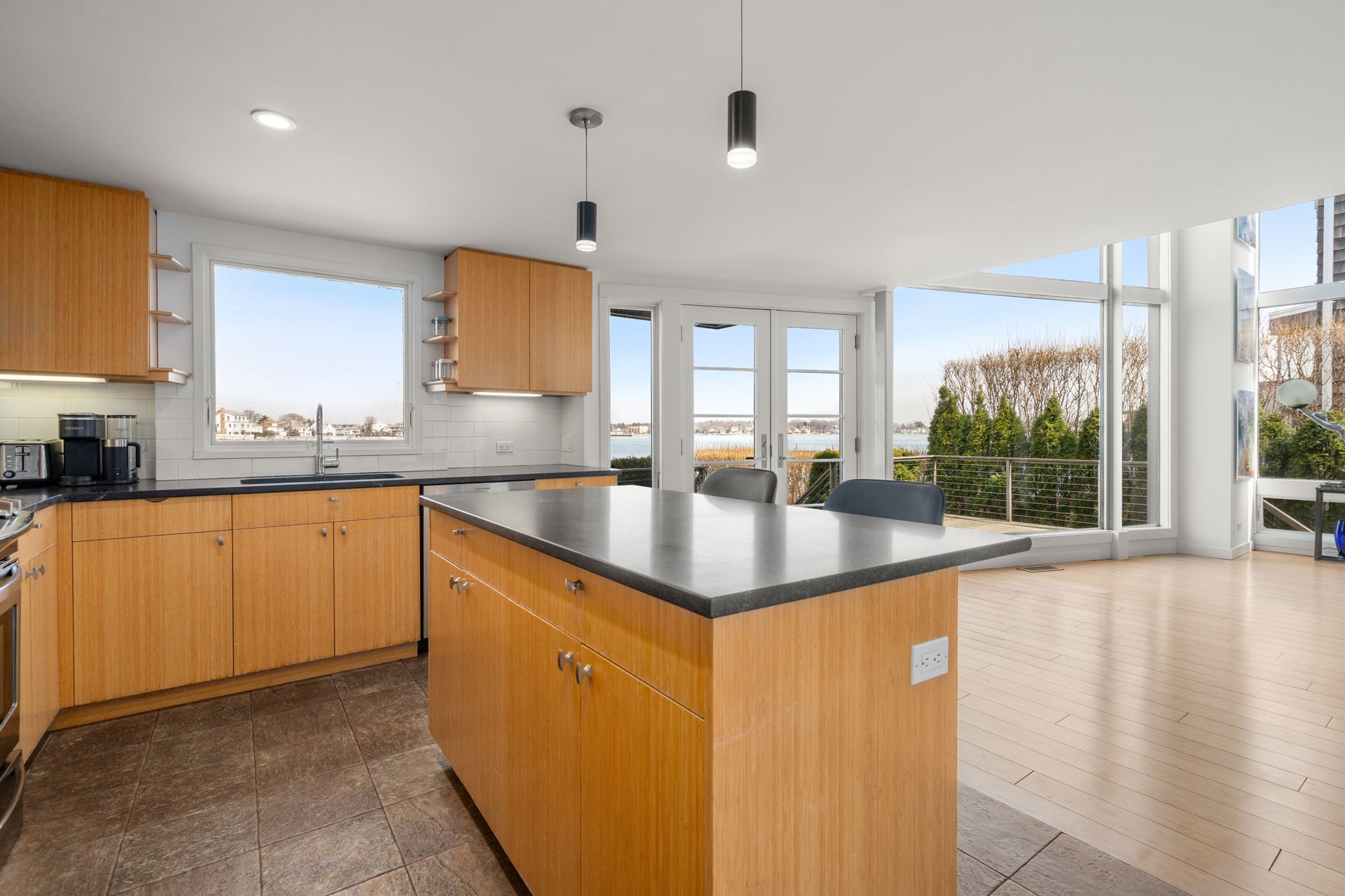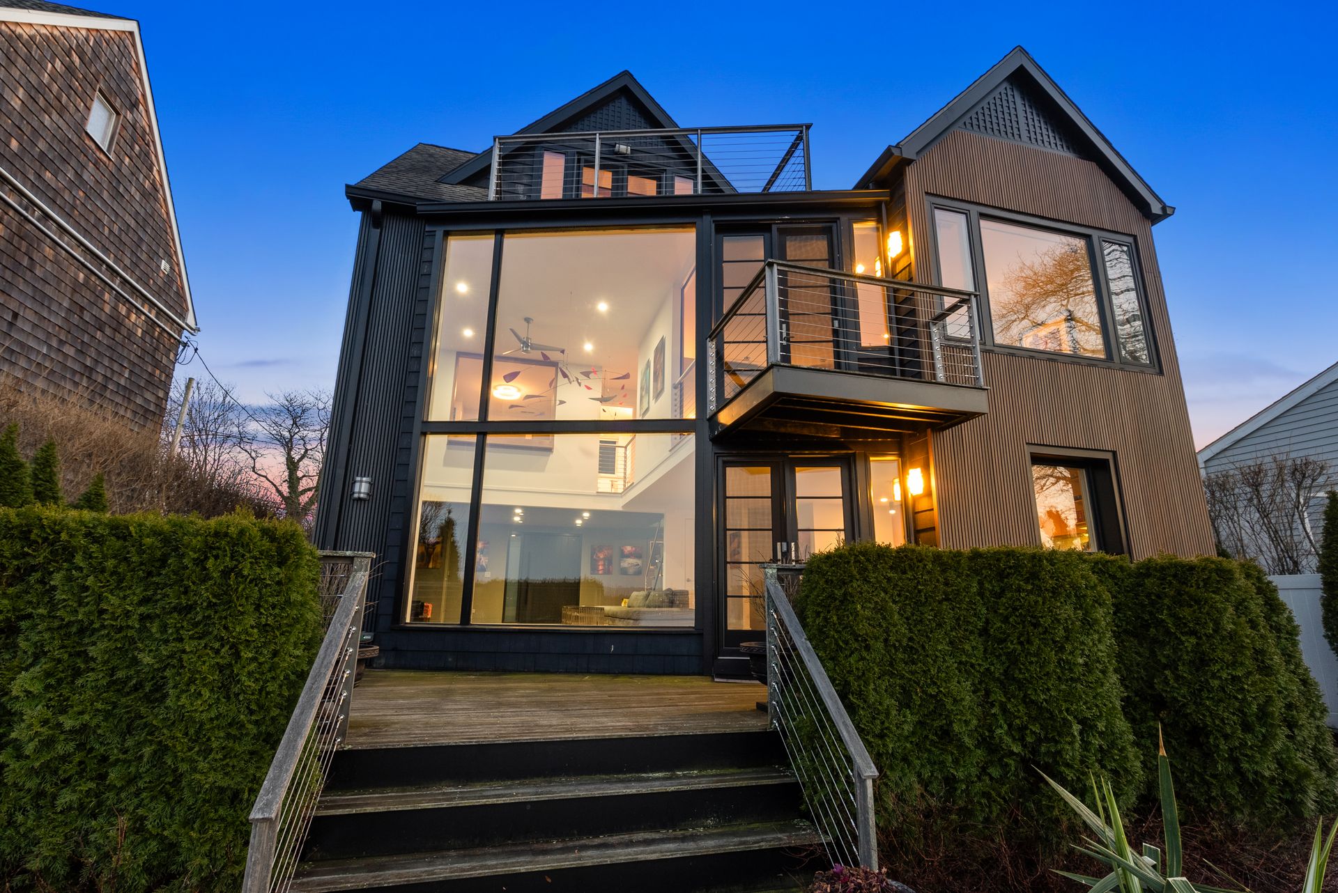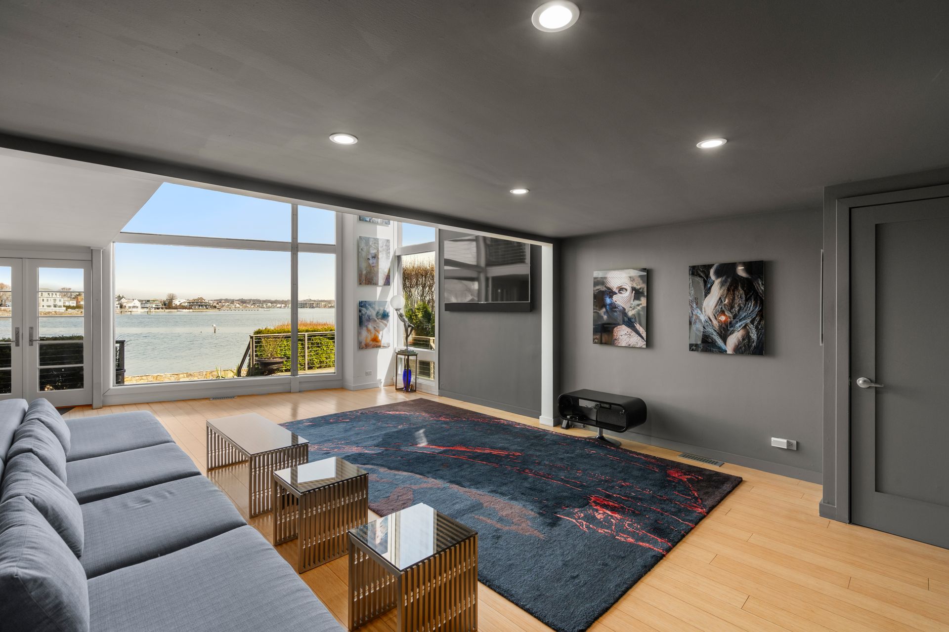 17 Seabreeze Place "Windswept" is a rare waterfront offering. A thoughtfully designed coastal retreat where architecture and setting come together to create this prized home. The steel-framed construction offers just over 2,000 square feet across three finished levels. Designed to maximize natural light and panoramic water views, the home features a dramatic 16-foot wall of glass visible from the living room, office, and primary suite. A custom pivot entry door creates a striking first impression, leading into an open living space showcasing bold interior design and subtle nautical-inspired elements, defined by coastal aesthetic metal railings throughout. The flexible floor plan includes a main-level bedroom with access to a full bath. The second floor offers a primary suite with en-suite bath, private balcony, and a custom sliding wall system allowing for privacy or expanded sightlines. An additional room functions as a home office or bedroom with a full bath nearby. The third floor, accessed via a floating staircase, features a vaulted bonus room with built-ins, a full bath, and private deck with expansive water views, ideal for relaxing or entertaining. Exterior upgrades include new composite siding, awning, and professionally designed landscaping with drip irrigation. Owned solar panels help offset rising electricity costs. Enjoy nearby Baxter Park, a city-maintained, dog-friendly waterfront park with seating and small kyak launch, a cherished amenity of the Harbor Shores community.