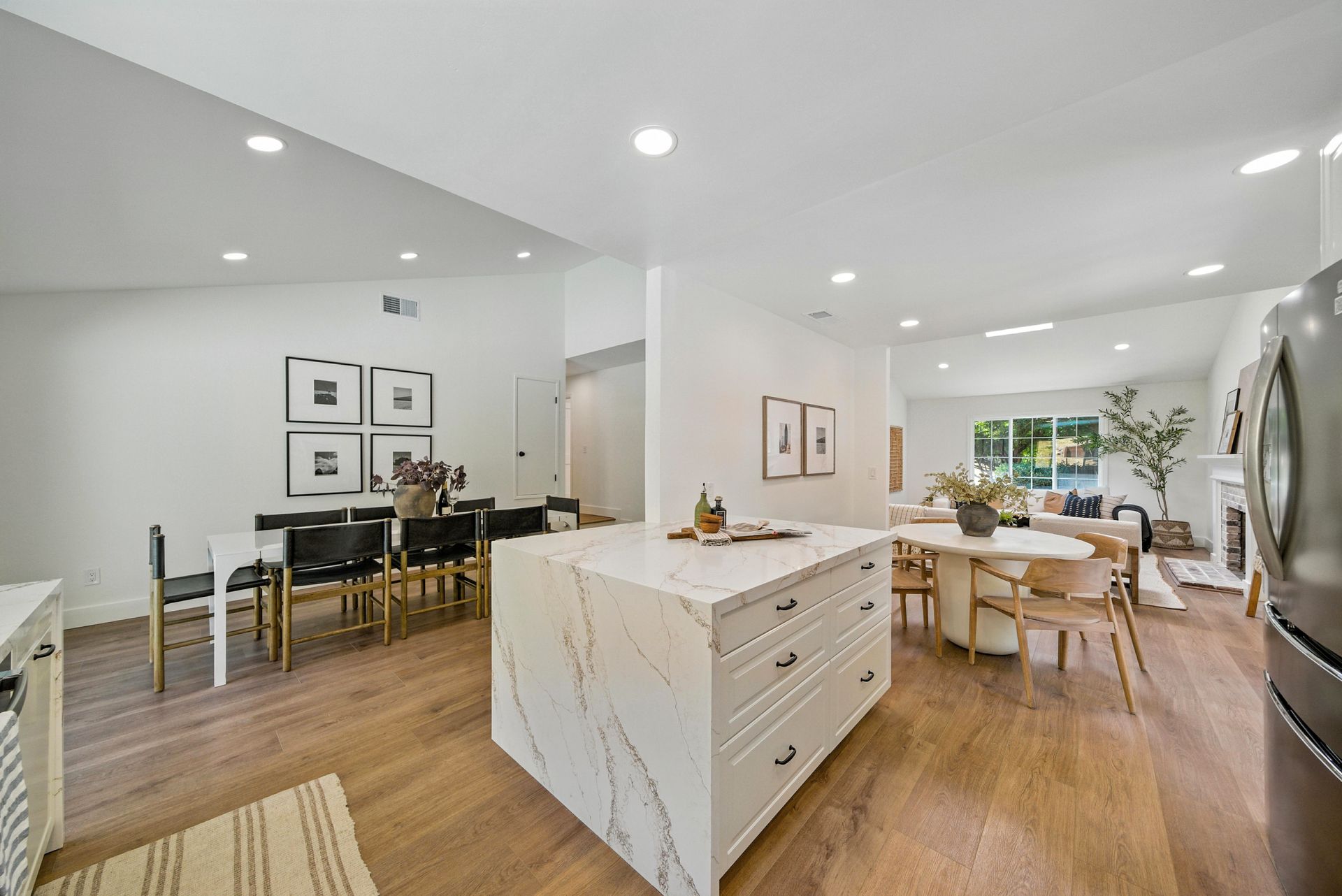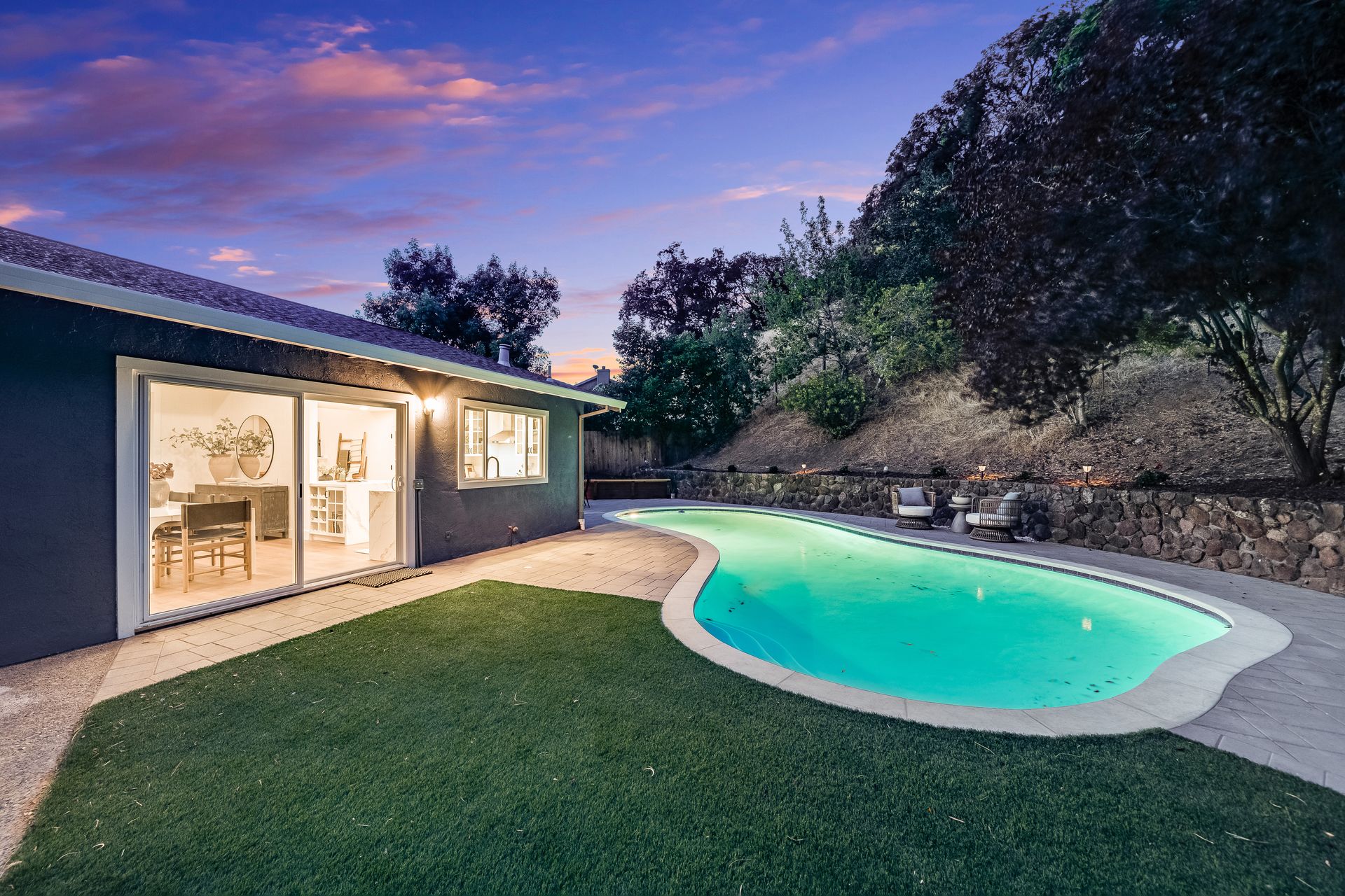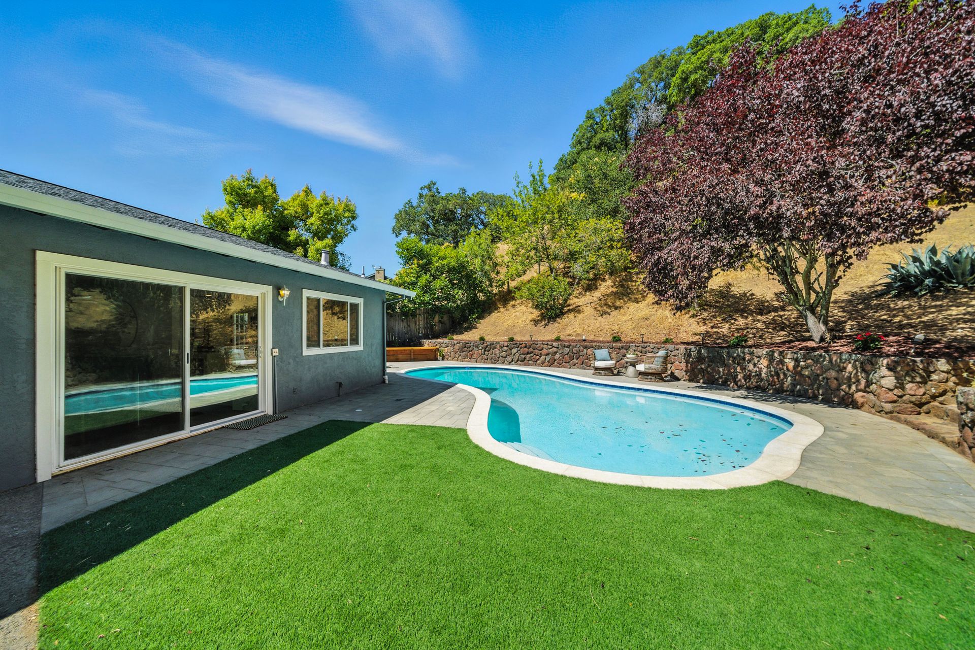 Enter inside to discover an open, light-filled layout featuring hardwood floors, updated finishes, and a sleek, remodeled kitchen with quartz countertops and stainless steel appliances. The spacious living and dining areas flow seamlessly to the backyard, where the sparkling pool, mature landscaping, and multiple patios create a private oasis ideal for relaxing or entertaining.